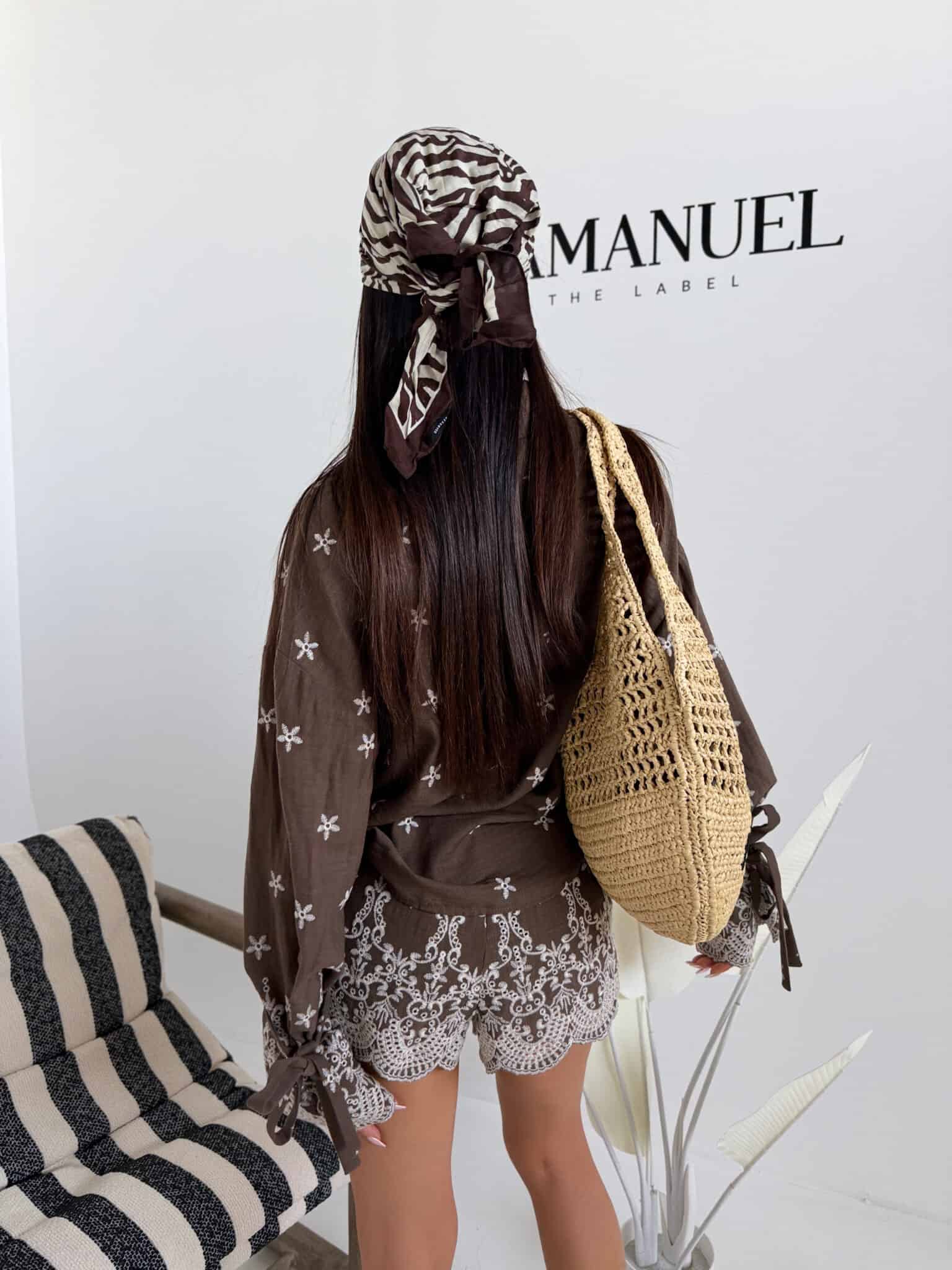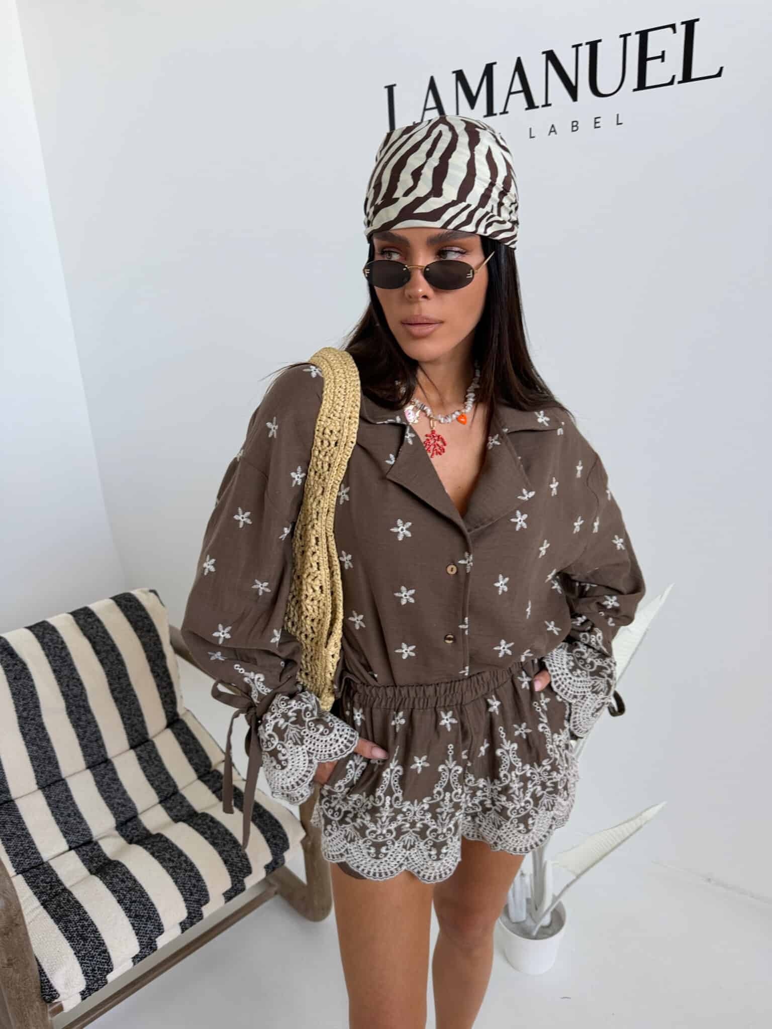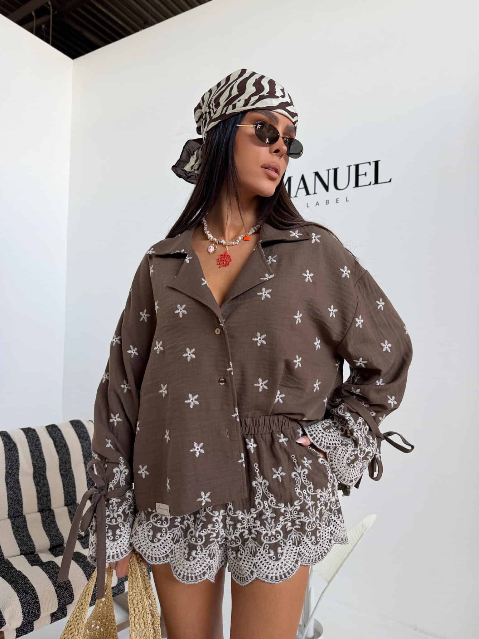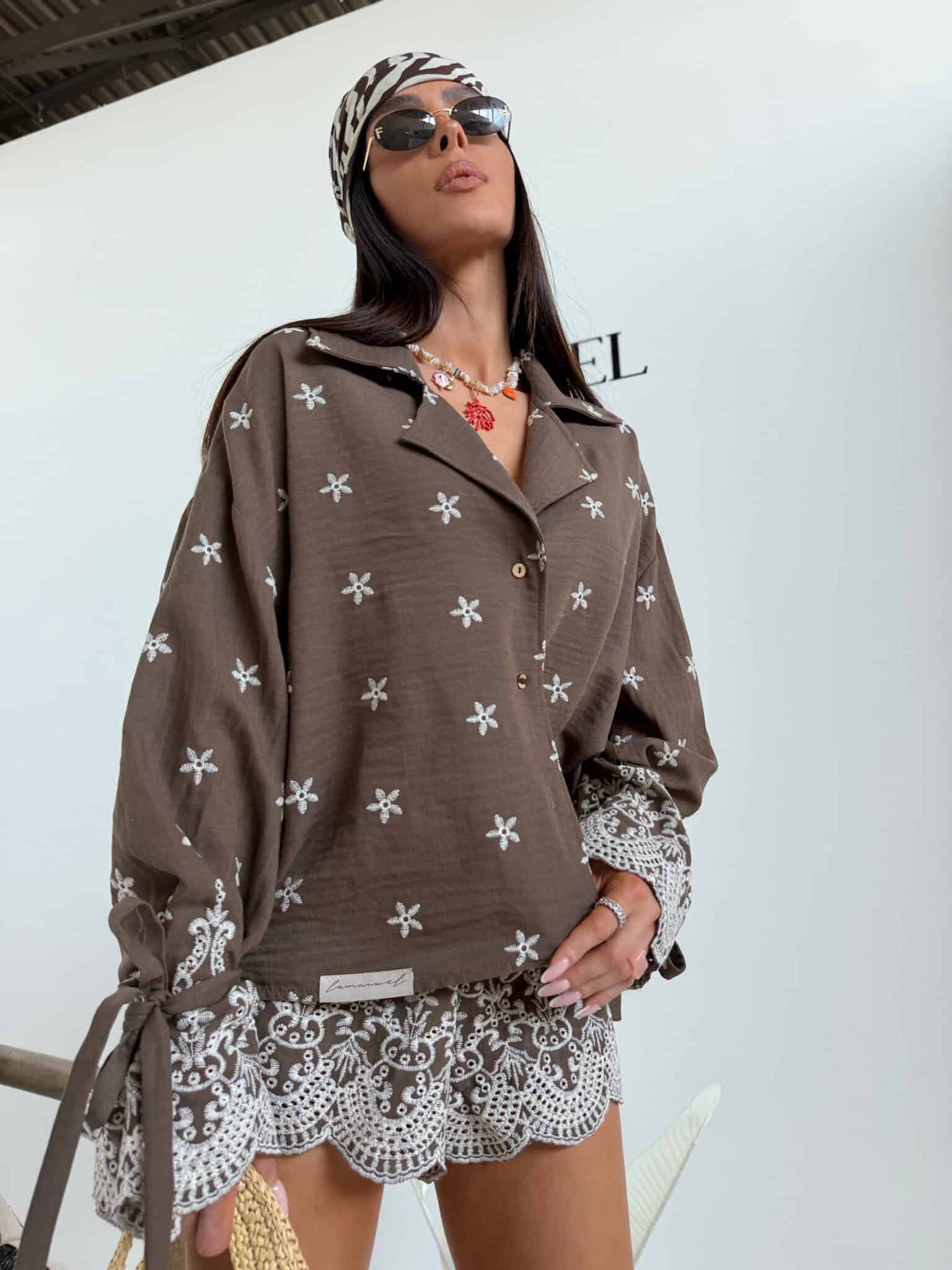 Lekkość, która przyciąga detalem. Zwiewna koszula o luźnym kroju subtelnie układa się na sylwetce, tworząc naturalny, niewymuszony efekt, a haftowane wykończenia dodają całości romantycznego charakteru. Szerokie rękawy zakończone ozdobną koronką podkreślają wyjątkowość formy i nadają stylizacji wyrazistości. Szorty z ażurowym wykończeniem eksponują nogi i wprowadzają letni, świeży vibe, jednocześnie zachowując komfort dzięki elastycznej talii. Całość tworzy spójny, kobiecy look idealny na ciepłe dni – lekki, ale dopracowany w każdym detalu.Skład: 51% poliester 37% wiskoza 12% len