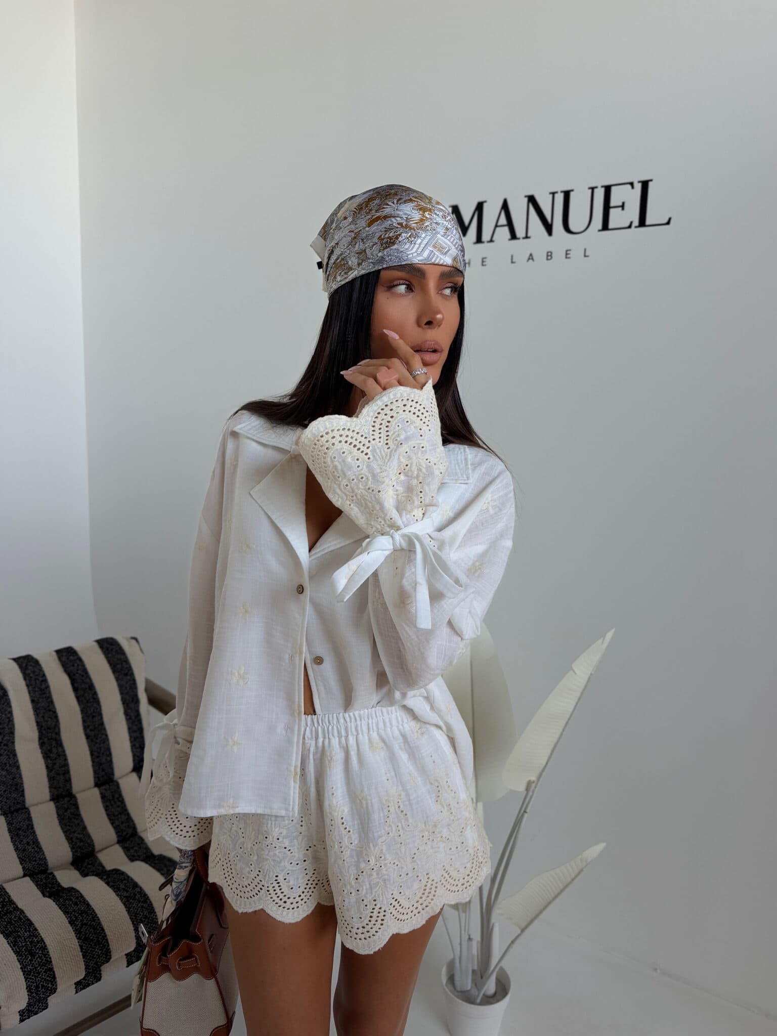 Lekkość, która przyciąga detalem. Zwiewna koszula o luźnym kroju subtelnie układa się na sylwetce, tworząc naturalny, niewymuszony efekt, a haftowane wykończenia dodają całości romantycznego charakteru. Szerokie rękawy zakończone ozdobną koronką podkreślają wyjątkowość formy i nadają stylizacji wyrazistości. Szorty z ażurowym wykończeniem eksponują nogi i wprowadzają letni, świeży vibe, jednocześnie zachowując komfort dzięki elastycznej talii. Całość tworzy spójny, kobiecy look idealny na ciepłe dni – lekki, ale dopracowany w każdym detalu.Skład: 51% poliester 37% wiskoza 12% len