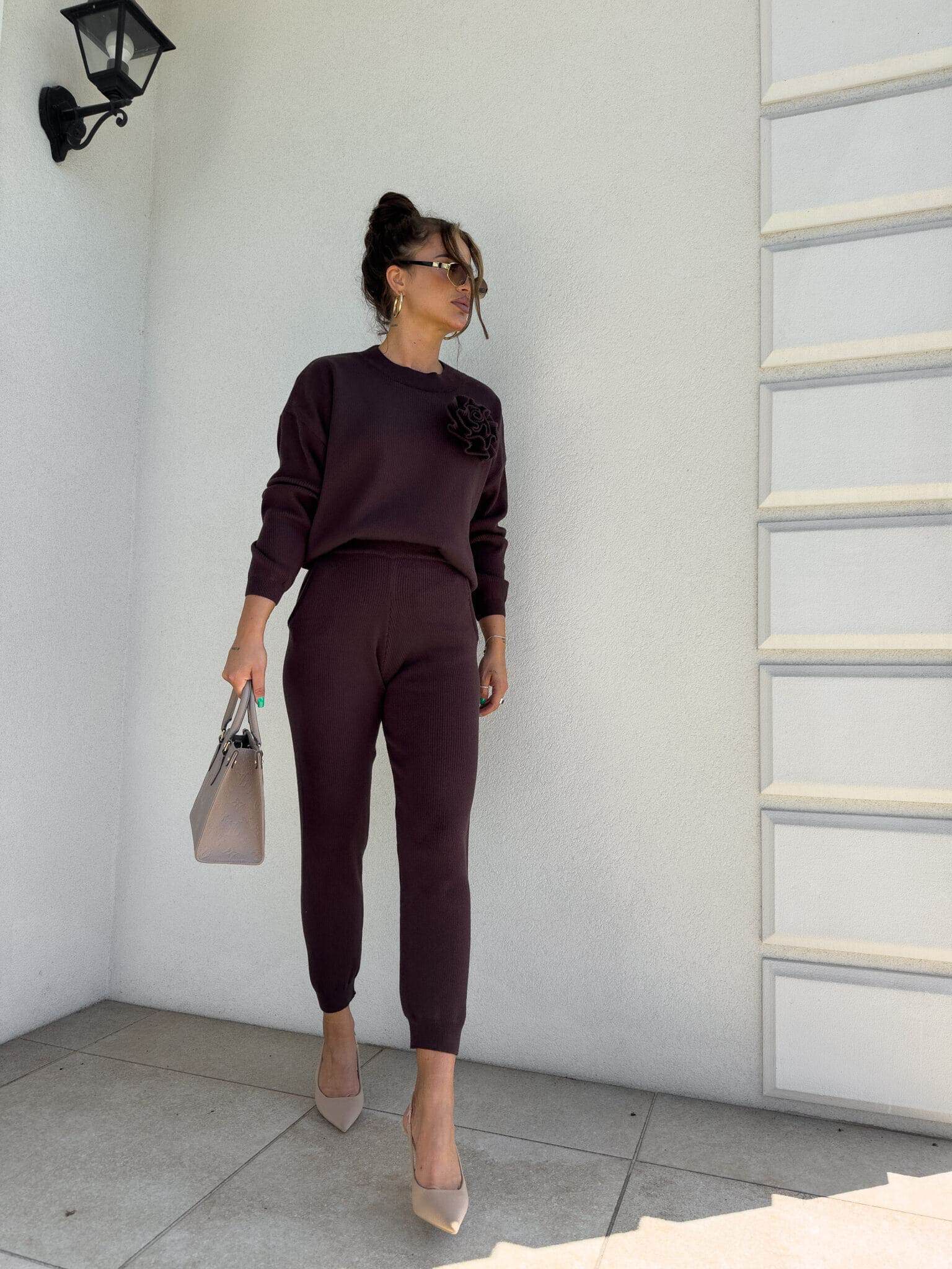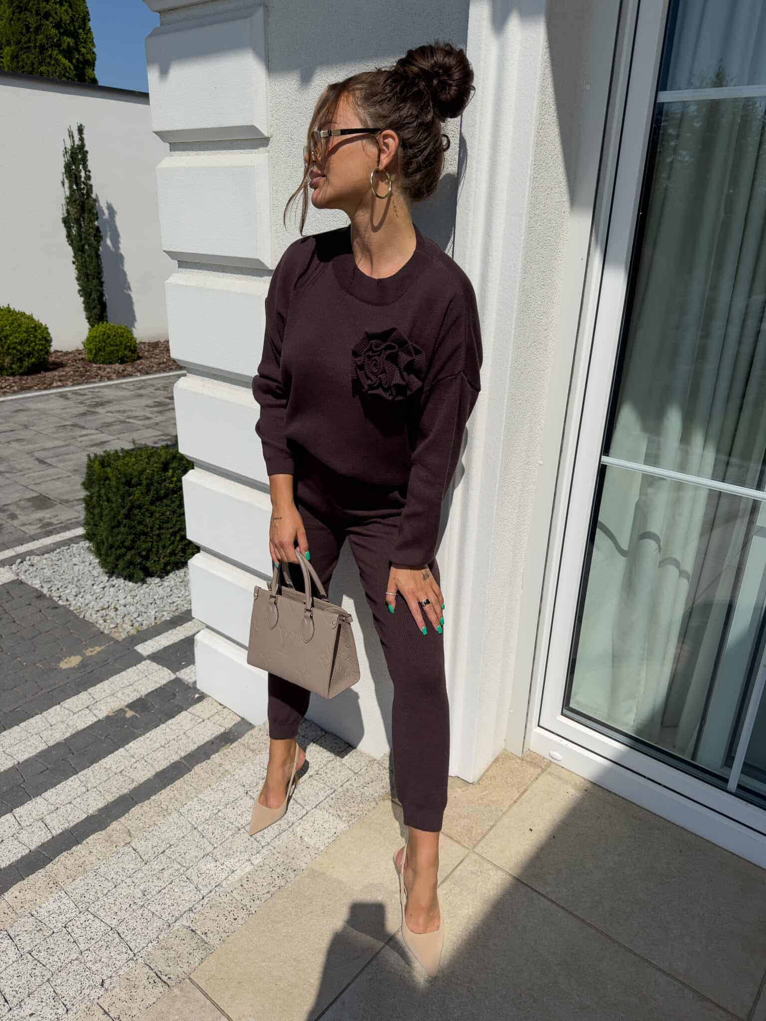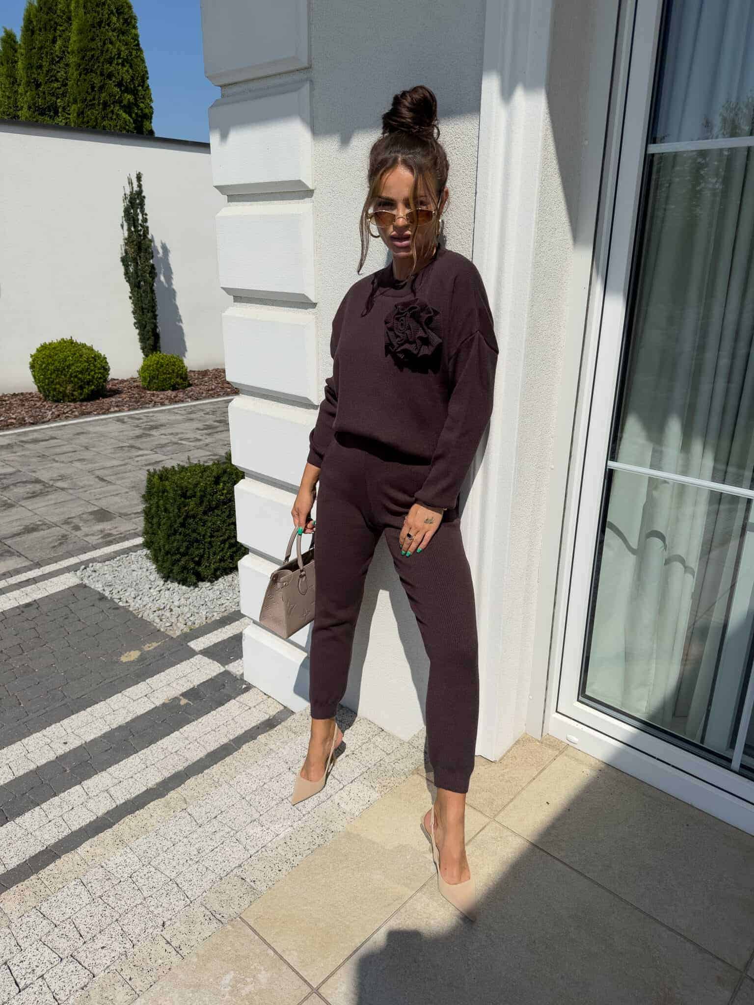 Komplet Delani Long  składający się z bluzy sweterkowe z długim rękawem oraz długich spodni z gumką w pasie. Kwiat jest odpinany.
