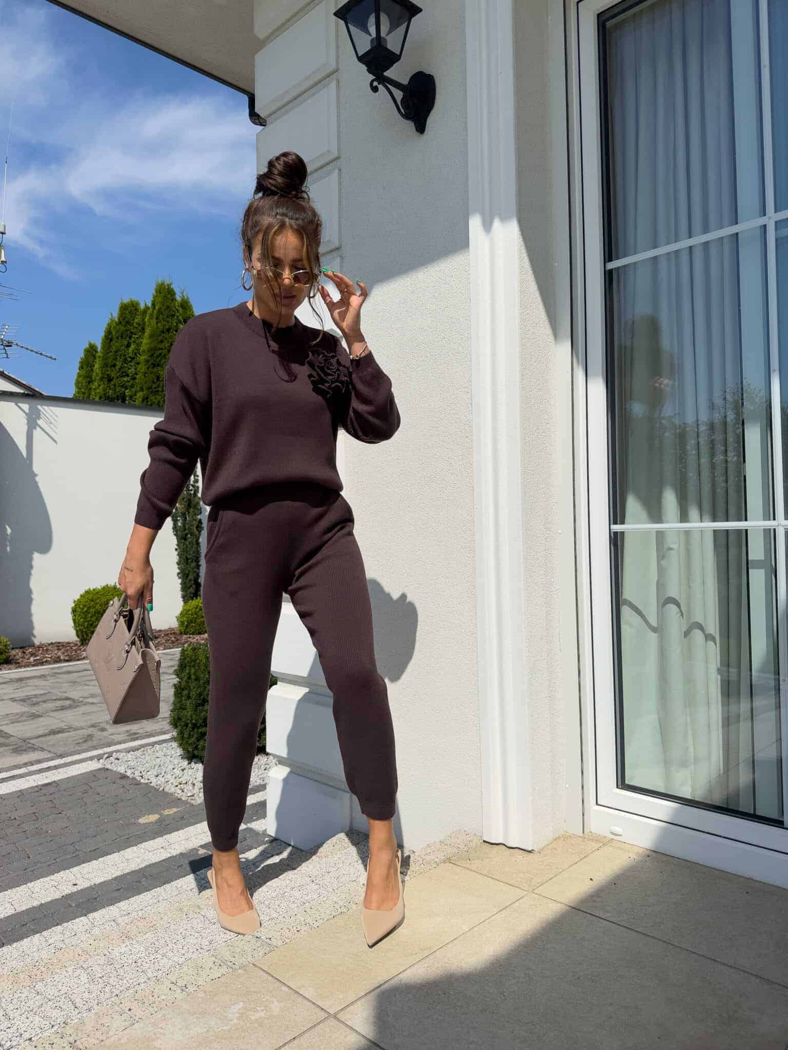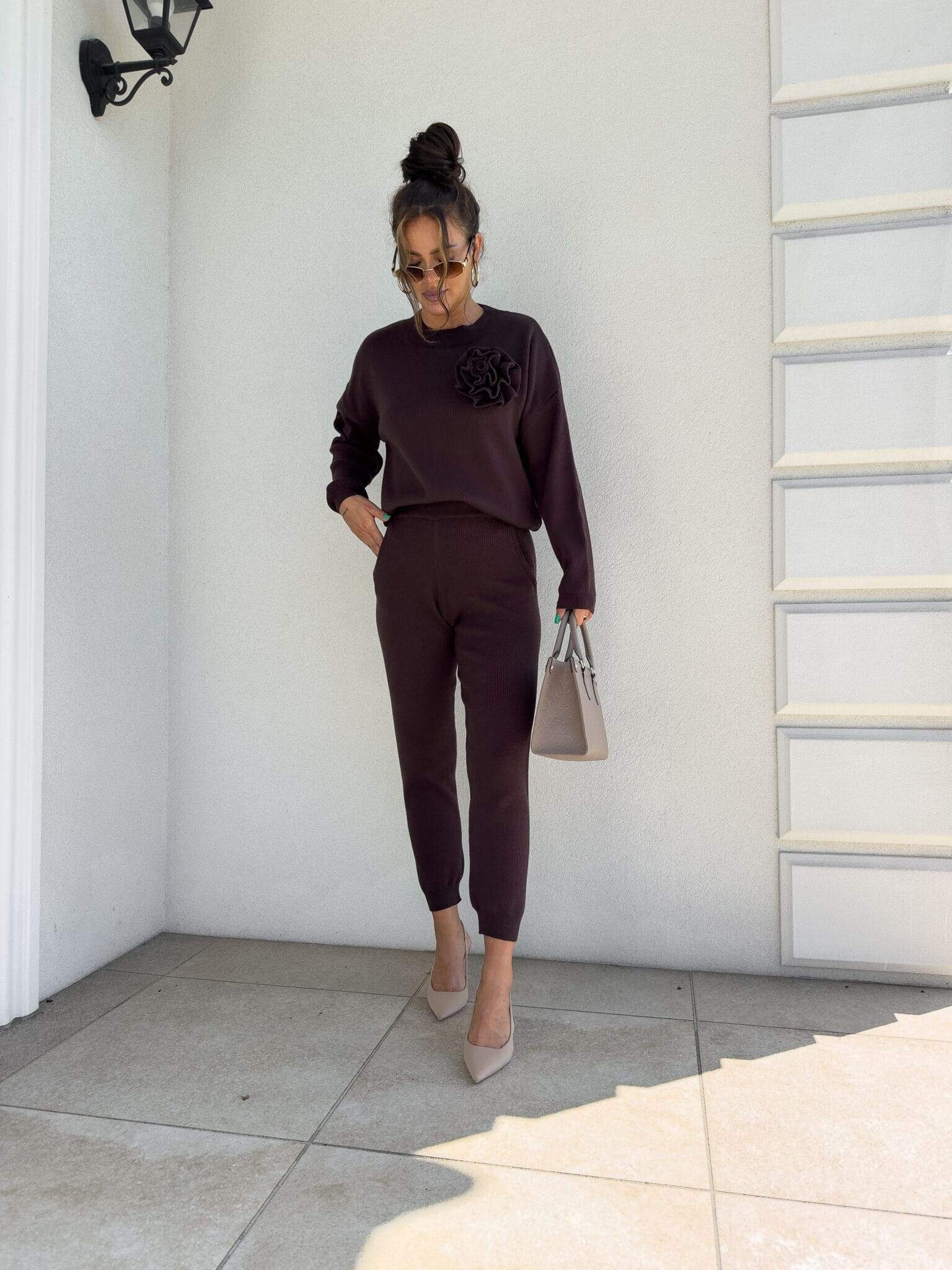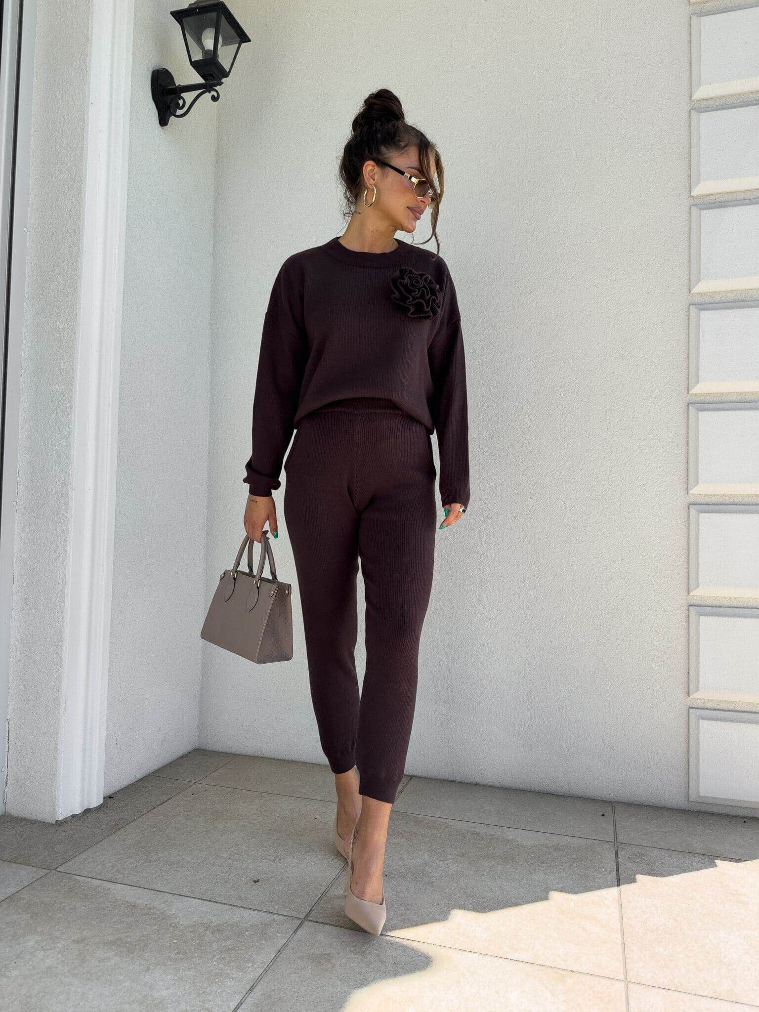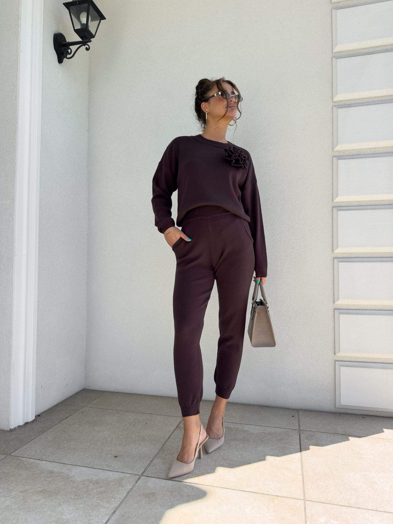 Komplet Delani Long  składający się z bluzy sweterkowe z długim rękawem oraz długich spodni z gumką w pasie. Kwiat jest odpinany.