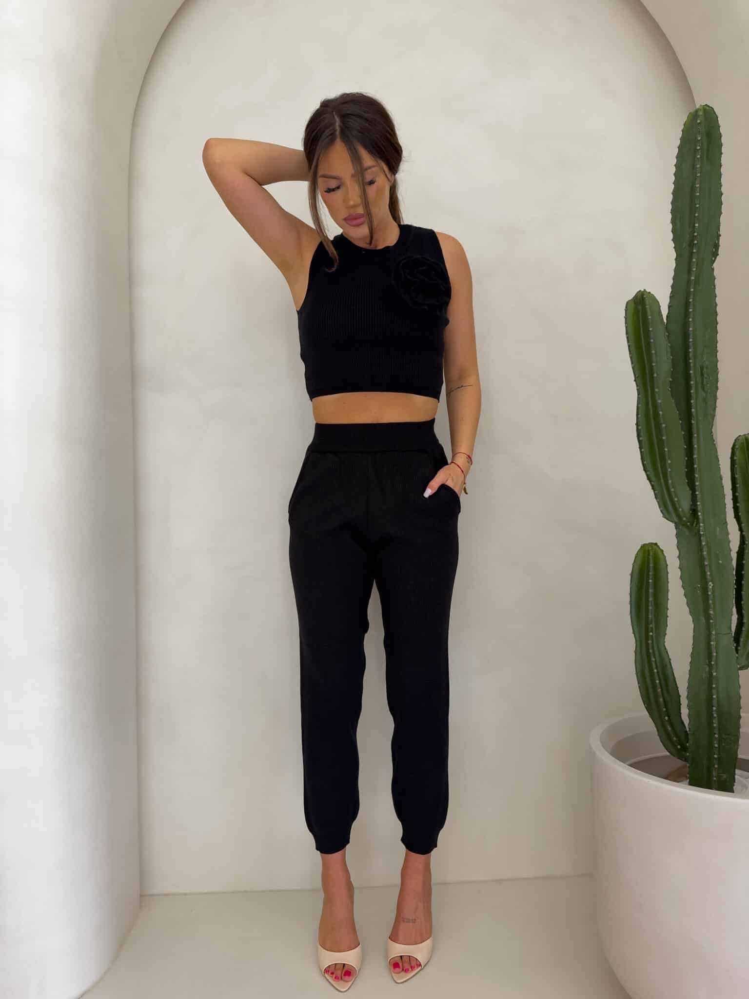 Stylowy komplet damski składający się z krótkiego topu bez rękawów oraz długich, wygodnych spodni z elastyczną gumką w pasie. Zestaw łączy w sobie komfort i modny wygląd – idealny zarówno na co dzień, jak i na specjalne okazje. Dodatkowym atutem jest dekoracyjny kwiat, który można dowolnie odpinać, dostosowując stylizację do własnych upodobań.