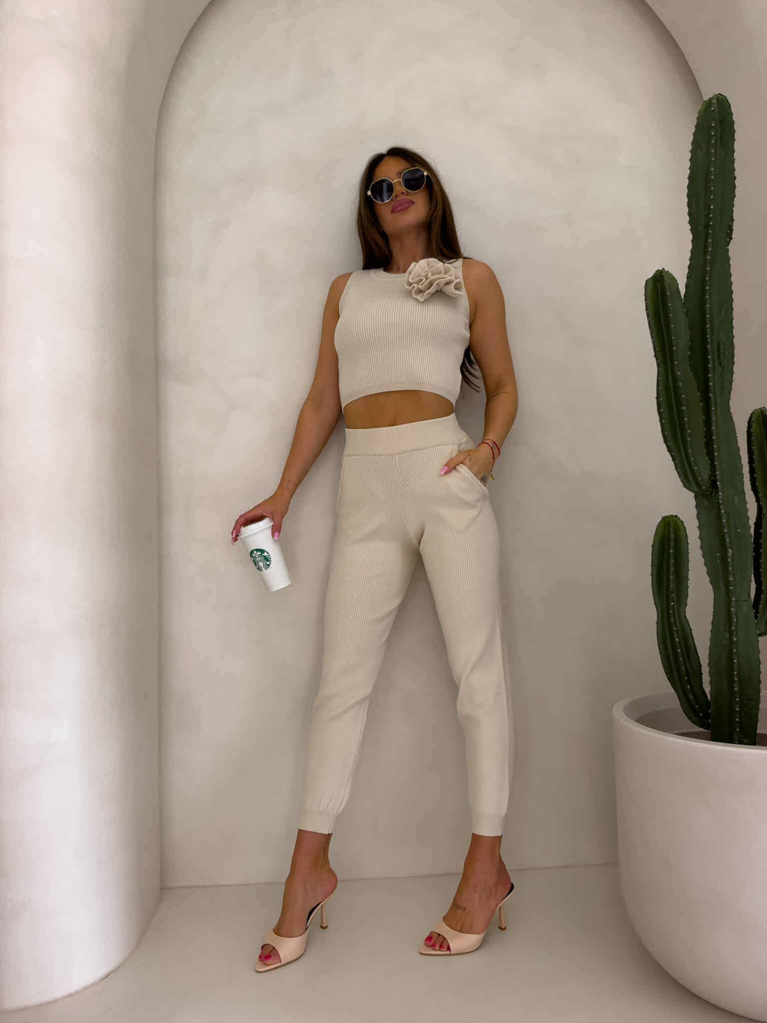 Stylowy komplet damski składający się z krótkiego topu bez rękawów oraz długich, wygodnych spodni z elastyczną gumką w pasie. Zestaw łączy w sobie komfort i modny wygląd – idealny zarówno na co dzień, jak i na specjalne okazje. Dodatkowym atutem jest dekoracyjny kwiat, który można dowolnie odpinać, dostosowując stylizację do własnych upodobań.