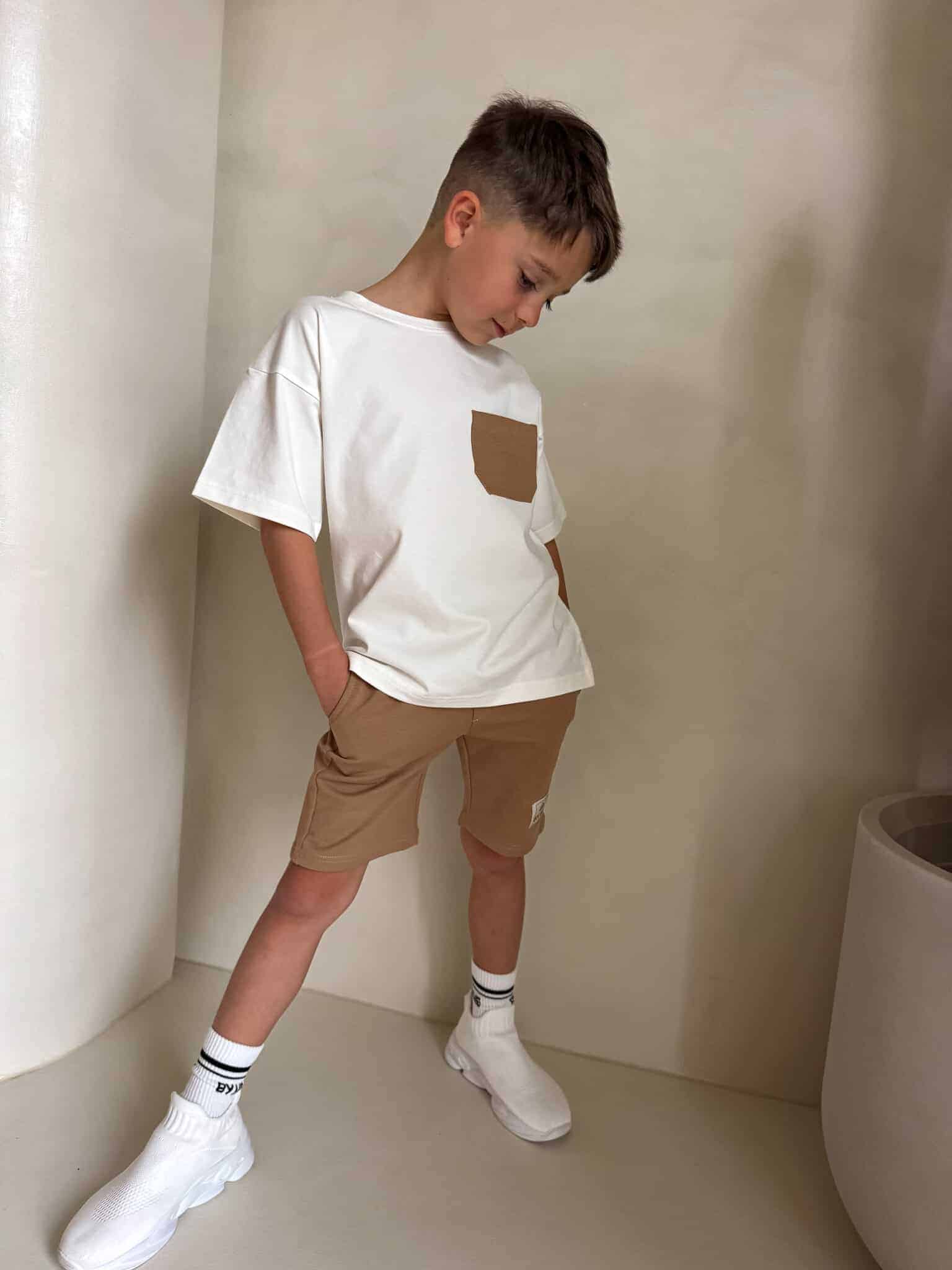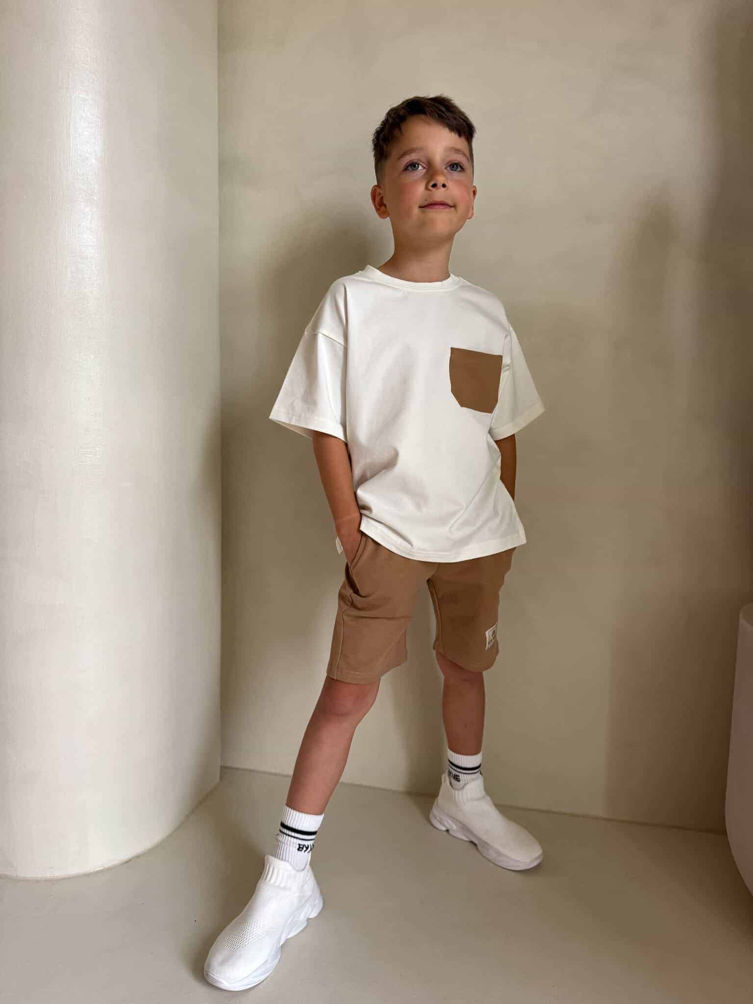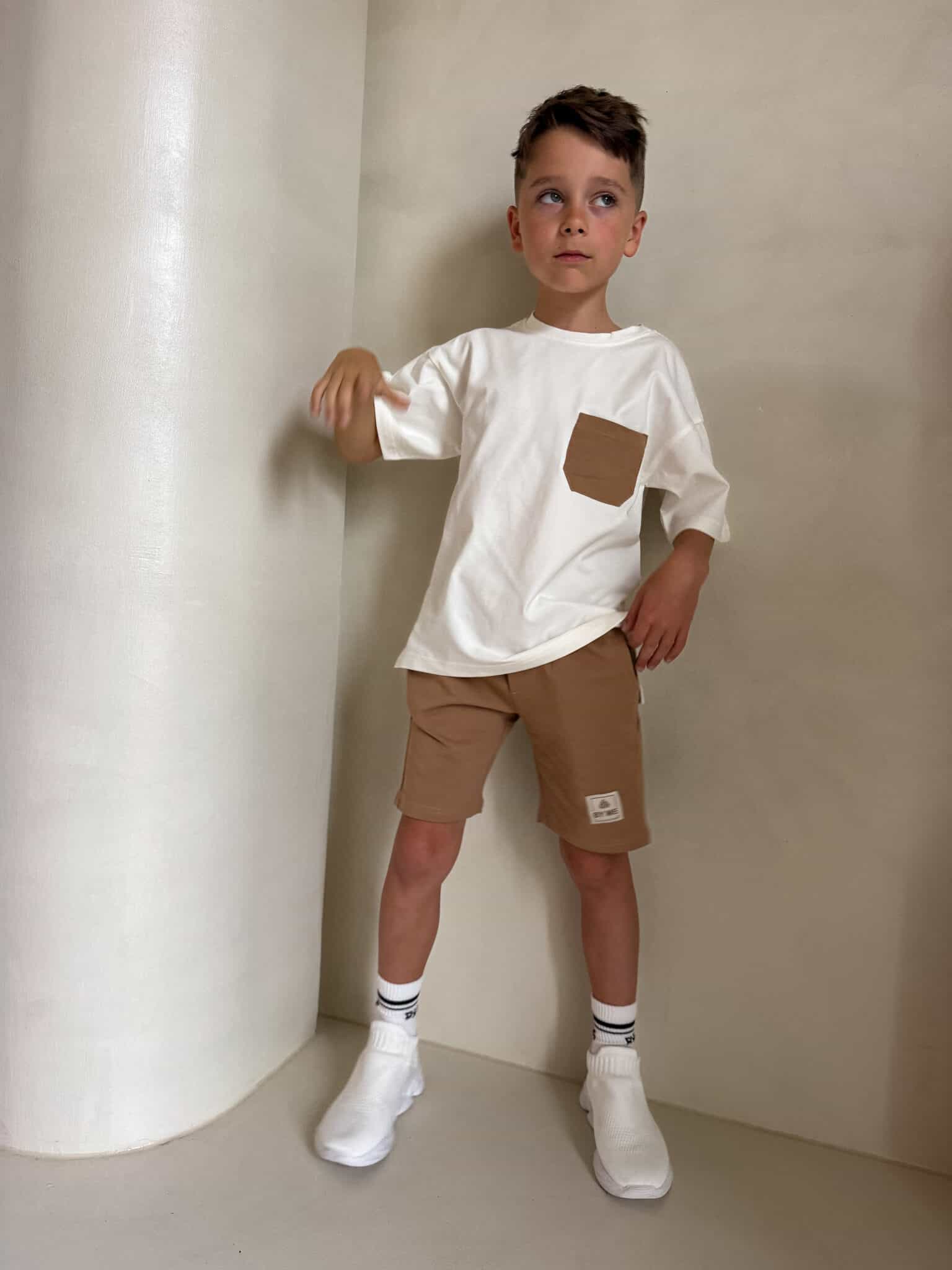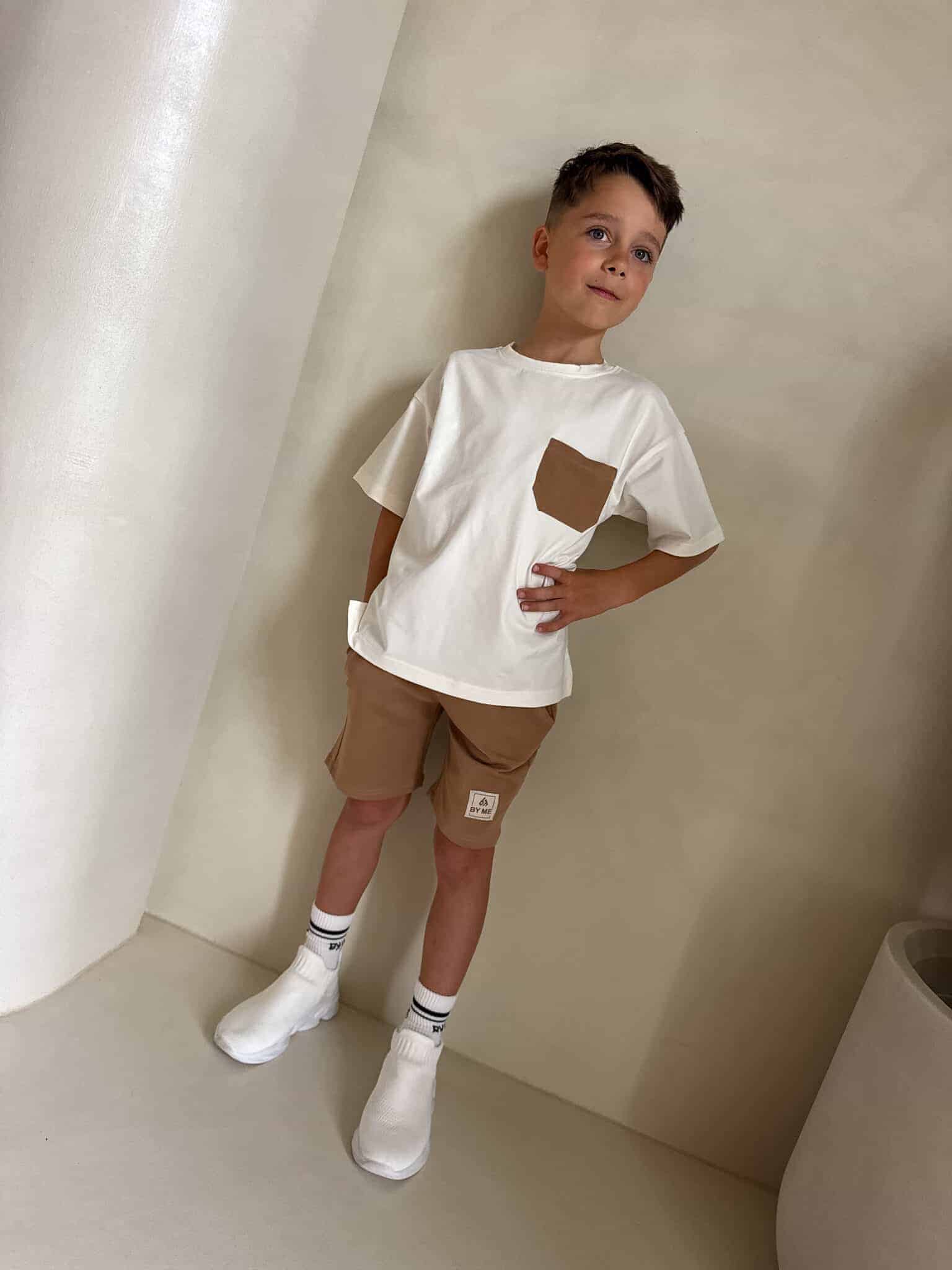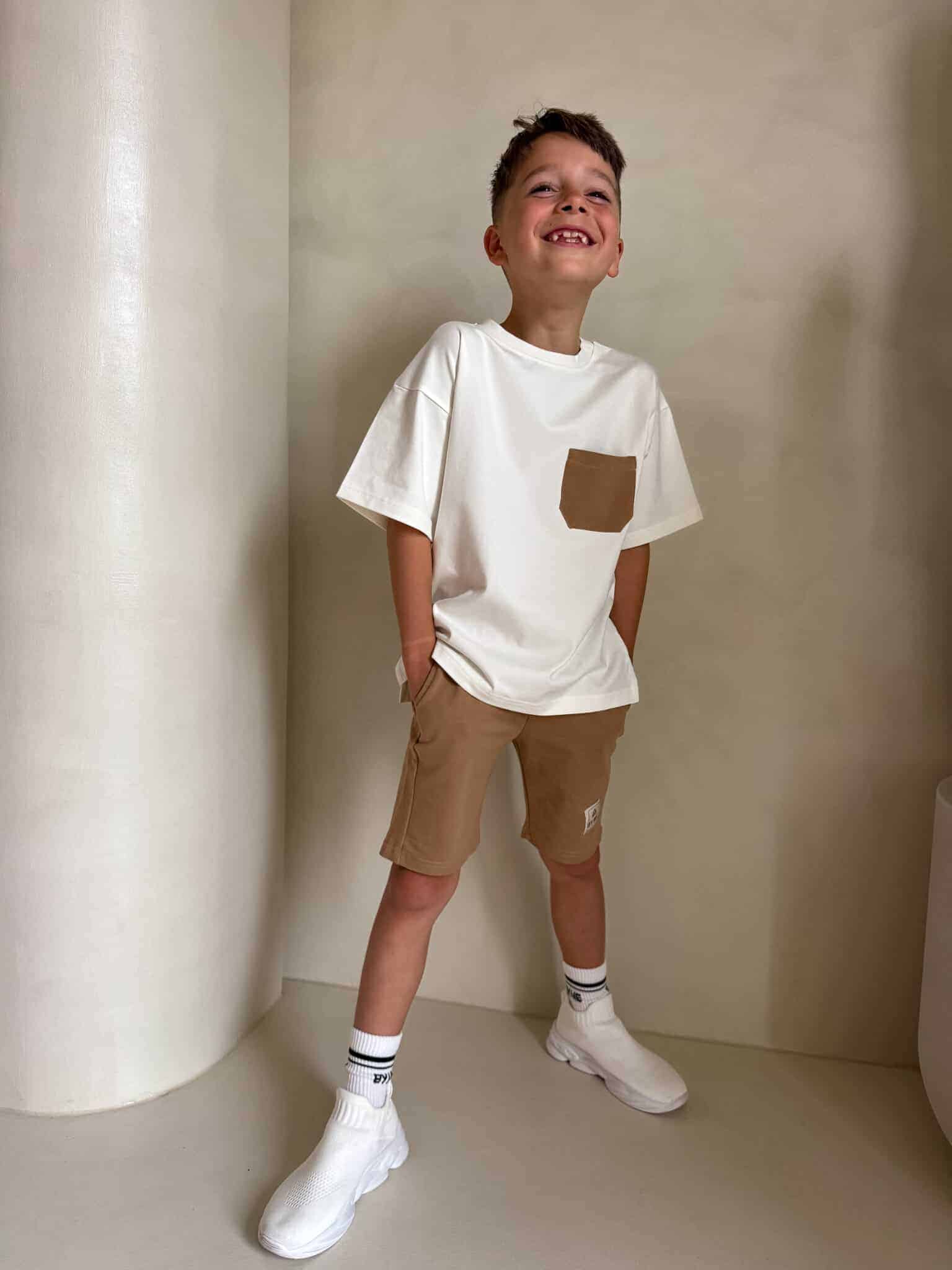 Wygodny i stylowy komplet dziecięcy, idealny na co dzień! W skład zestawu wchodzi bluzka z krótkim rękawem oraz krótkie spodenki. Miękki, przyjemny w dotyku materiał zapewnia komfort noszenia. Świetny wybór – do szkoły, na spacer czy zabawę!