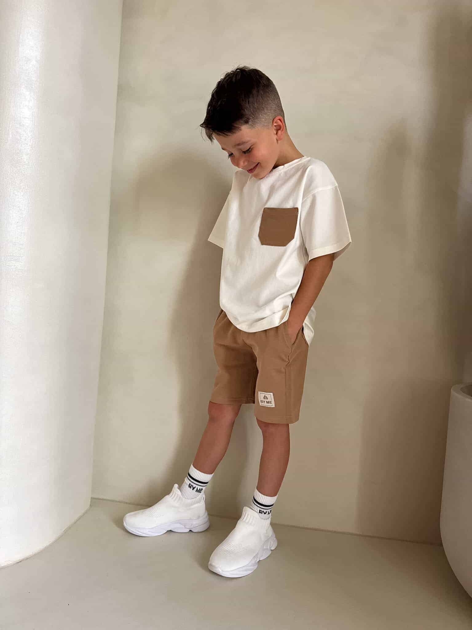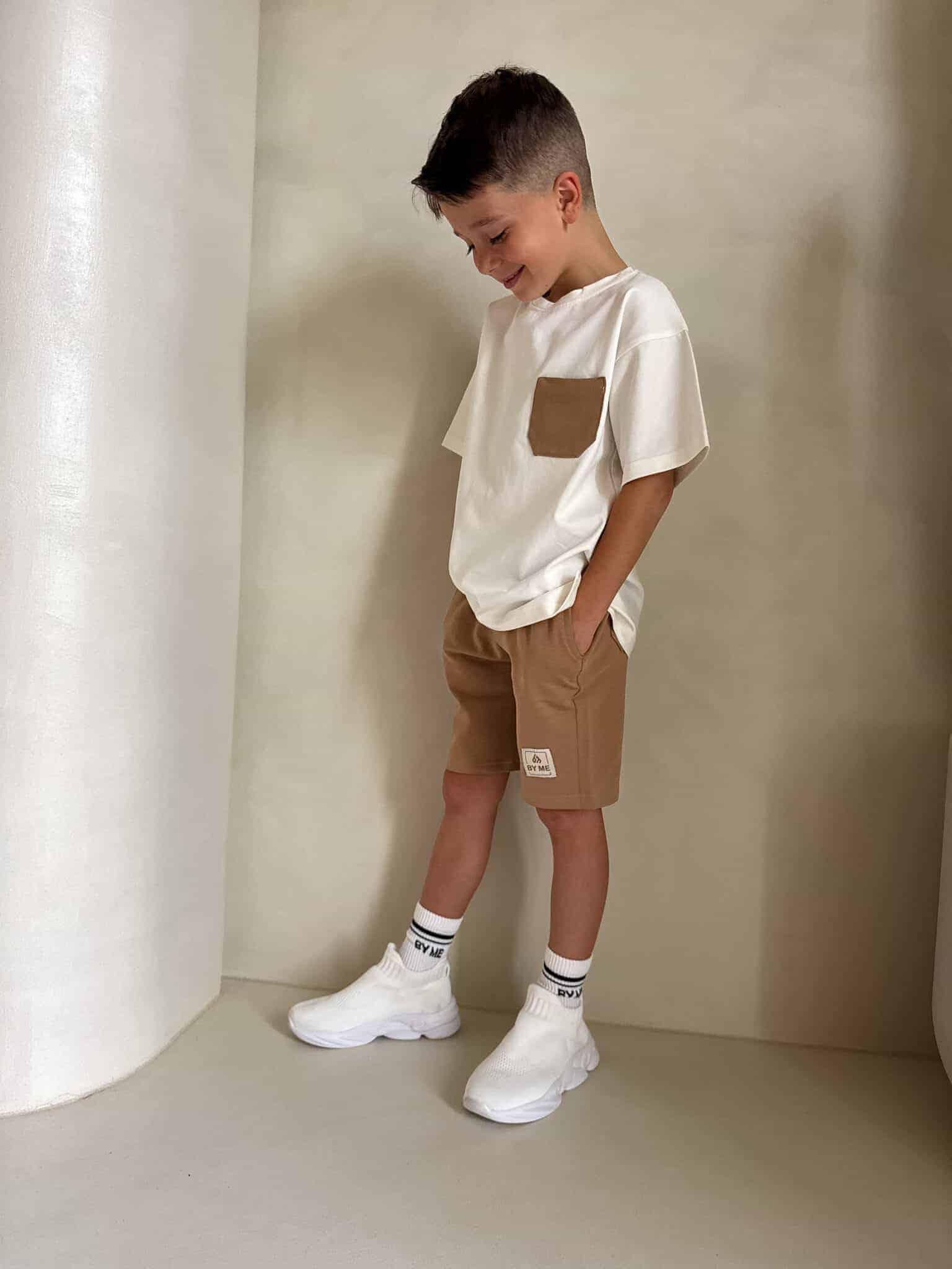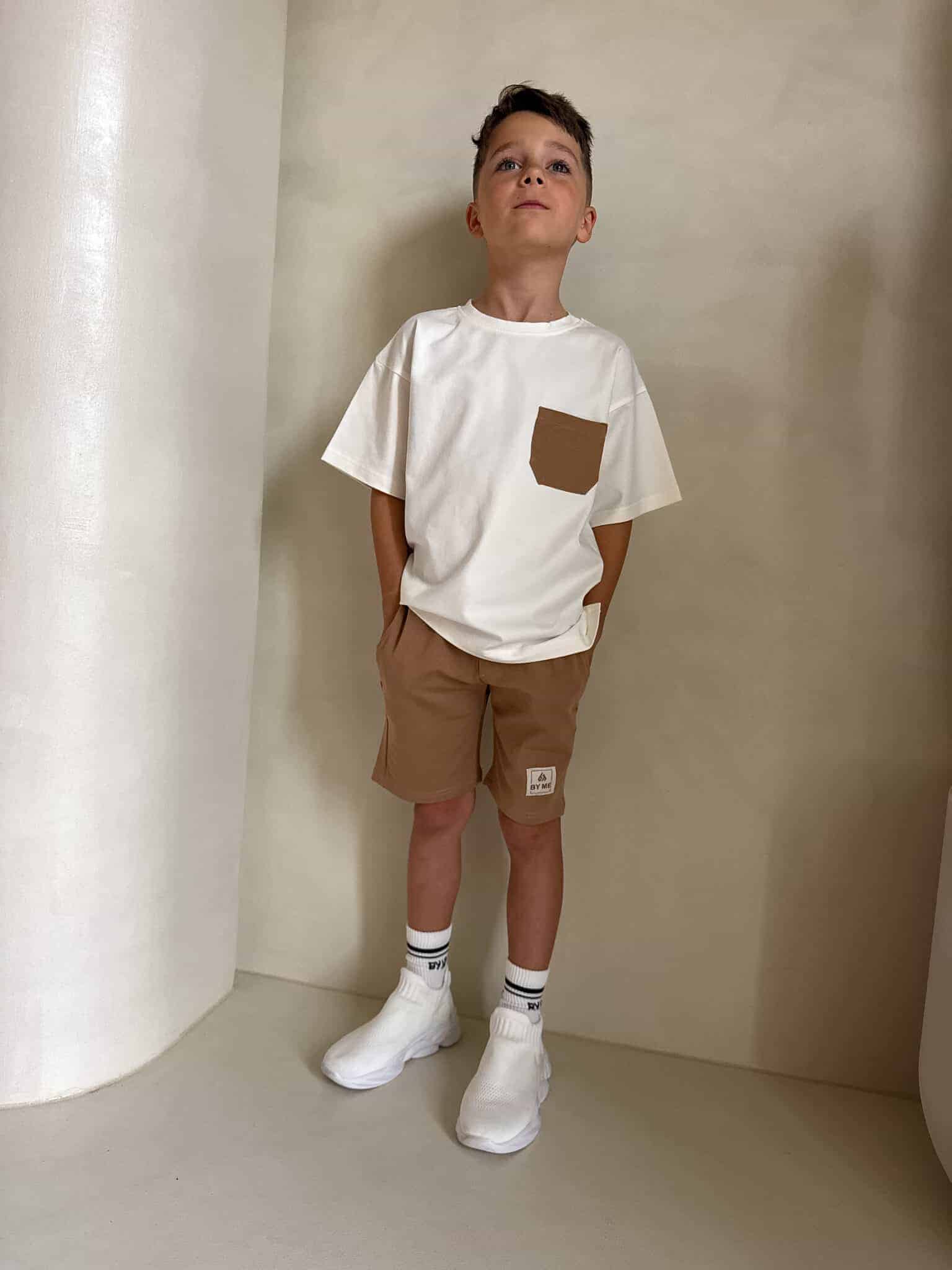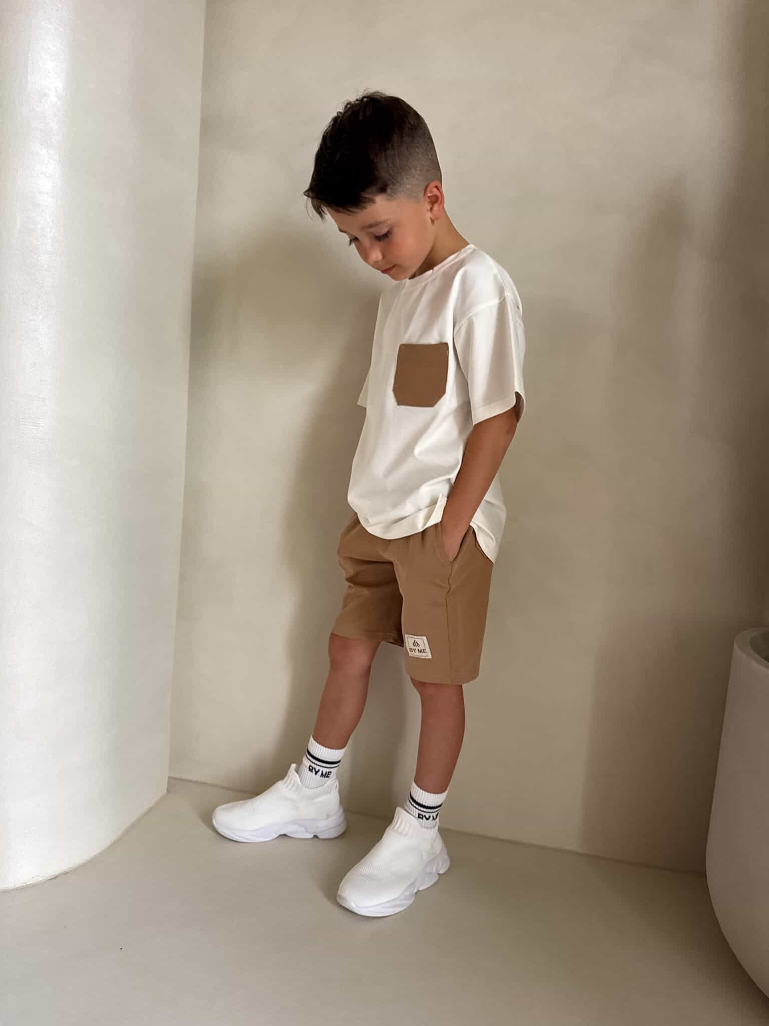 Wygodny i stylowy komplet dziecięcy, idealny na co dzień! W skład zestawu wchodzi bluzka z krótkim rękawem oraz krótkie spodenki. Miękki, przyjemny w dotyku materiał zapewnia komfort noszenia. Świetny wybór – do szkoły, na spacer czy zabawę!