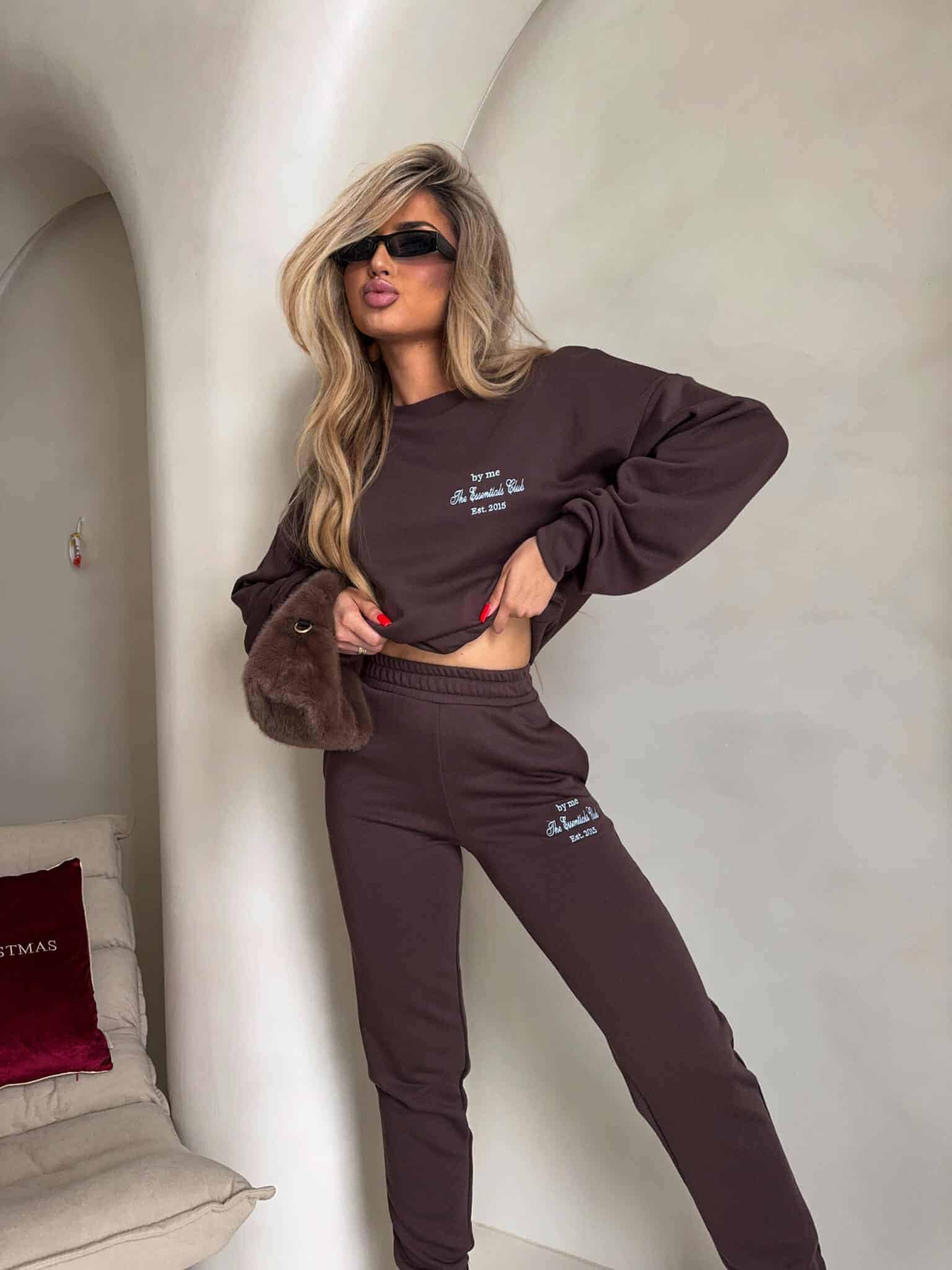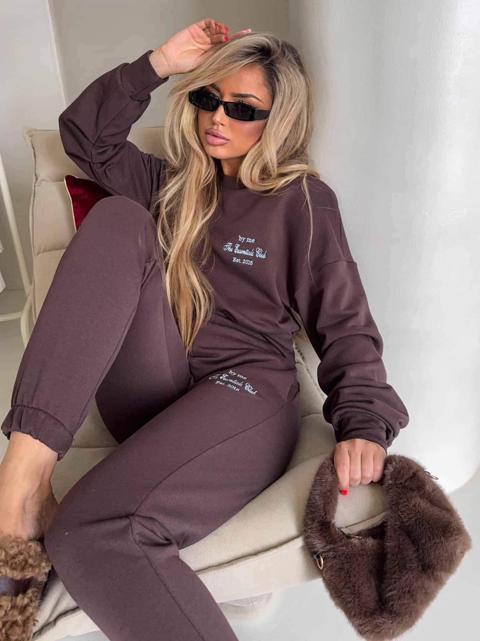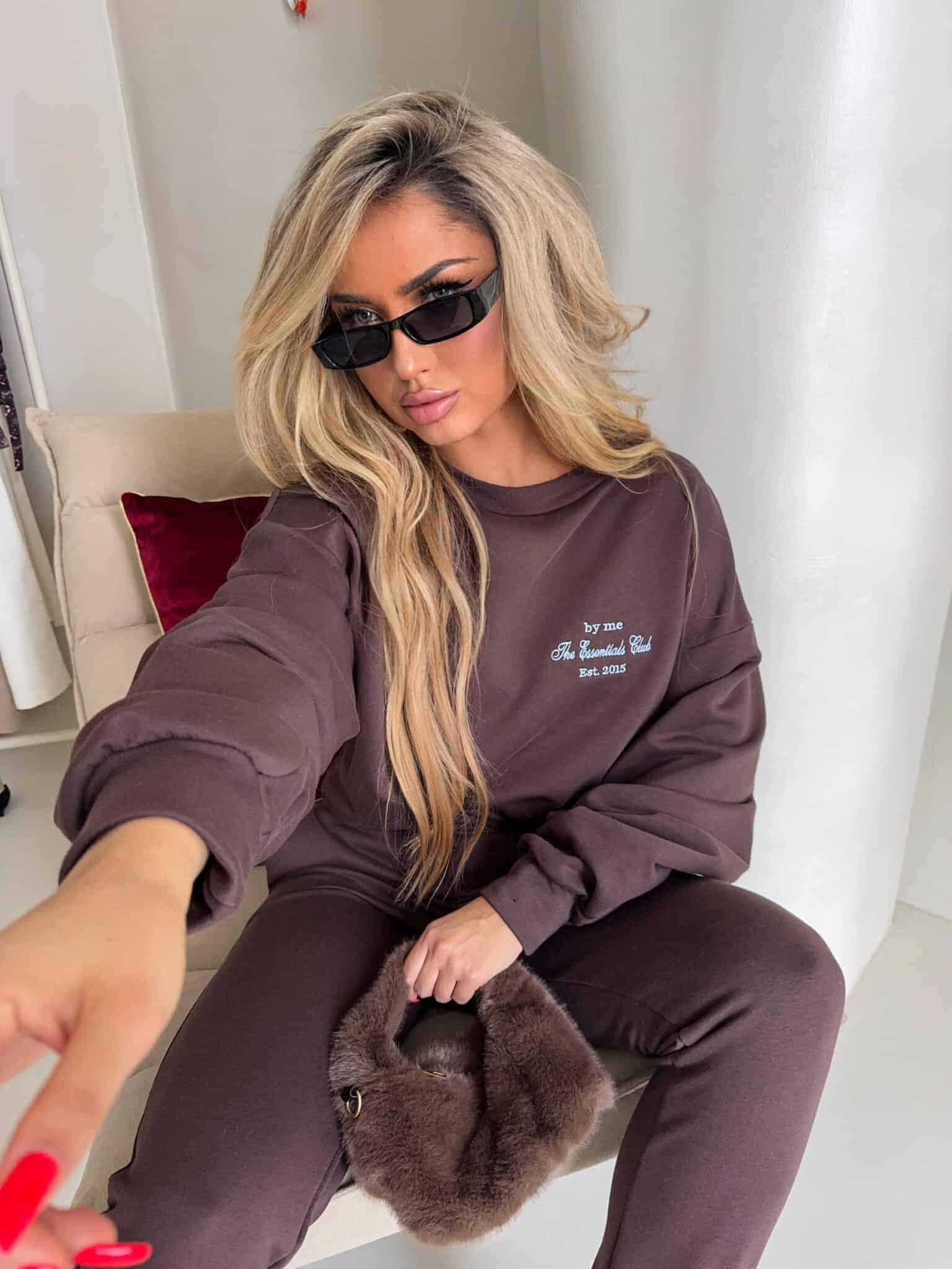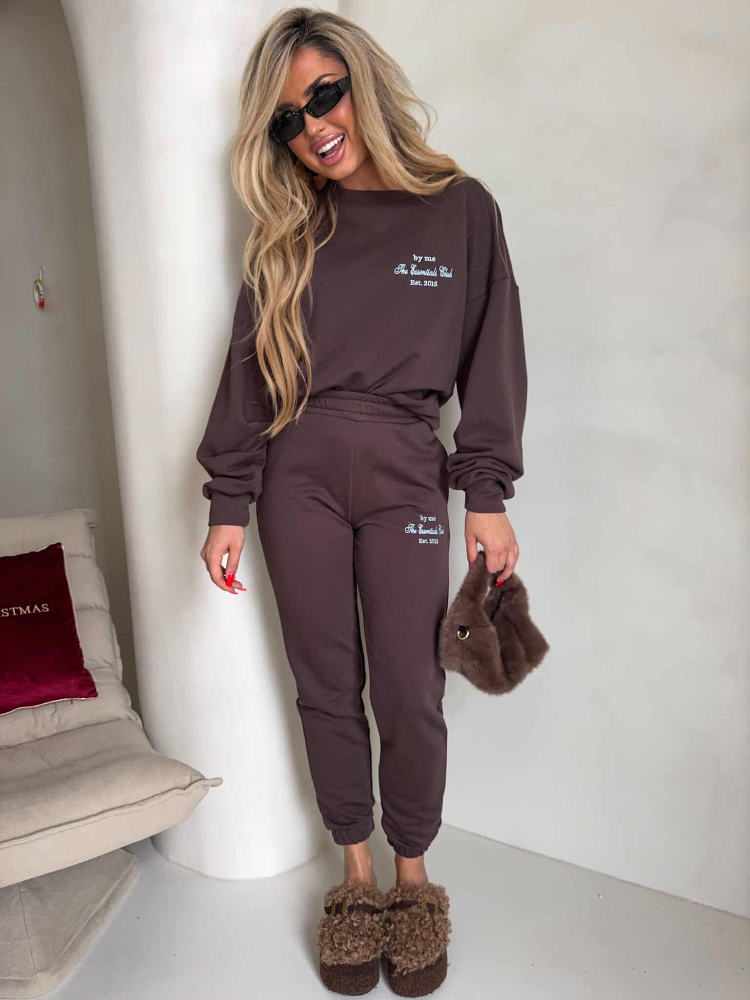 Komplet Essential składający się z bluzy o luźnym kroju, z długim rękawem oraz haftem na boku. Spodnie posiadają haft, gumki na nogawkach i w pasie oraz dwie wbudowane kieszenie.