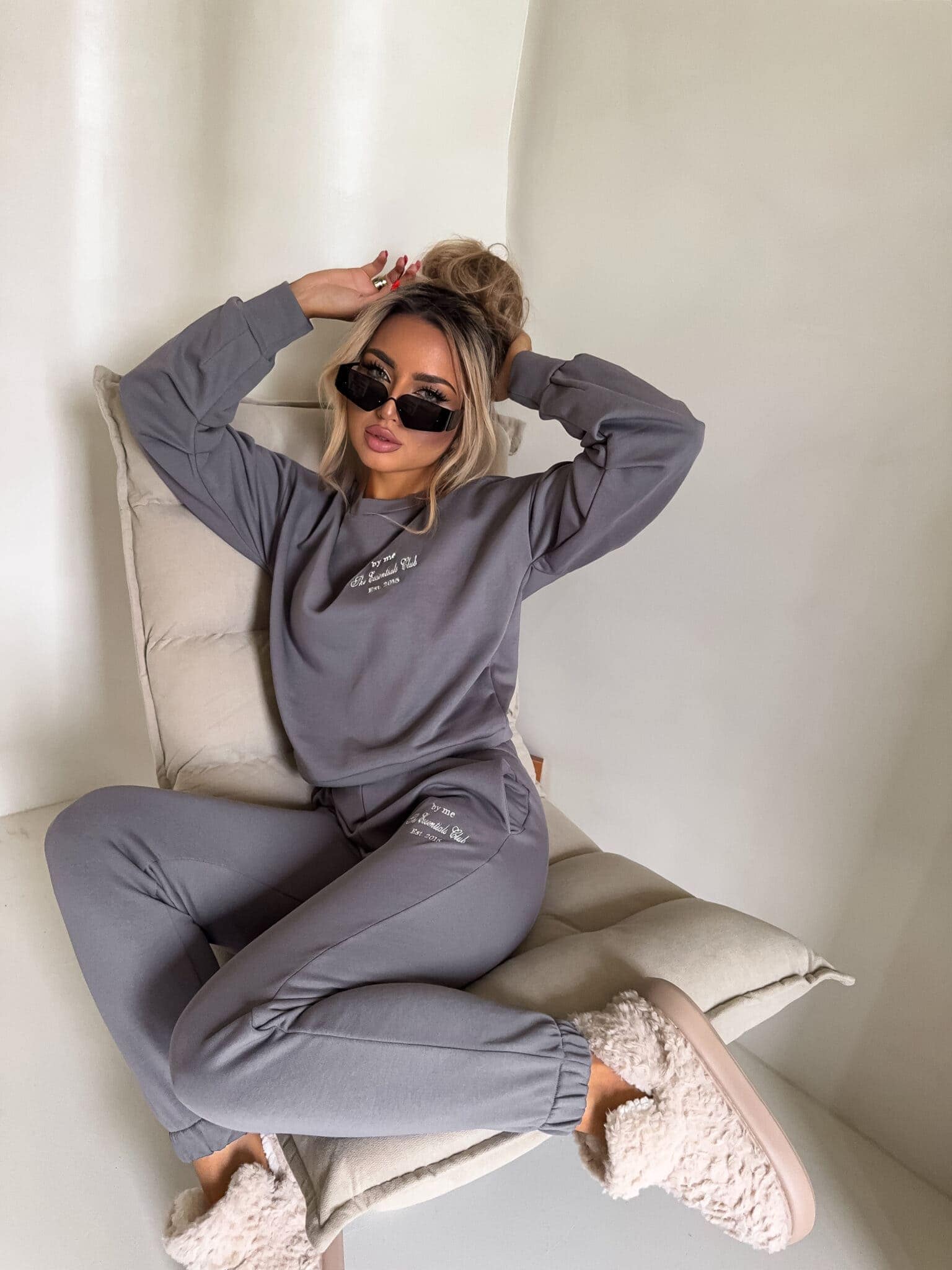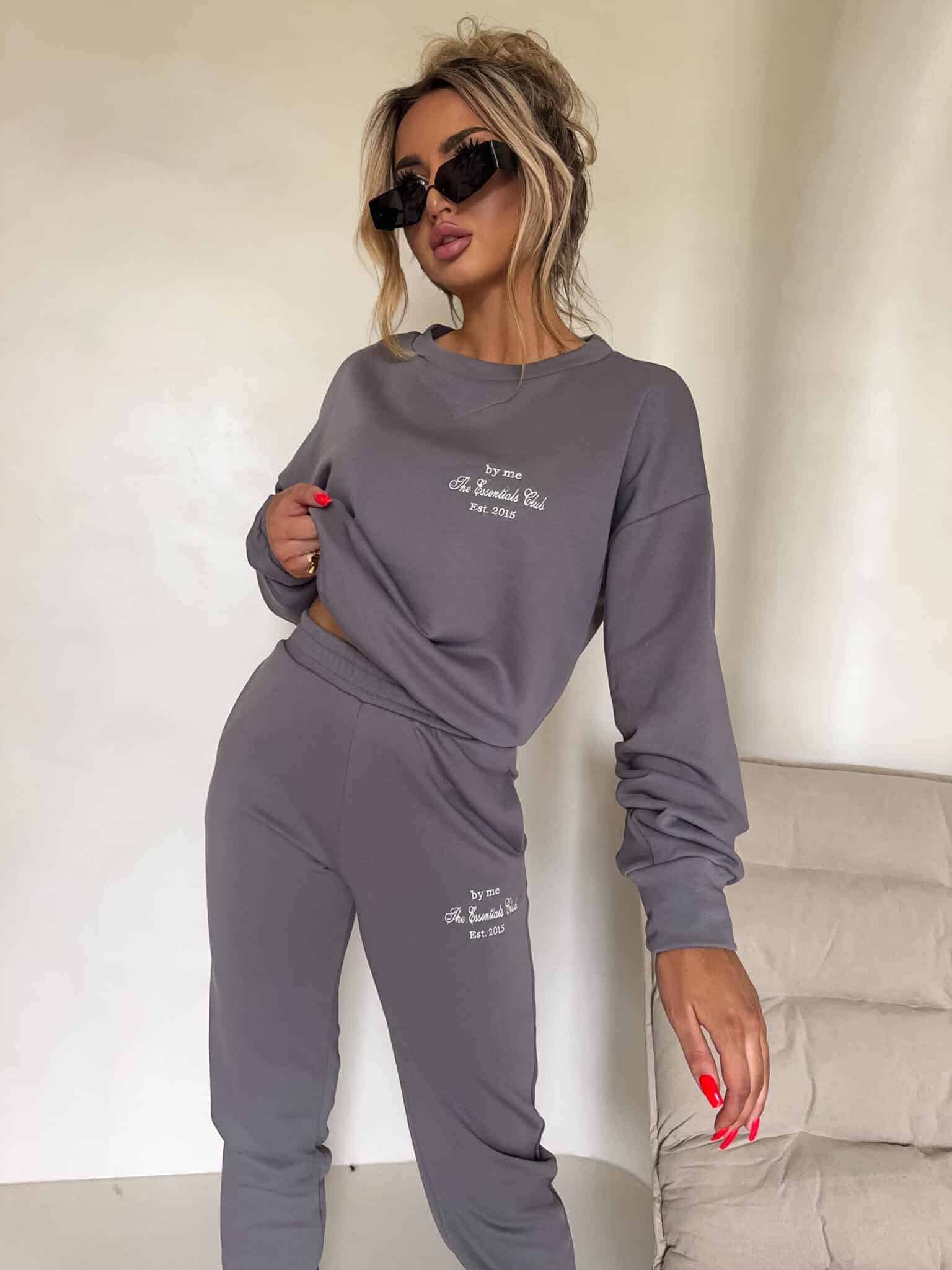 Komplet Essential składający się z bluzy o luźnym kroju, z długim rękawem oraz haftem na boku. Spodnie posiadają haft, gumki na nogawkach i w pasie oraz dwie wbudowane kieszenie.