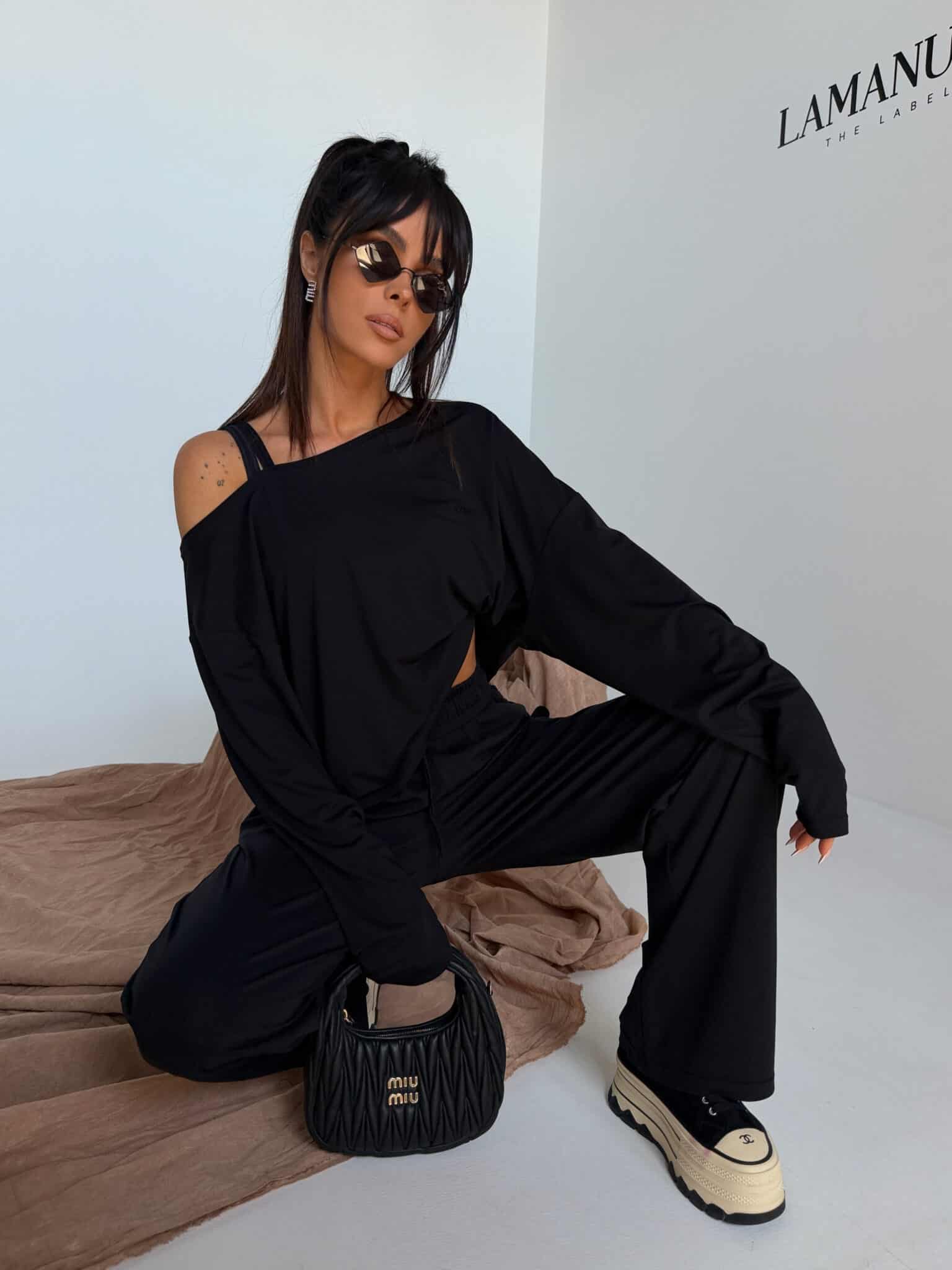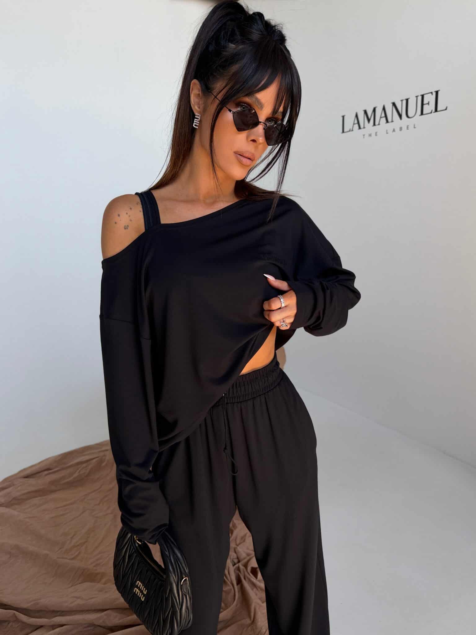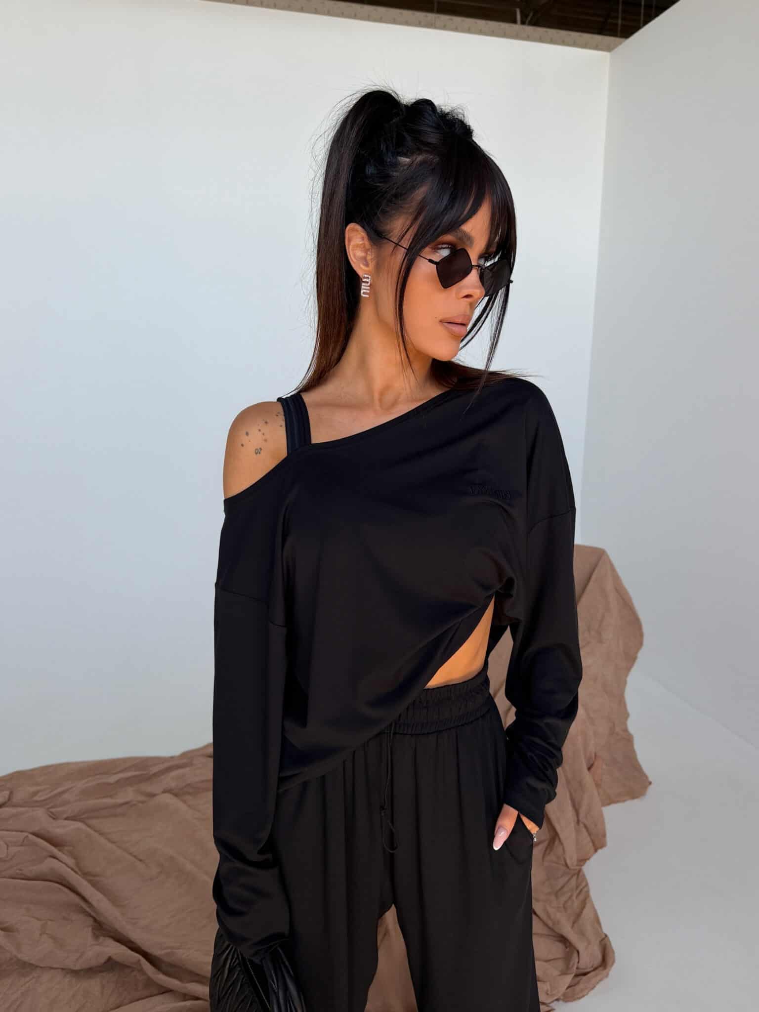 Minimalizm, który robi całą stylizację. Swobodna forma przełamana kobiecym detalem odsłoniętego ramienia. Oversize’owa bluza o luźnym kroju z obniżoną linią ramion, zestawiona ze spodniami z wysokim stanem i elastyczną talią. Komplet wykonany z miękkiej, lejącej dzianiny „masełko” która idealnie układa się na sylwetce i daje pełen komfort noszenia. Asymetryczny dekolt subtelnie eksponuje ciało, nadając całości nowoczesnego, lekko zmysłowego charakteru. Minimalistyczne wykończenie i delikatne logo podkreślają premium estetykę. Świetny jako total look – zarówno w wersji casualowej ze sneakersami, jak i w bardziej wyrazistym wydaniu z dodatkami.Skład: 60% wiskoza 31% nylon 9% spandex