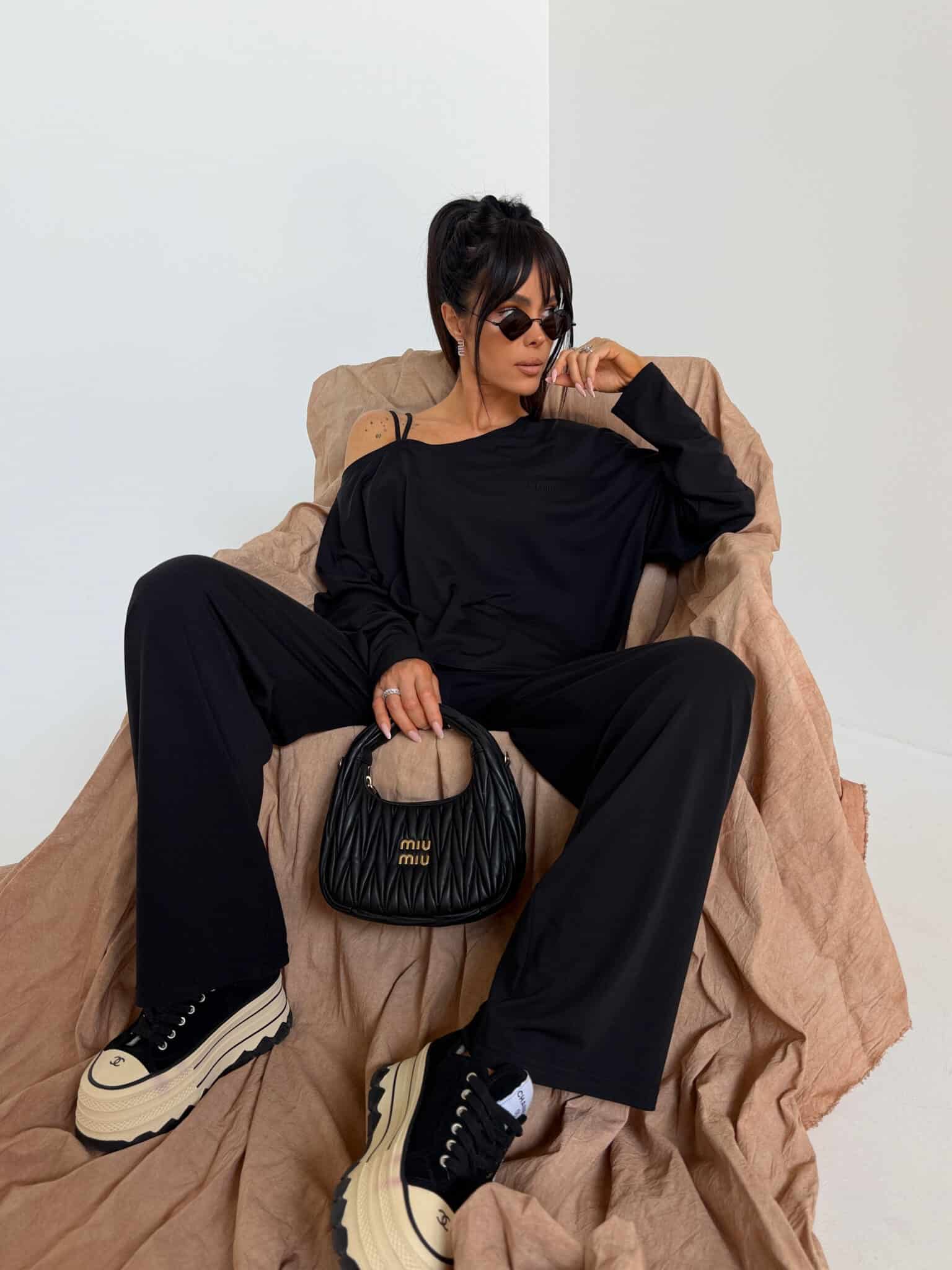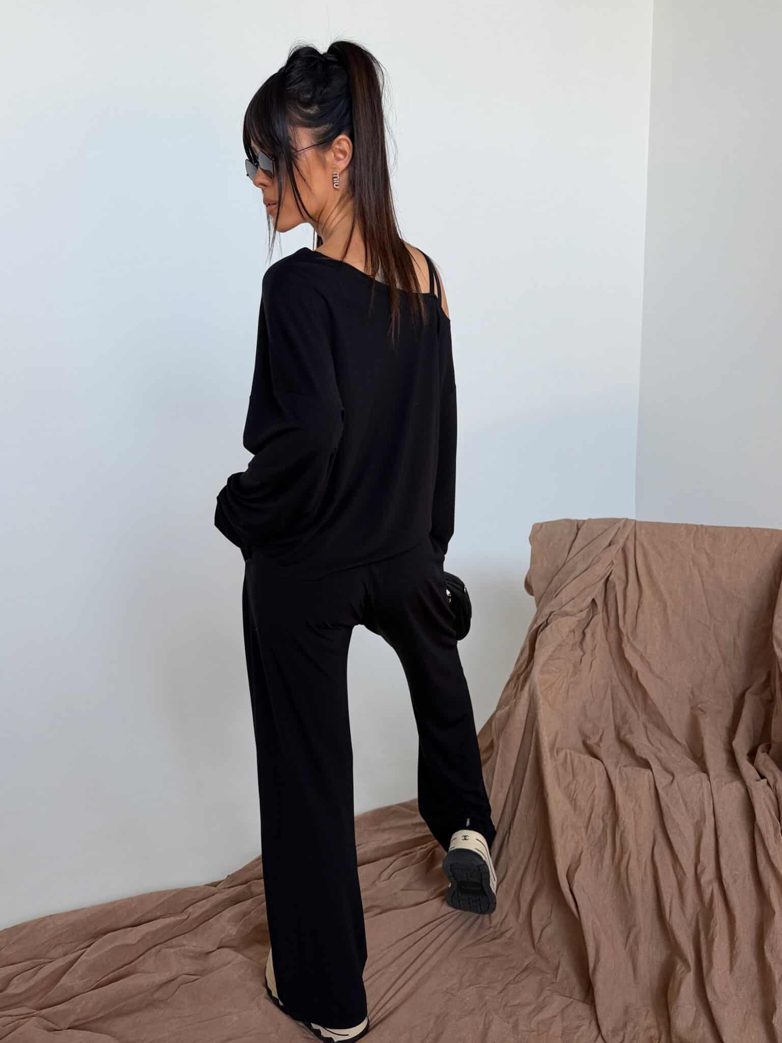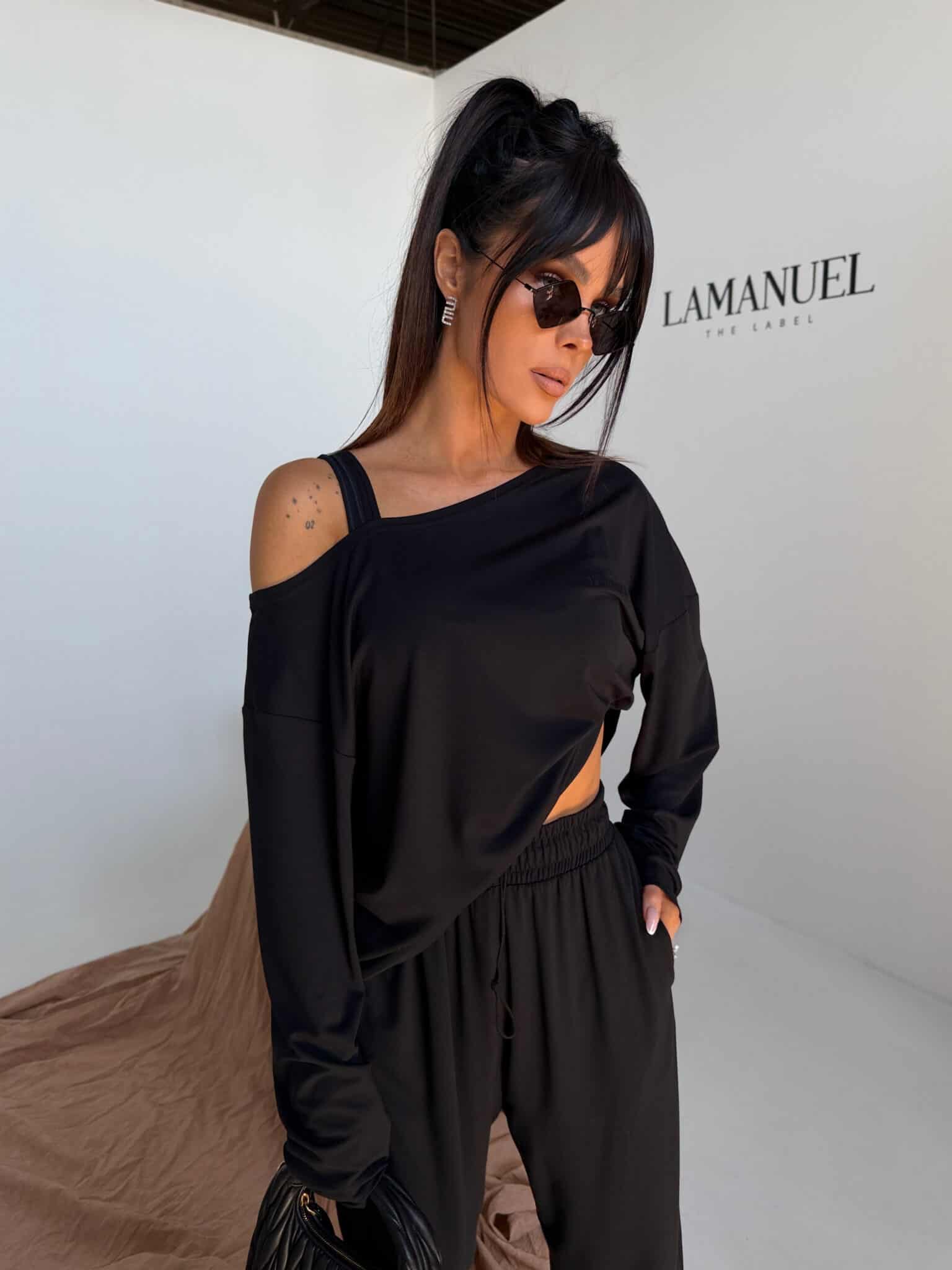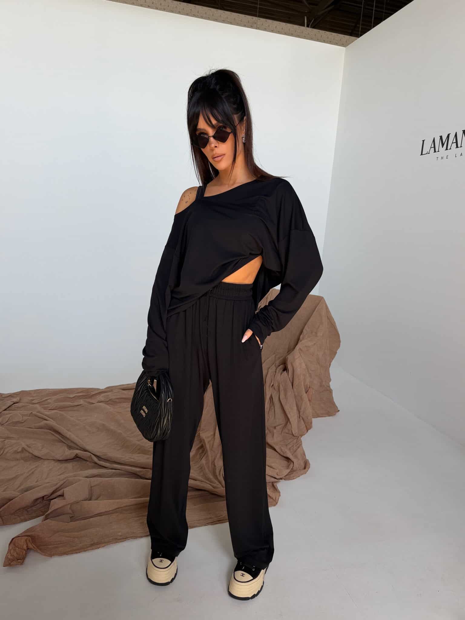 Minimalizm, który robi całą stylizację. Swobodna forma przełamana kobiecym detalem odsłoniętego ramienia. Oversize’owa bluza o luźnym kroju z obniżoną linią ramion, zestawiona ze spodniami z wysokim stanem i elastyczną talią. Komplet wykonany z miękkiej, lejącej dzianiny „masełko” która idealnie układa się na sylwetce i daje pełen komfort noszenia. Asymetryczny dekolt subtelnie eksponuje ciało, nadając całości nowoczesnego, lekko zmysłowego charakteru. Minimalistyczne wykończenie i delikatne logo podkreślają premium estetykę. Świetny jako total look – zarówno w wersji casualowej ze sneakersami, jak i w bardziej wyrazistym wydaniu z dodatkami.Skład: 60% wiskoza 31% nylon 9% spandex