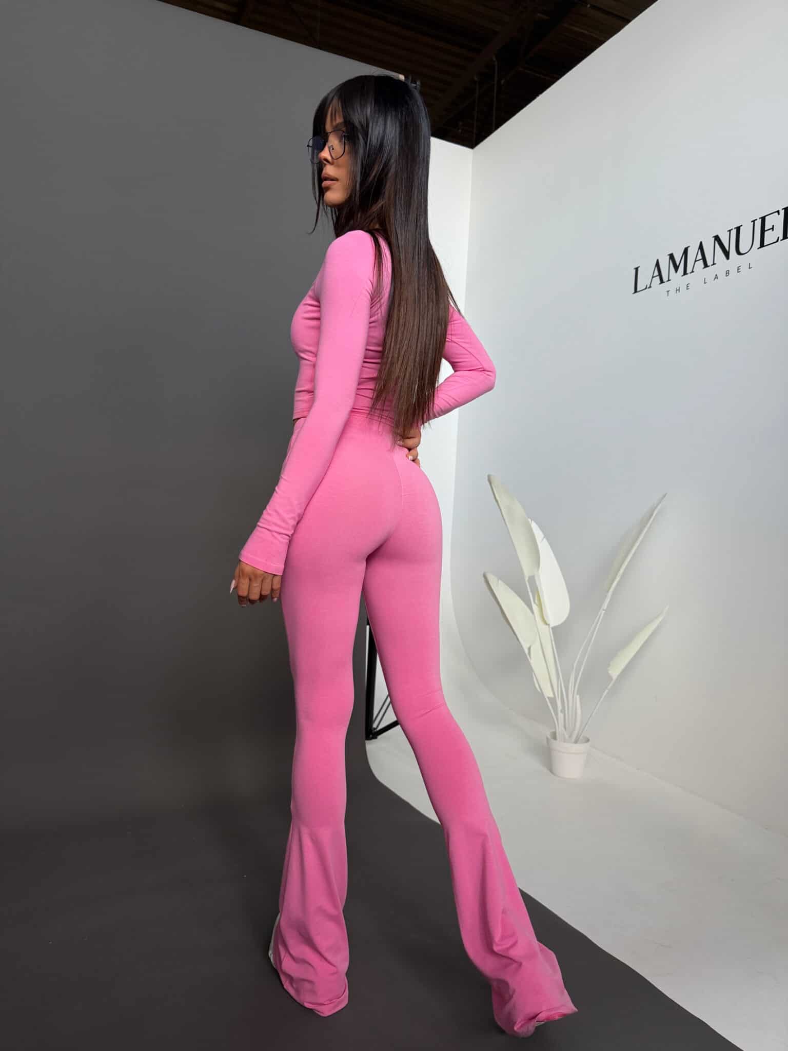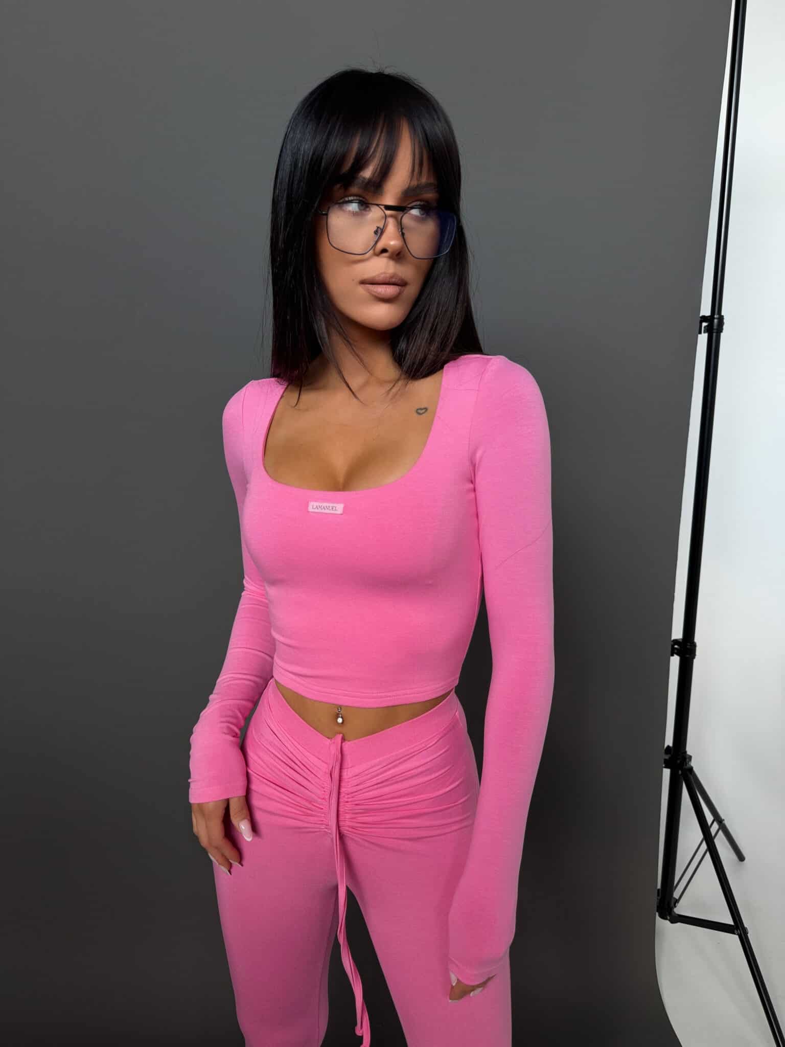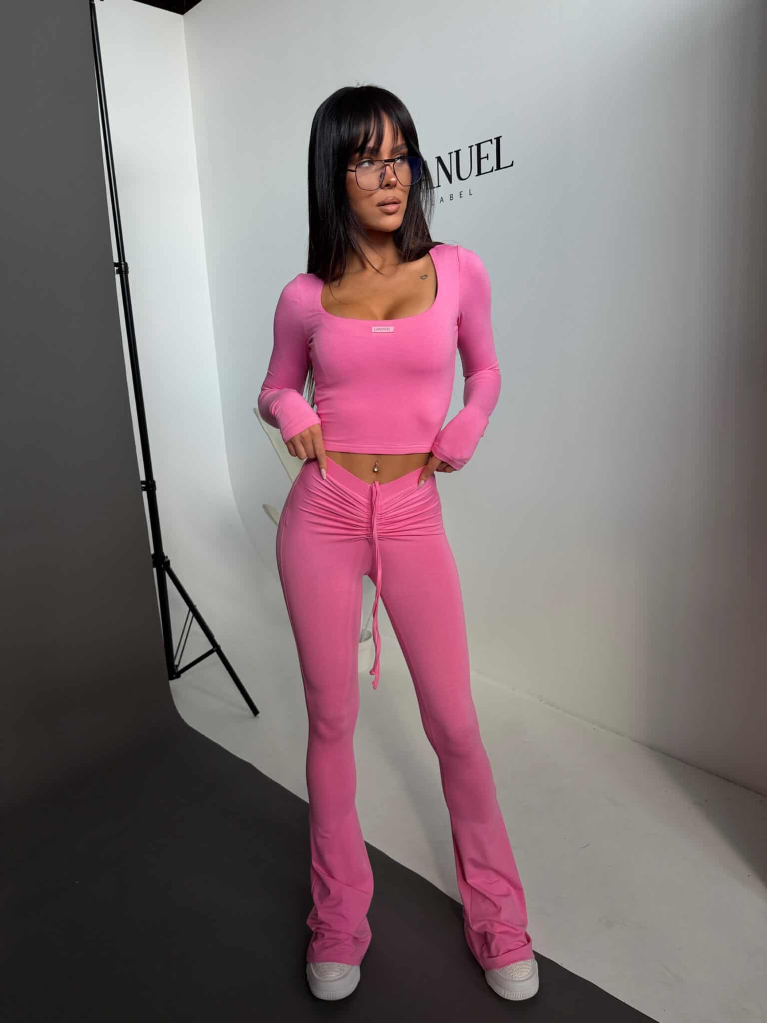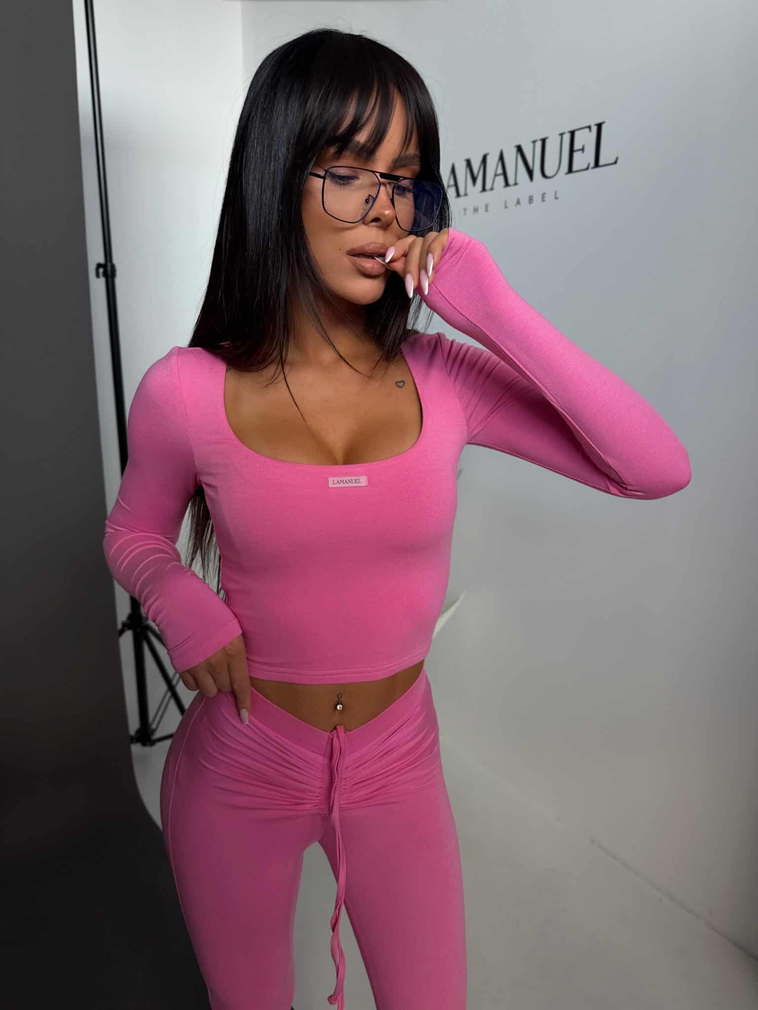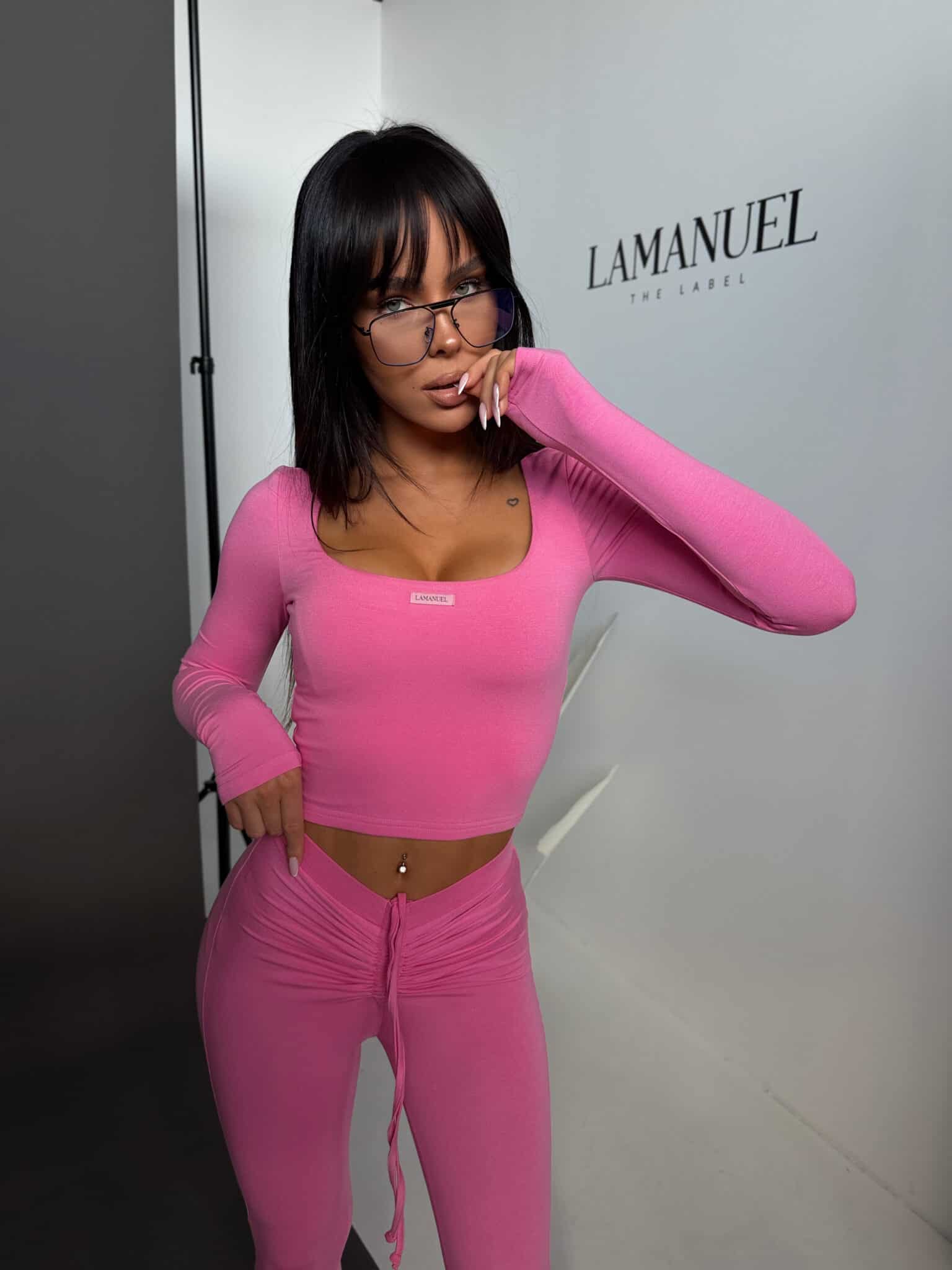 Komplet wykonany z miękkiej, elastycznej wiskozy, która dopasowuje się do sylwetki i podkreśla jej kształt. Składa się z dopasowanej bluzki z długim rękawem i kobiecym, kwadratowym dekoltem oraz legginsów z efektownym marszczeniem i regulacją w pasie. Materiał jest przyjemny w dotyku, lekki i komfortowy w noszeniu, a całość tworzy spójny, nowoczesny zestaw o wyrazistym, kobiecym charakterze.Skład: 95% wiskoza 5% elastan