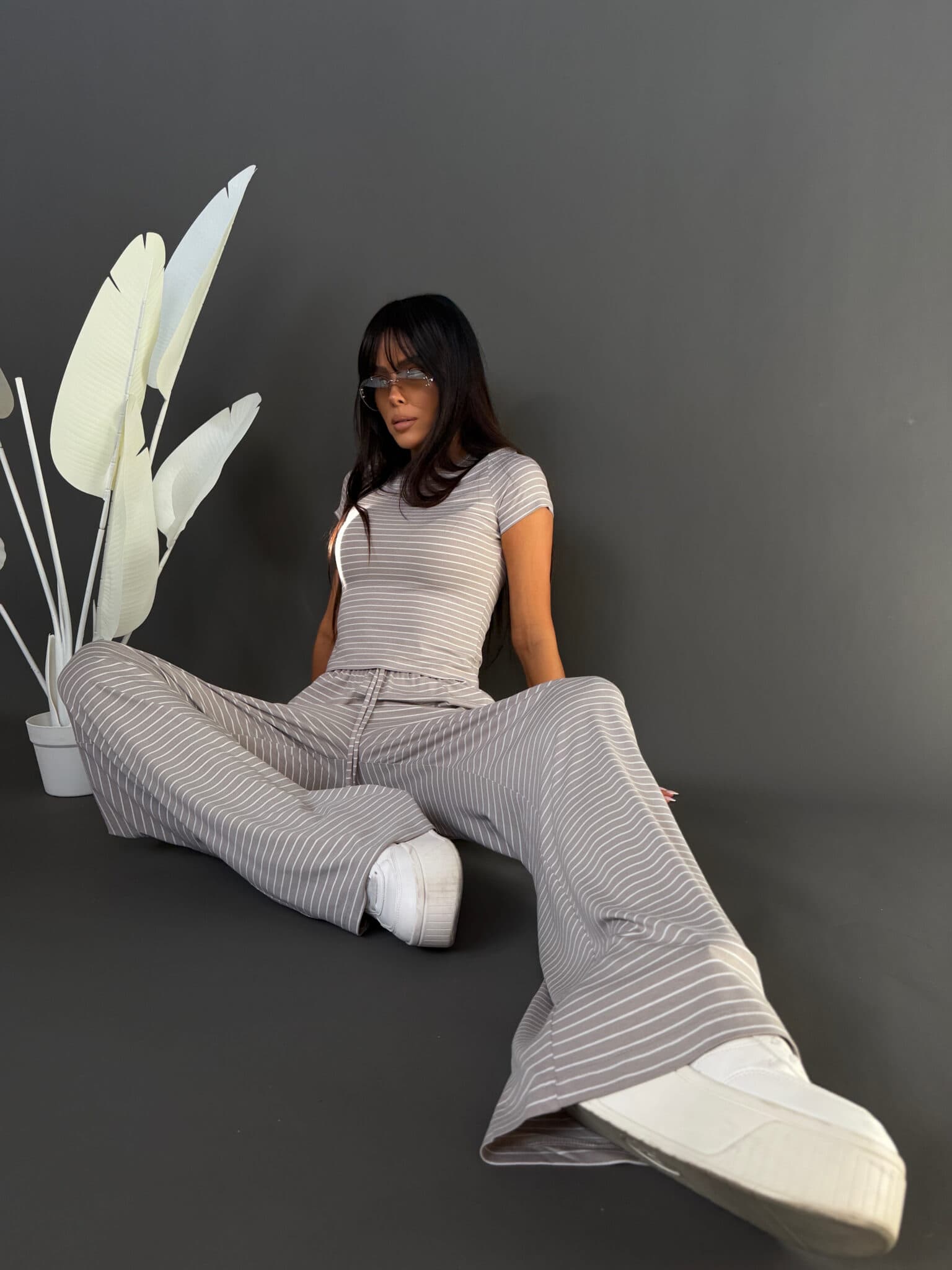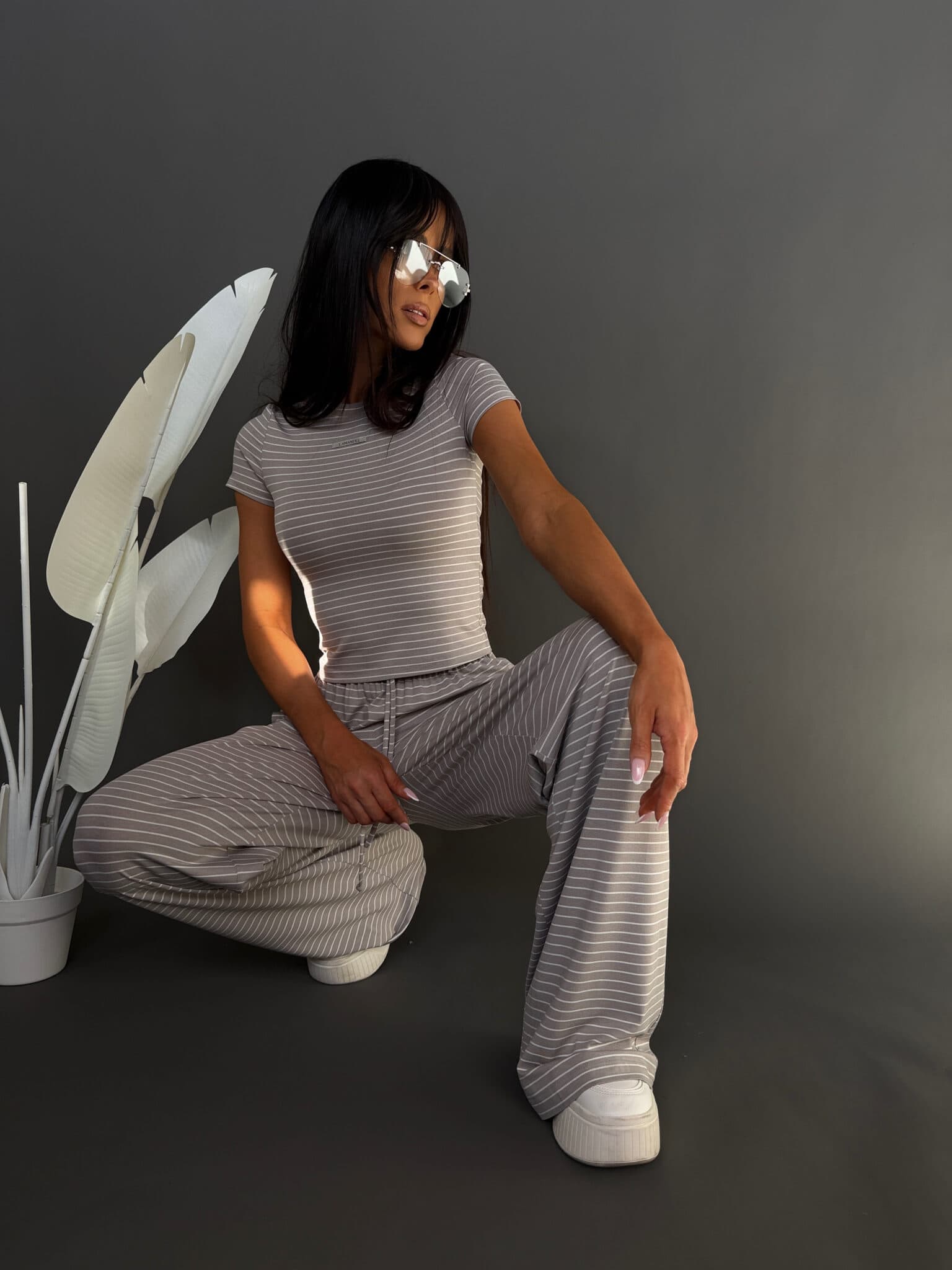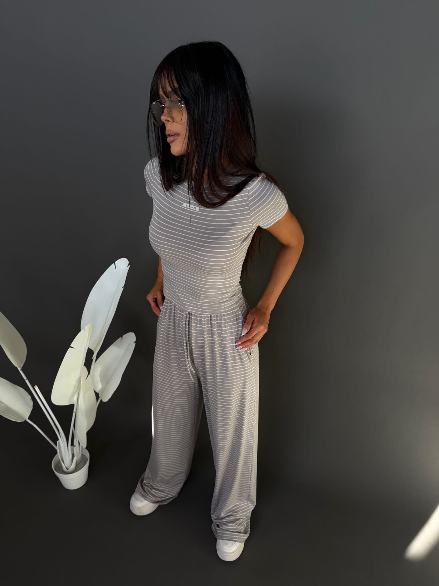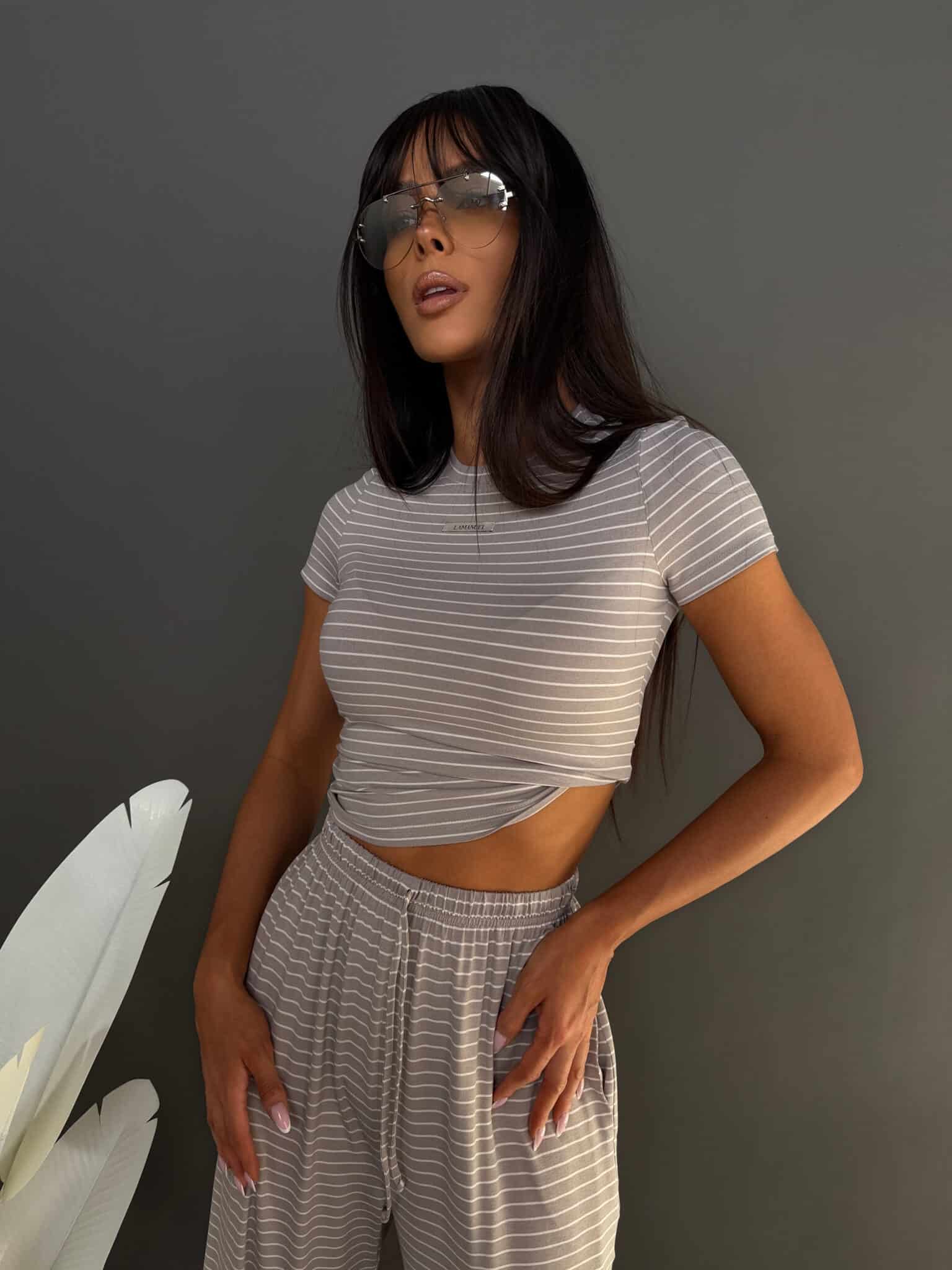 Komplet z miękkiej, lejącej wiskozy, która nadaje całości lekki i swobodny charakter. Dłuższy top o klasycznym kroju dobrze układa się na sylwetce i stanowi zbalansowaną górę dla luźniejszych spodni. Delikatne paski podkreślają casualowy styl modelu, a szeroka nogawka dodaje mu luzu i nowoczesnej formy. To wygodny, gotowy look, który nie wymaga wielu dodatków.Skład: 95% wiskoza 5% elastan