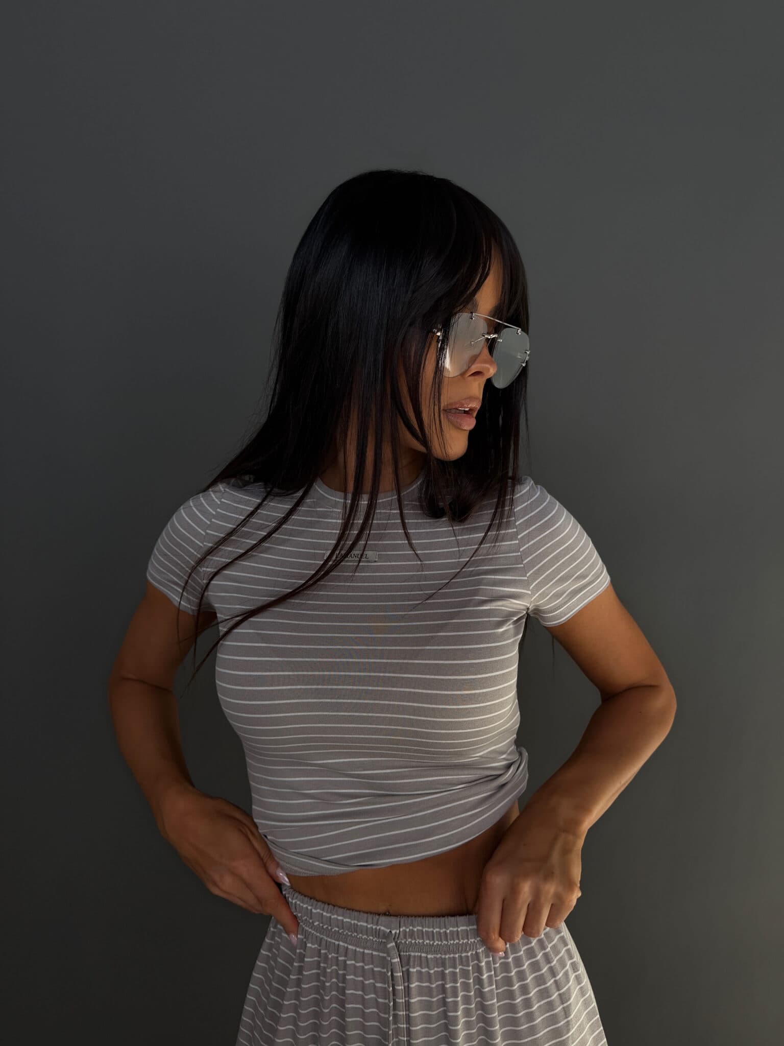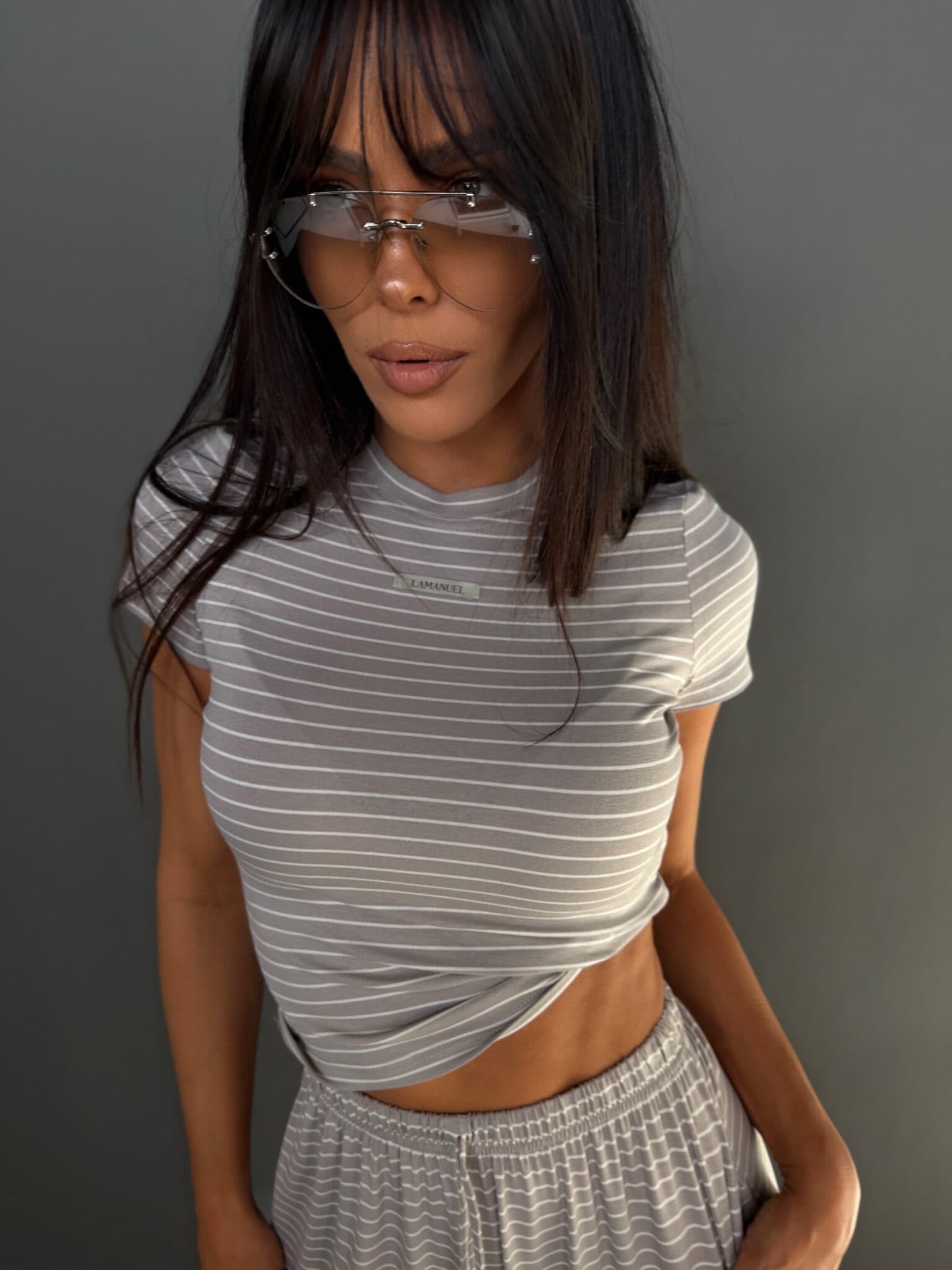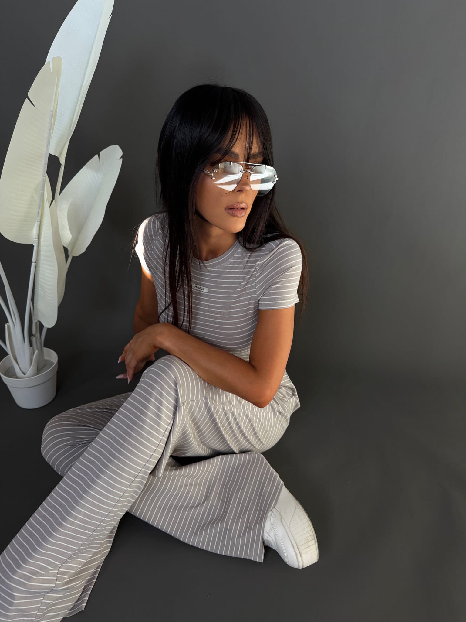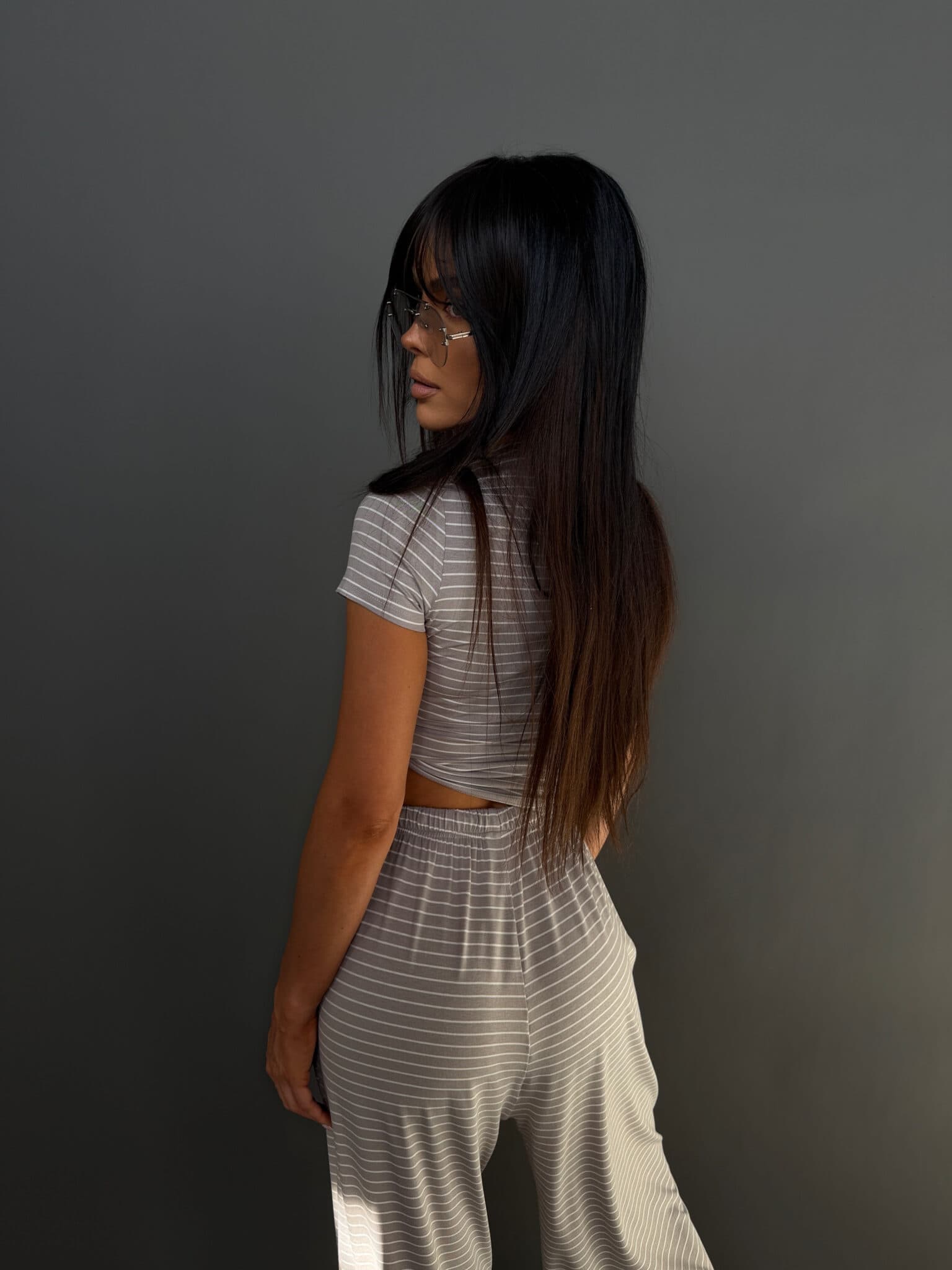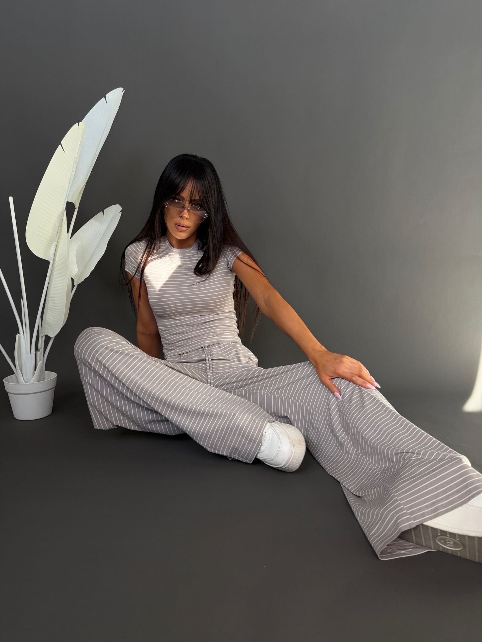 Komplet z miękkiej, lejącej wiskozy, która nadaje całości lekki i swobodny charakter. Dłuższy top o klasycznym kroju dobrze układa się na sylwetce i stanowi zbalansowaną górę dla luźniejszych spodni. Delikatne paski podkreślają casualowy styl modelu, a szeroka nogawka dodaje mu luzu i nowoczesnej formy. To wygodny, gotowy look, który nie wymaga wielu dodatków.Skład: 95% wiskoza 5% elastan