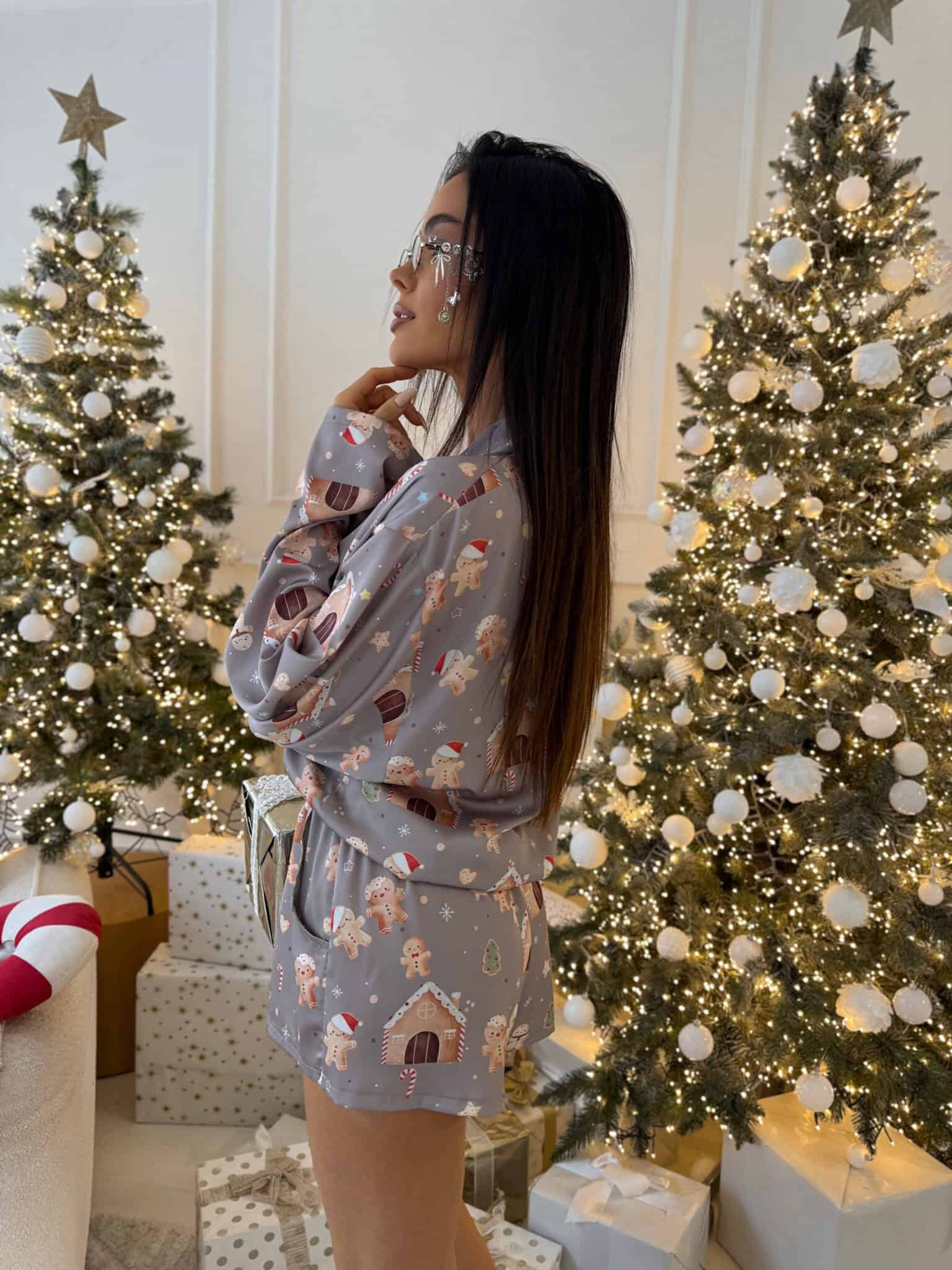 Dwuczęściowy komplet z kołnierzykiem i długim rękawem, który wygląda jak świąteczny klasyk w wersji premium. Luźna góra z zapięciem i krótkie szorty z elastyczną talią tworzą look wygodny, ale maksymalnie efektowny. Świąteczne printy w słodkim, dopracowanym stylu LAMANUEL przyciągają uwagę, a wykończenia i metka w talii podkreślają jakość. Idealny na świąteczne poranki, zdjęcia przy choince i wieczory, które mają wyglądać pięknie. Cute, wygodnie, ale z pazurem.Skład: 100% poliester