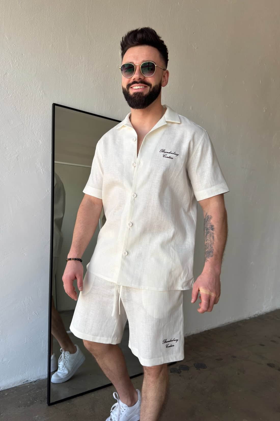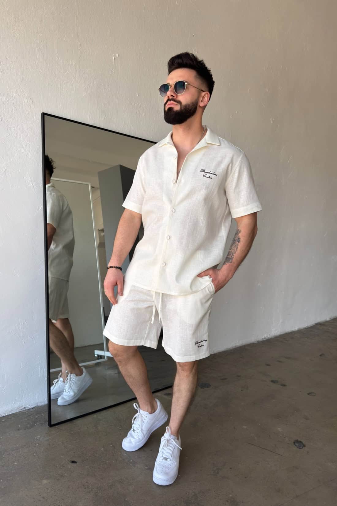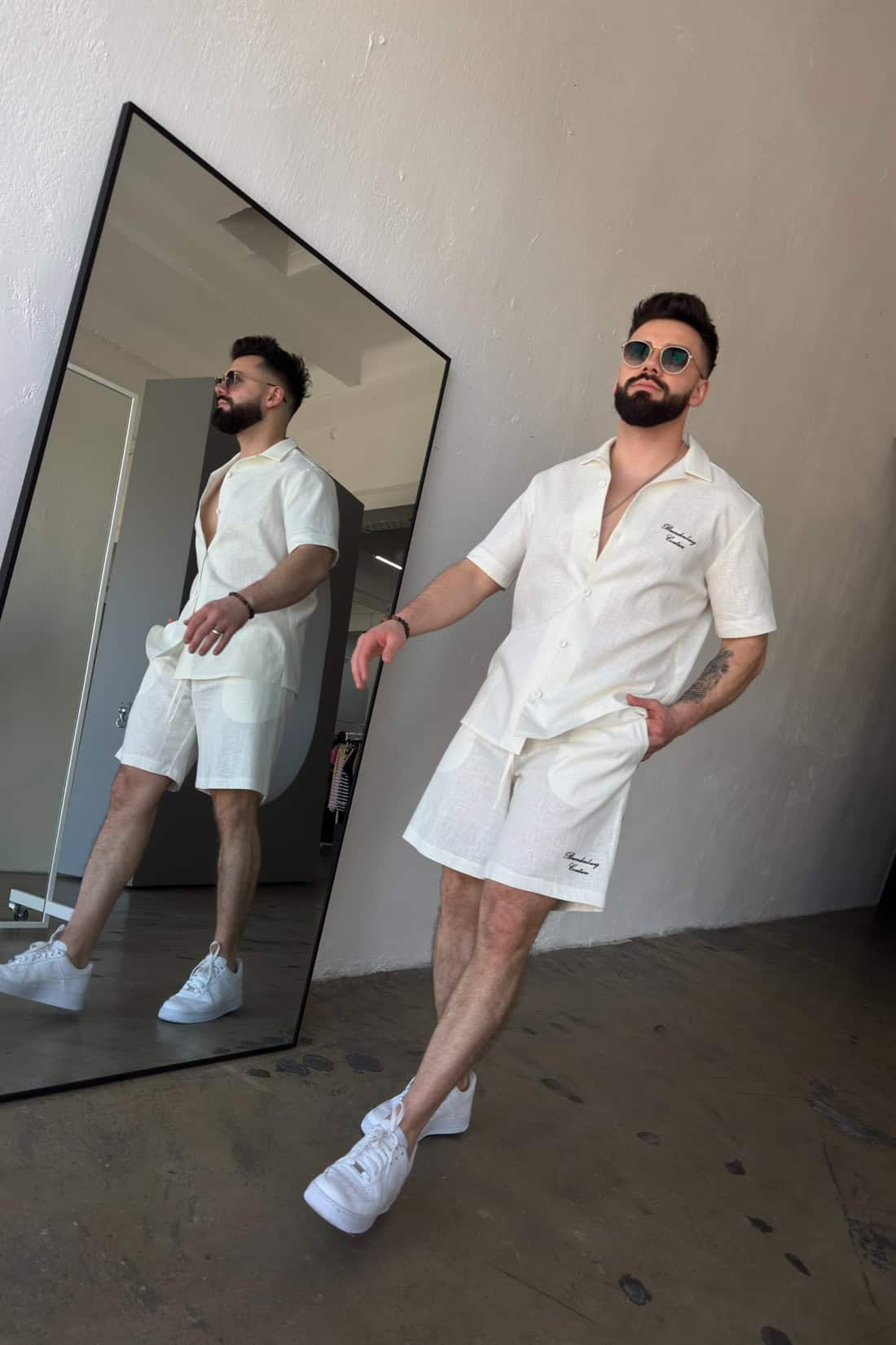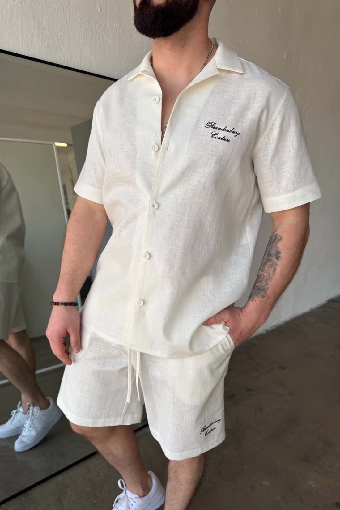 Opis produktu: Komplet lniany męski BG LATINO. Koszula oraz spodnie wykonane z wysokiej jakości lnianej tkaniny z domieszką bawełny. Koszula o luźnym kroju z krótkim rękawem zapinana na guziki. Szorty również o luźnym kroju. Posiadają gumkę oraz sznurek w pasie. Koszula oraz szorty ozdobione odręcznie pisaną nazwą marki BG Brandenburg Couture przeniesioną na produkt techniką haftu.