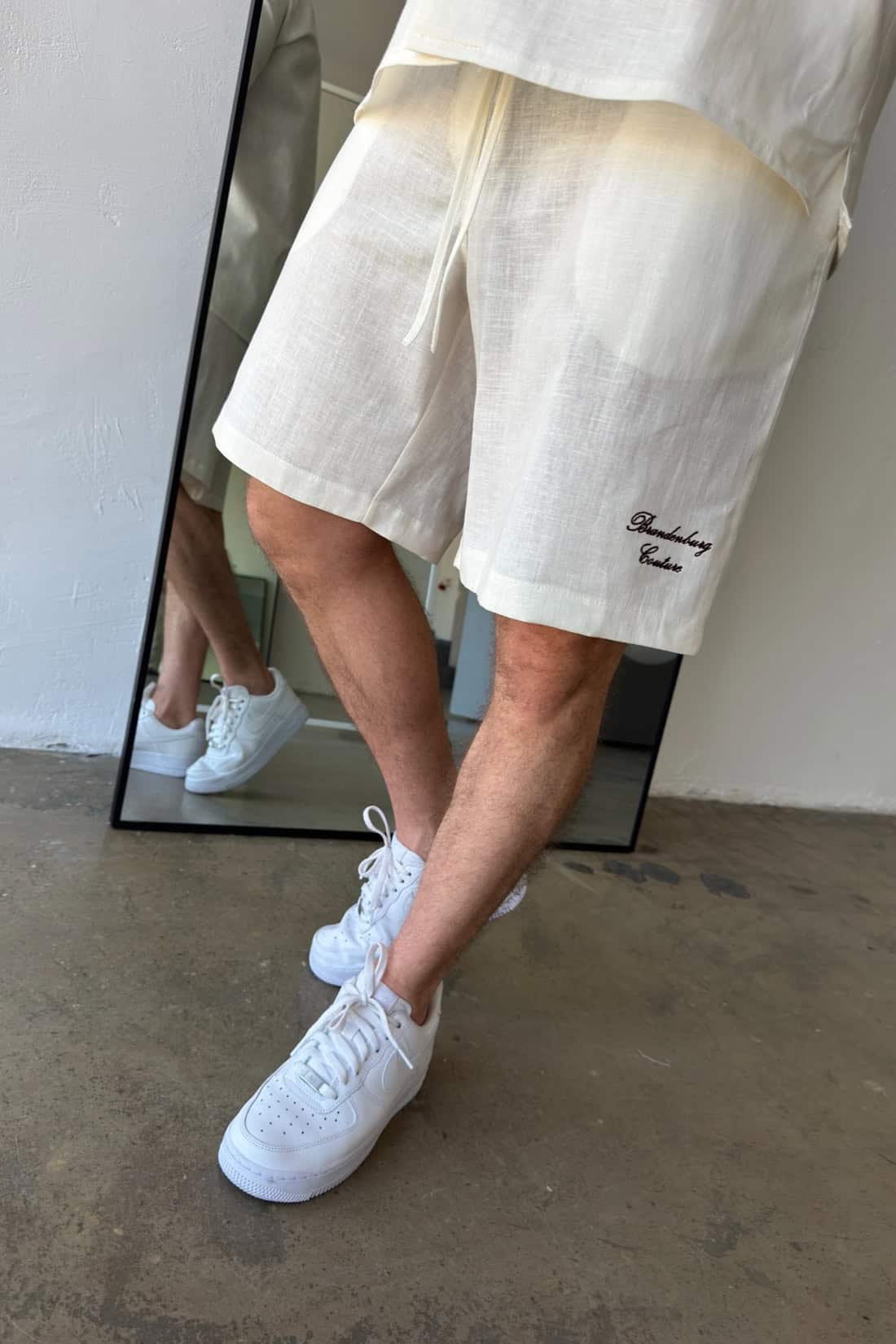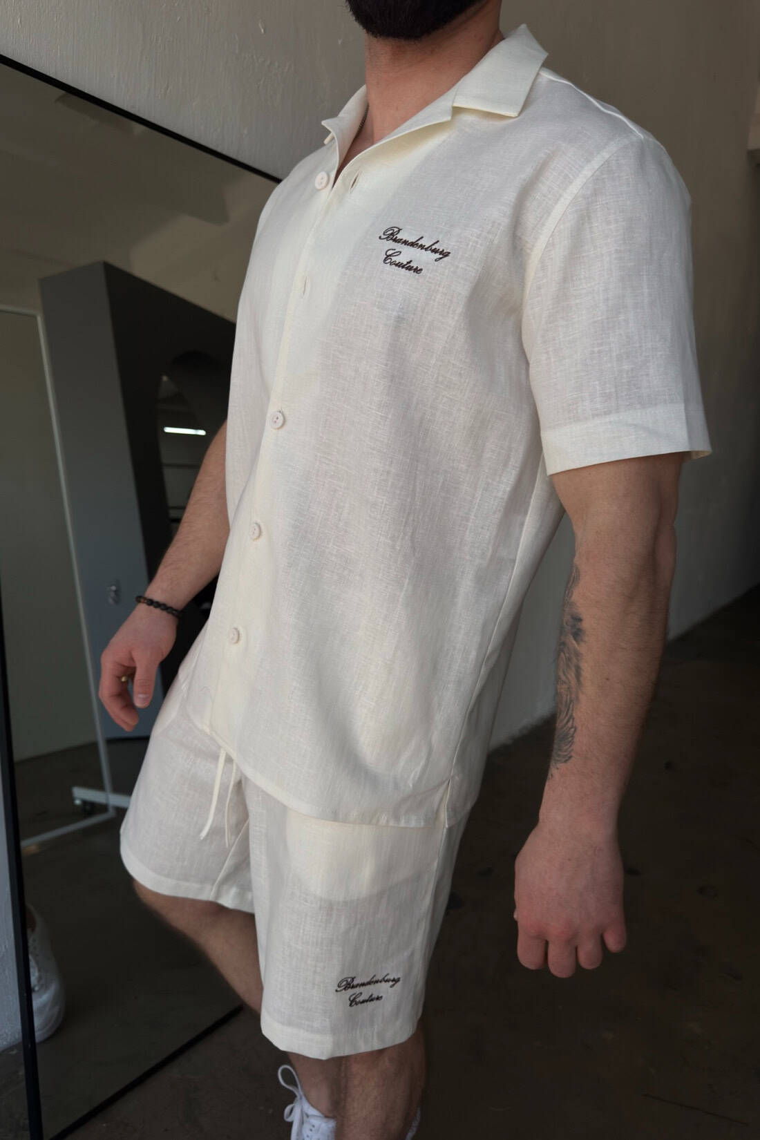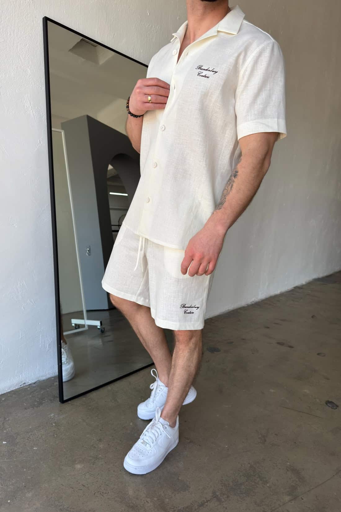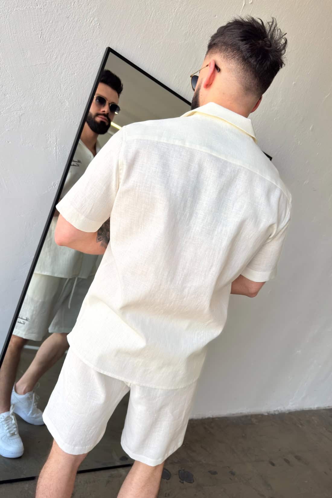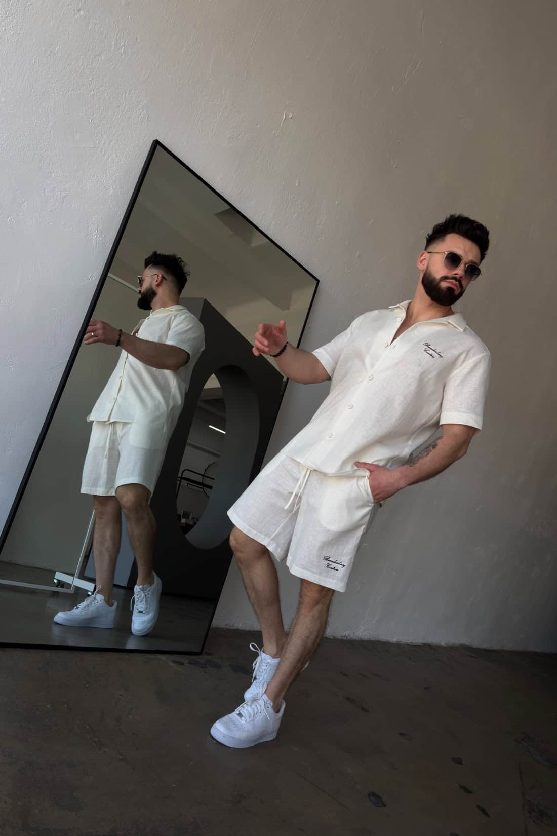 Opis produktu: Komplet lniany męski BG LATINO. Koszula oraz spodnie wykonane z wysokiej jakości lnianej tkaniny z domieszką bawełny. Koszula o luźnym kroju z krótkim rękawem zapinana na guziki. Szorty również o luźnym kroju. Posiadają gumkę oraz sznurek w pasie. Koszula oraz szorty ozdobione odręcznie pisaną nazwą marki BG Brandenburg Couture przeniesioną na produkt techniką haftu.