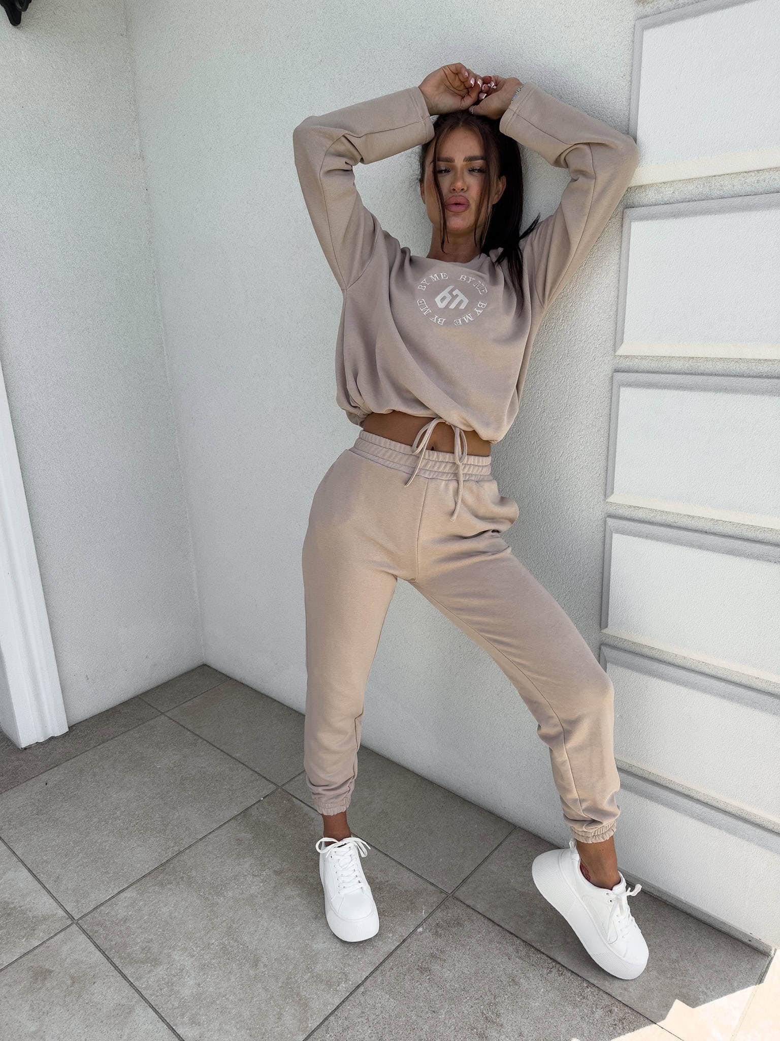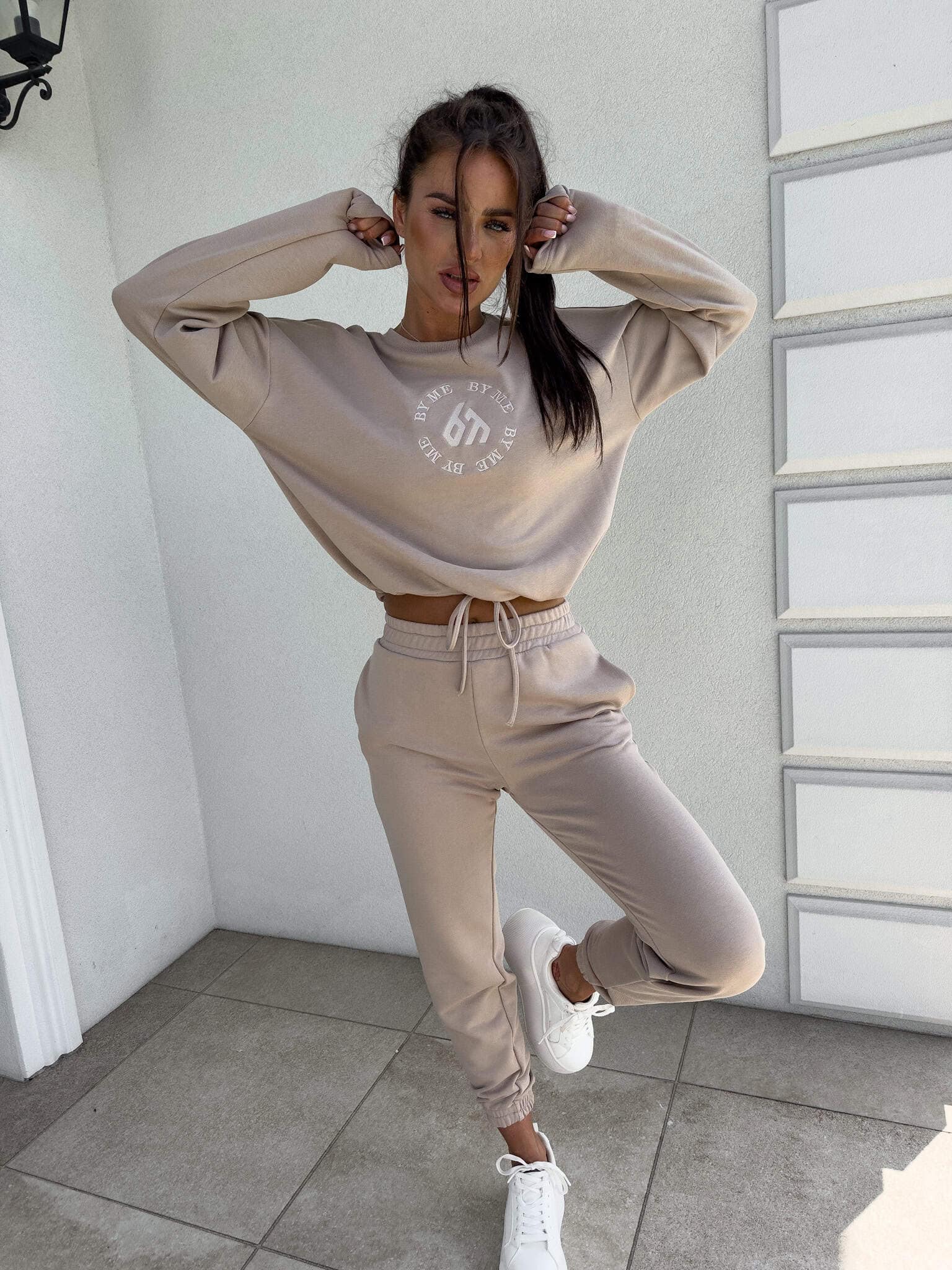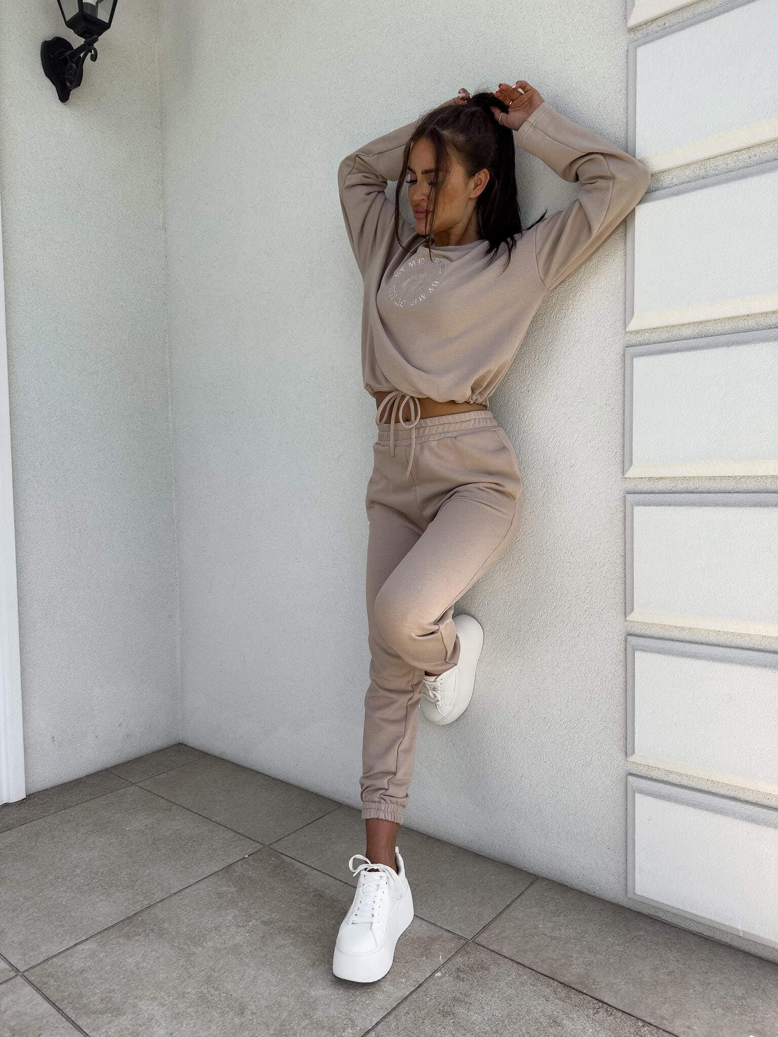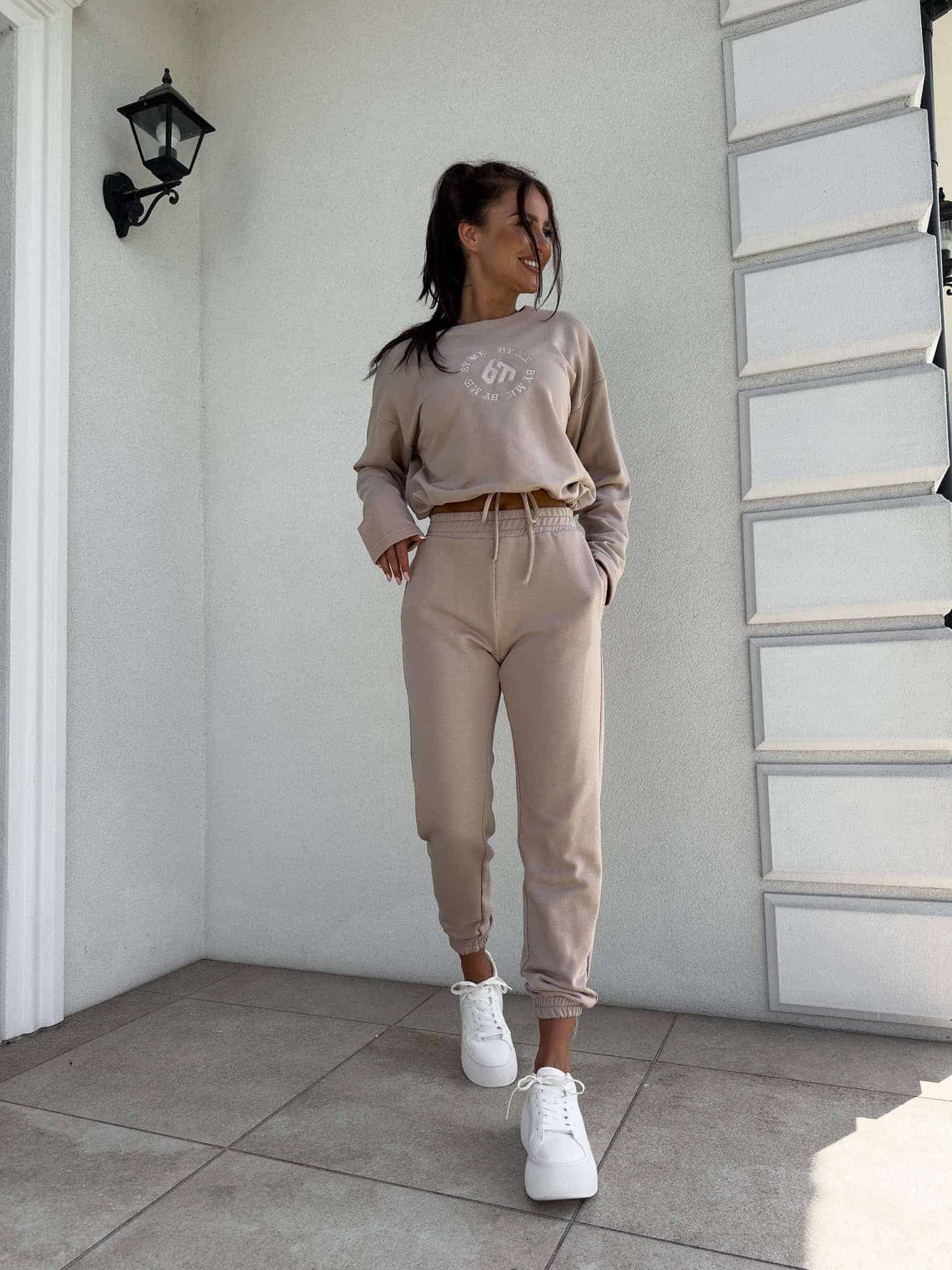 Komplet Louis składający się z bluzy o luźnym kroju, z długim rękawem z troczkiem regulującym długość oraz logowaniem na środku. Spodnie mają gumki na nogawkach i w pasie oraz dwie wbudowane kieszenie.