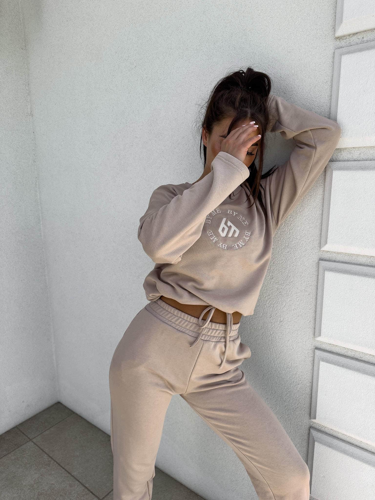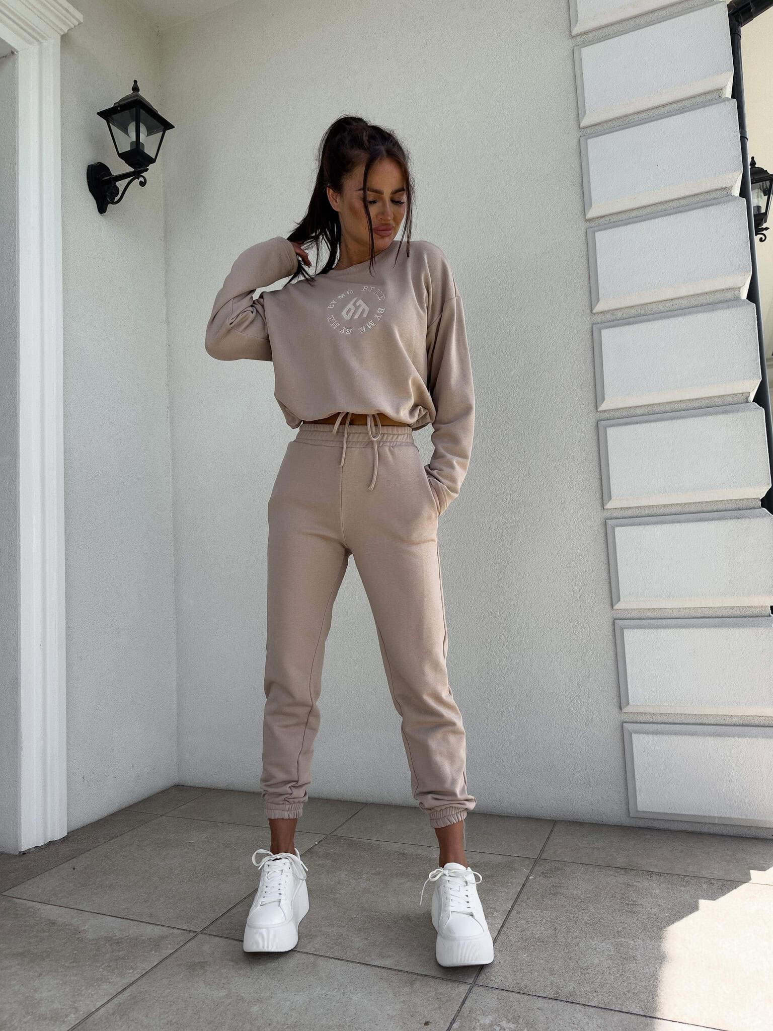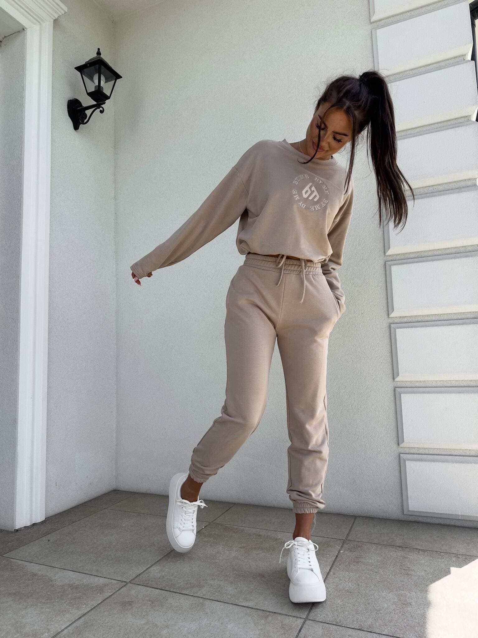 Komplet Louis składający się z bluzy o luźnym kroju, z długim rękawem z troczkiem regulującym długość oraz logowaniem na środku. Spodnie mają gumki na nogawkach i w pasie oraz dwie wbudowane kieszenie.