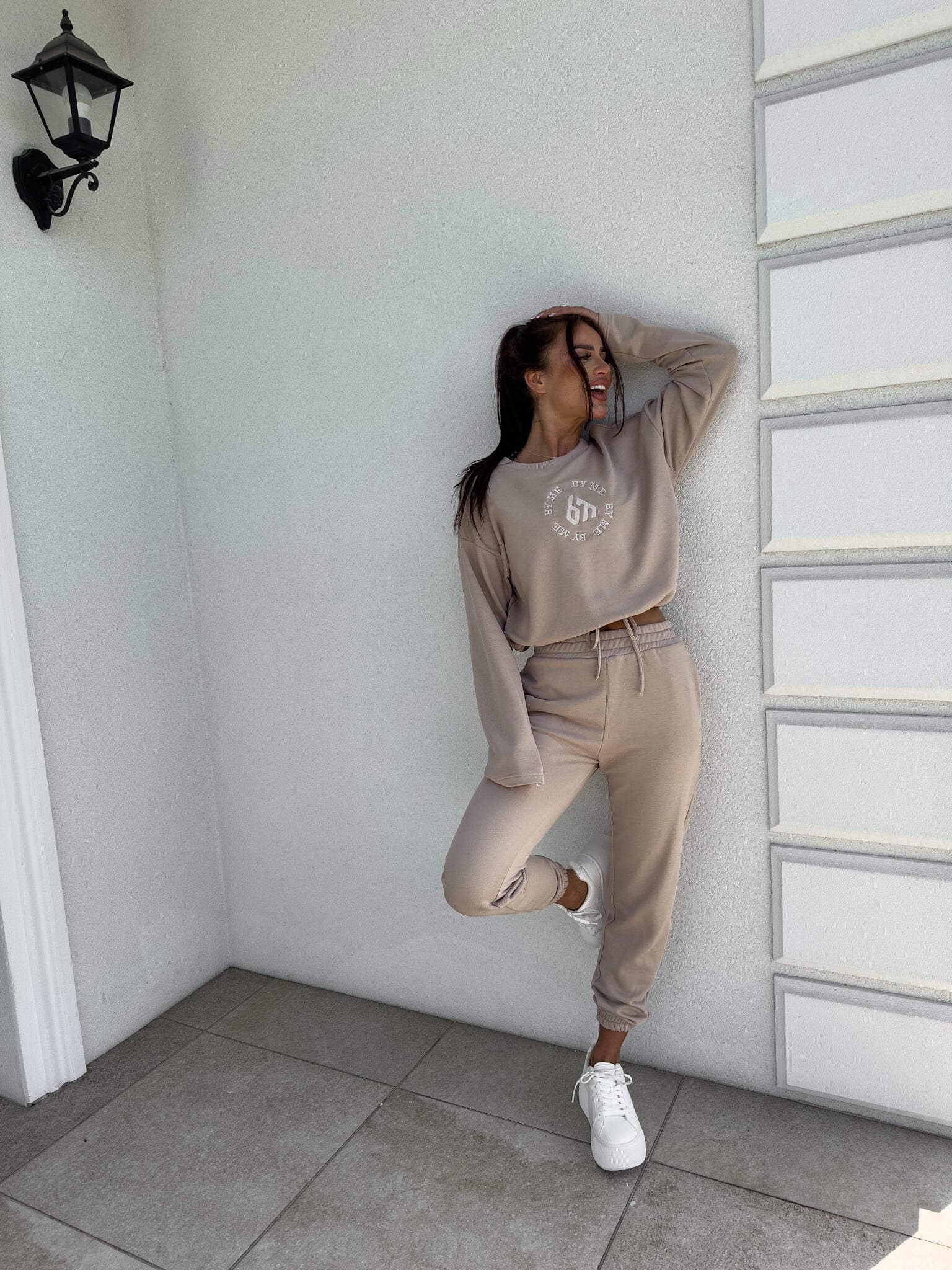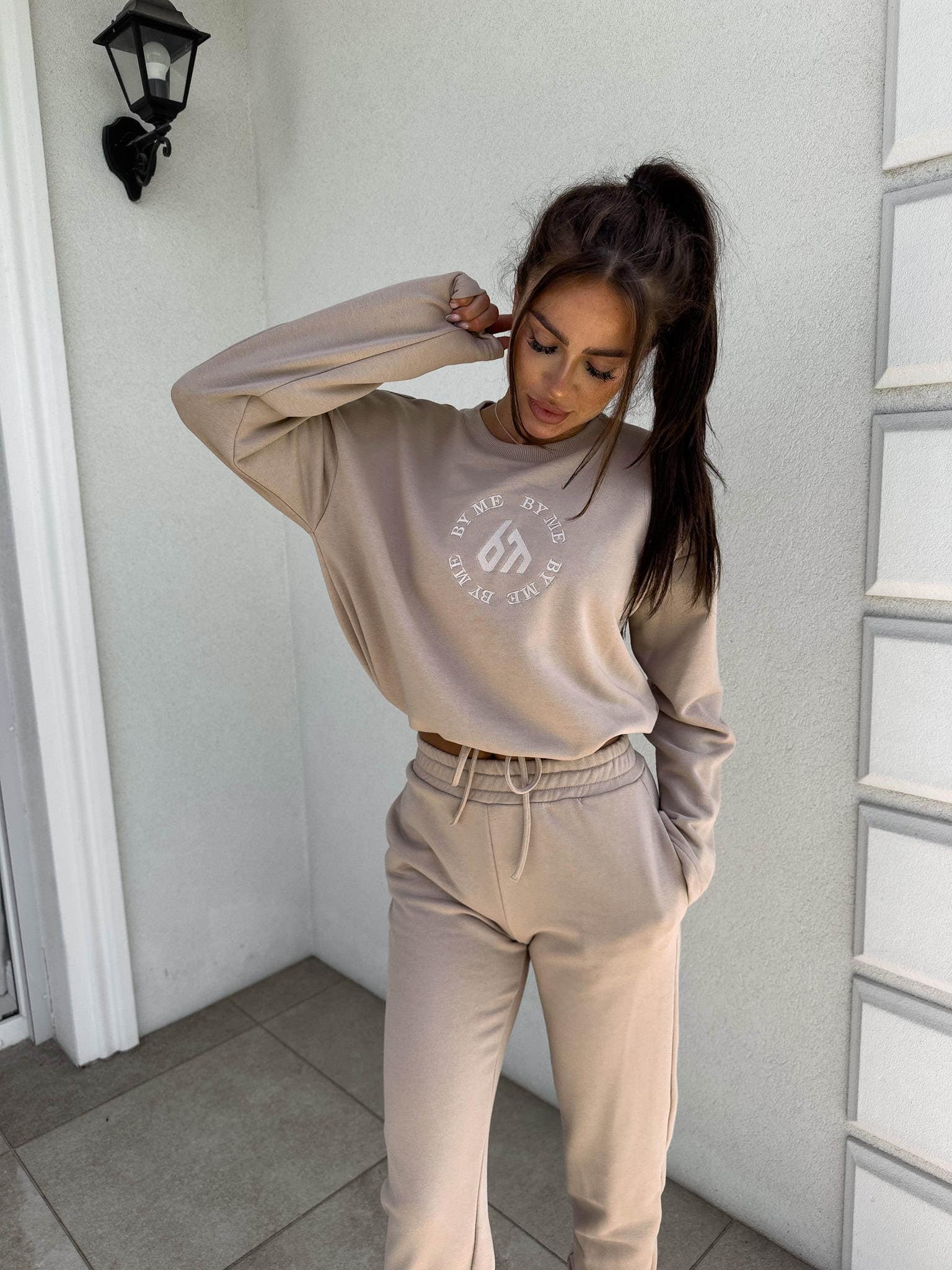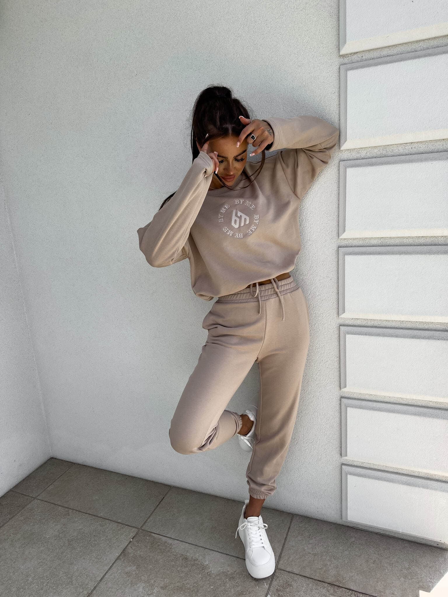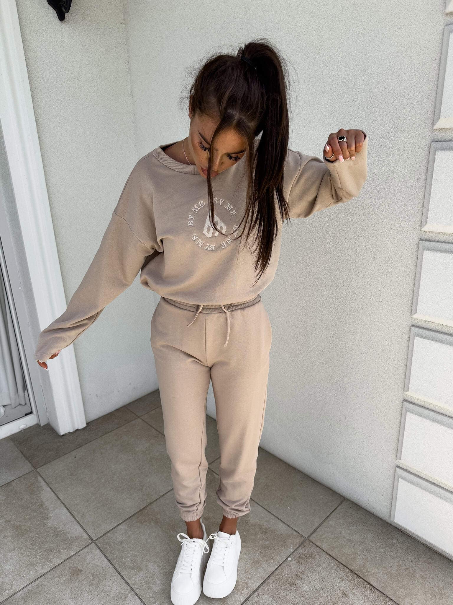 Komplet Louis składający się z bluzy o luźnym kroju, z długim rękawem z troczkiem regulującym długość oraz logowaniem na środku. Spodnie mają gumki na nogawkach i w pasie oraz dwie wbudowane kieszenie.