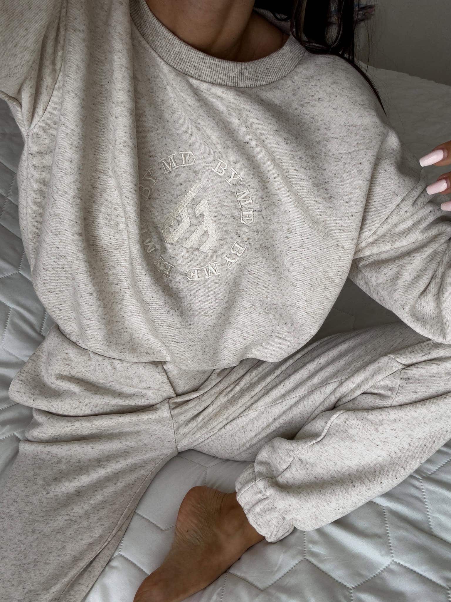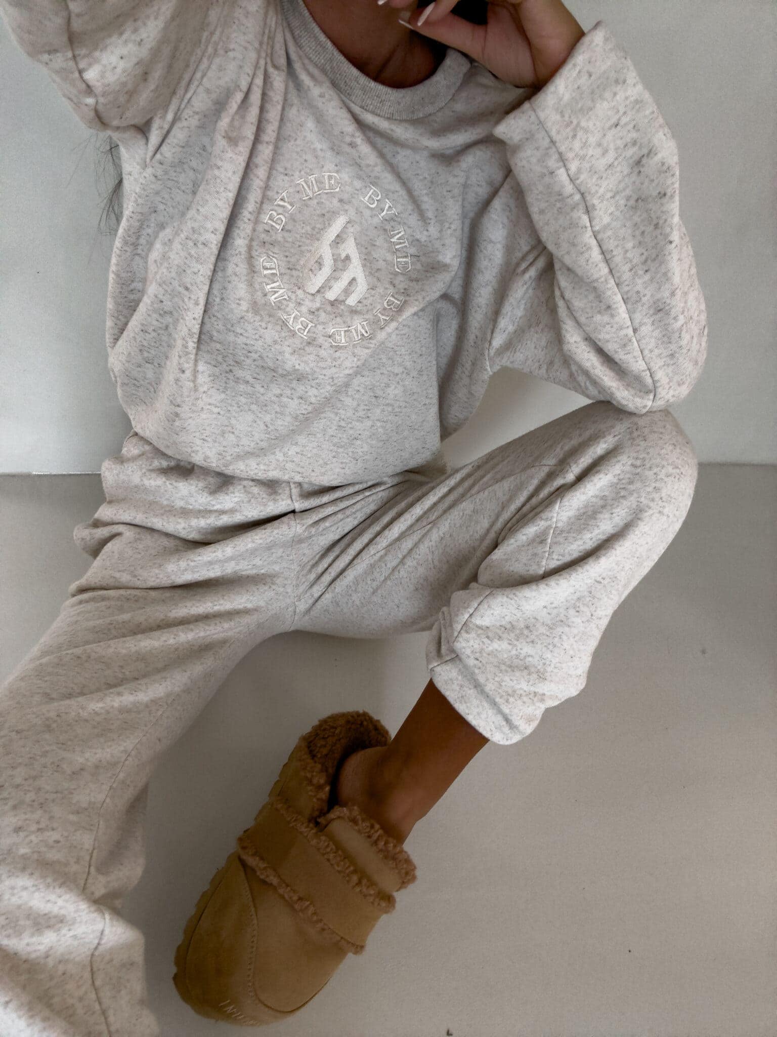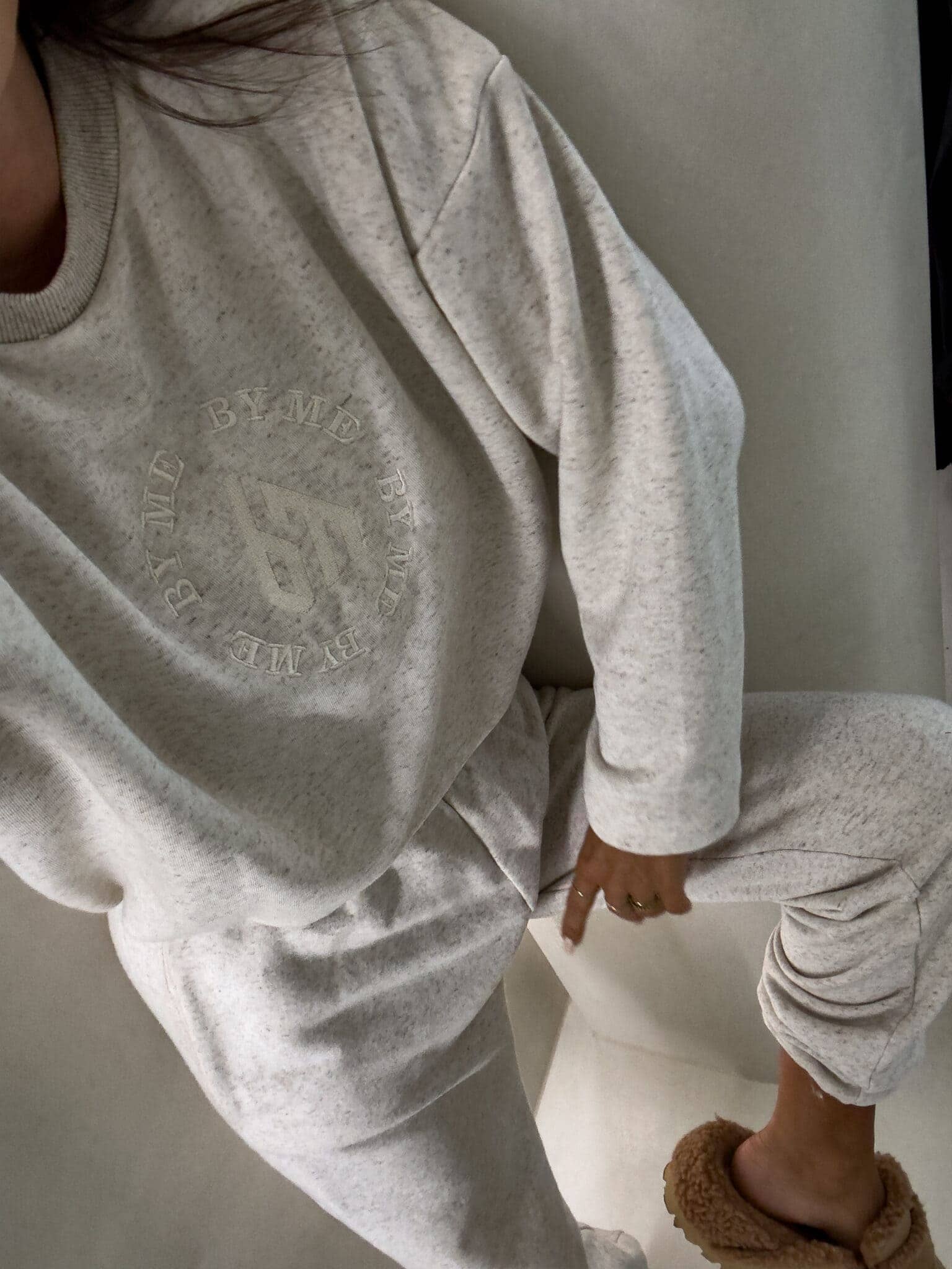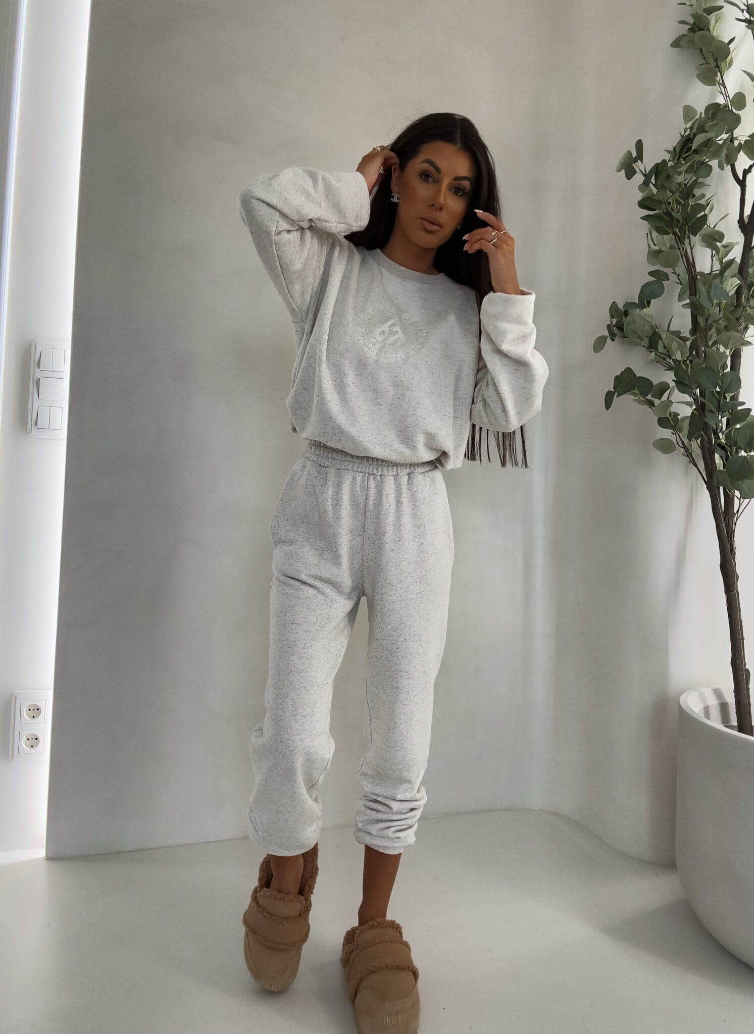 Komplet Louis składający się z bluzy o luźnym kroju, z długim rękawem z troczkiem regulującym długość oraz logowaniem na środku. Spodnie mają gumki na nogawkach i w pasie oraz dwie wbudowane kieszenie.