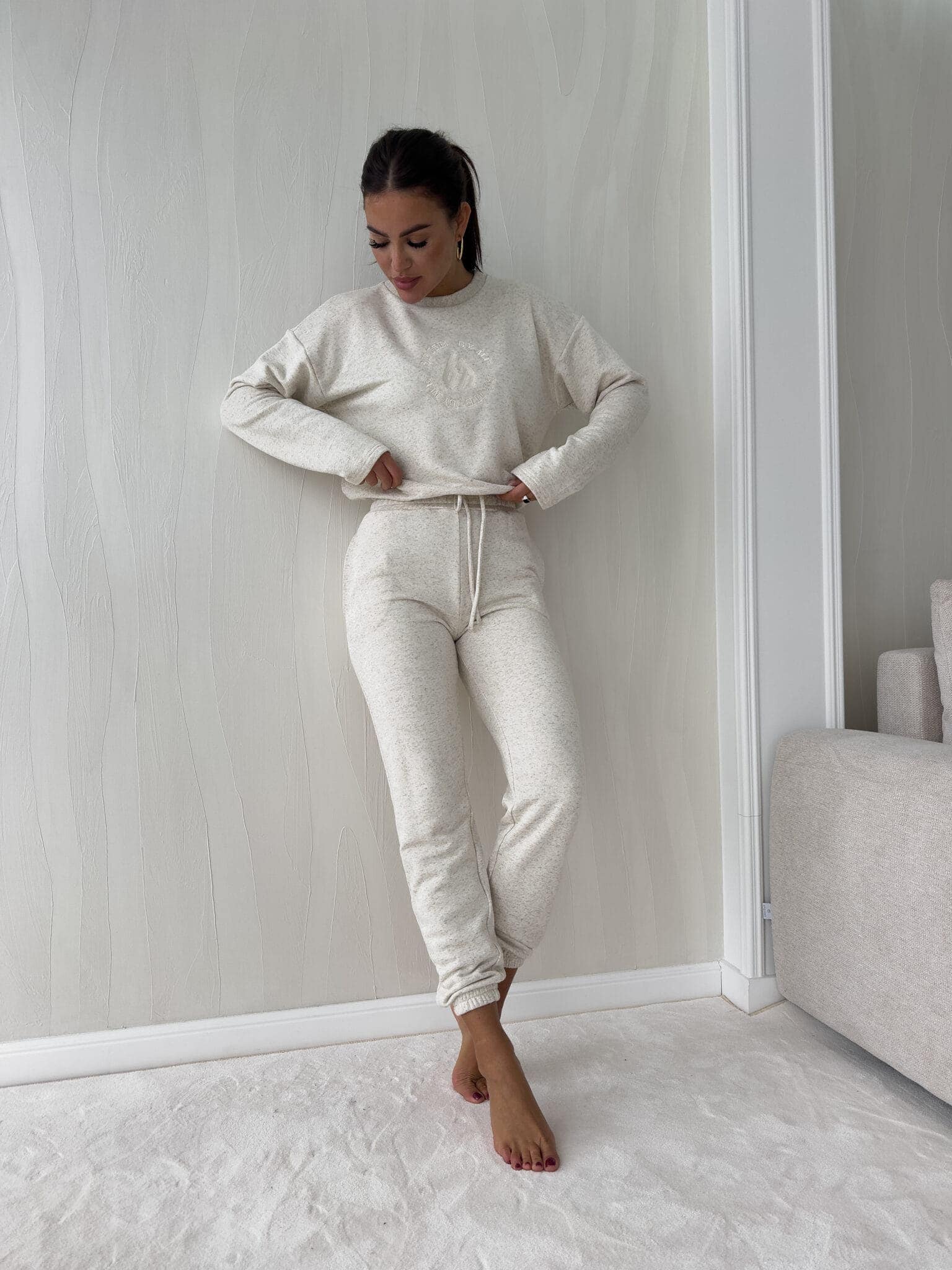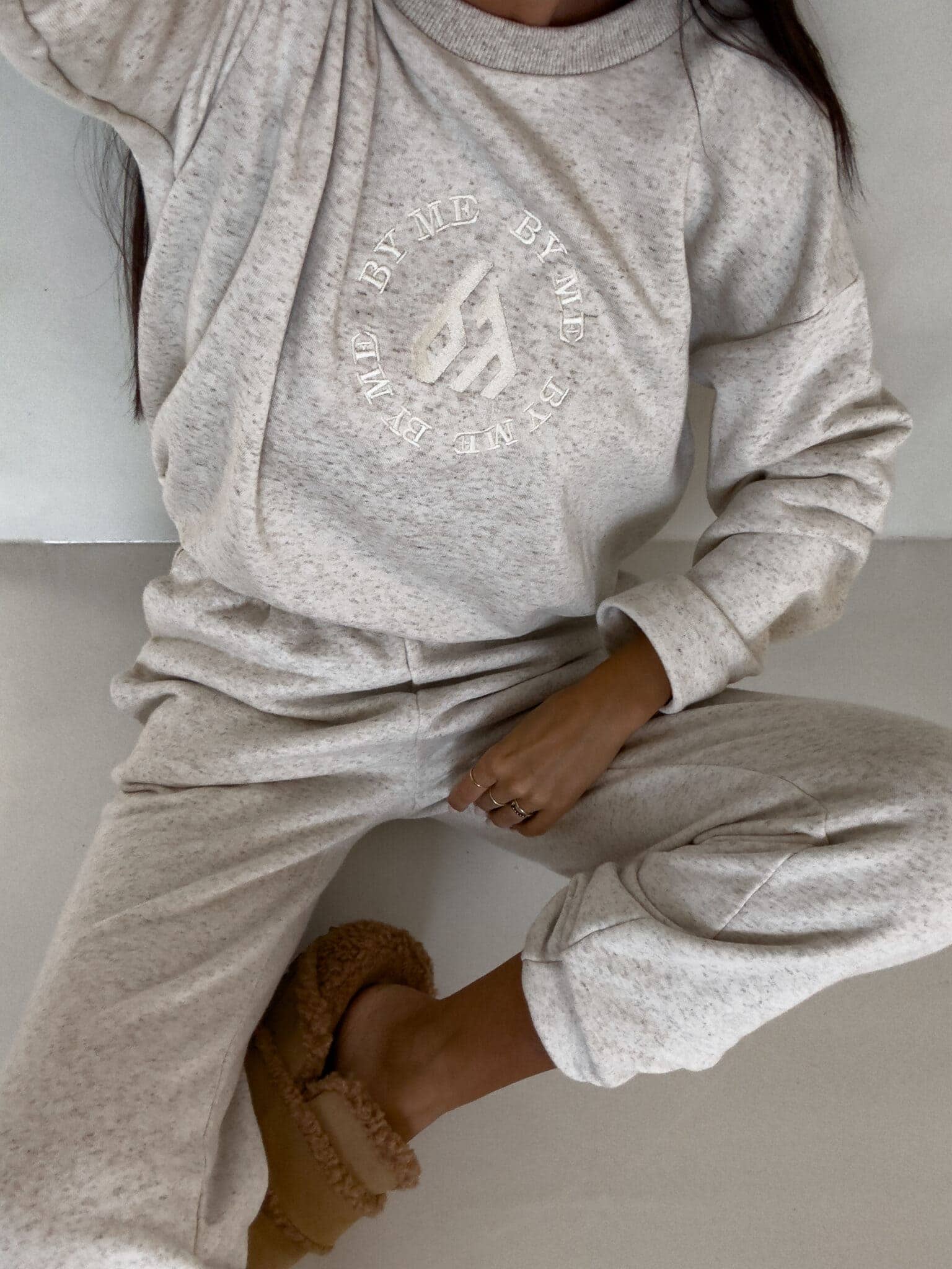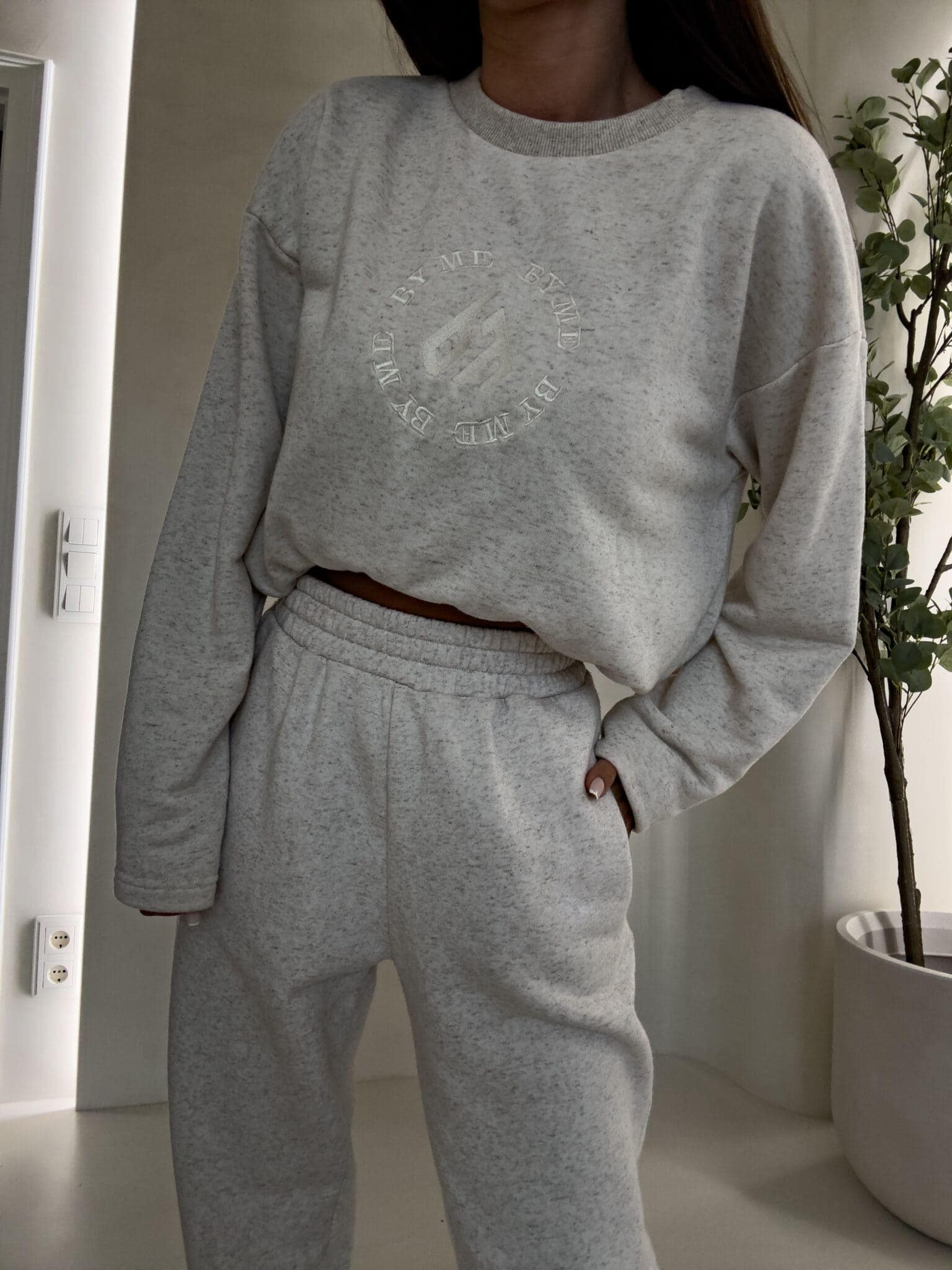 Komplet Louis składający się z bluzy o luźnym kroju, z długim rękawem z troczkiem regulującym długość oraz logowaniem na środku. Spodnie mają gumki na nogawkach i w pasie oraz dwie wbudowane kieszenie.