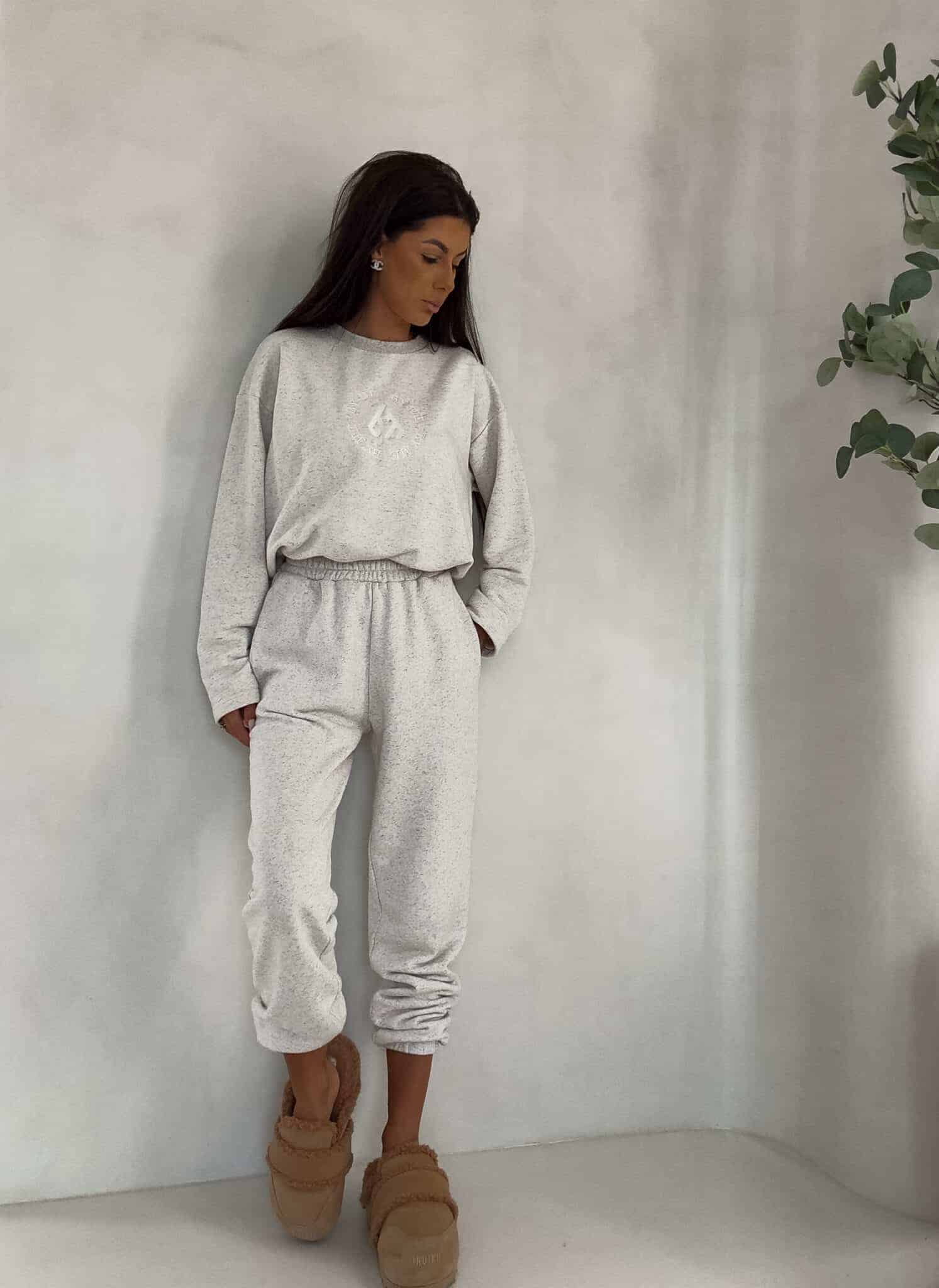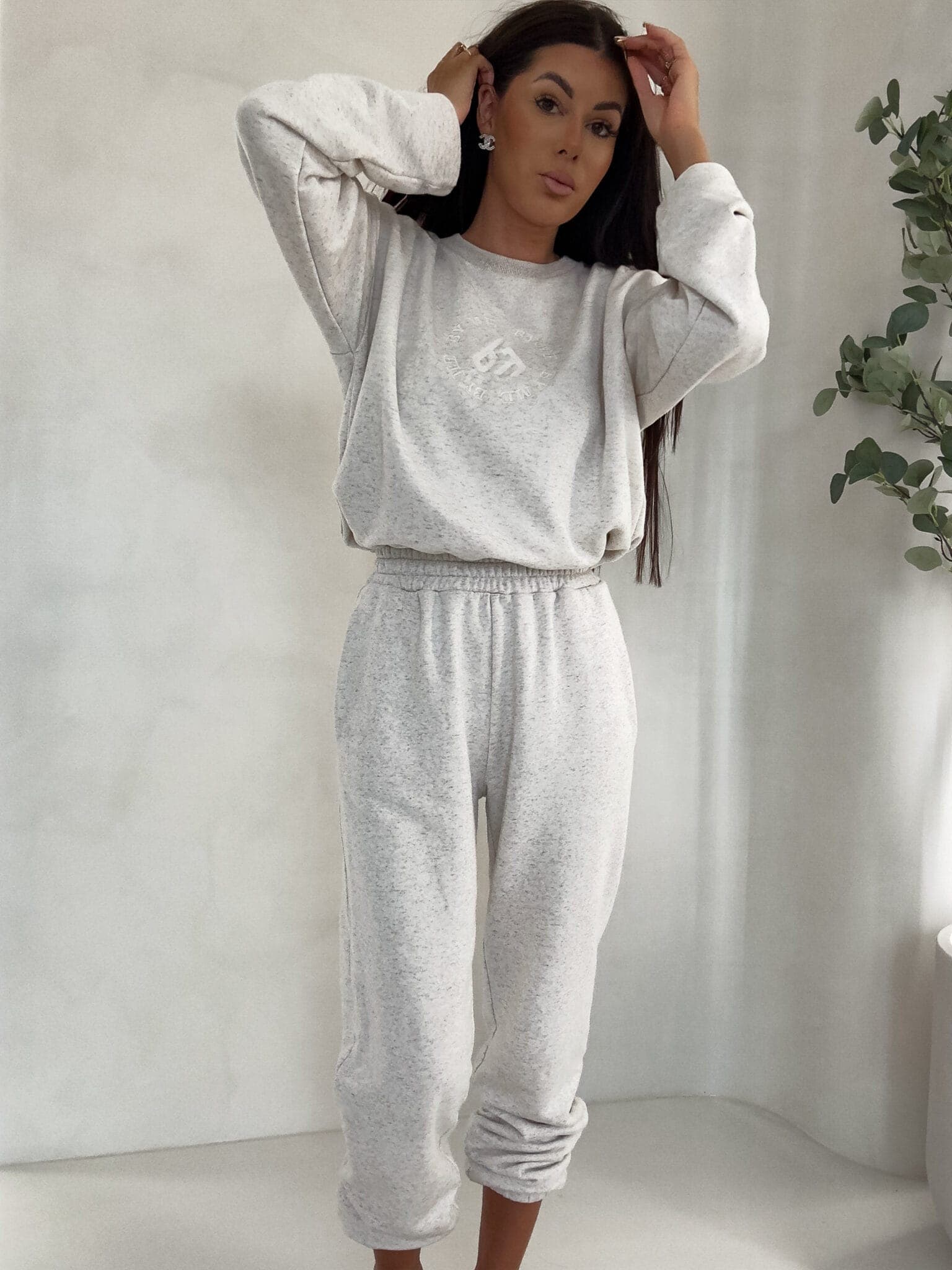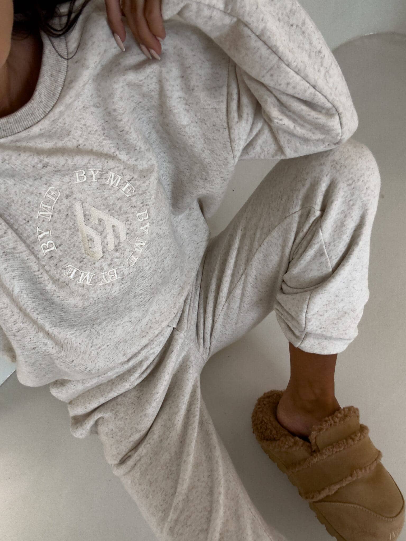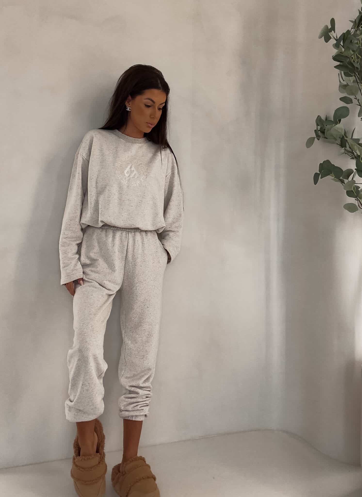 Komplet Louis składający się z bluzy o luźnym kroju, z długim rękawem z troczkiem regulującym długość oraz logowaniem na środku. Spodnie mają gumki na nogawkach i w pasie oraz dwie wbudowane kieszenie.