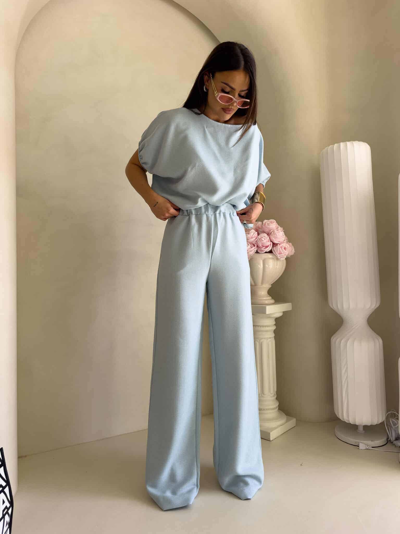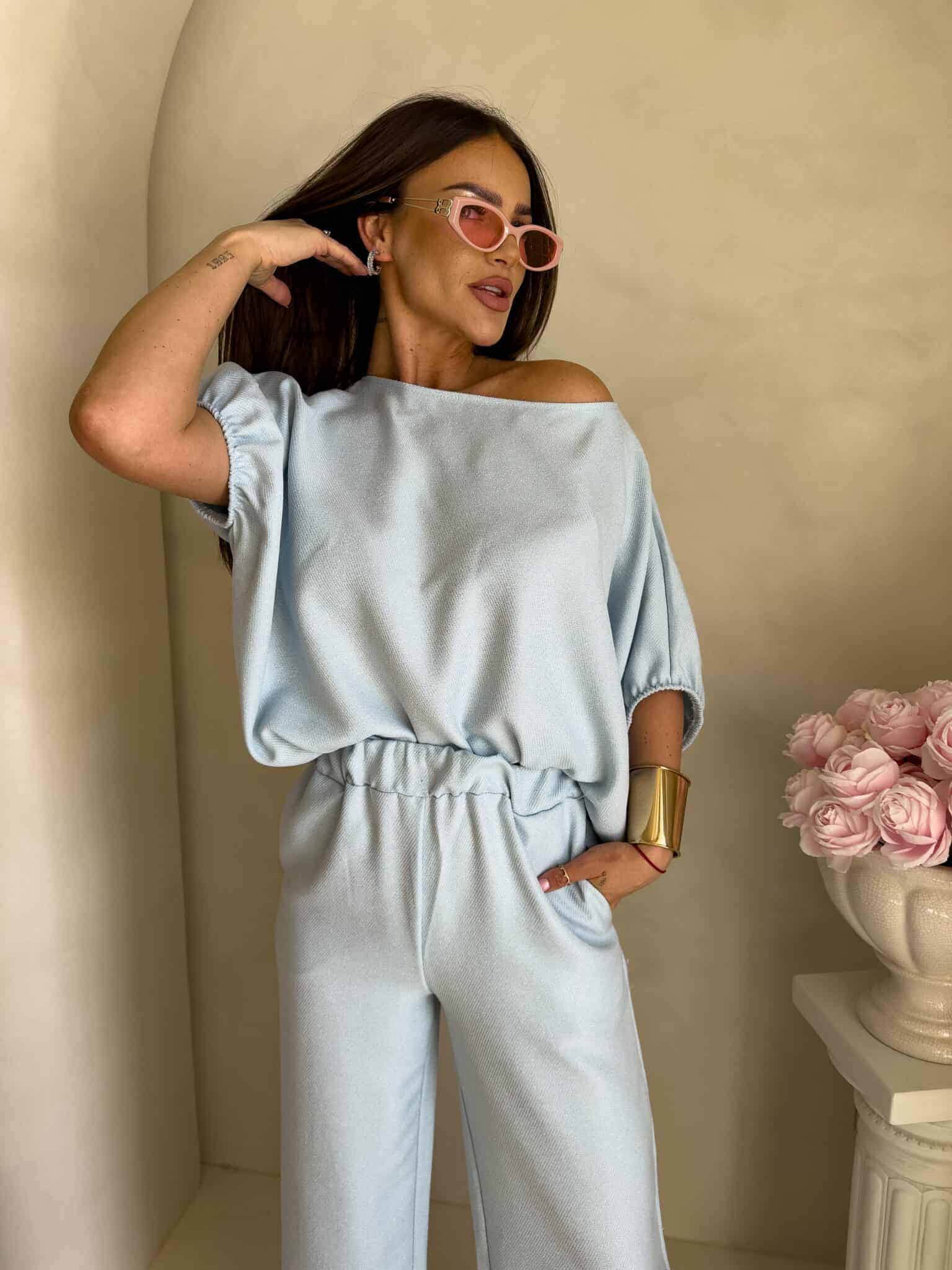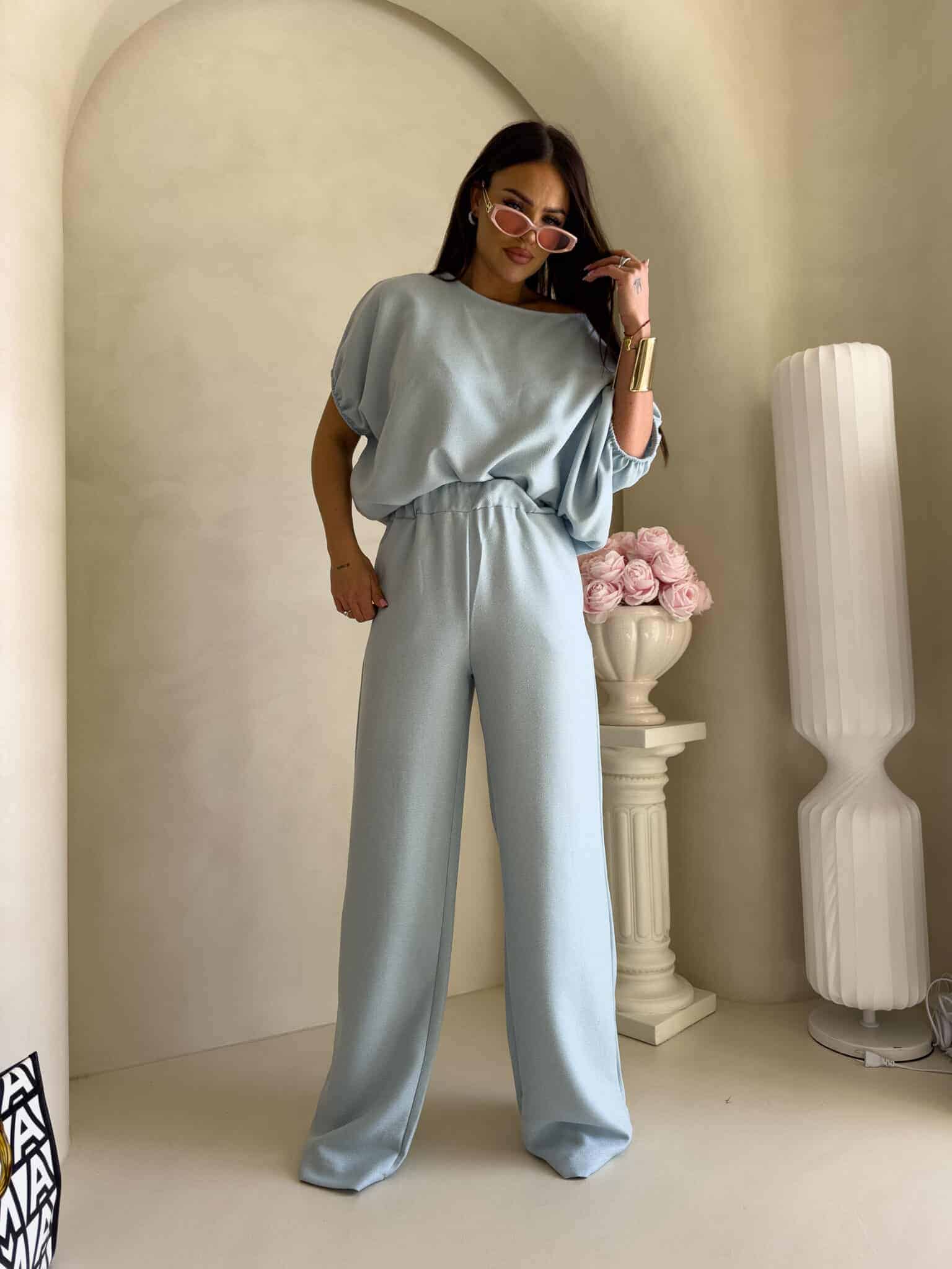 Stylowy komplet złożony z bluzki typu oversize oraz spodni z gumką w pasie. Bluzka z krótkim rękawem, luźnym krojem i wiązaniem na dole zapewnia swobodę ruchów i modny, nonszalancki wygląd. Idealny zestaw na co dzień, spotkania ze znajomymi lub wieczorne wyjścia – łączy komfort z nowoczesnym stylem.