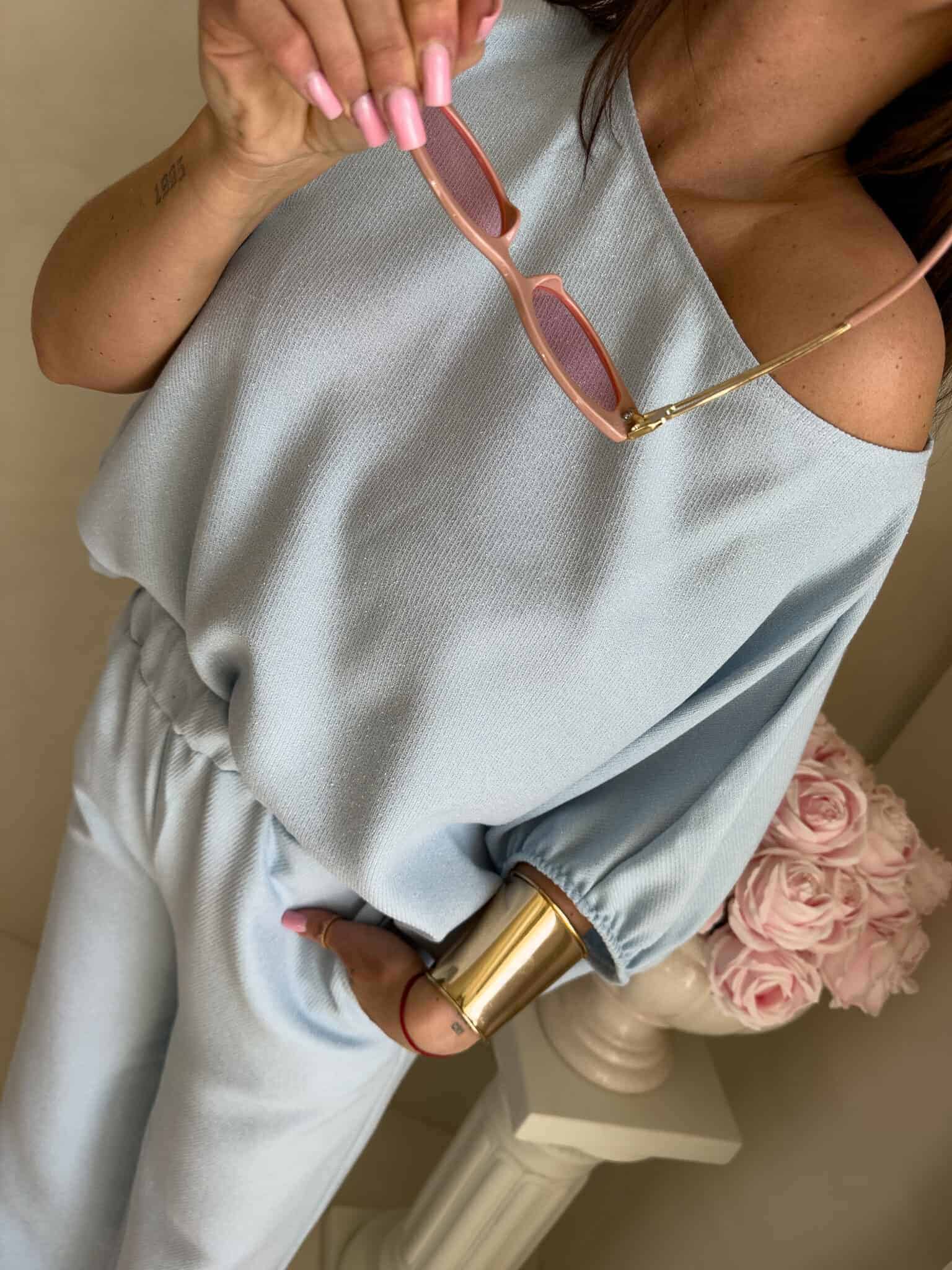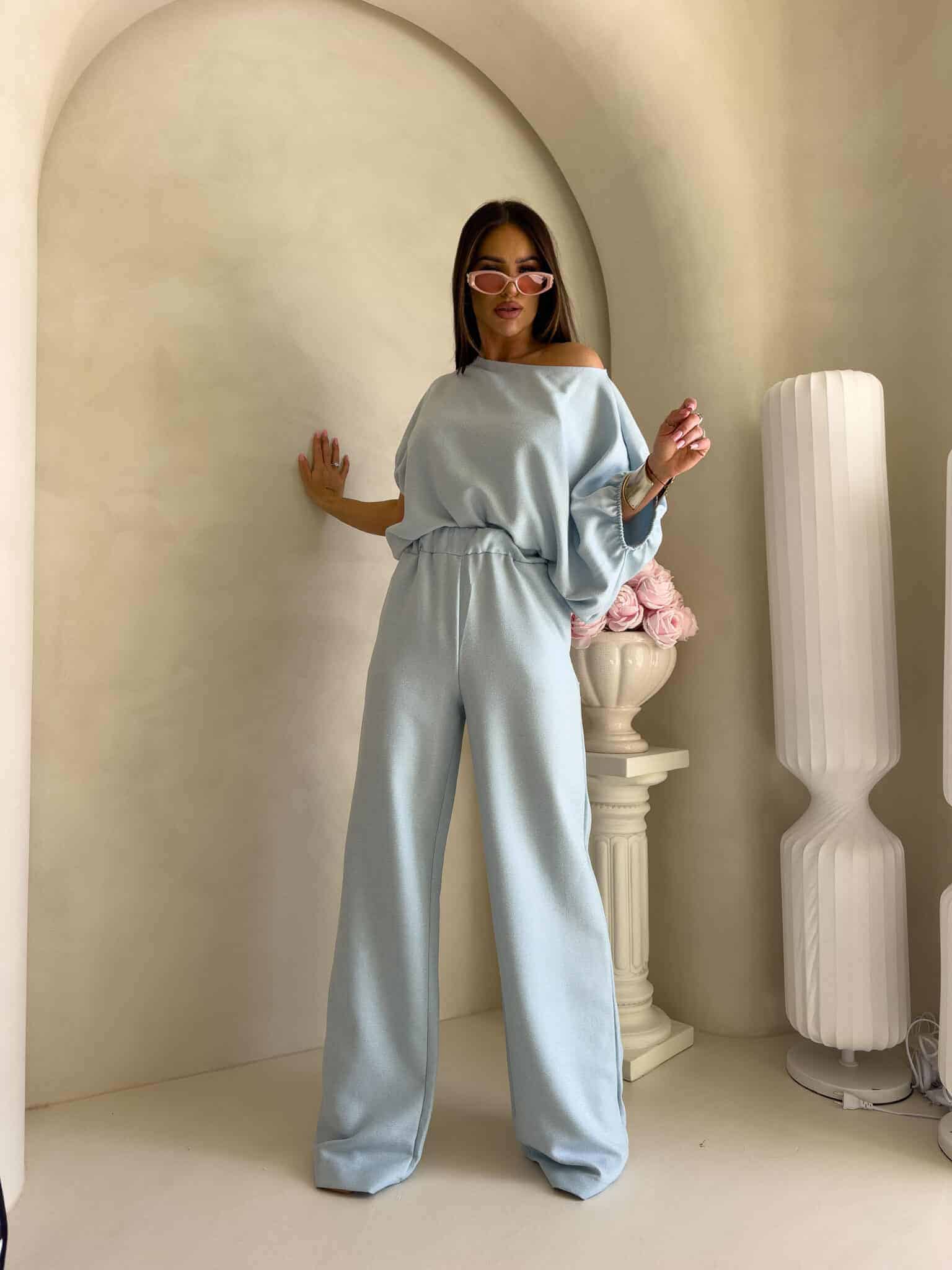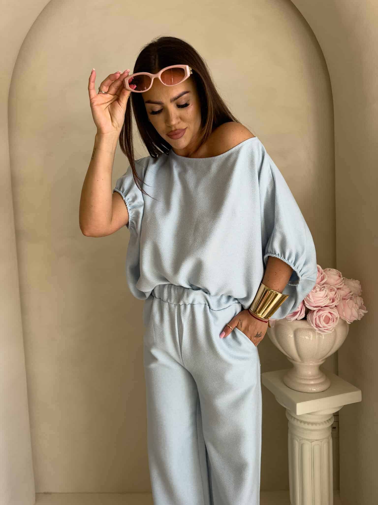 Stylowy komplet złożony z bluzki typu oversize oraz spodni z gumką w pasie. Bluzka z krótkim rękawem, luźnym krojem i wiązaniem na dole zapewnia swobodę ruchów i modny, nonszalancki wygląd. Idealny zestaw na co dzień, spotkania ze znajomymi lub wieczorne wyjścia – łączy komfort z nowoczesnym stylem.