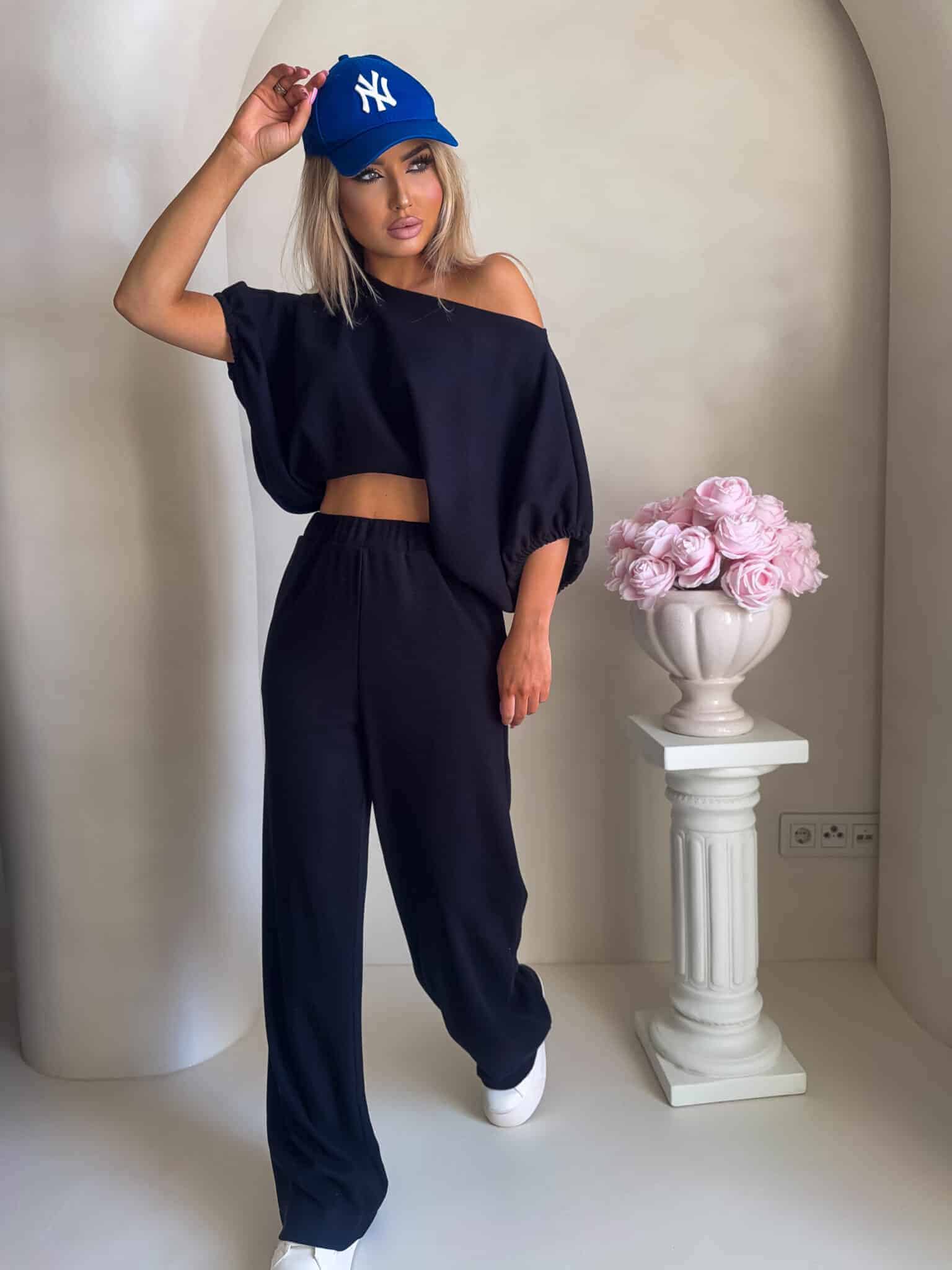 Stylowy komplet złożony z bluzki typu oversize oraz spodni z gumką w pasie. Bluzka z krótkim rękawem, luźnym krojem i wiązaniem na dole zapewnia swobodę ruchów i modny, nonszalancki wygląd. Idealny zestaw na co dzień, spotkania ze znajomymi lub wieczorne wyjścia – łączy komfort z nowoczesnym stylem.