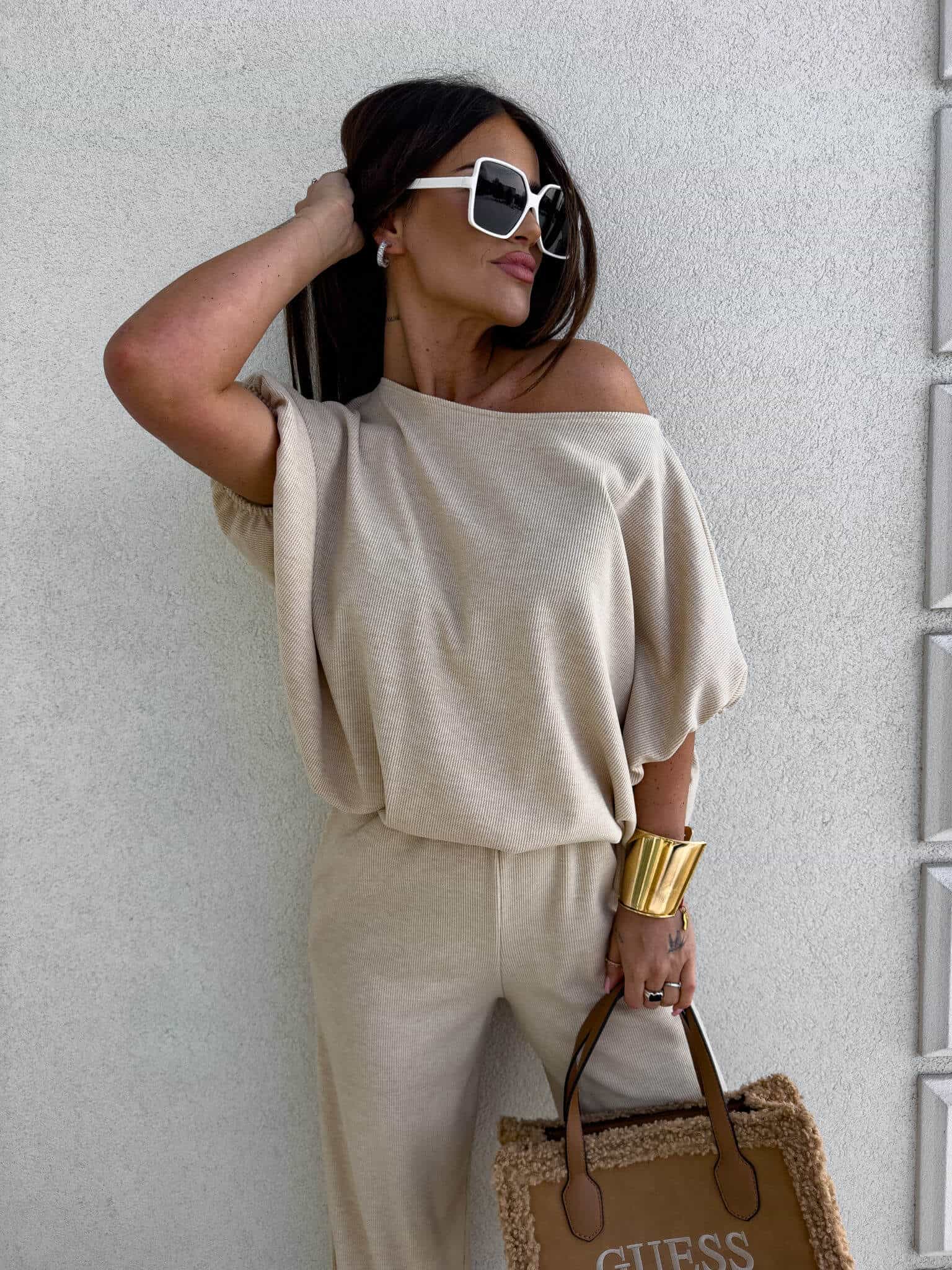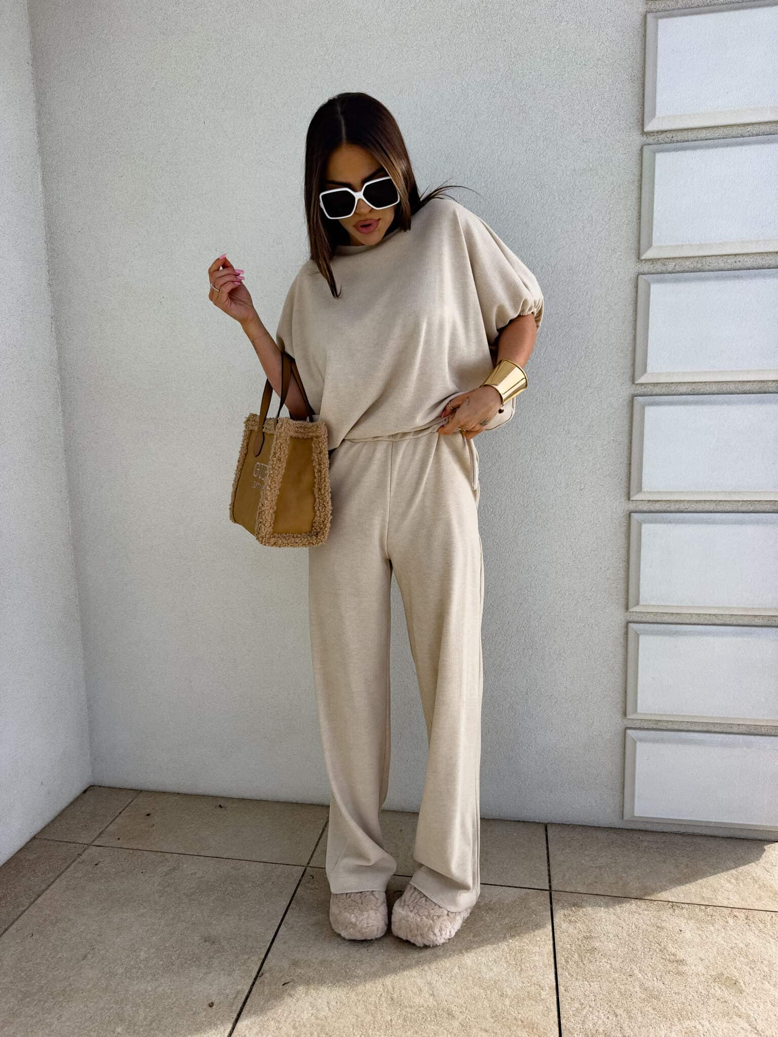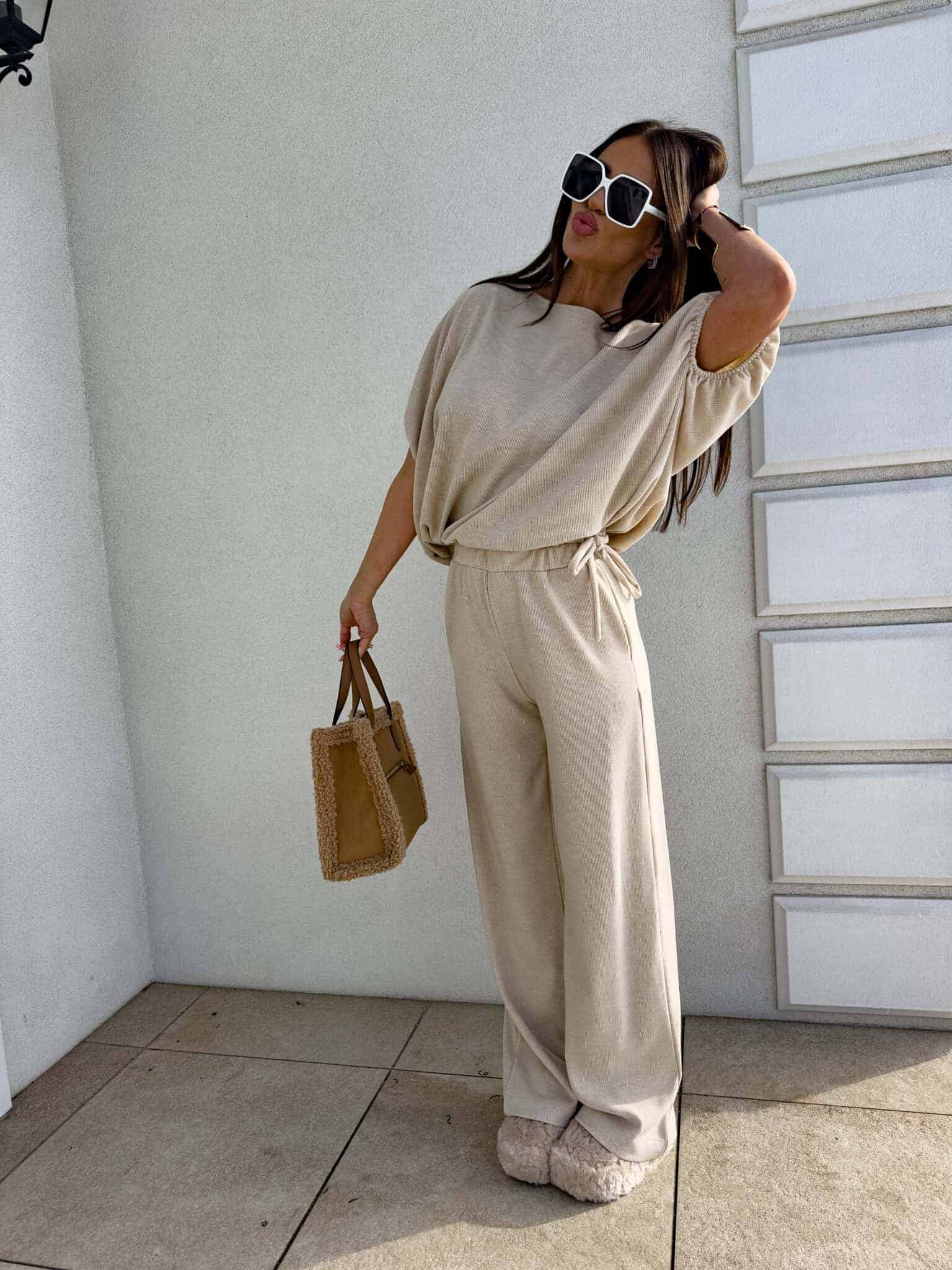 Stylowy komplet złożony z bluzki typu oversize oraz spodni z gumką w pasie. Bluzka z krótkim rękawem, luźnym krojem i wiązaniem na dole zapewnia swobodę ruchów i modny, nonszalancki wygląd. Idealny zestaw na co dzień, spotkania ze znajomymi lub wieczorne wyjścia – łączy komfort z nowoczesnym stylem.