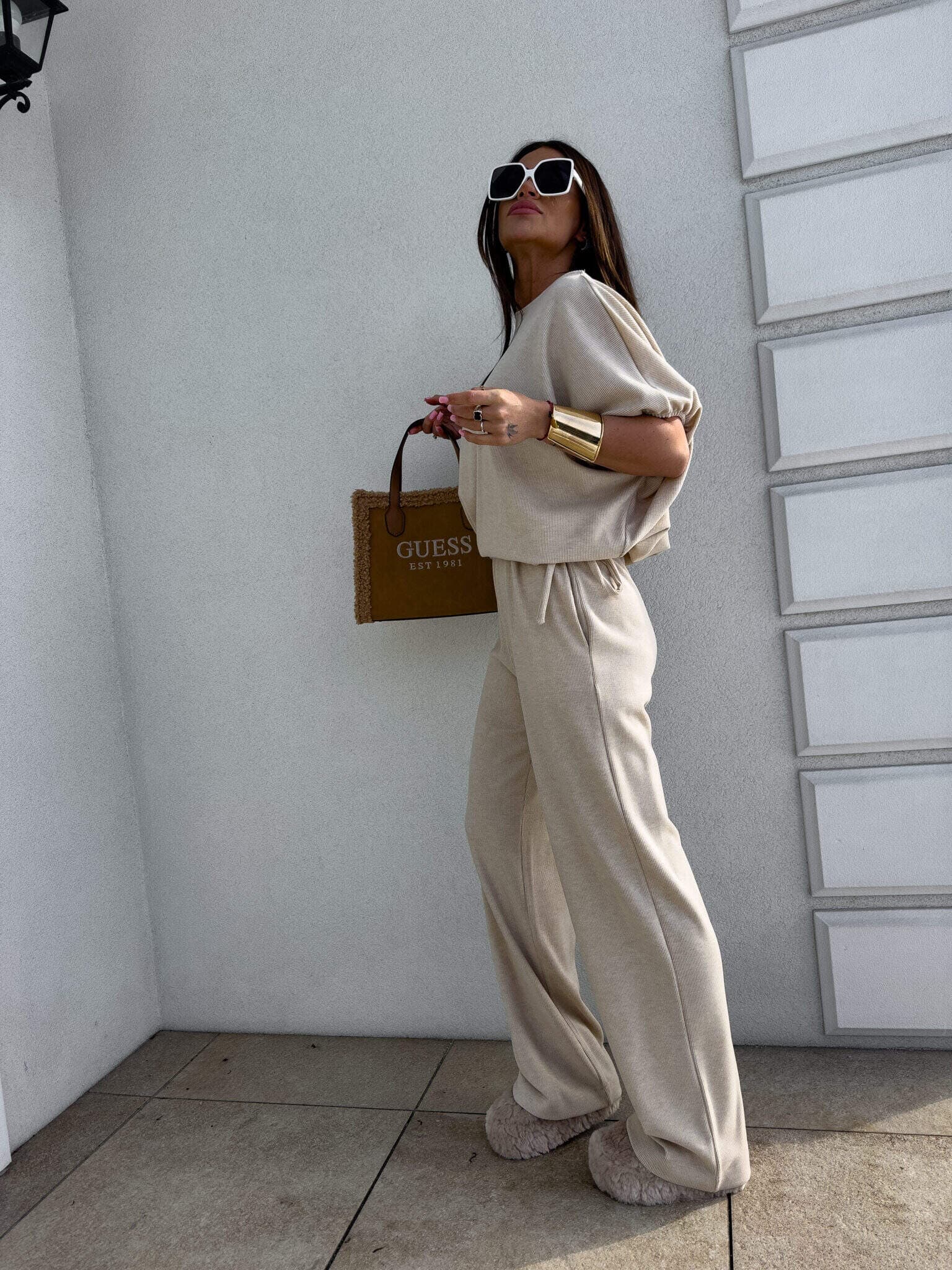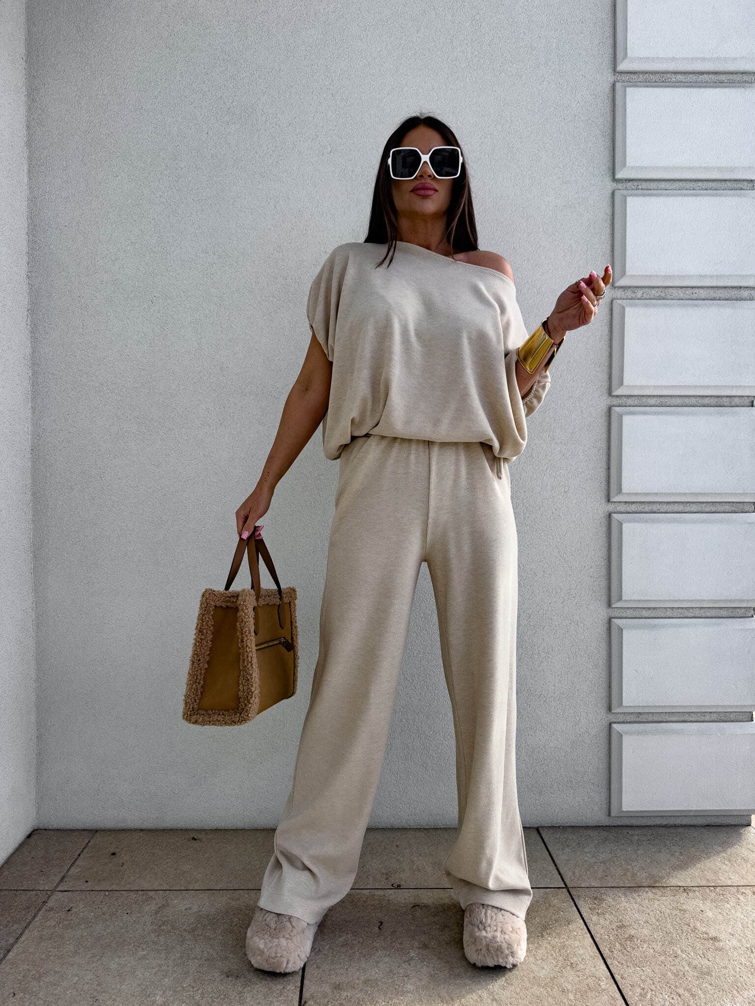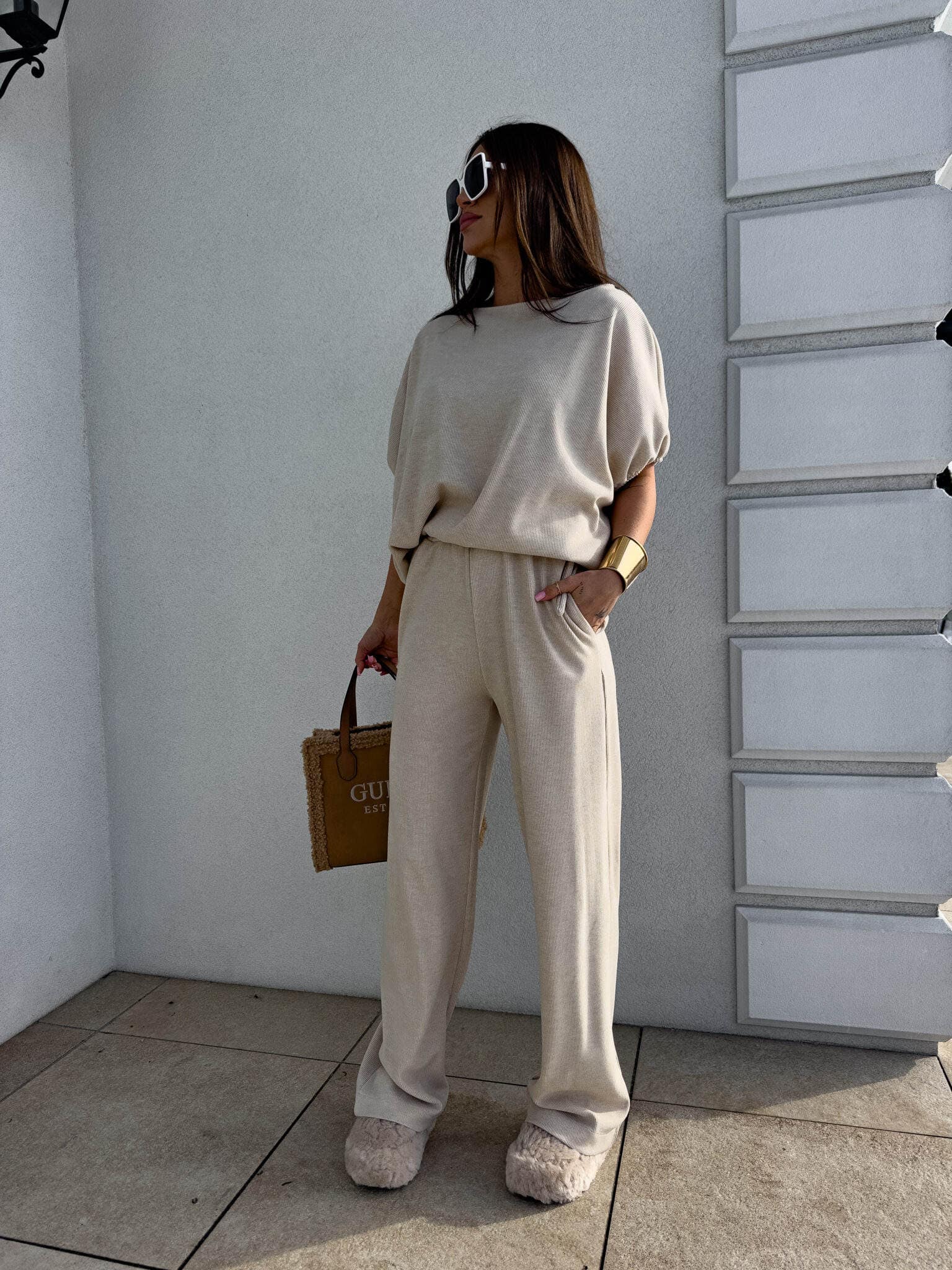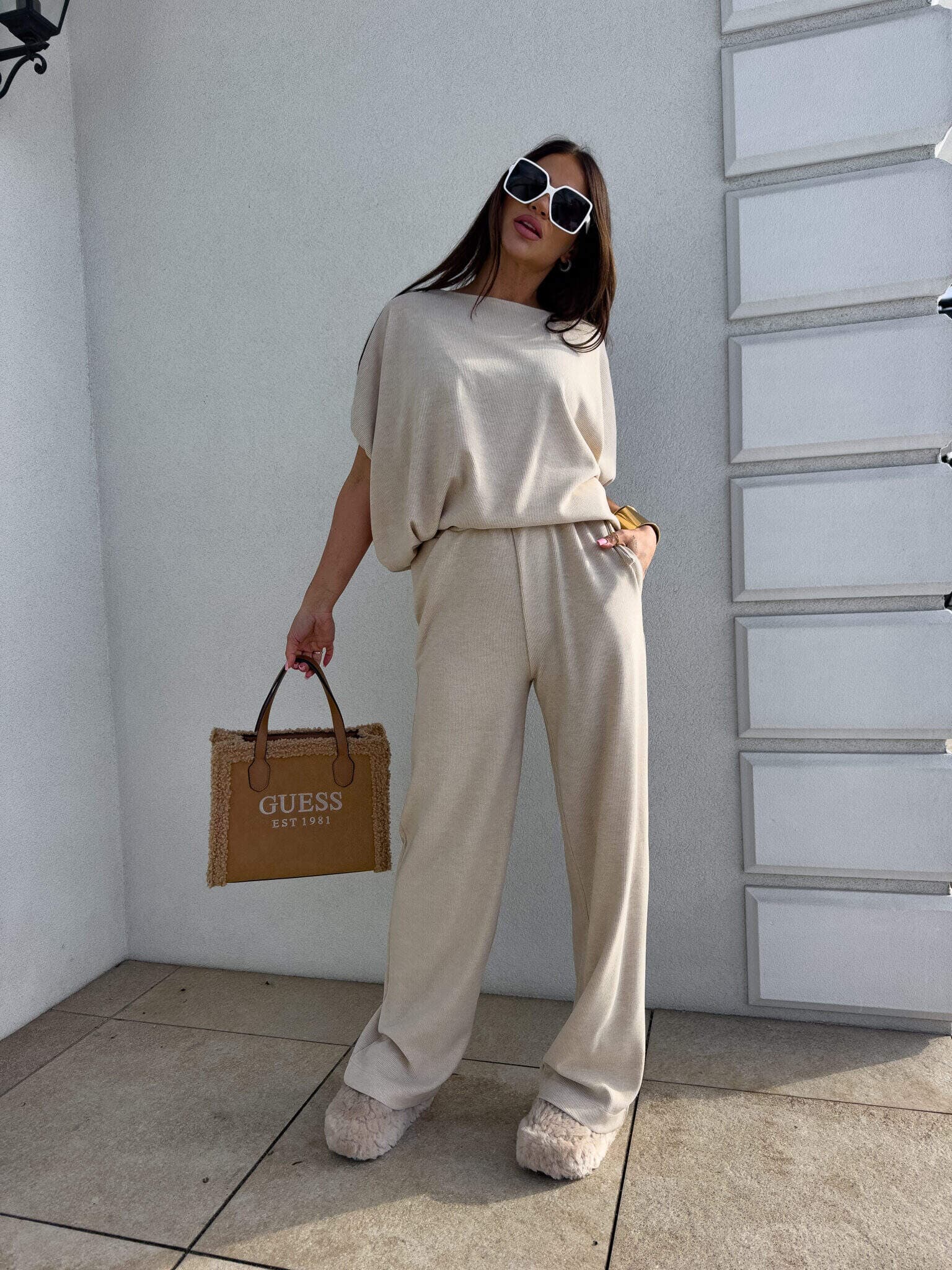 Stylowy komplet złożony z bluzki typu oversize oraz spodni z gumką w pasie. Bluzka z krótkim rękawem, luźnym krojem i wiązaniem na dole zapewnia swobodę ruchów i modny, nonszalancki wygląd. Idealny zestaw na co dzień, spotkania ze znajomymi lub wieczorne wyjścia – łączy komfort z nowoczesnym stylem.