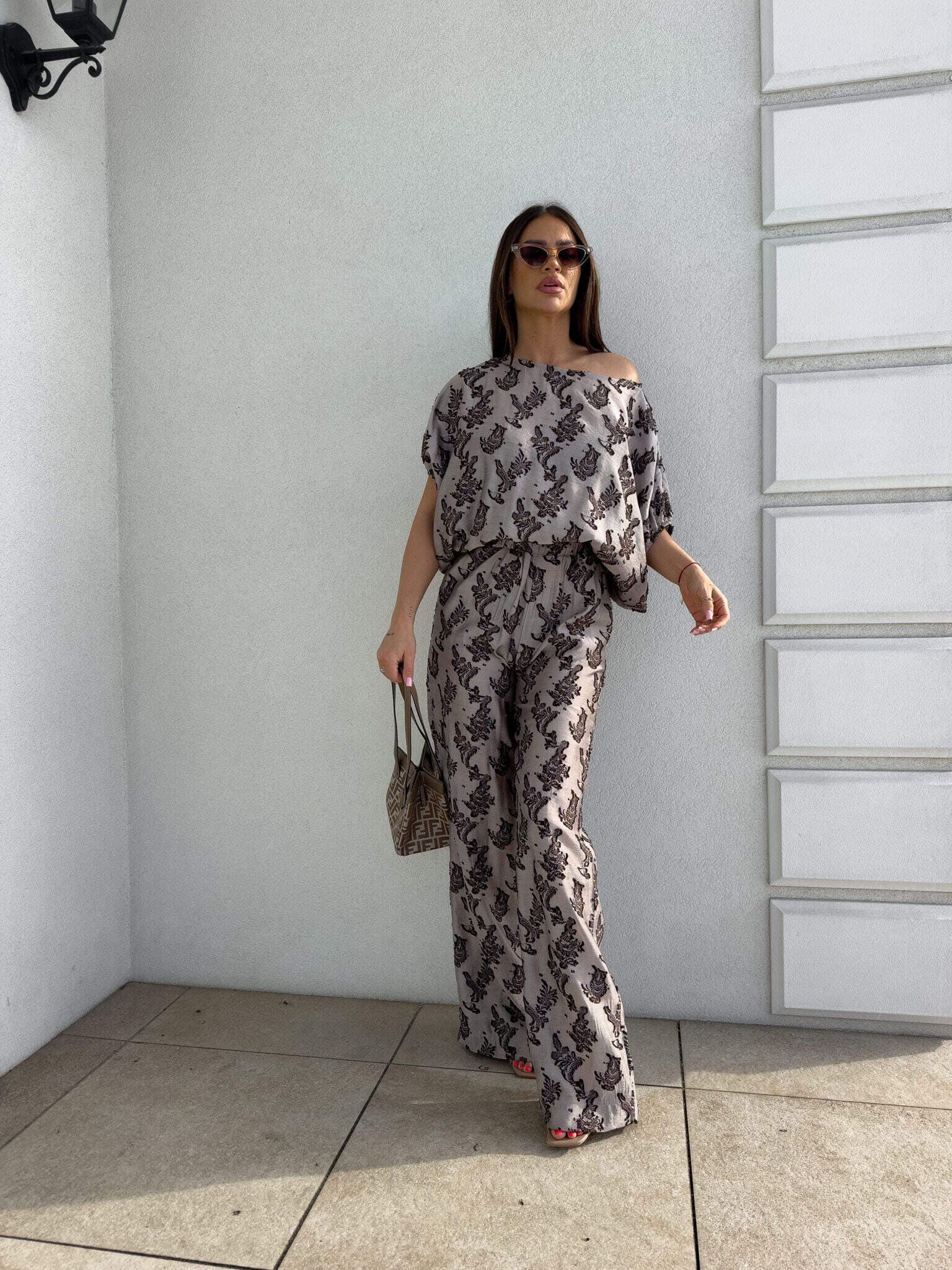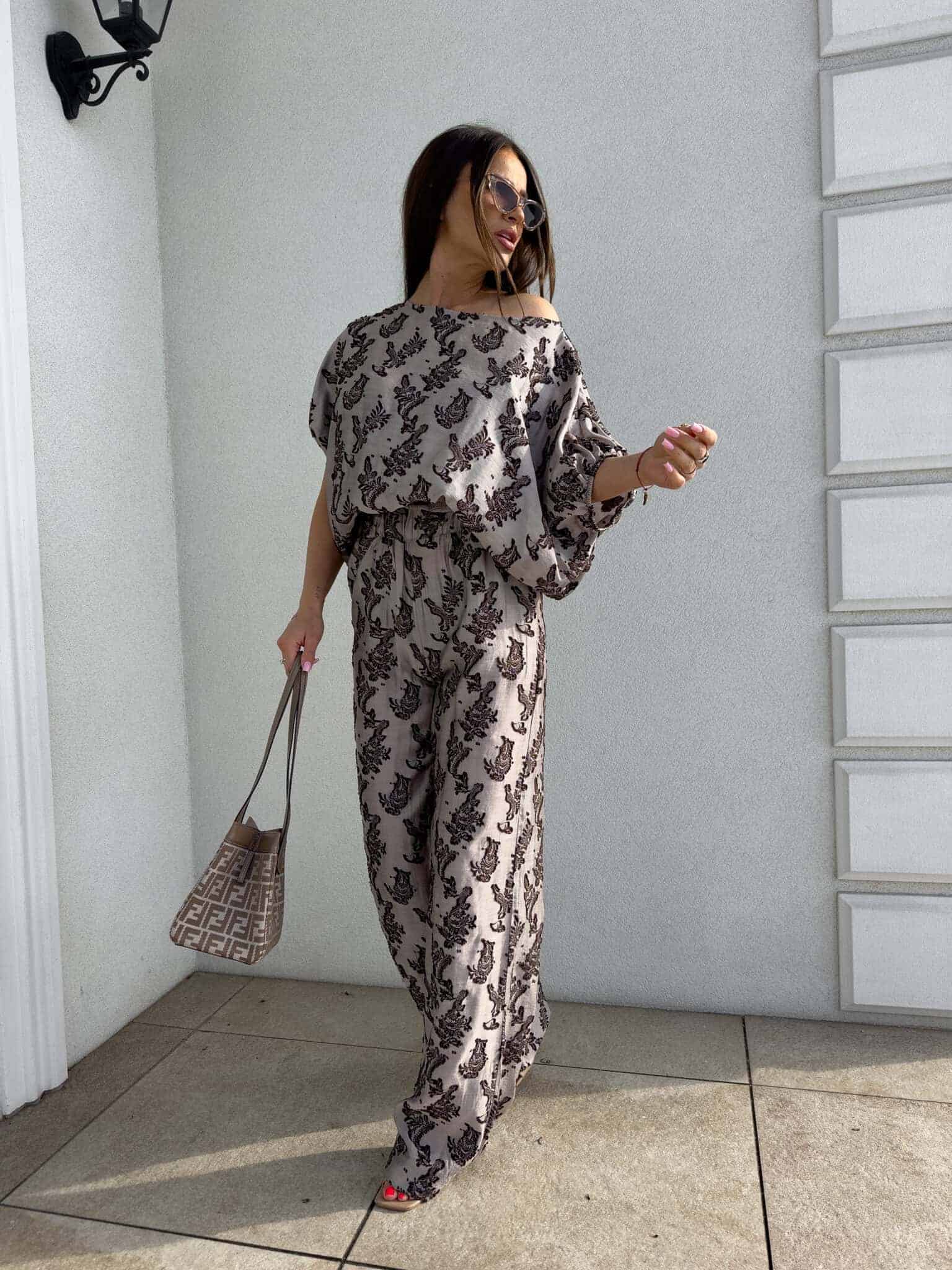 Stylowy komplet złożony z bluzki typu oversize oraz spodni z gumką w pasie. Bluzka z krótkim rękawem, luźnym krojem i wiązaniem na dole zapewnia swobodę ruchów i modny, nonszalancki wygląd. Idealny zestaw na co dzień, spotkania ze znajomymi lub wieczorne wyjścia – łączy komfort z nowoczesnym stylem.