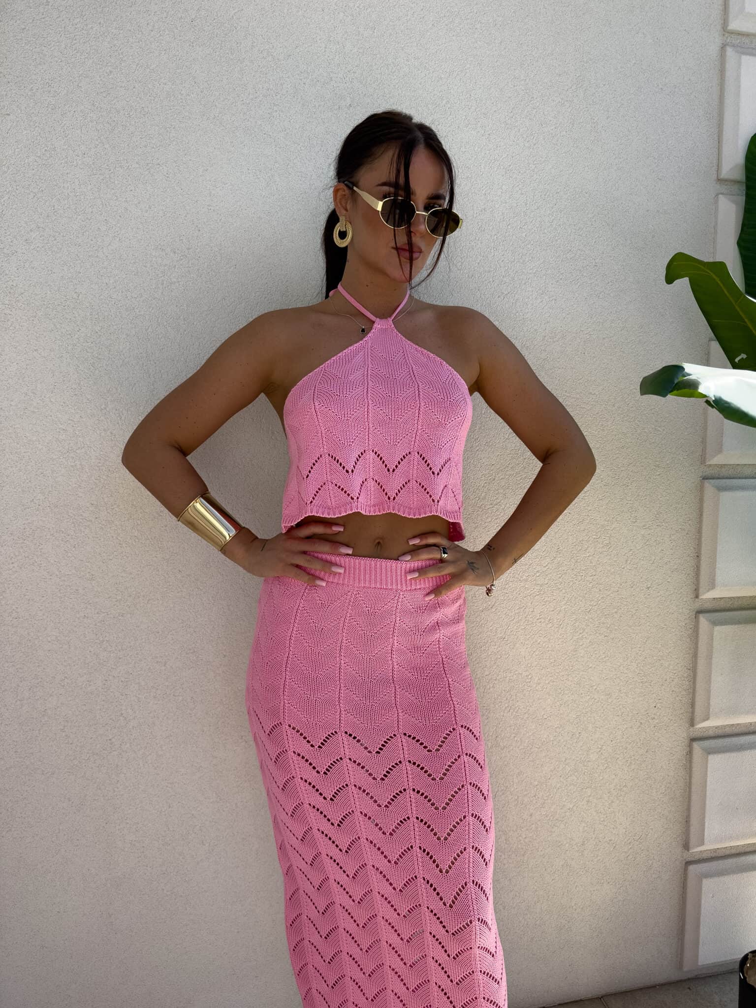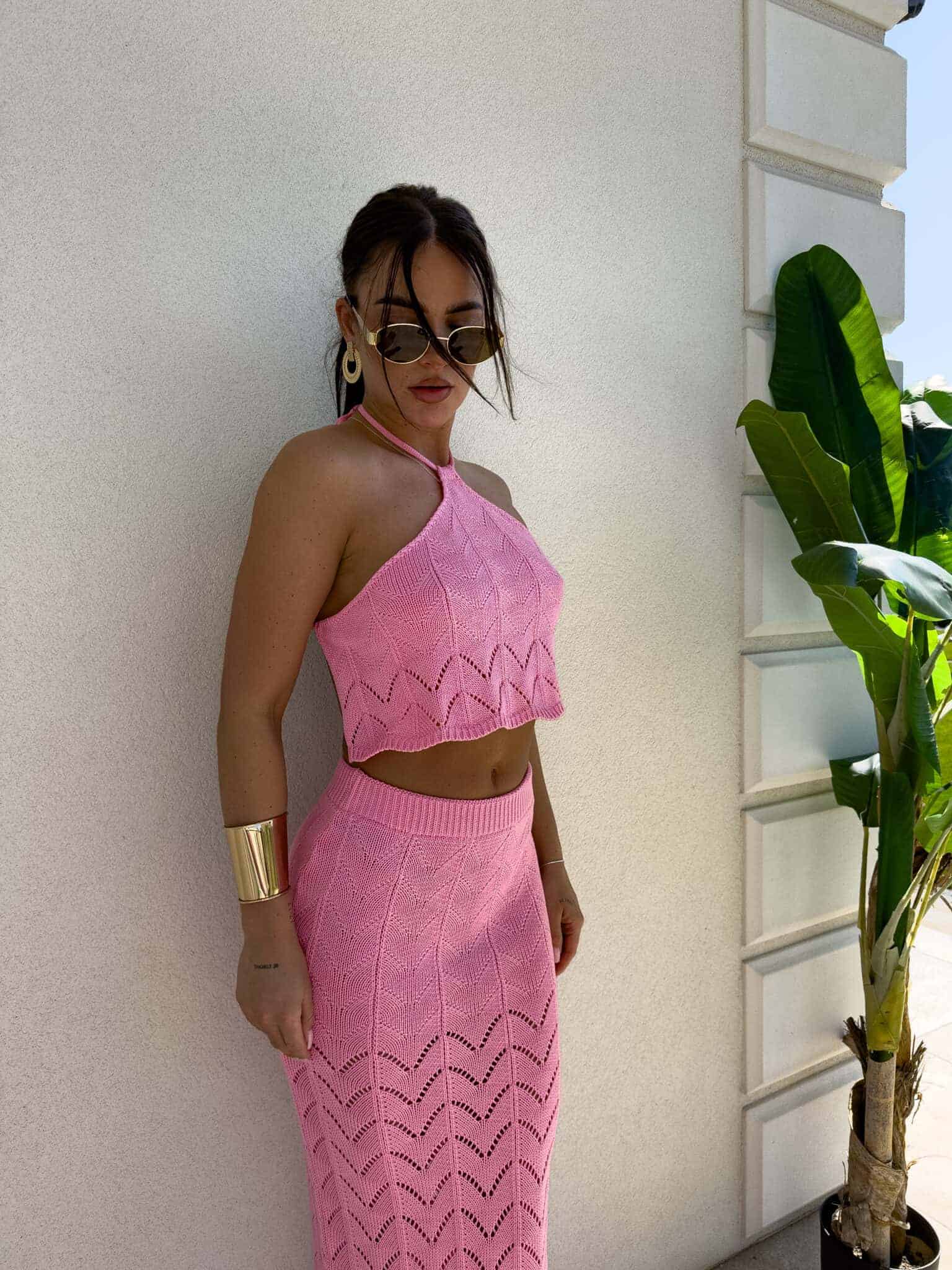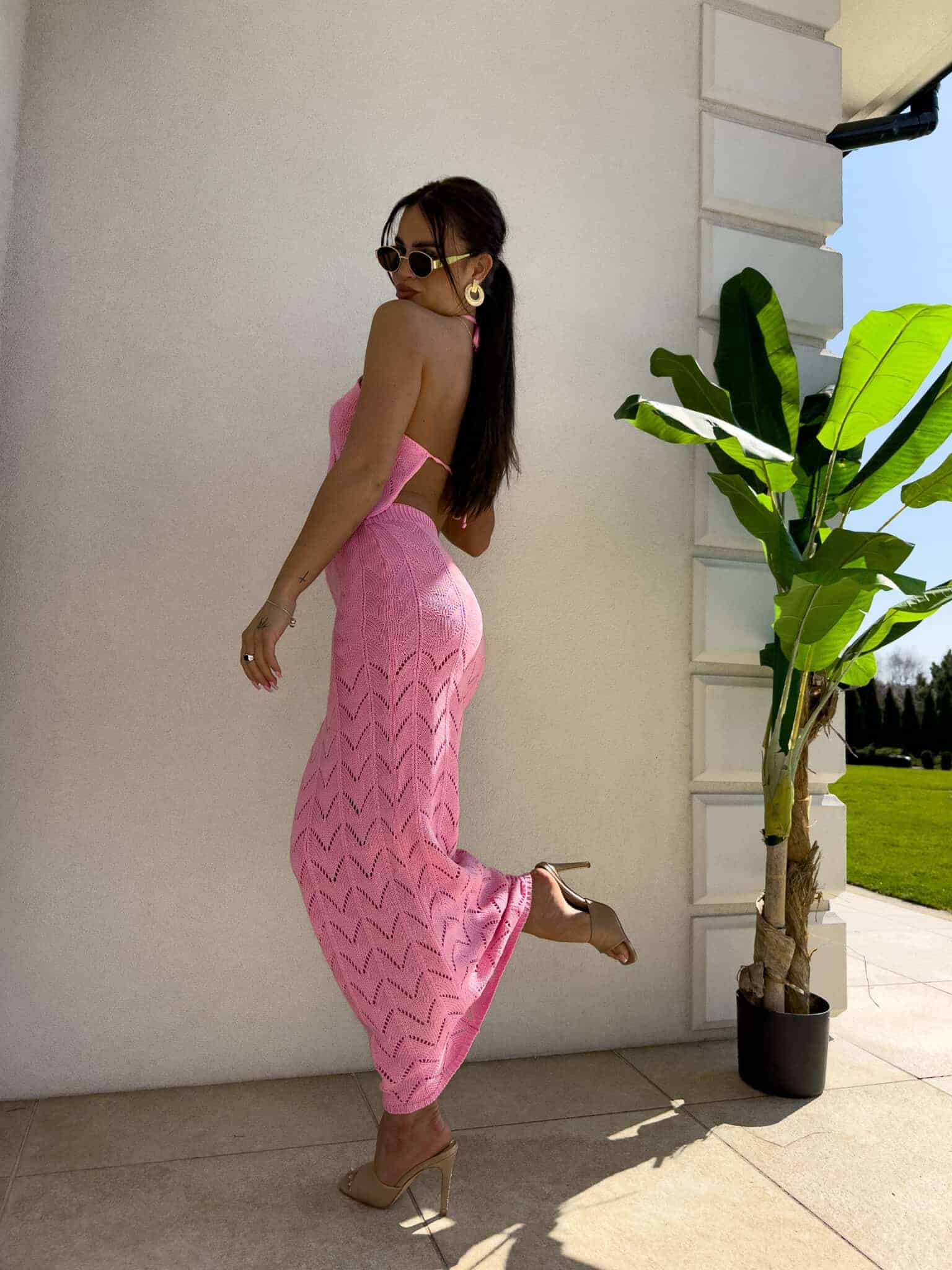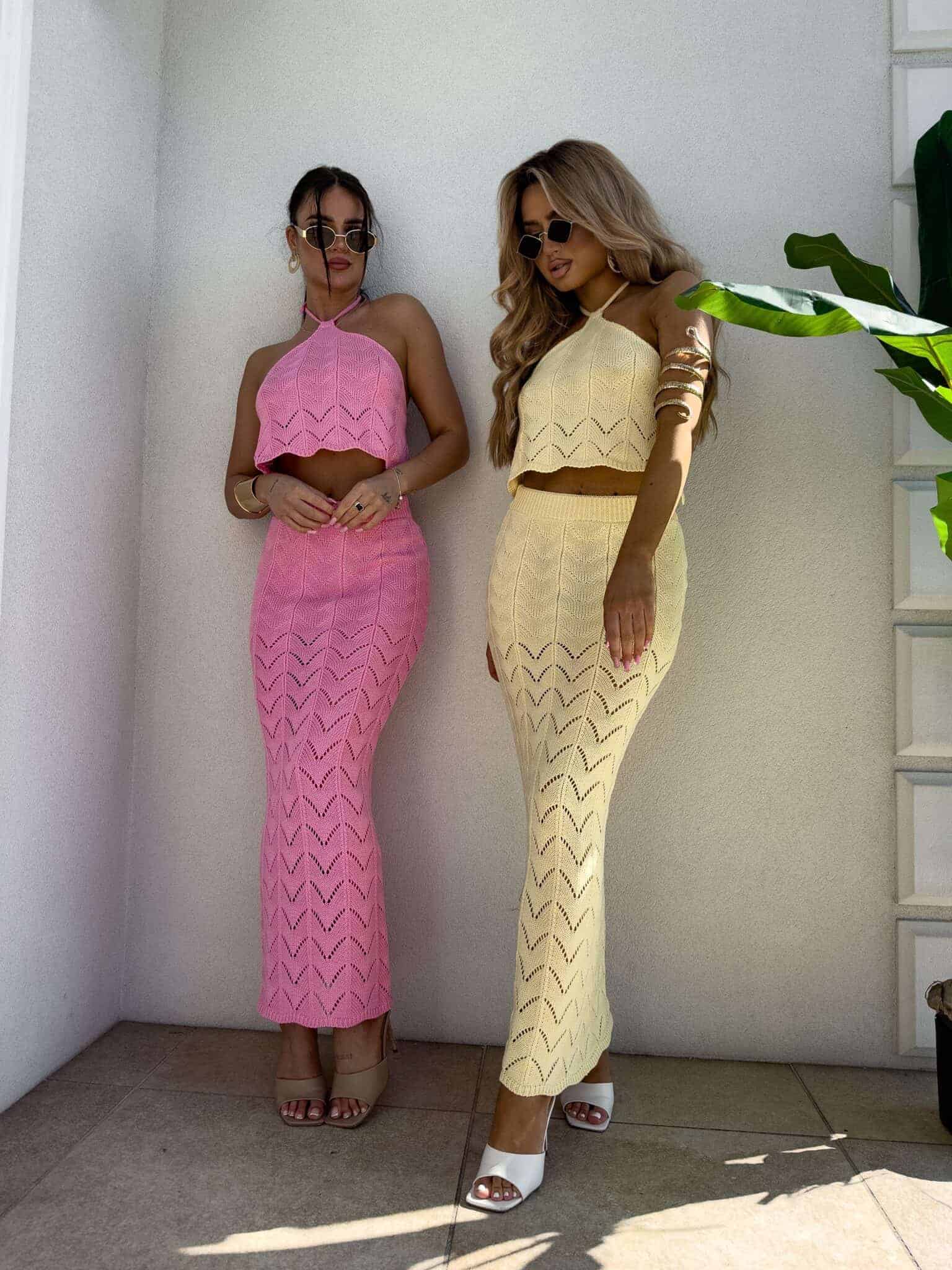 Komplet składający się z topu wiązanego na szyi i na plecach oraz spódnicy maxi z gumką w pasie to elegancka i jednocześnie komfortowa propozycja na letnie dni. Top wiązany na szyi i plecach dodaje lekkości i swobody, zapewniając idealne dopasowanie do sylwetki. Dzięki wiązaniu na plecach i szyi, można dostosować go do swoich preferencji, uzyskując perfekcyjny wygląd. Spódnica maxi z gumką w pasie jest nie tylko wygodna, ale i stylowa – jej luźny krój podkreśla kobiecą figurę, jednocześnie zapewniając komfort noszenia przez cały dzień. To połączenie, które idealnie sprawdzi się zarówno na wakacyjne wyjazdy, jak i na codzienne, letnie stylizacje.
