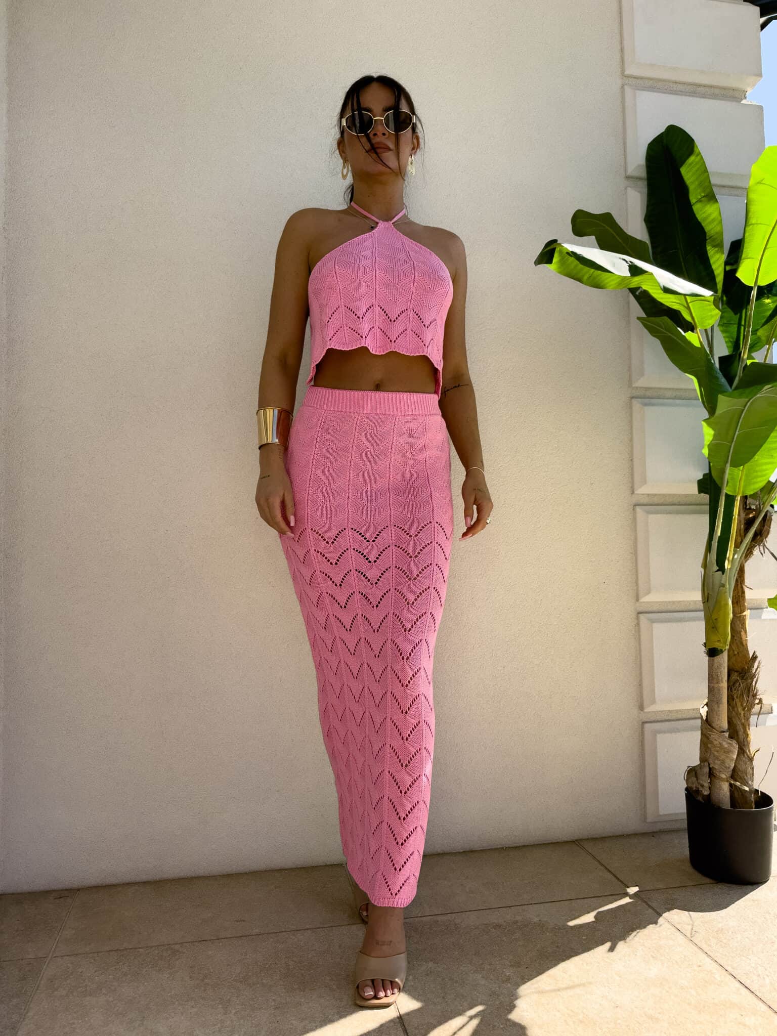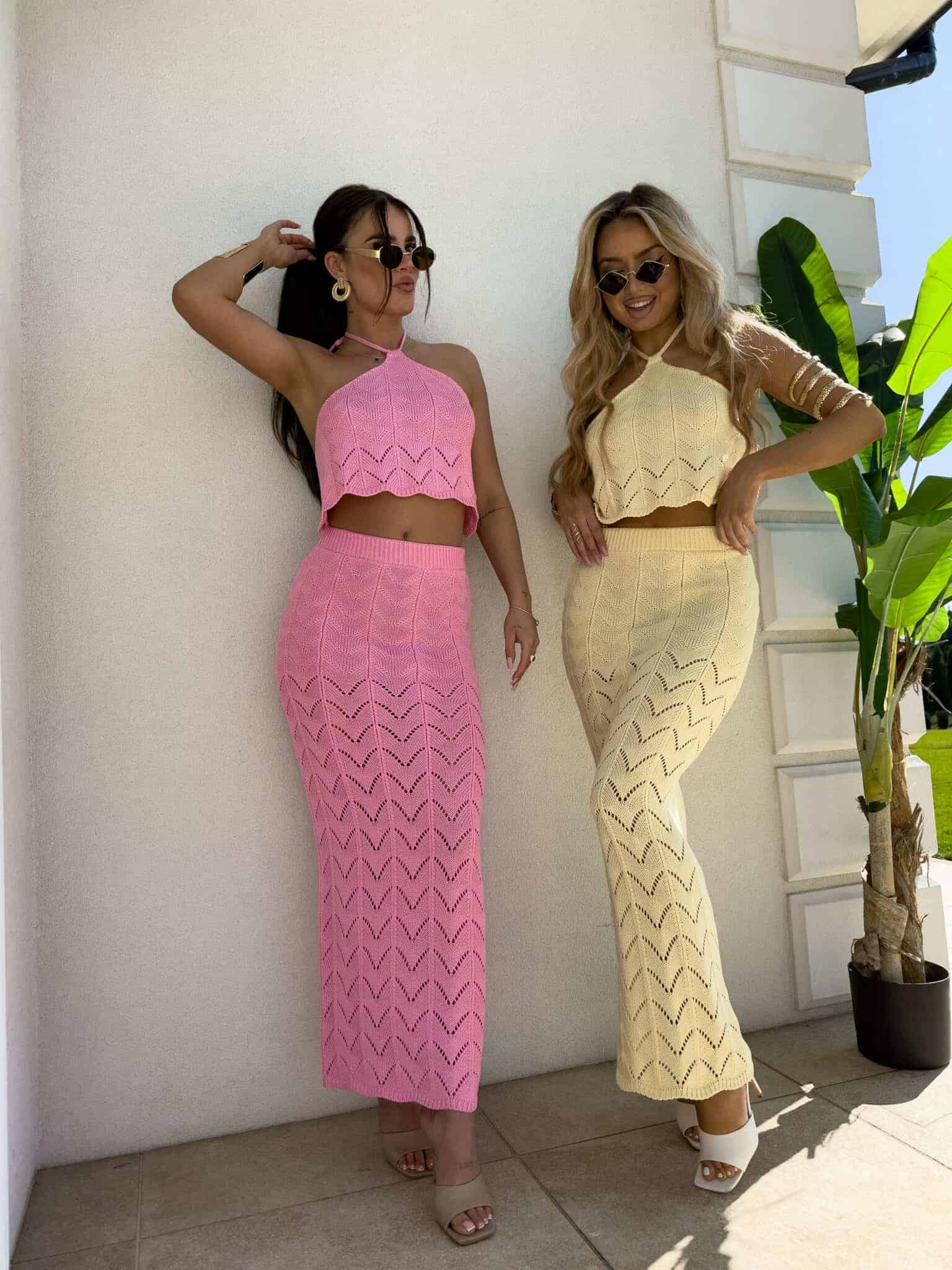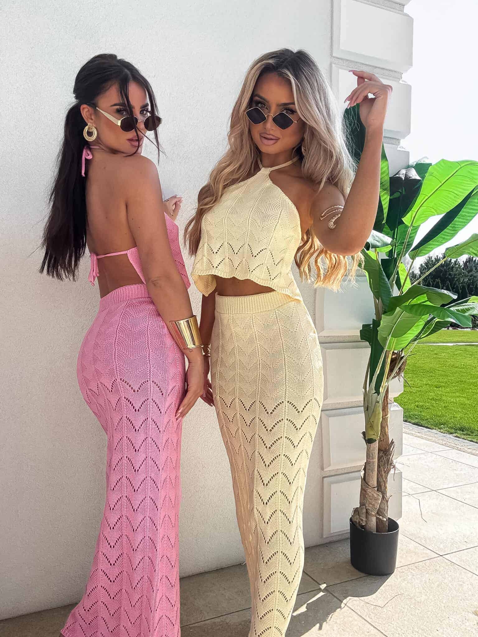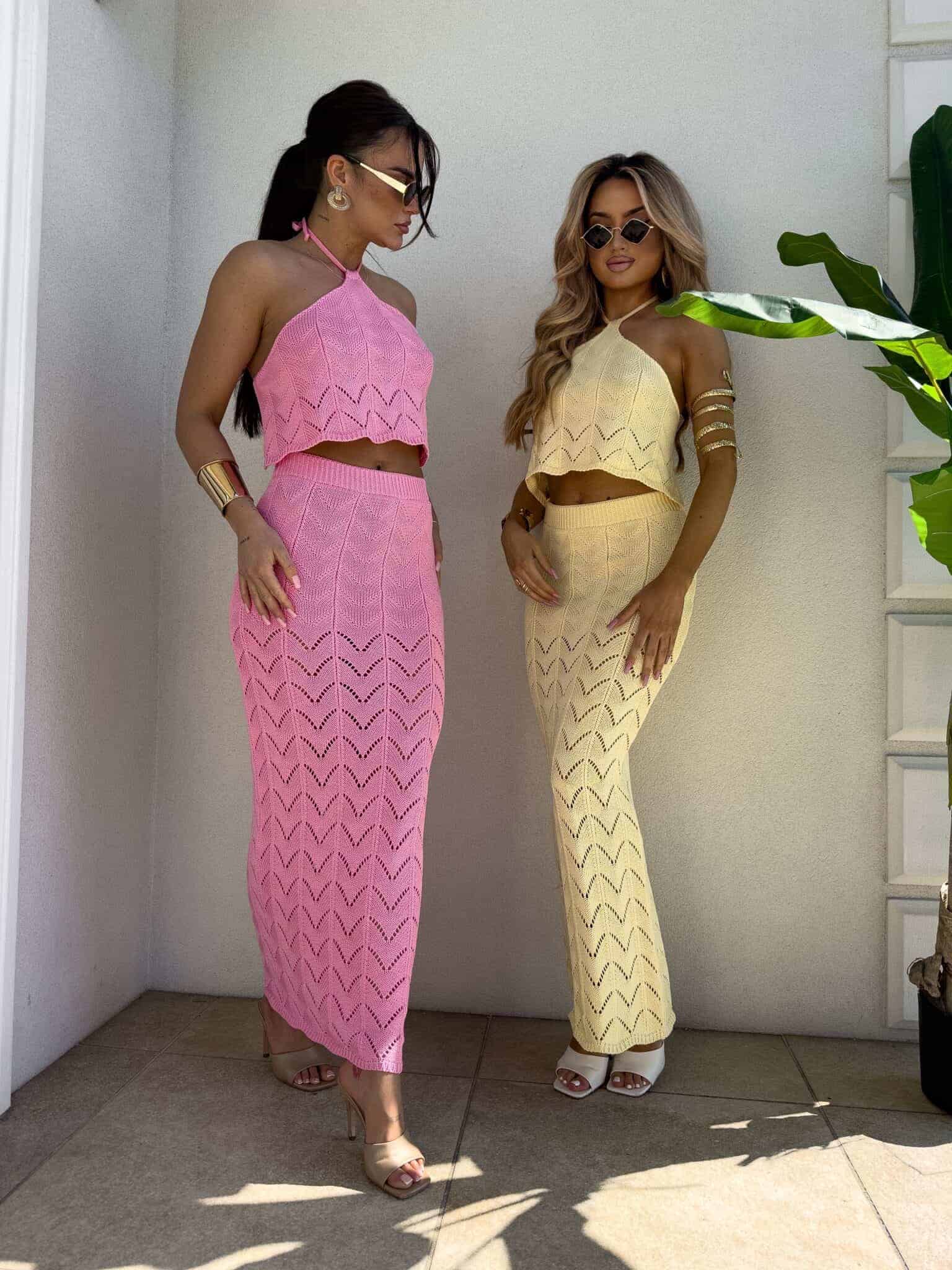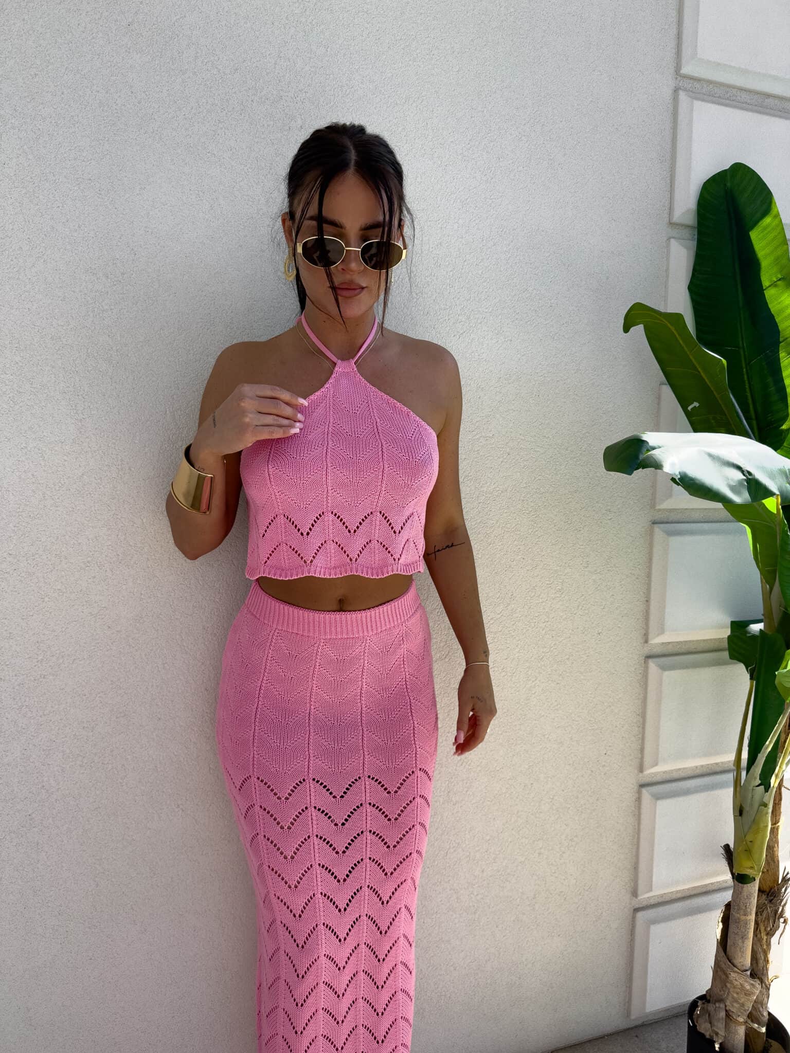 Komplet składający się z topu wiązanego na szyi i na plecach oraz spódnicy maxi z gumką w pasie to elegancka i jednocześnie komfortowa propozycja na letnie dni. Top wiązany na szyi i plecach dodaje lekkości i swobody, zapewniając idealne dopasowanie do sylwetki. Dzięki wiązaniu na plecach i szyi, można dostosować go do swoich preferencji, uzyskując perfekcyjny wygląd. Spódnica maxi z gumką w pasie jest nie tylko wygodna, ale i stylowa – jej luźny krój podkreśla kobiecą figurę, jednocześnie zapewniając komfort noszenia przez cały dzień. To połączenie, które idealnie sprawdzi się zarówno na wakacyjne wyjazdy, jak i na codzienne, letnie stylizacje.