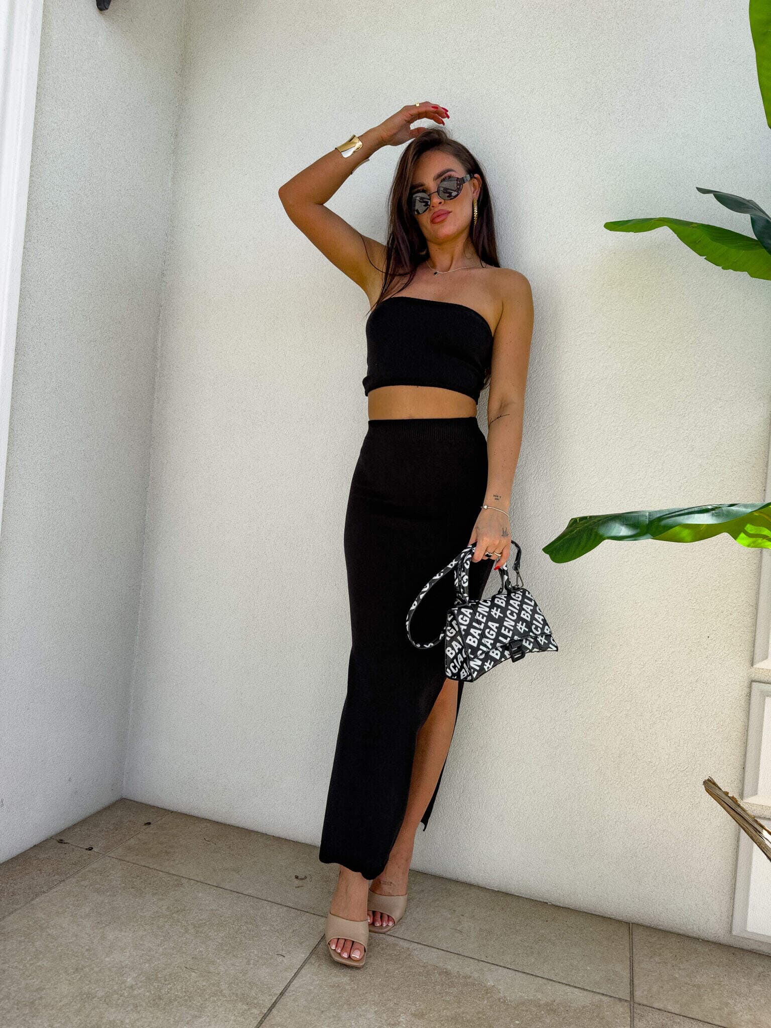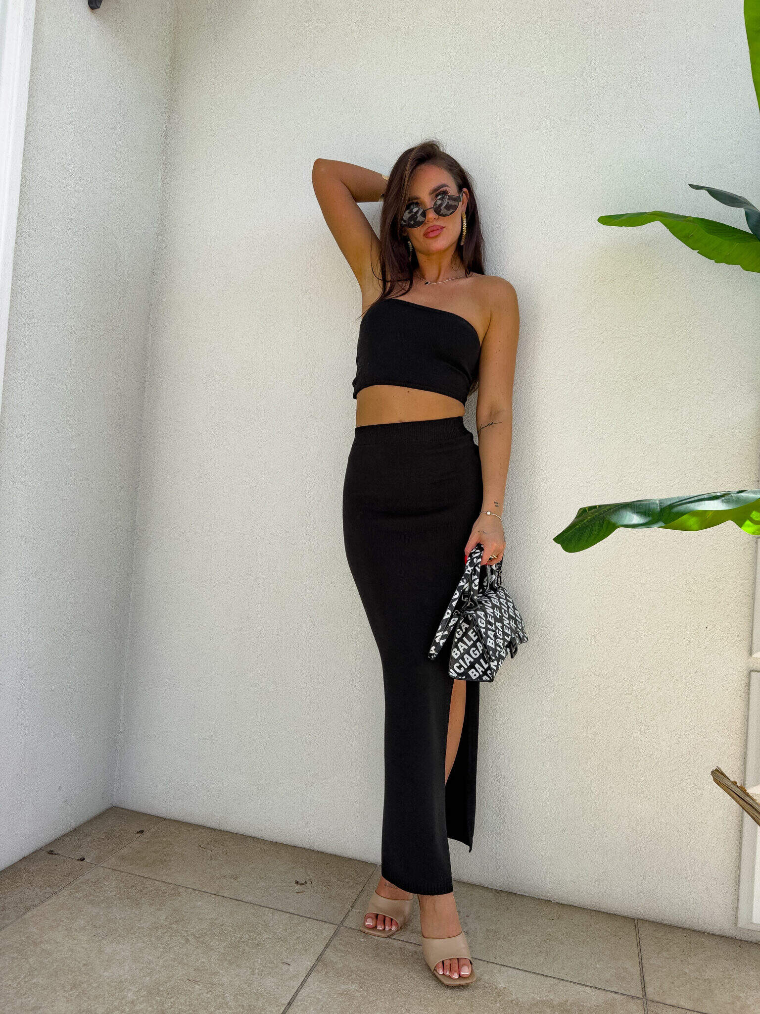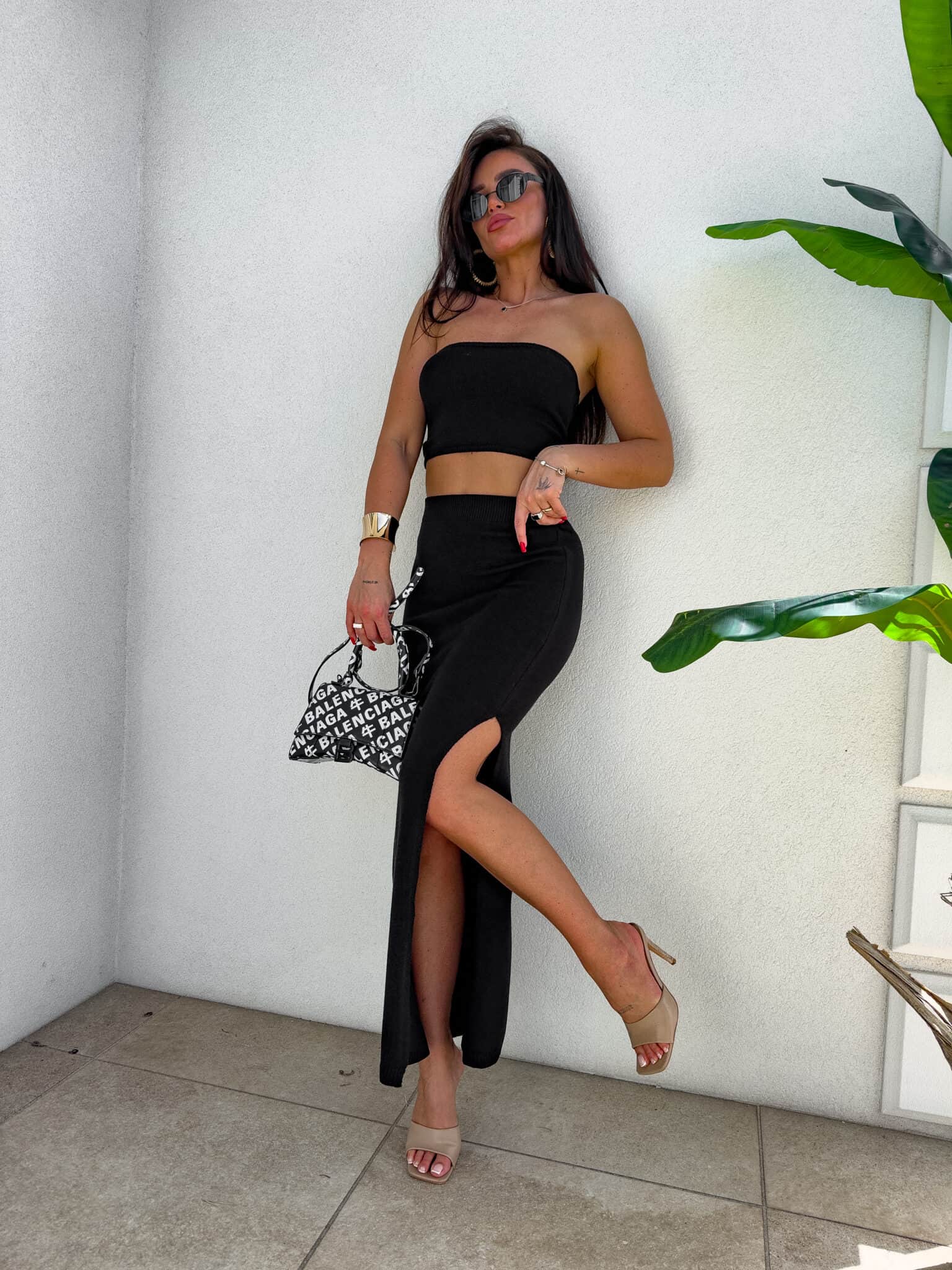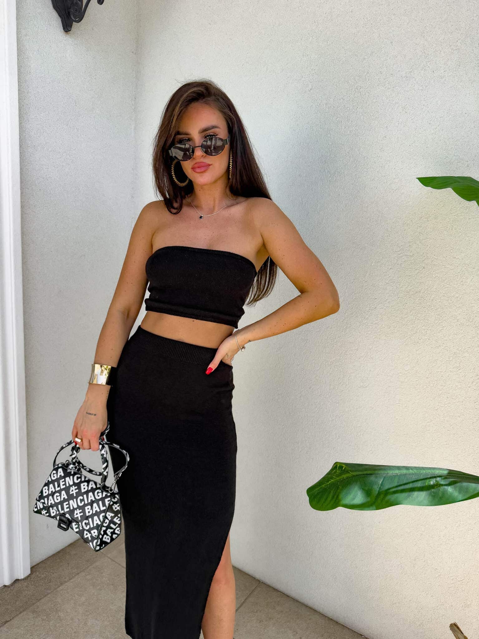 Stylowy i kobiecy komplet wykonany z wysokiej jakości, elastycznego materiału z dodatkiem kaszmiru. Top typu opaska idealnie dopasowuje się do sylwetki, podkreślając ramiona i dekolt. Długa spódnica maxi z efektownym rozcięciem po jednej stronie subtelnie eksponuje nogę i dodaje lekkości całej stylizacji. Materiał jest przyjemny w dotyku, miękko otula ciało i delikatnie modeluje figurę. Idealny wybór na wieczorne wyjście, letnie przyjęcie lub stylową randkę.