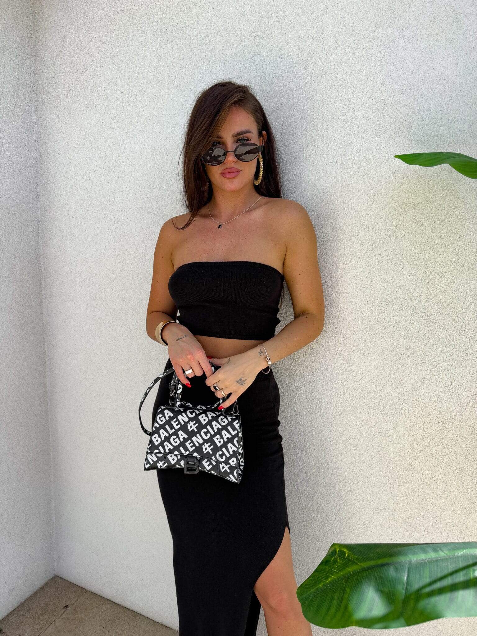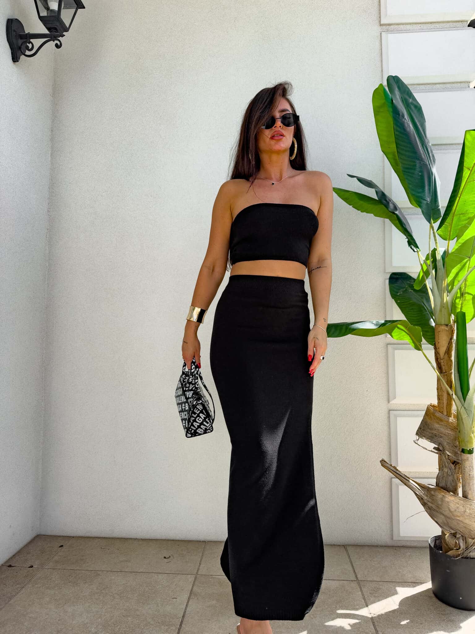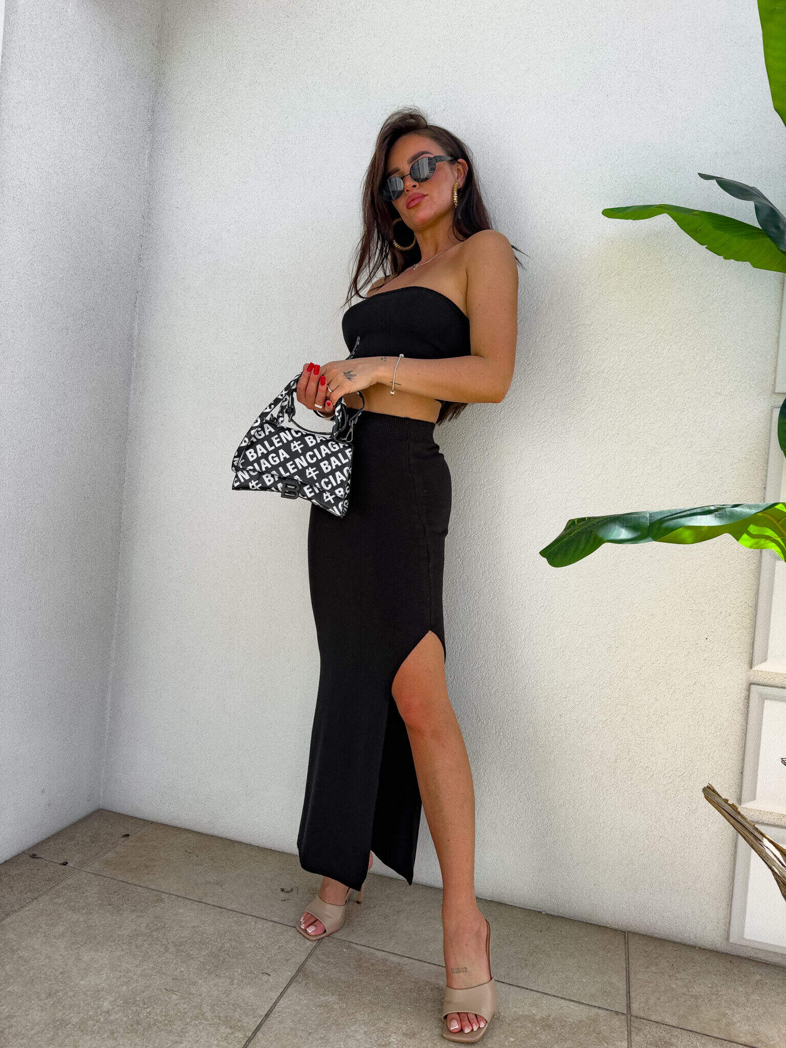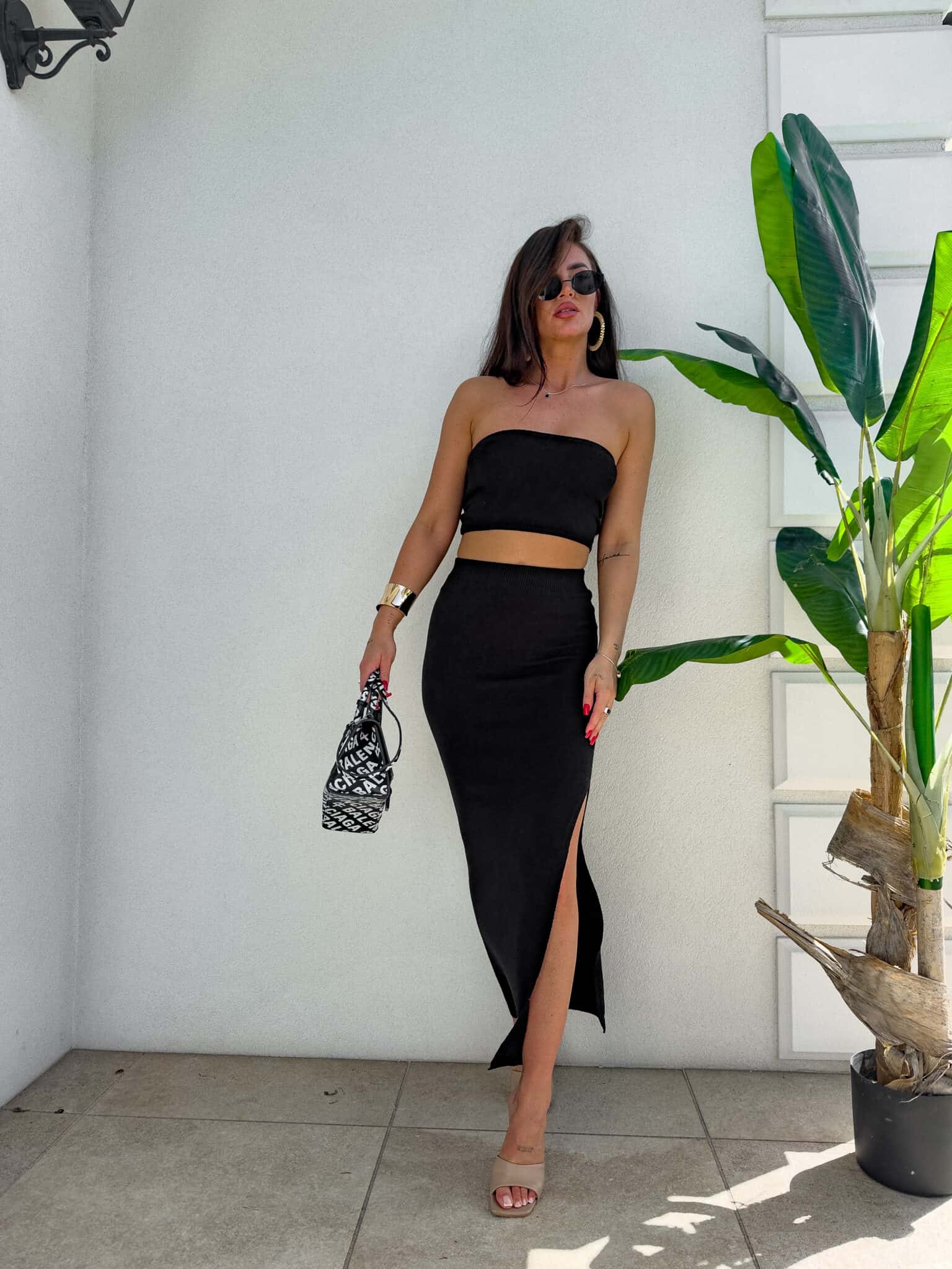 Stylowy i kobiecy komplet wykonany z wysokiej jakości, elastycznego materiału z dodatkiem kaszmiru. Top typu opaska idealnie dopasowuje się do sylwetki, podkreślając ramiona i dekolt. Długa spódnica maxi z efektownym rozcięciem po jednej stronie subtelnie eksponuje nogę i dodaje lekkości całej stylizacji. Materiał jest przyjemny w dotyku, miękko otula ciało i delikatnie modeluje figurę. Idealny wybór na wieczorne wyjście, letnie przyjęcie lub stylową randkę.