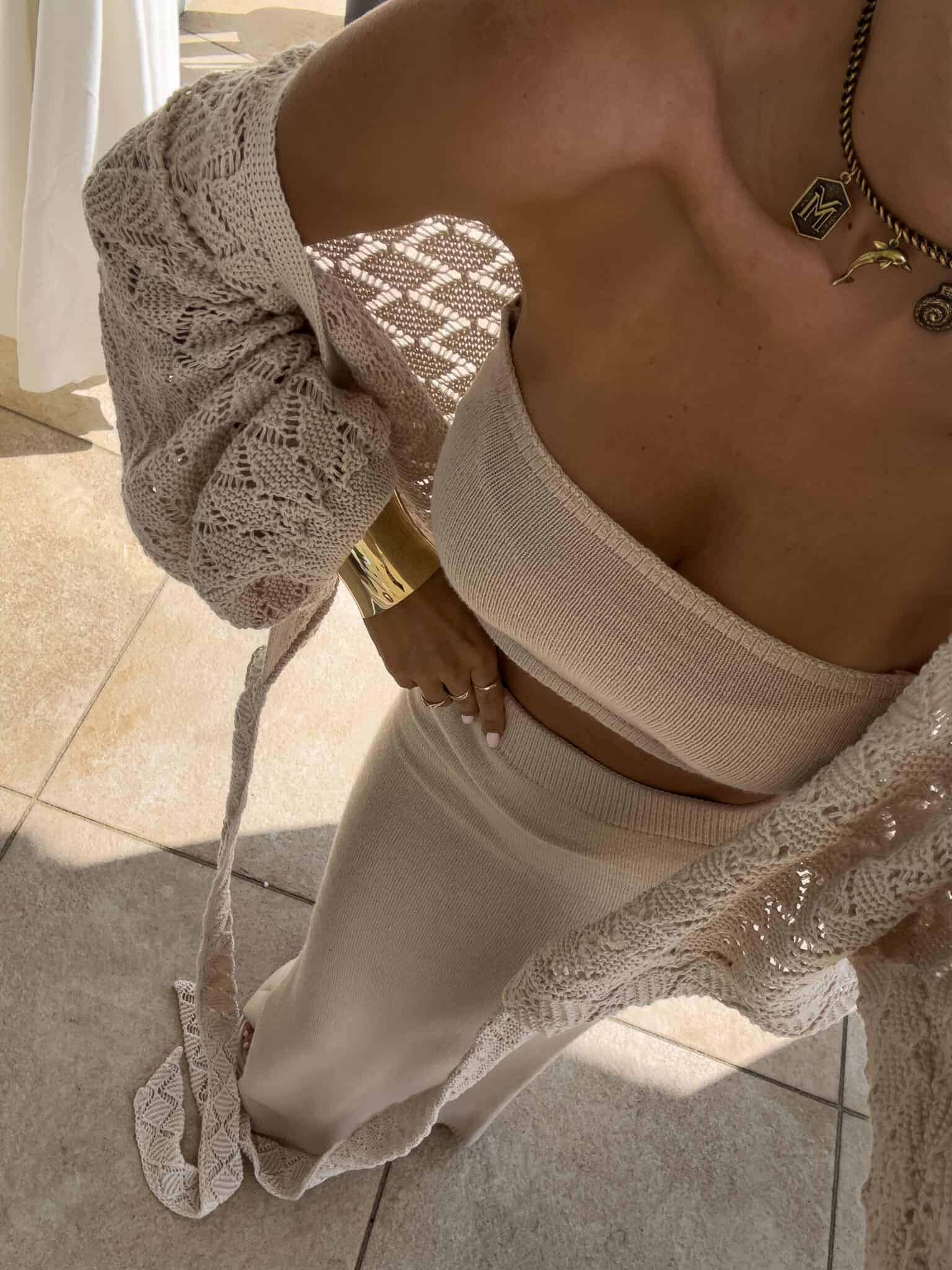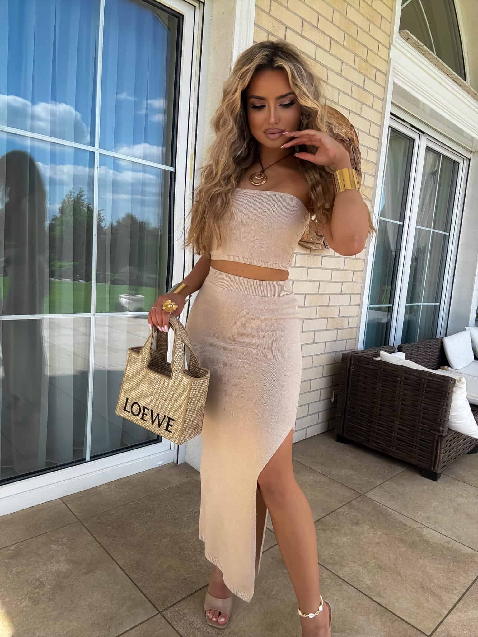 Stylowy i kobiecy komplet wykonany z wysokiej jakości, elastycznego materiału z dodatkiem kaszmiru. Top typu opaska idealnie dopasowuje się do sylwetki, podkreślając ramiona i dekolt. Długa spódnica maxi z efektownym rozcięciem po jednej stronie subtelnie eksponuje nogę i dodaje lekkości całej stylizacji. Materiał jest przyjemny w dotyku, miękko otula ciało i delikatnie modeluje figurę. Idealny wybór na wieczorne wyjście, letnie przyjęcie lub stylową randkę.