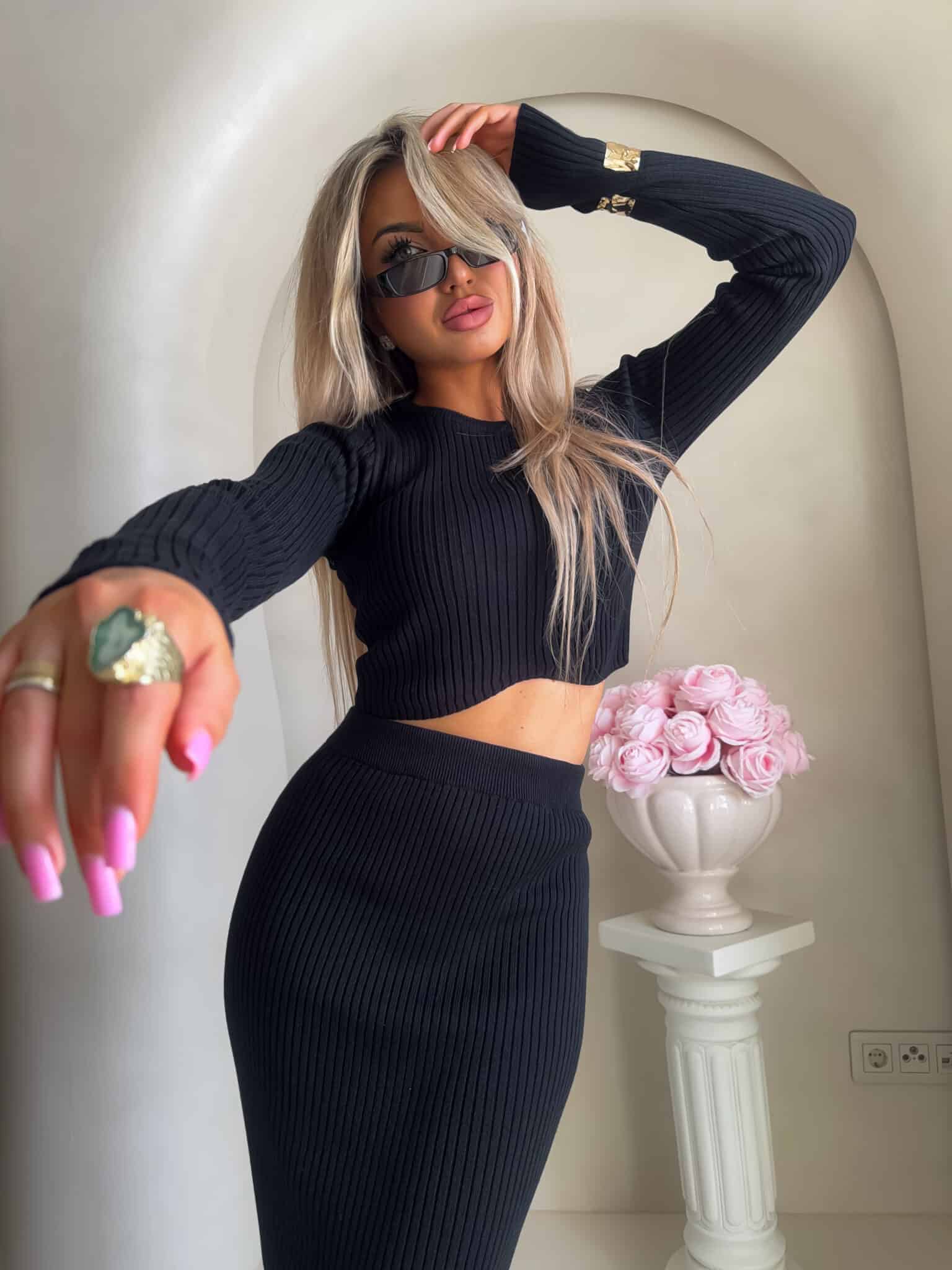 Dzianinowy komplet składający się z krótkiego, dopasowanego topu z długim rękawem oraz długiej spódnicy midi/maxi. Top z delikatnym prążkowaniem subtelnie odsłania talię i pięknie układa się na sylwetce. Spódnica z wysokim stanem, również prążkowana, jest obcisła i efektownie podkreśla kobiece kształty.