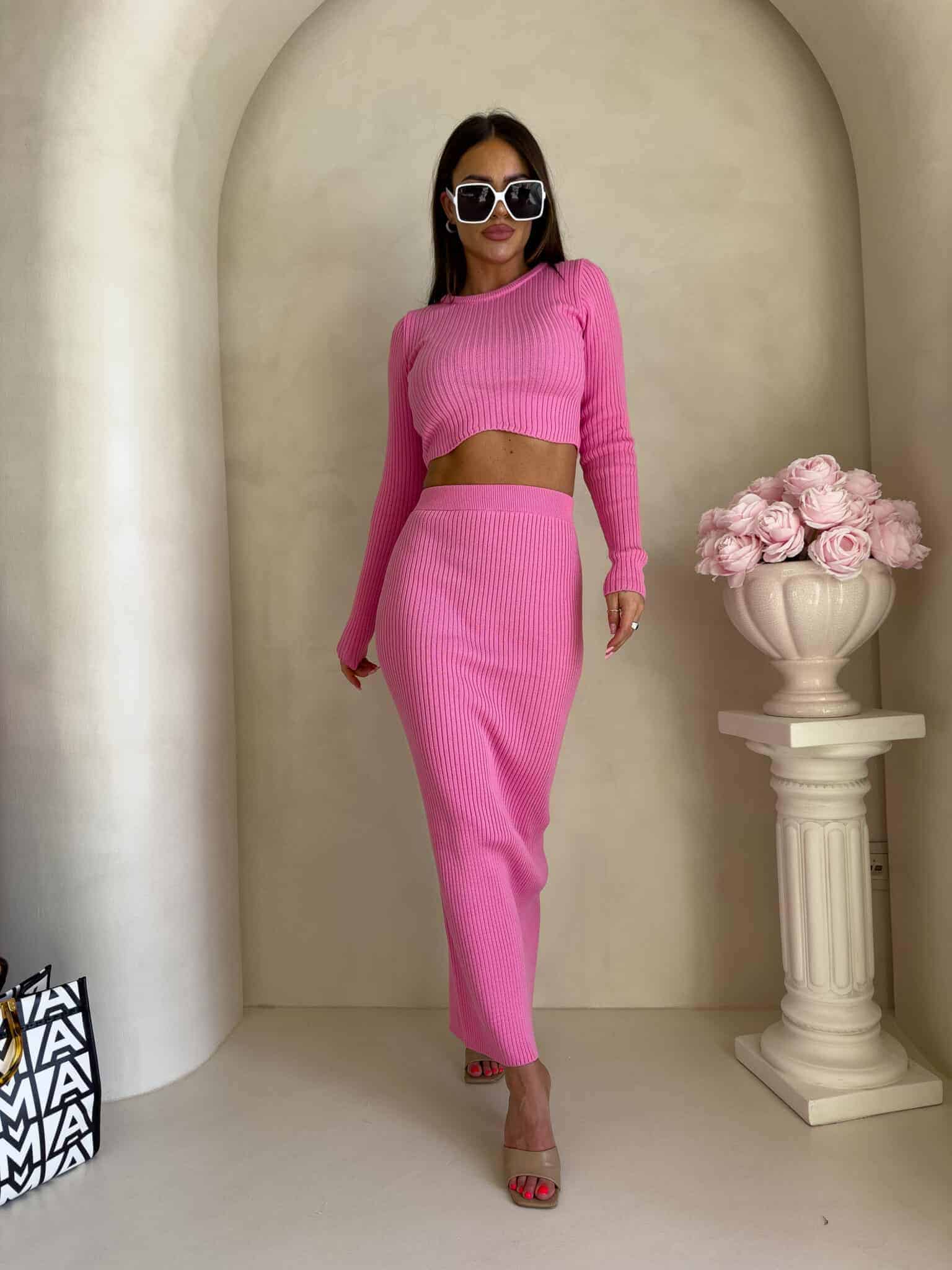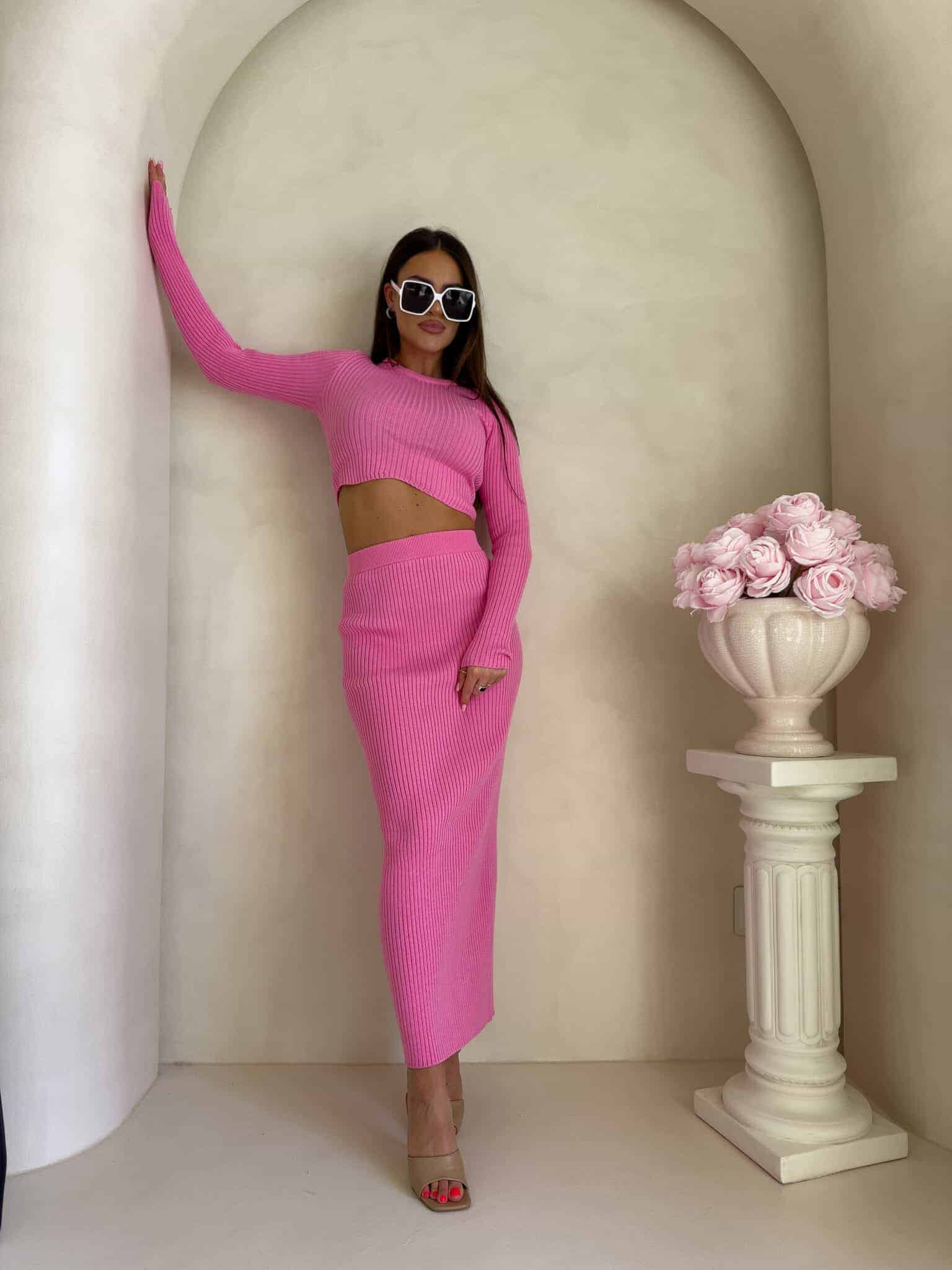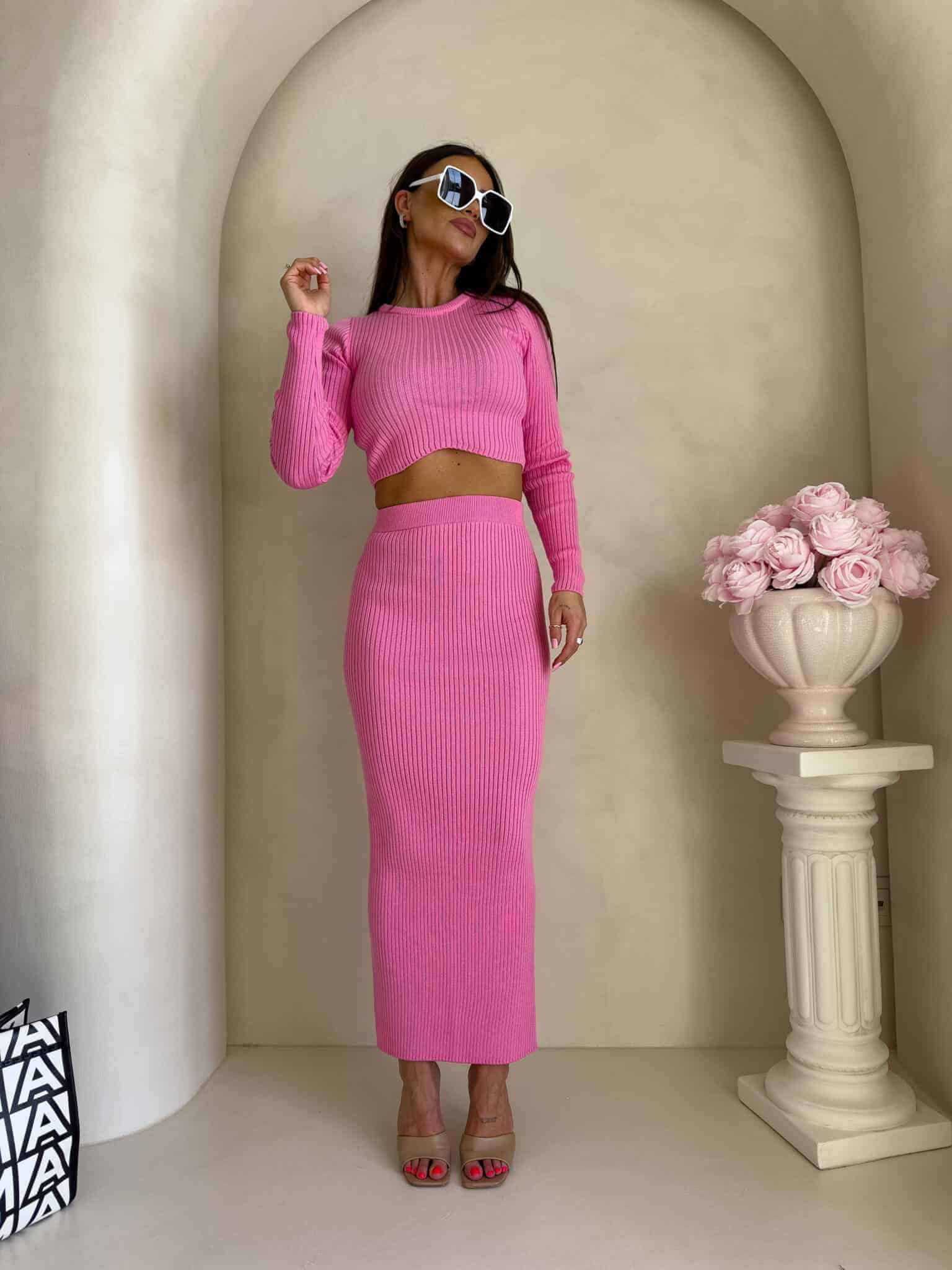Dzianinowy komplet składający się z krótkiego, dopasowanego topu z długim rękawem oraz długiej spódnicy midi/maxi. Top z delikatnym prążkowaniem subtelnie odsłania talię i pięknie układa się na sylwetce. Spódnica z wysokim stanem, również prążkowana, jest obcisła i efektownie podkreśla kobiece kształty.