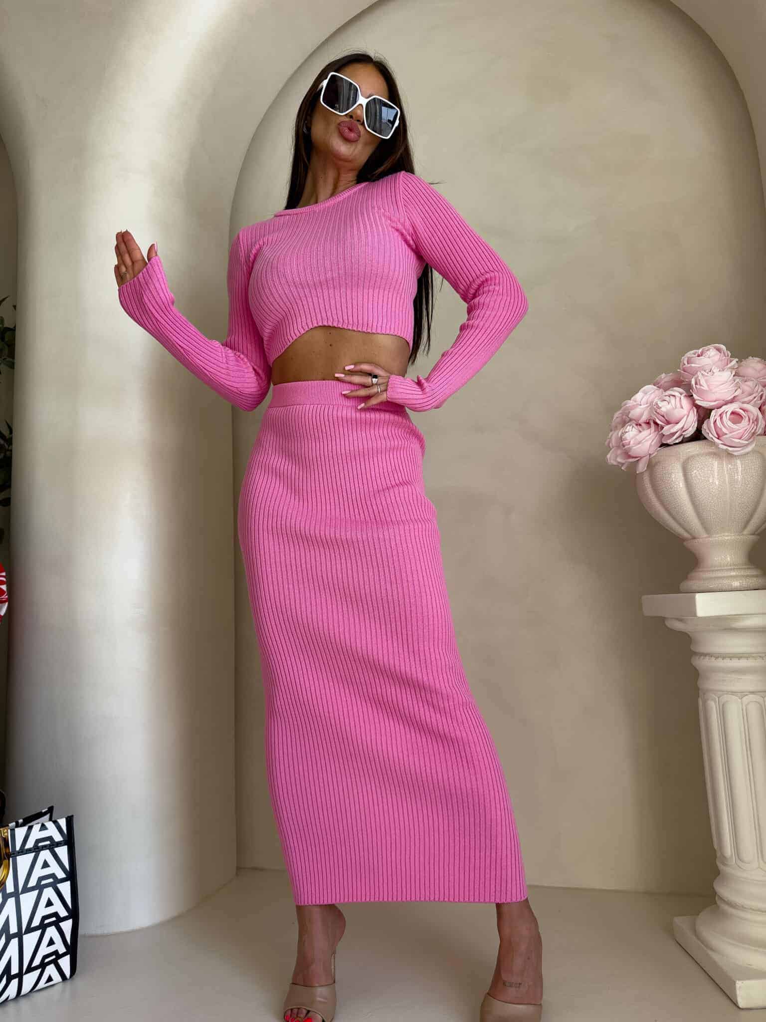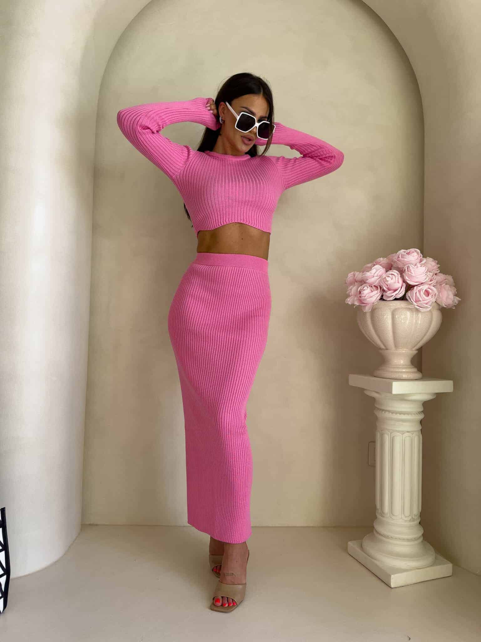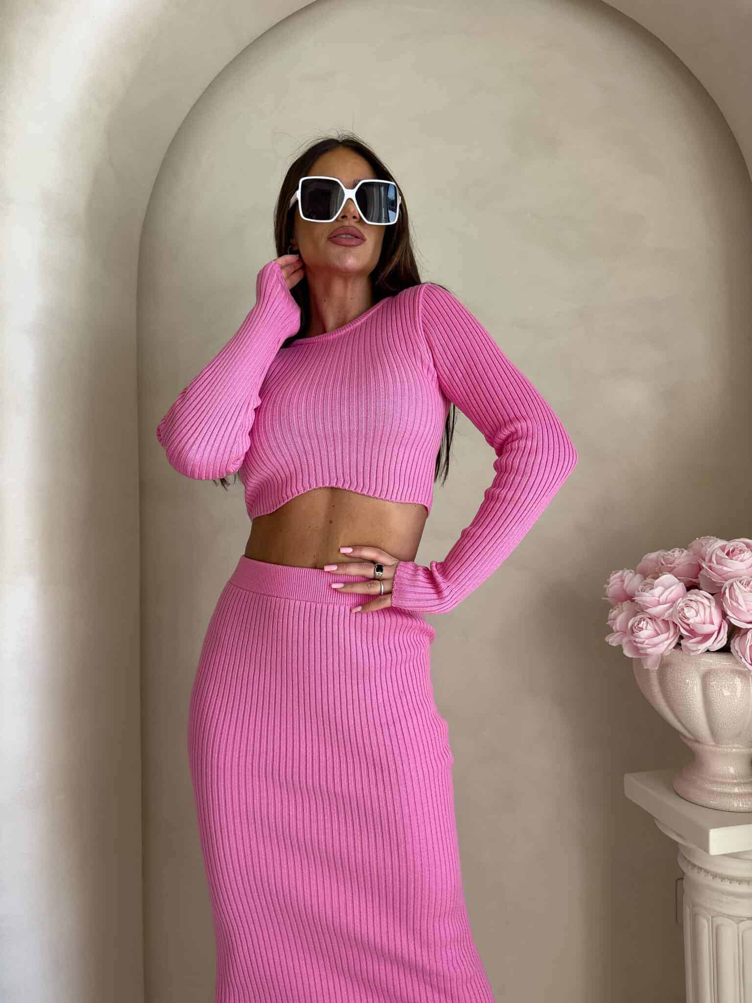 Dzianinowy komplet składający się z krótkiego, dopasowanego topu z długim rękawem oraz długiej spódnicy midi/maxi. Top z delikatnym prążkowaniem subtelnie odsłania talię i pięknie układa się na sylwetce. Spódnica z wysokim stanem, również prążkowana, jest obcisła i efektownie podkreśla kobiece kształty.
