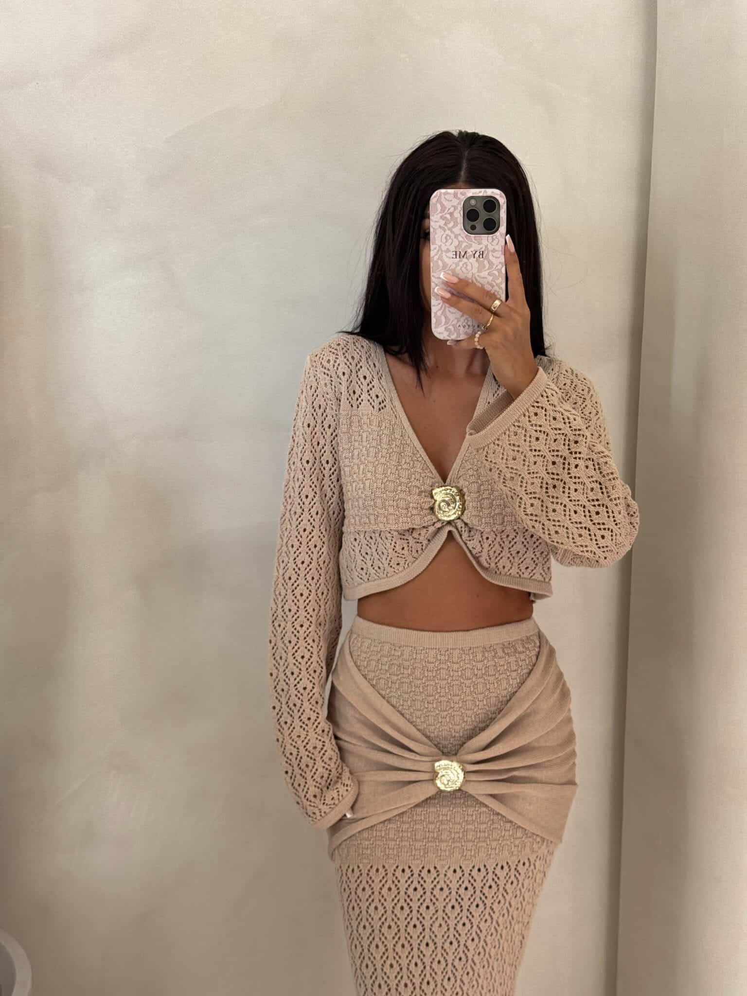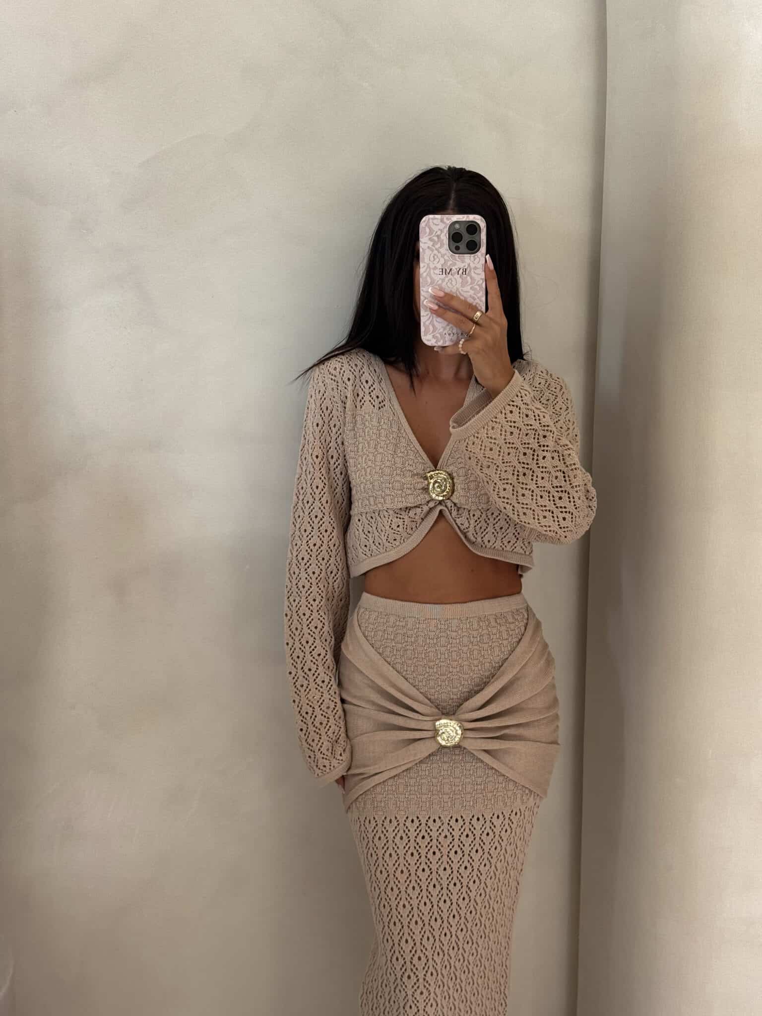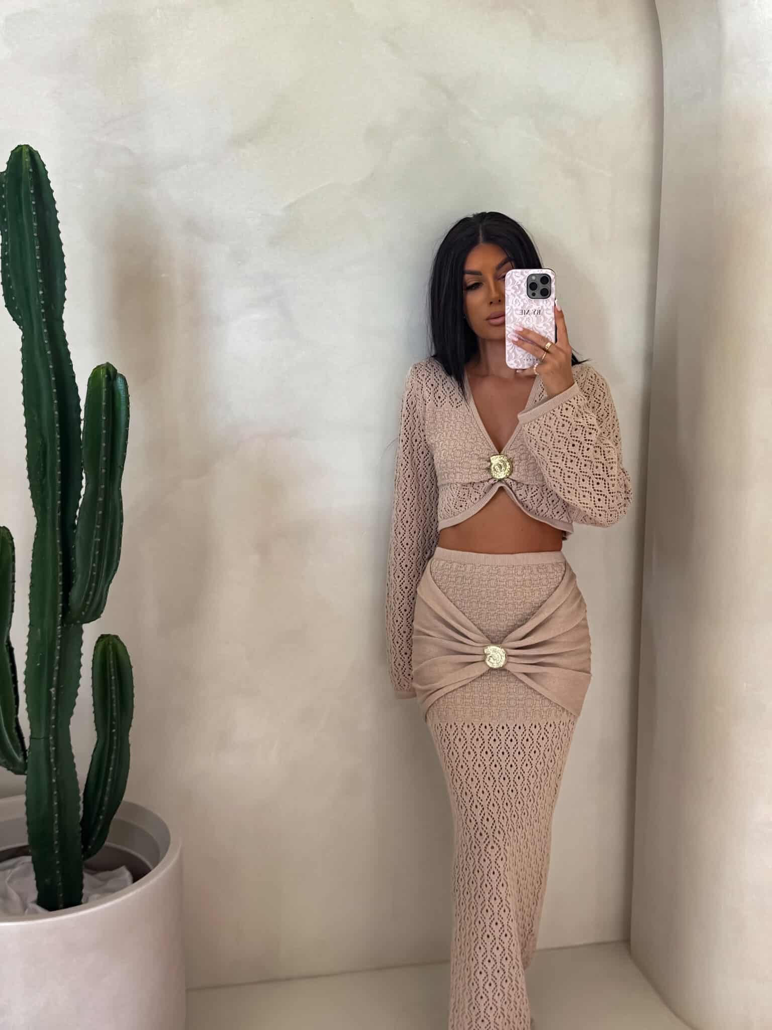 Stylowy i niezwykle kobiecy komplet wykonany z ażurowej, elastycznej dzianiny, który idealnie podkreśla sylwetkę i wpisuje się w letnie trendy. Zestaw składa się z dopasowanej spódnicy maxi oraz krótkiego topu z długim rękawem. Top o głębokim dekolcie posiada efektowne marszczenie i ozdobne zapięcie z przodu w postaci broszki, którą można odpiąć. Spódnica o długości maxi z dekoracyjnym drapowaniem w talii nadaje całości wyjątkowego charakteru.