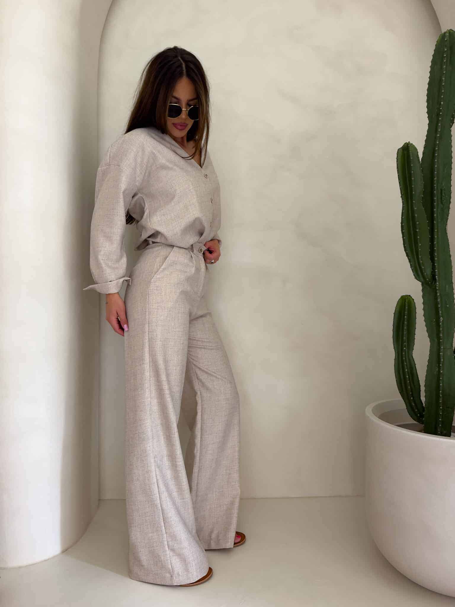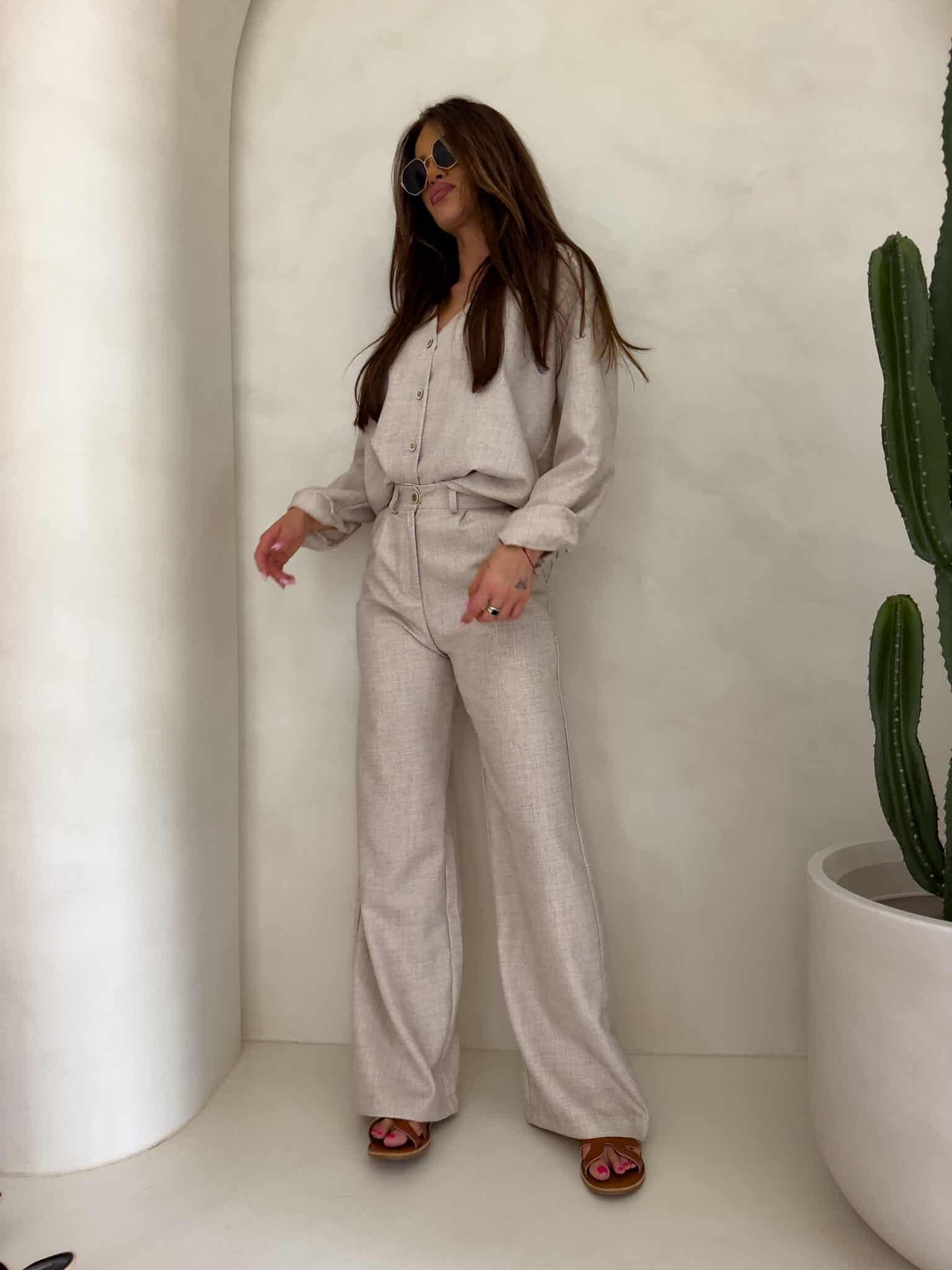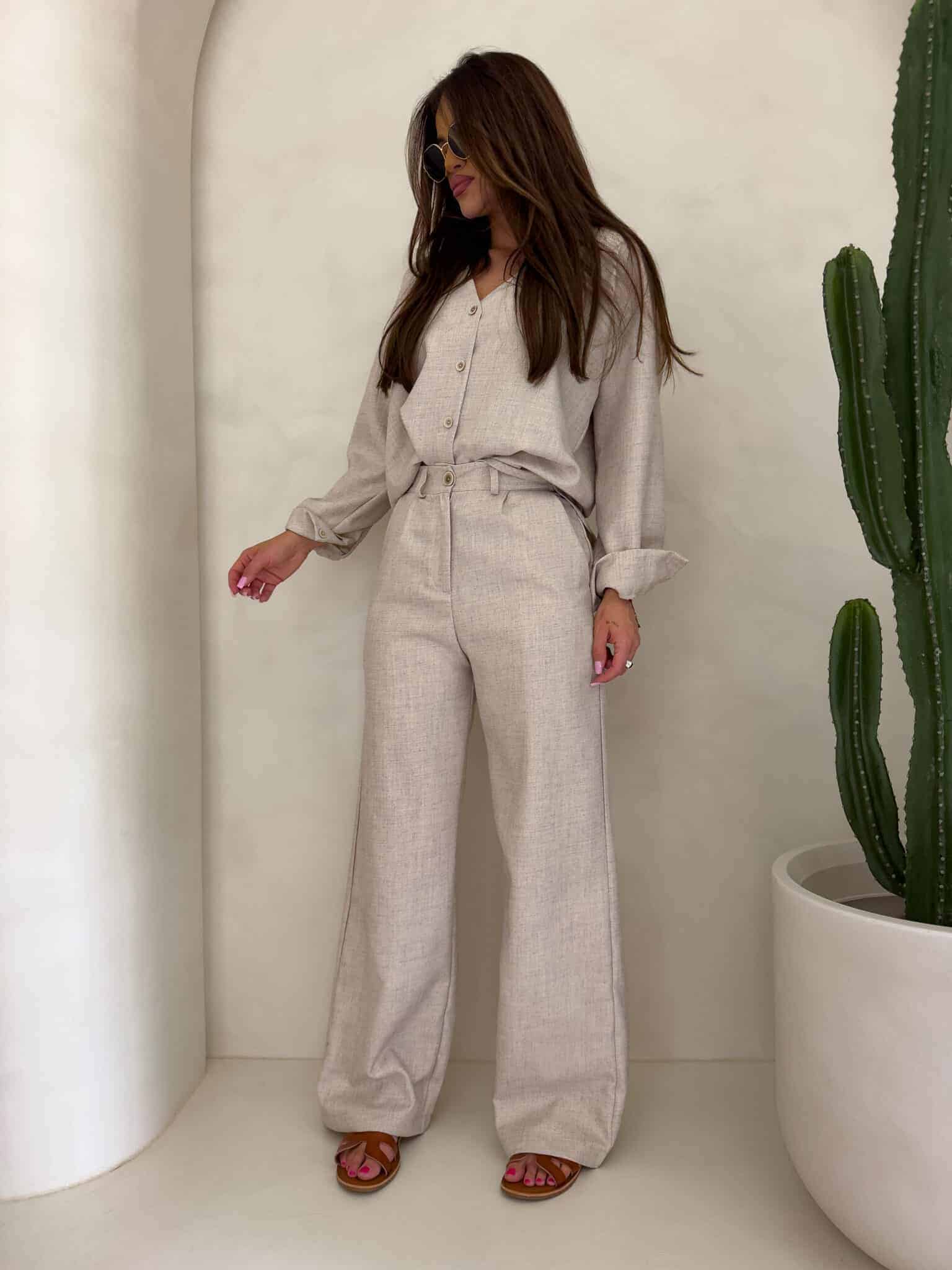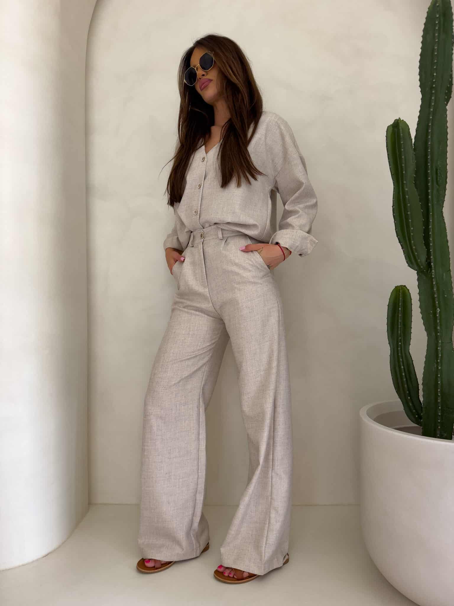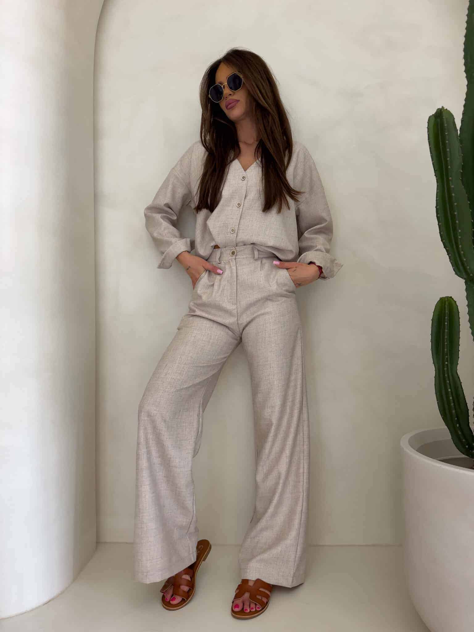 Komplet Mykonos składający się z koszuli i spodni. Koszula zapinana na kokosowe guziki, posiada dłuższy tył. Dekolt w serek. Spodnie posiadają szlufki, zapinane na suwak i guzik.