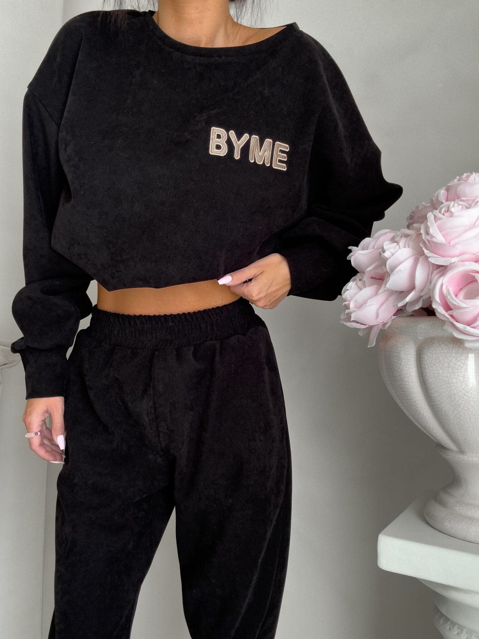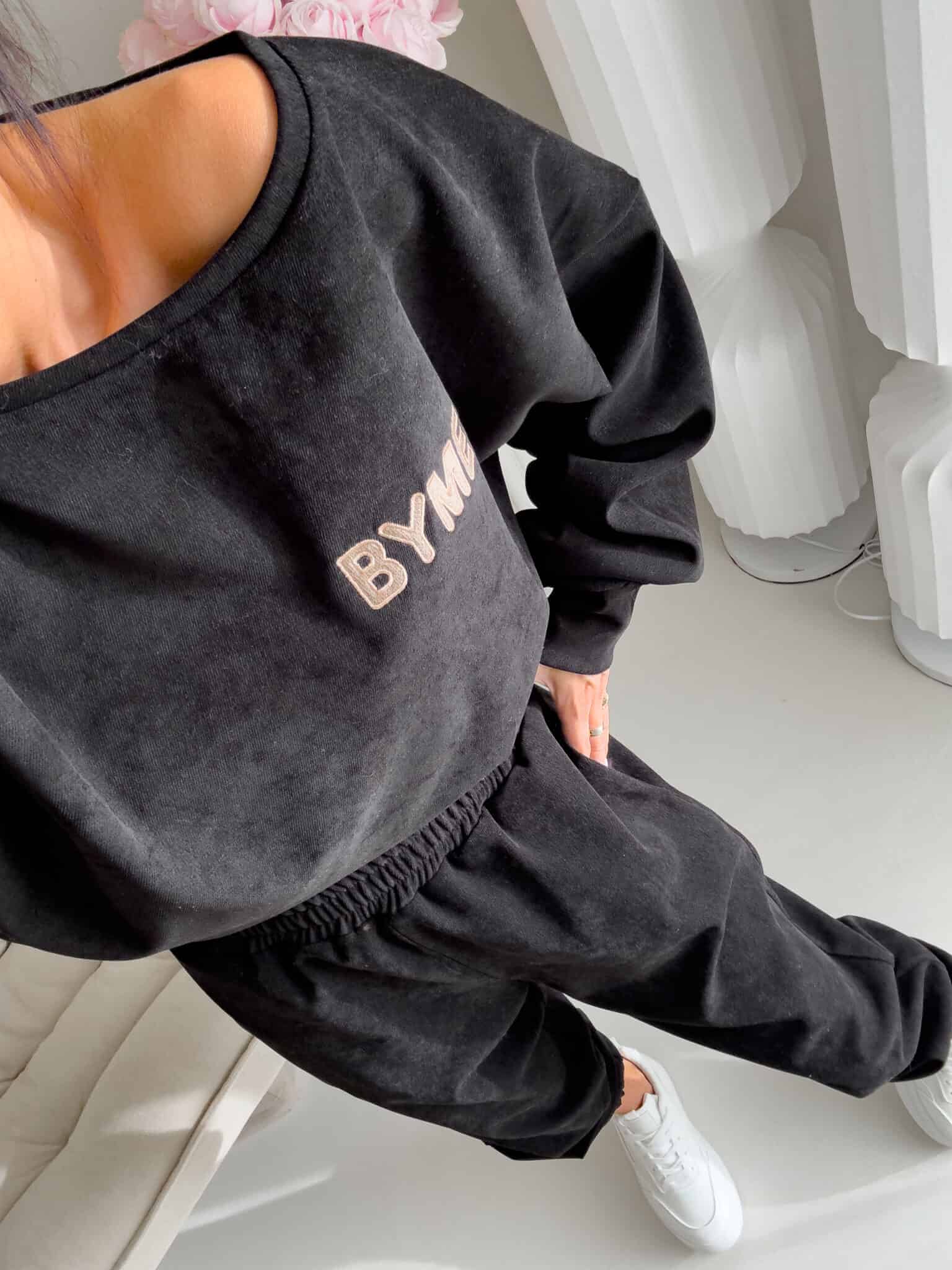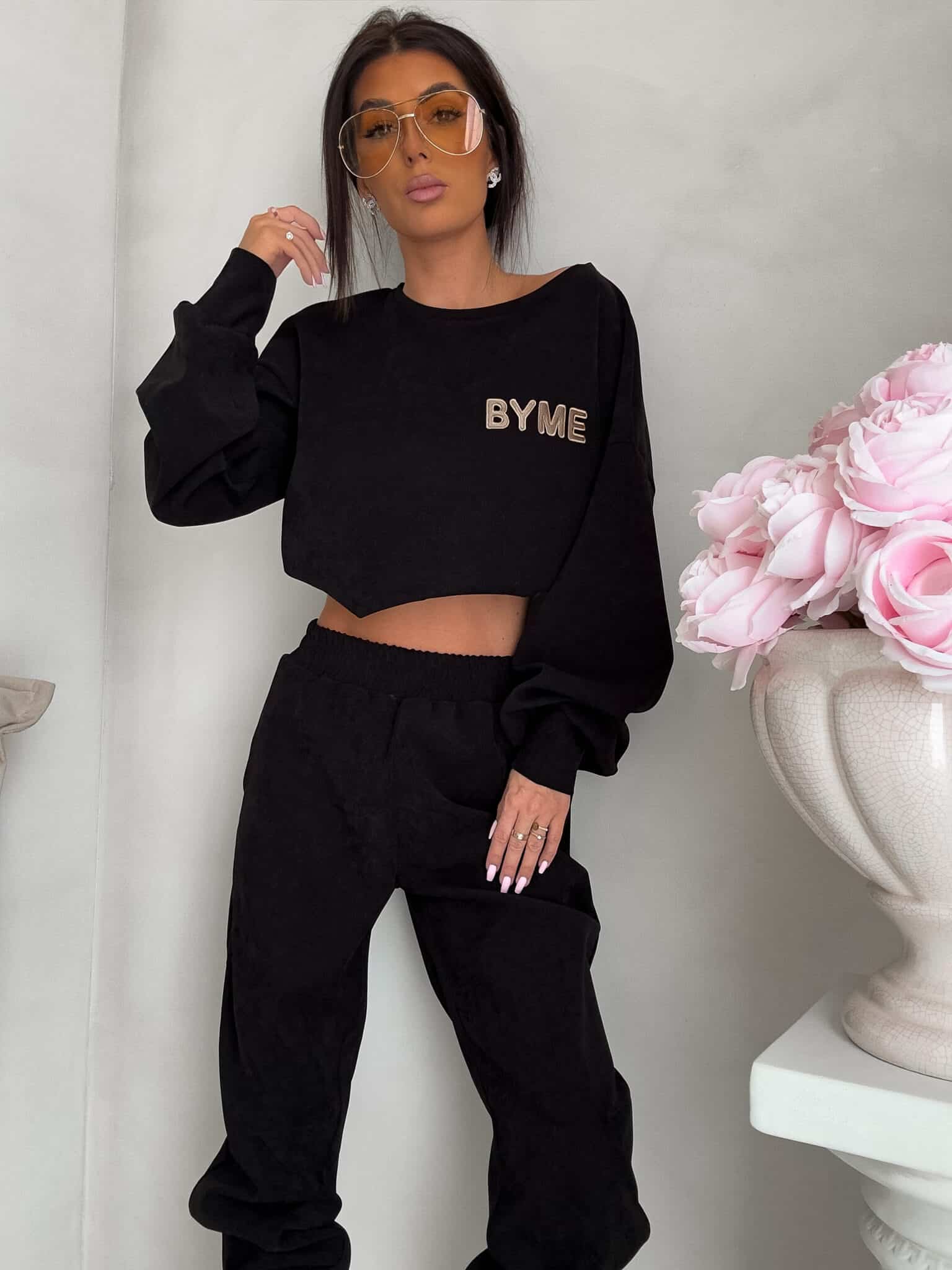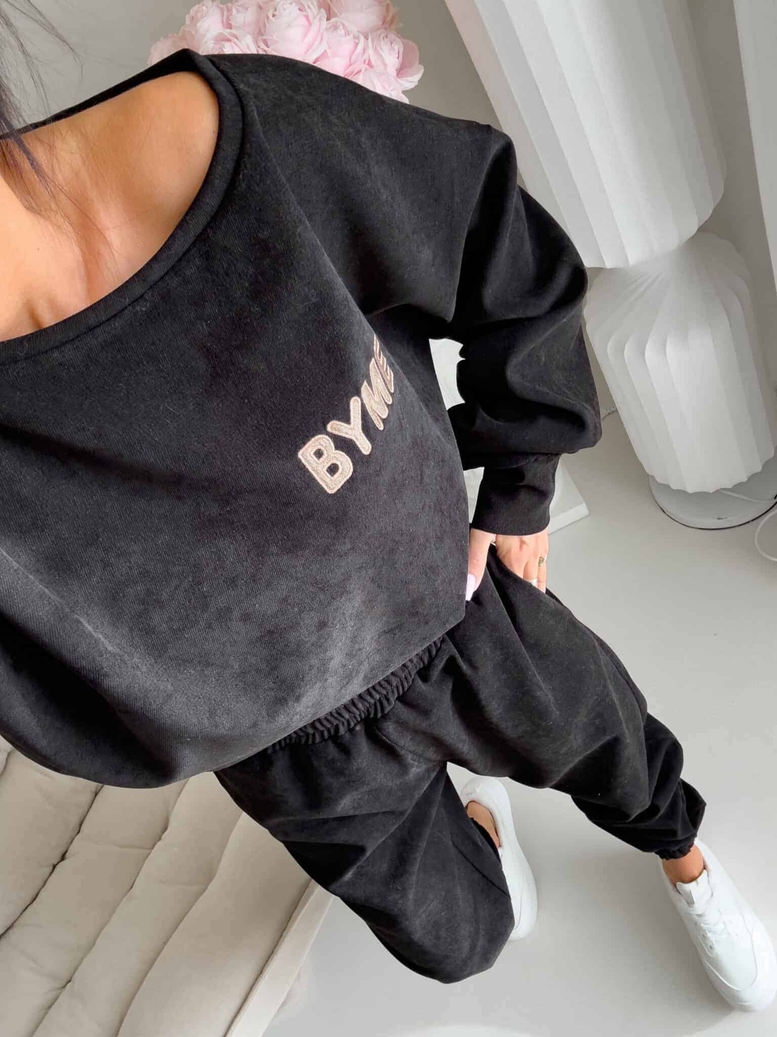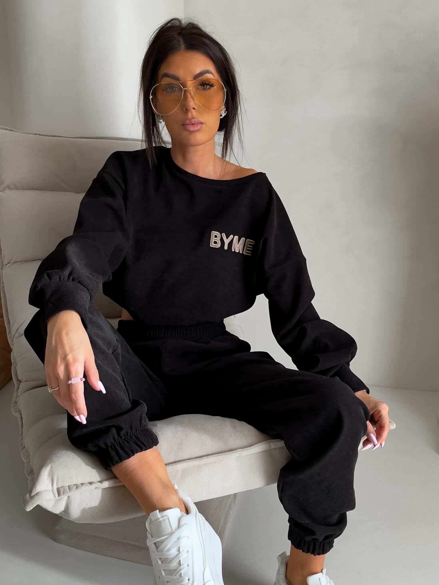 Komplet dresowy składający się z bluzy o luźnym kroju oraz dopasowanych spodni. Bluza posiada długie rękawy, klasyczny okrągły dekolt oraz subtelne logo umieszczone na piersi. Spodnie z wysokim stanem zapewniają komfort noszenia dzięki elastycznej gumce w pasie,
