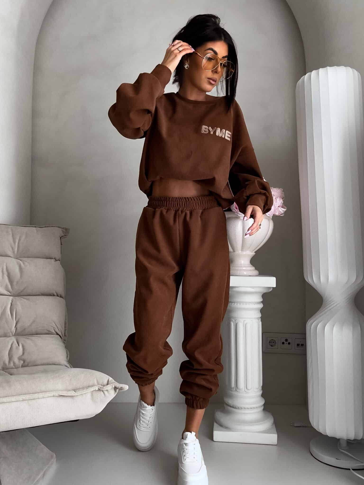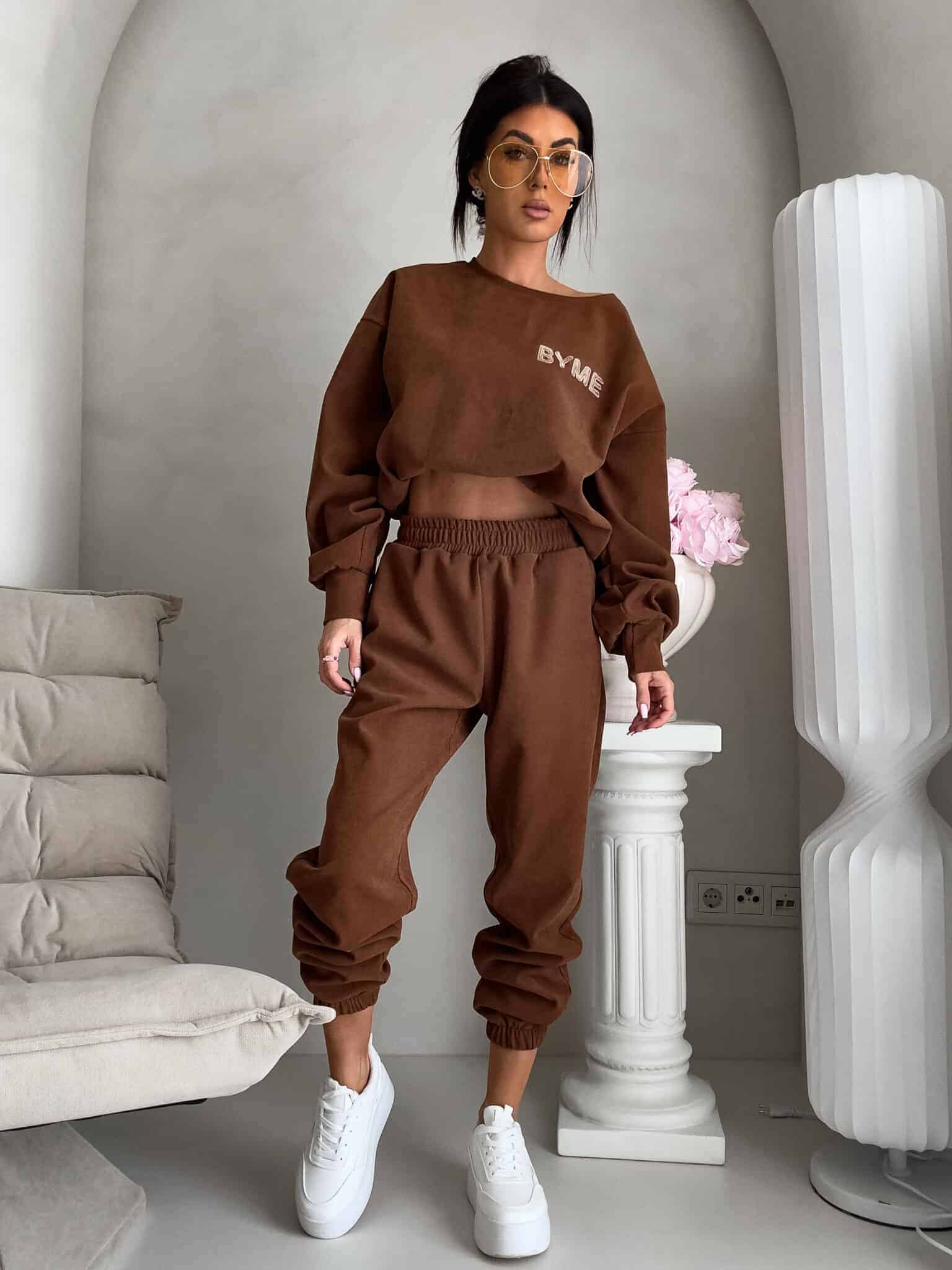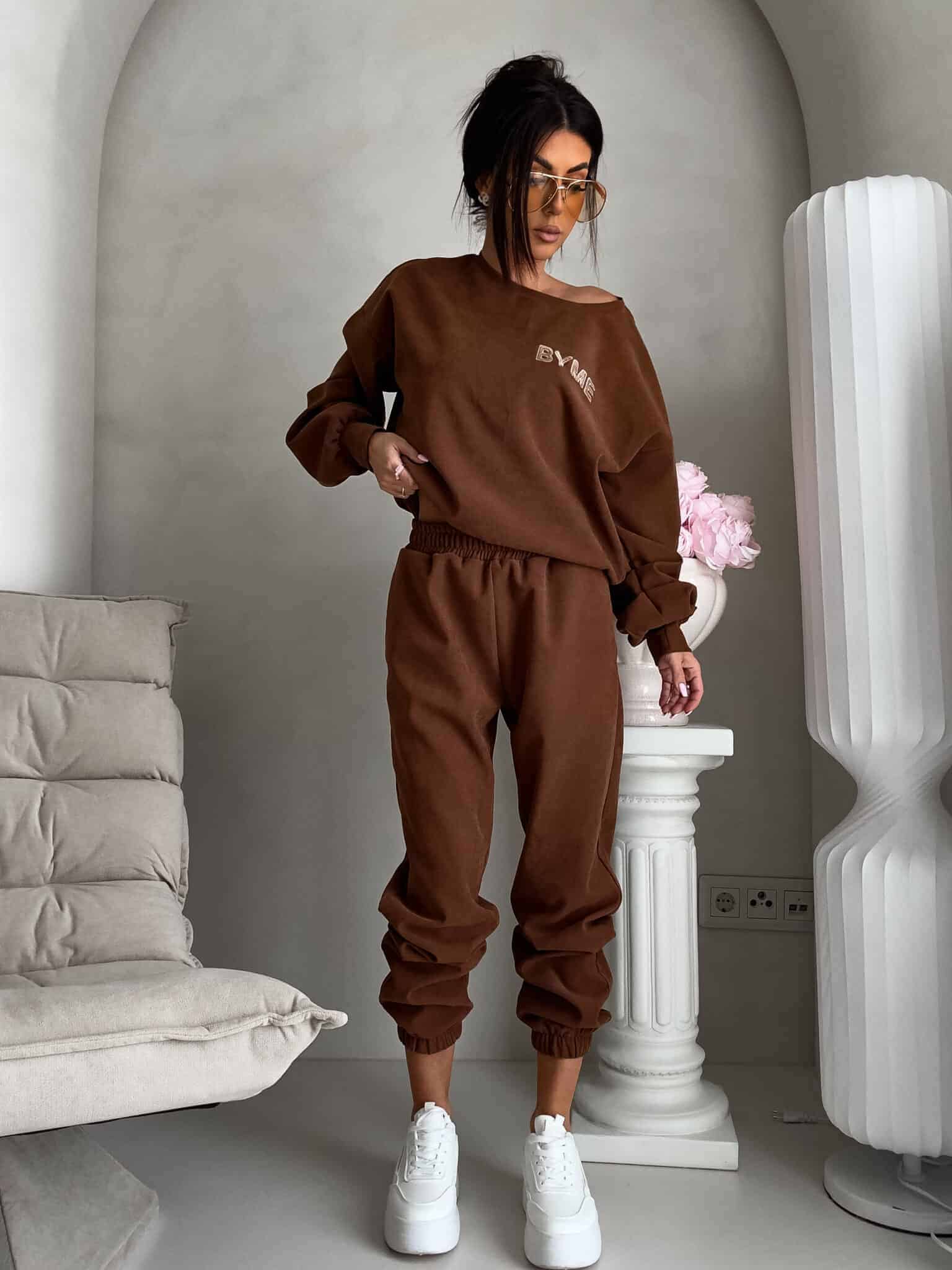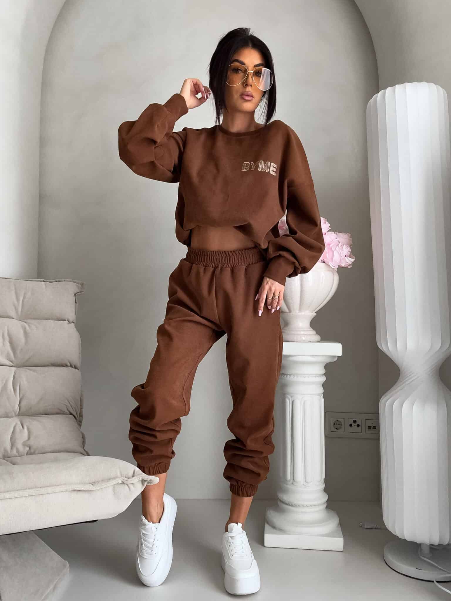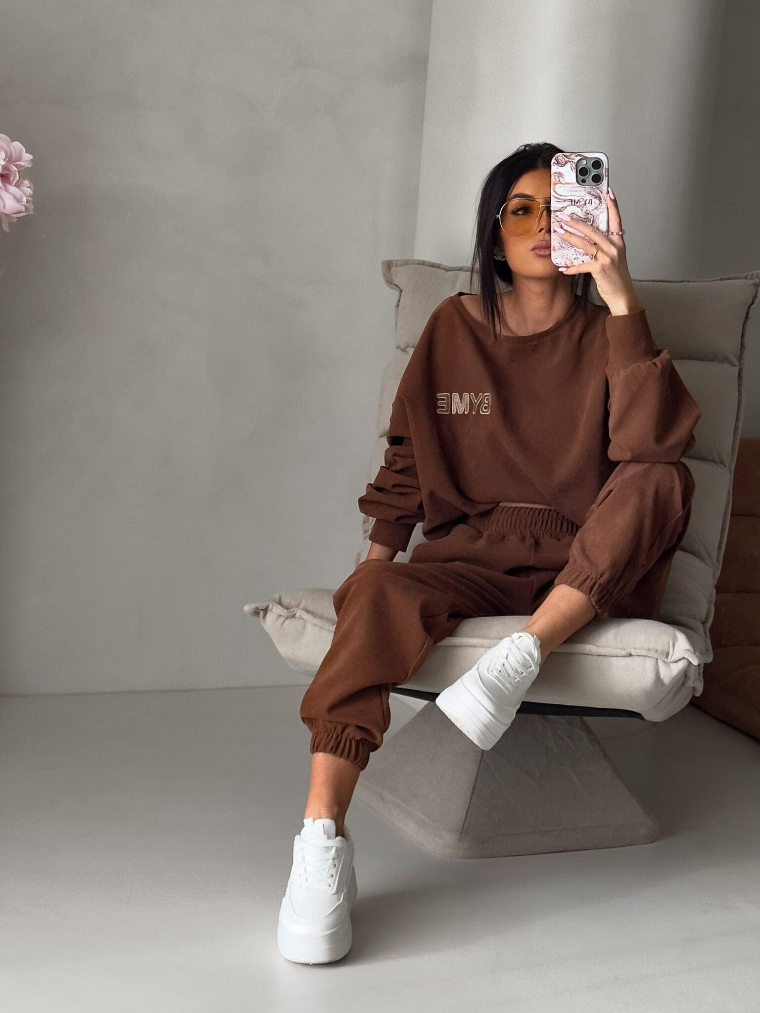 Komplet dresowy składający się z bluzy o luźnym kroju oraz dopasowanych spodni. Bluza posiada długie rękawy, klasyczny okrągły dekolt oraz subtelne logo umieszczone na piersi. Spodnie z wysokim stanem zapewniają komfort noszenia dzięki elastycznej gumce w pasie,