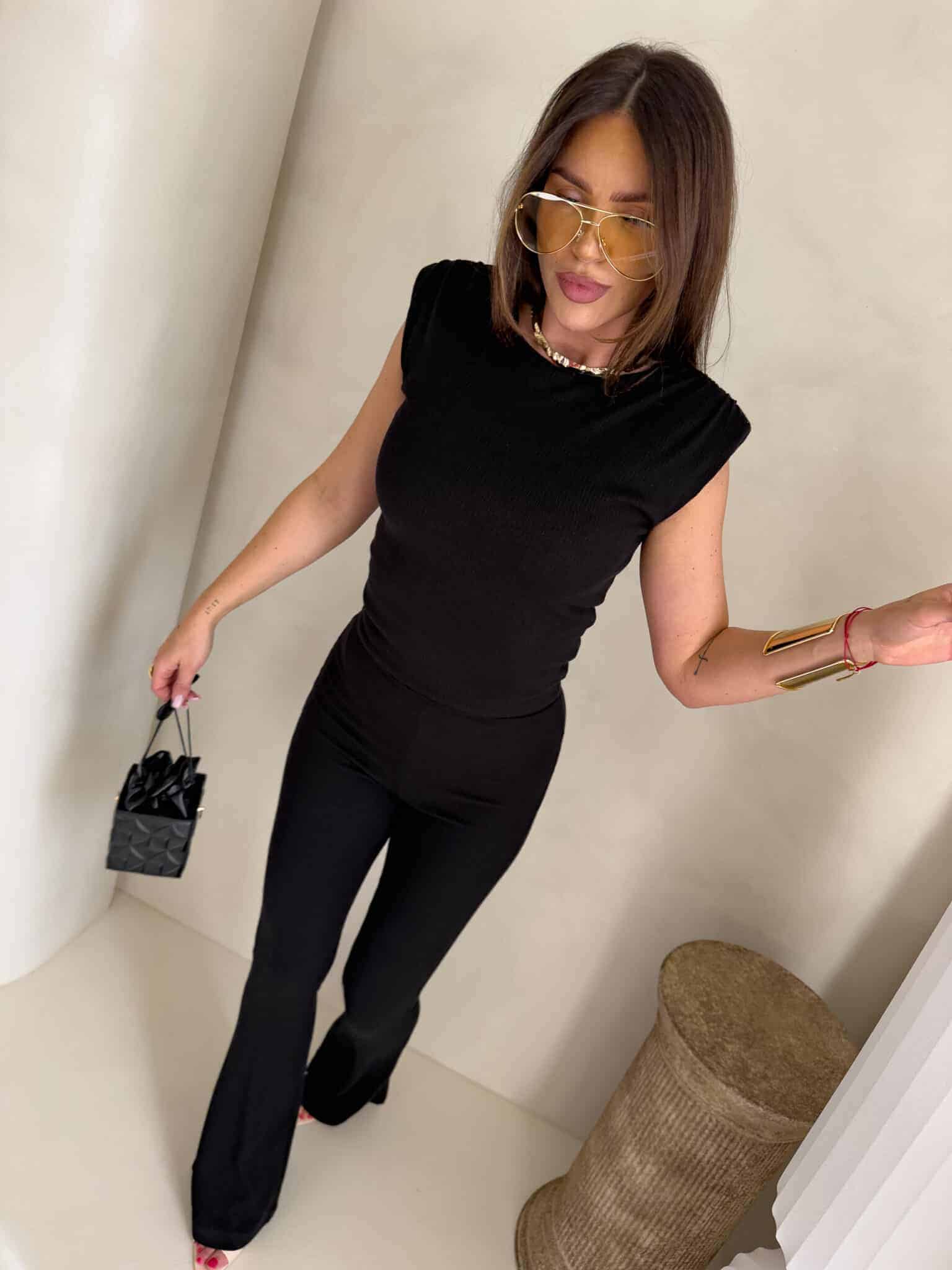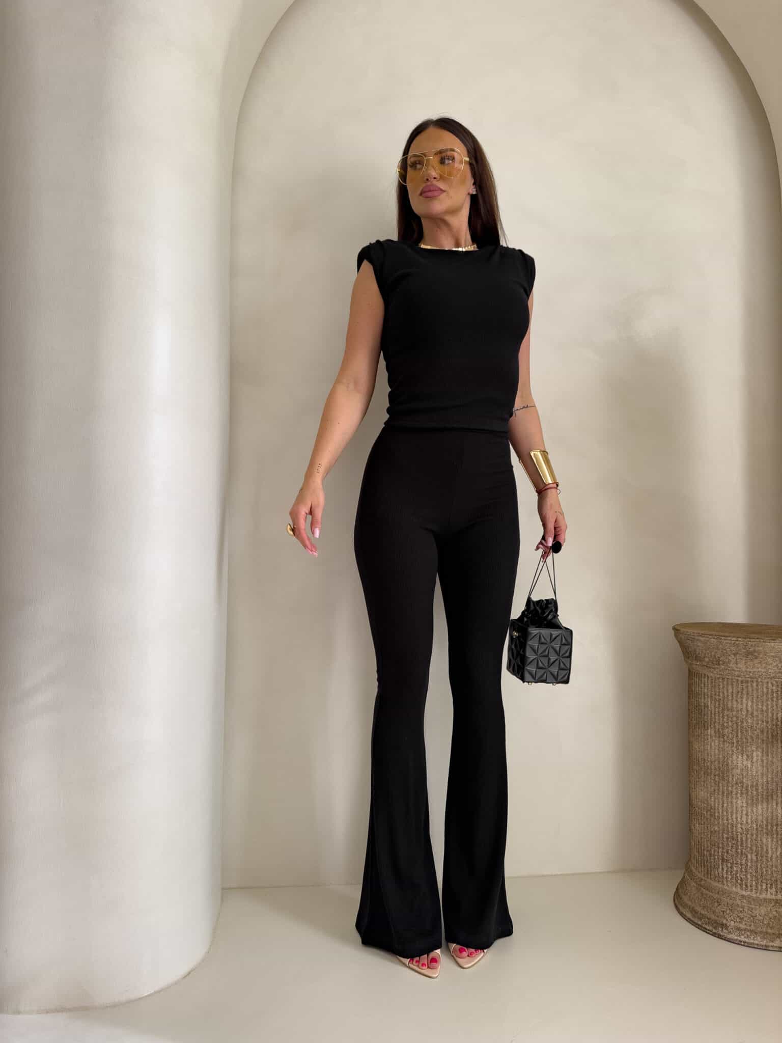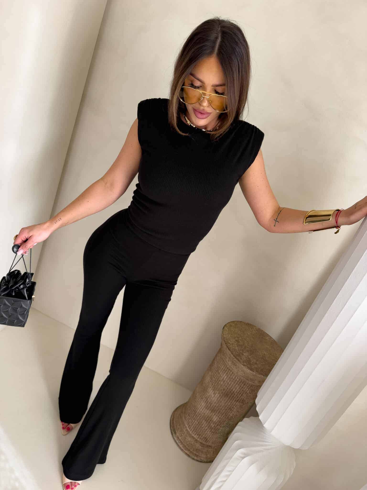 Dzianinowy komplet Pandora składa się z dopasowanej bluzki bez rękawów z okrągłym dekoltem oraz spodni z wysokim stanem i rozszerzaną nogawką typu dzwony. Wykonany z elastycznej, prążkowanej tkaniny, która idealnie dopasowuje się do sylwetki i zapewnia komfort noszenia.