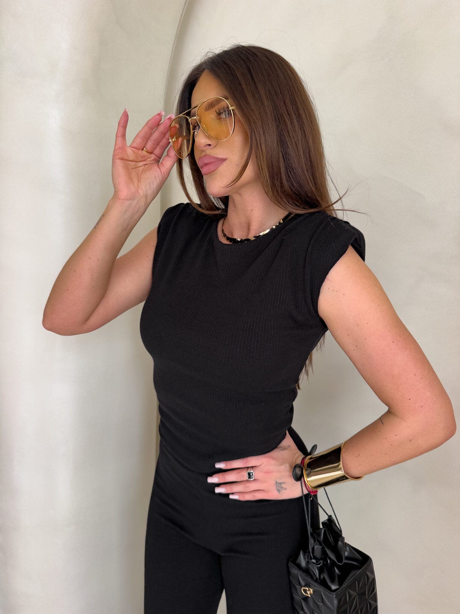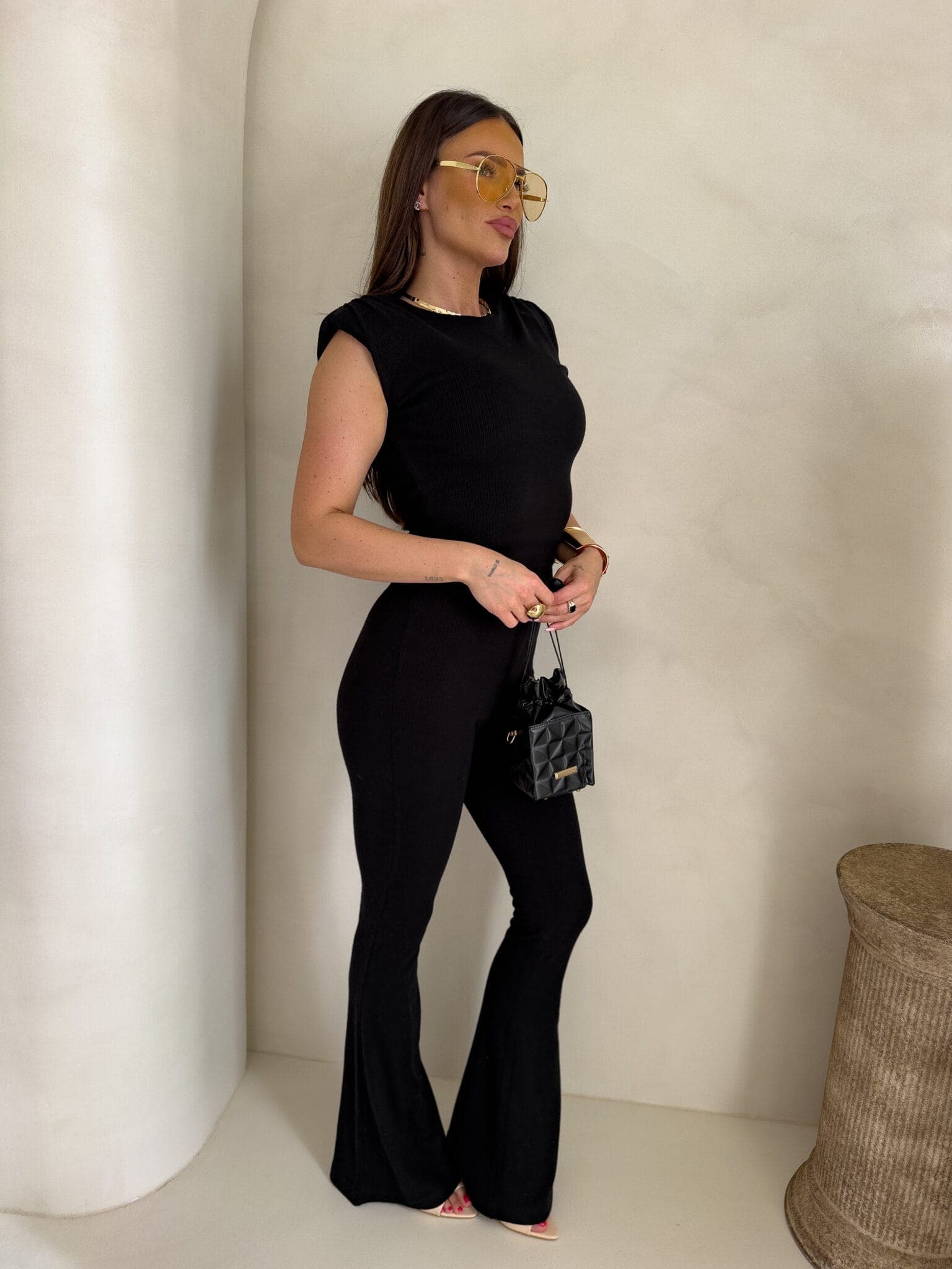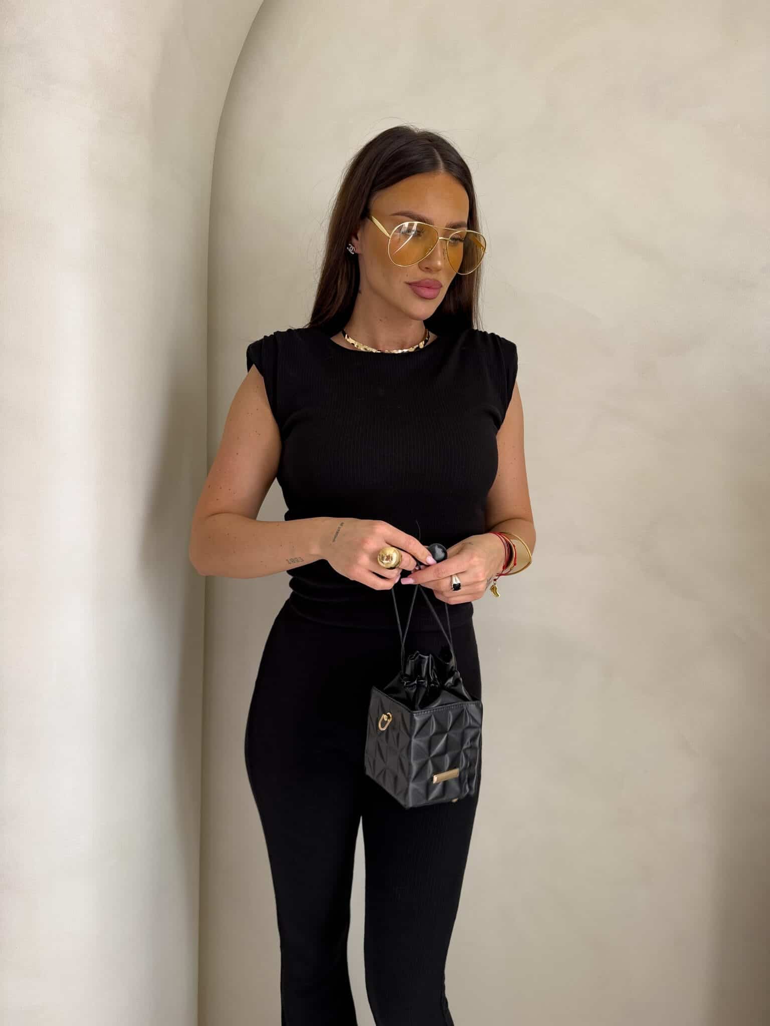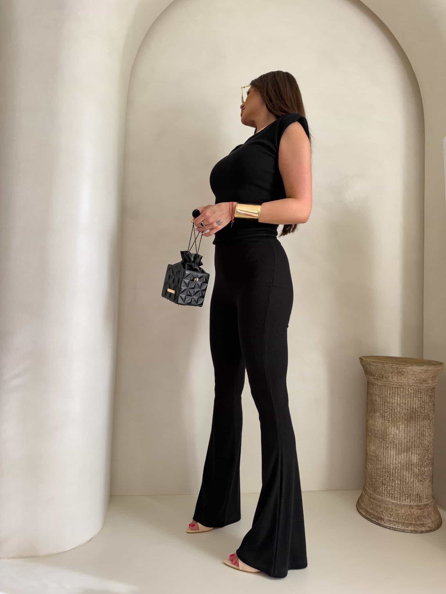 Dzianinowy komplet Pandora składa się z dopasowanej bluzki bez rękawów z okrągłym dekoltem oraz spodni z wysokim stanem i rozszerzaną nogawką typu dzwony. Wykonany z elastycznej, prążkowanej tkaniny, która idealnie dopasowuje się do sylwetki i zapewnia komfort noszenia.