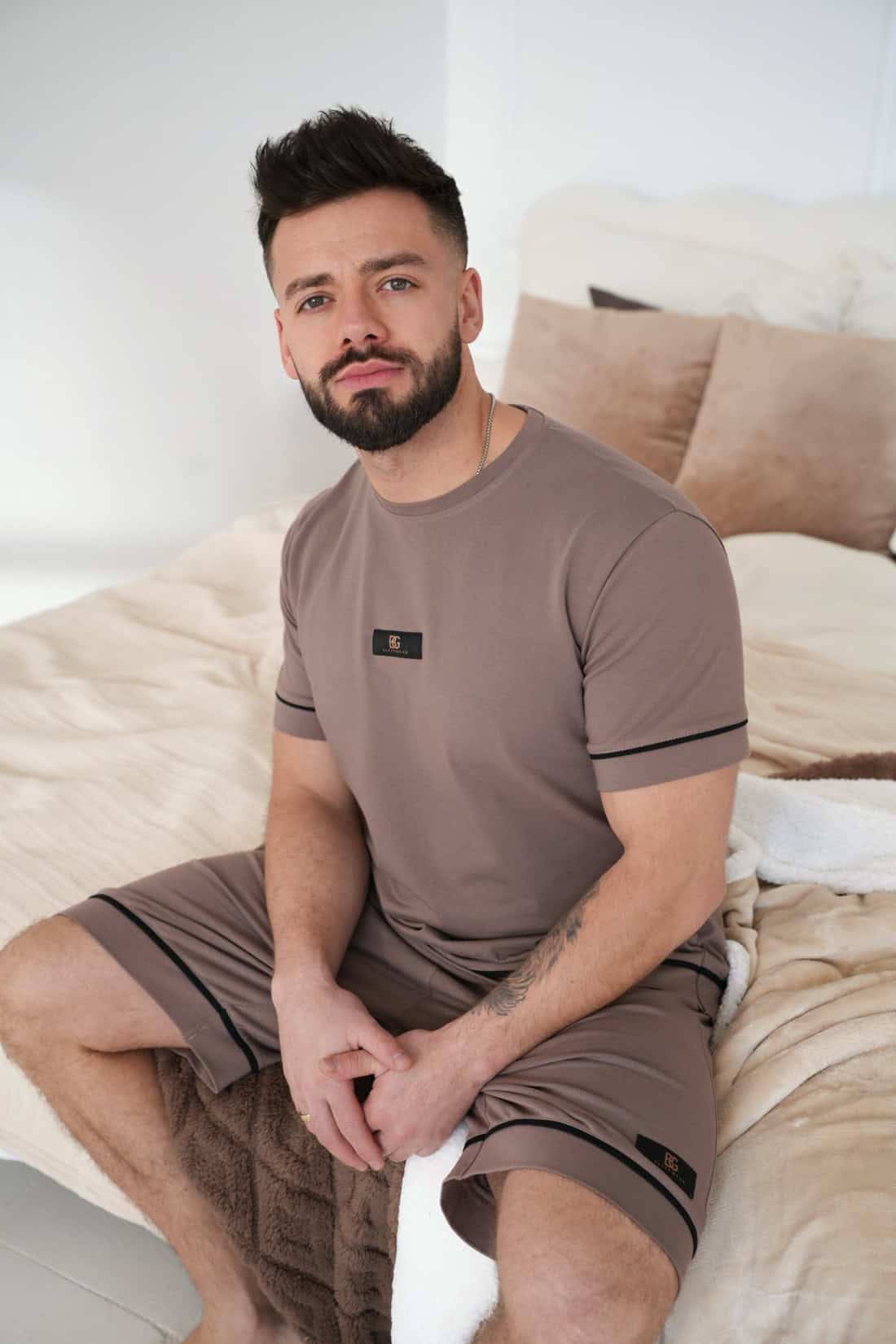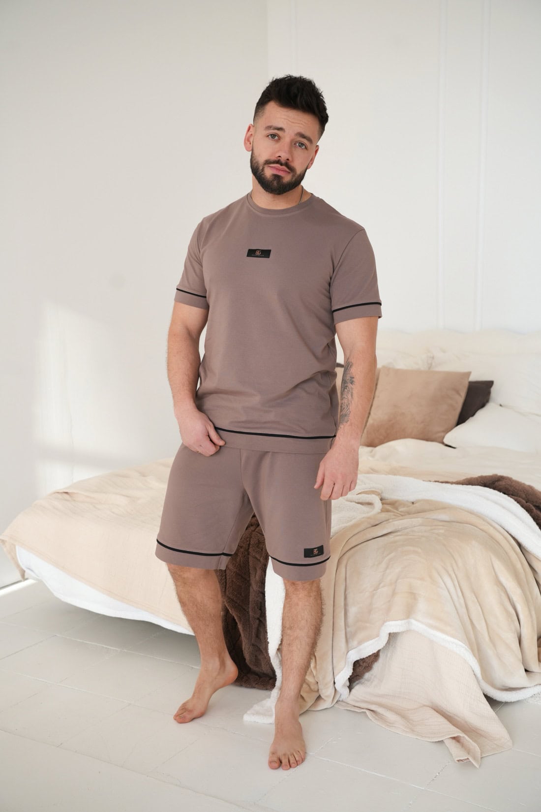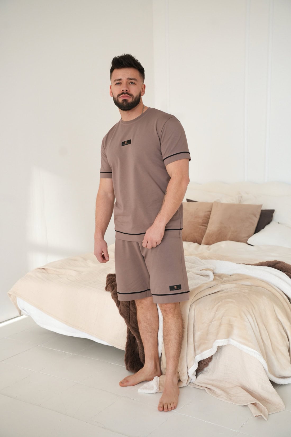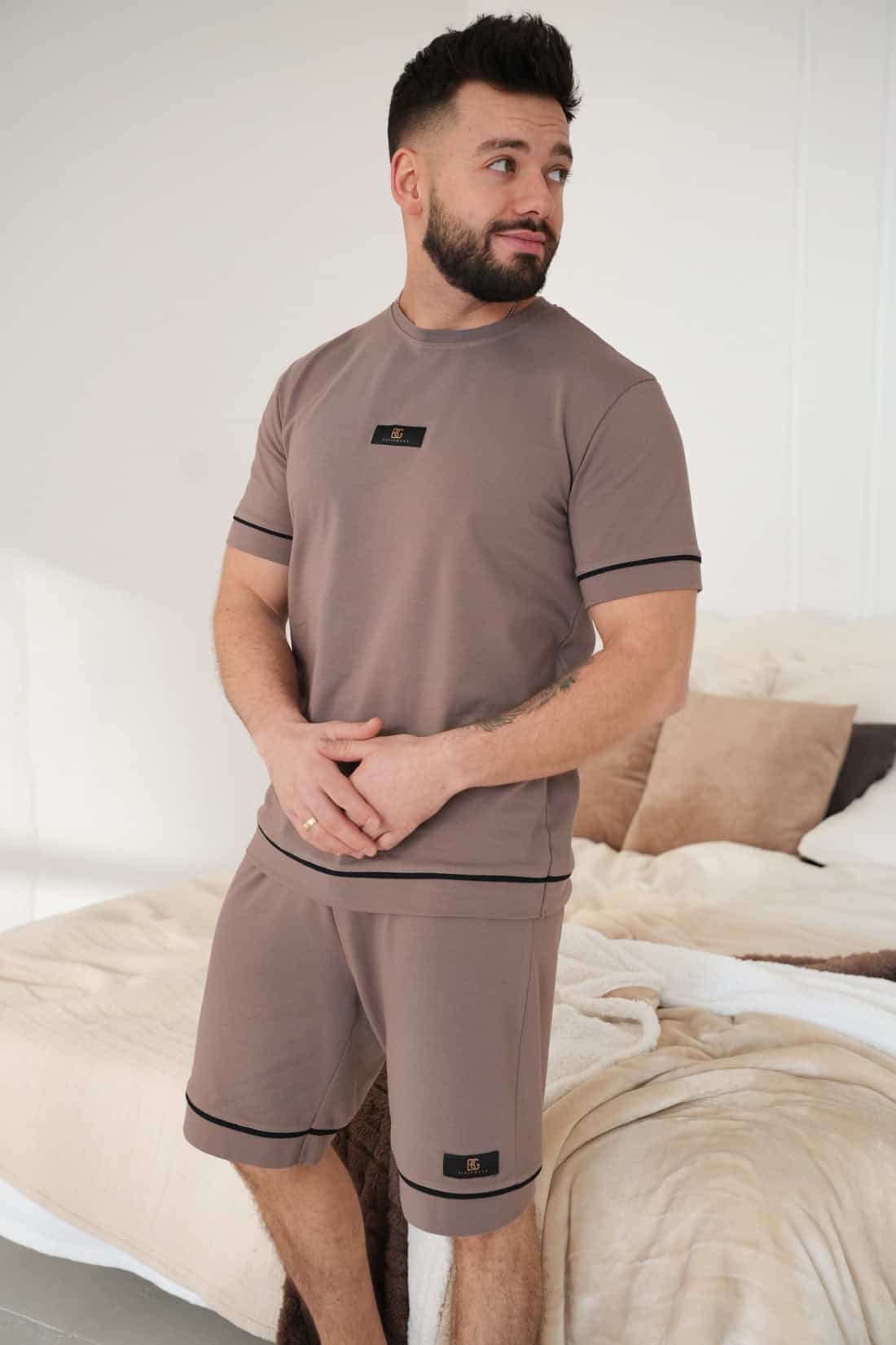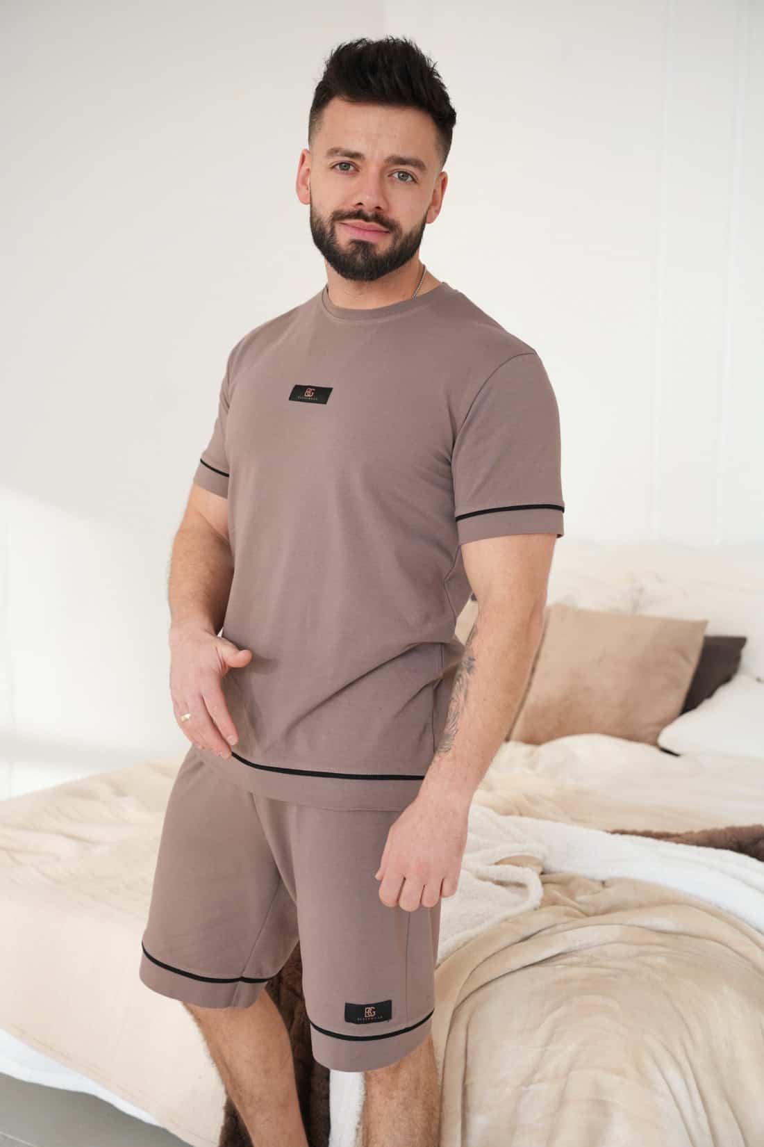 Opis produktu: Męska piżama dwuczęściowa z wysokiej jakości bawełny z elastanem. T-shirt z krótkim rękawem. Luźne szorty do kolan. Wykończenie: czarne lamówki i małe metki z logo marki BG Brandenburg Couture. Prosty, męski klasyk do spania.