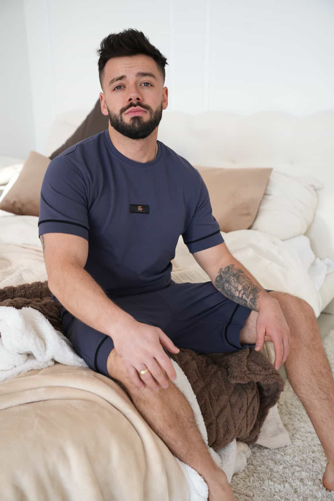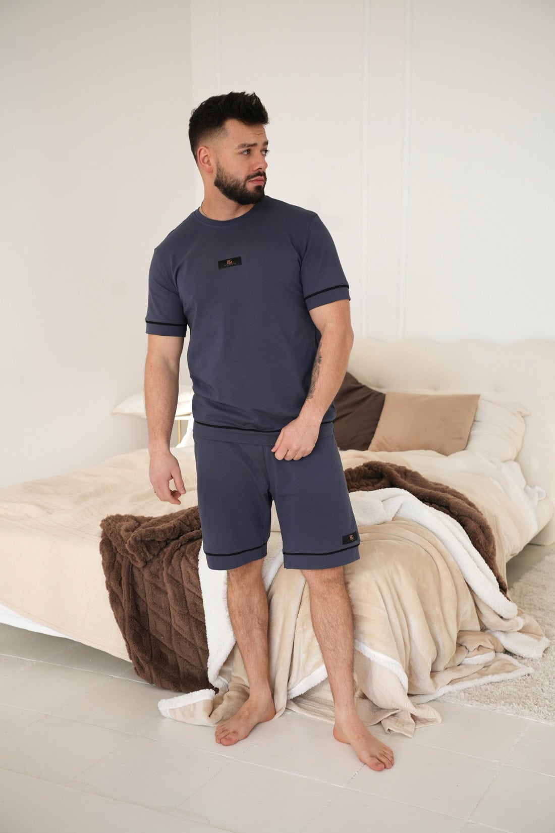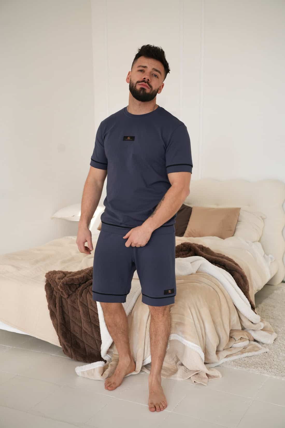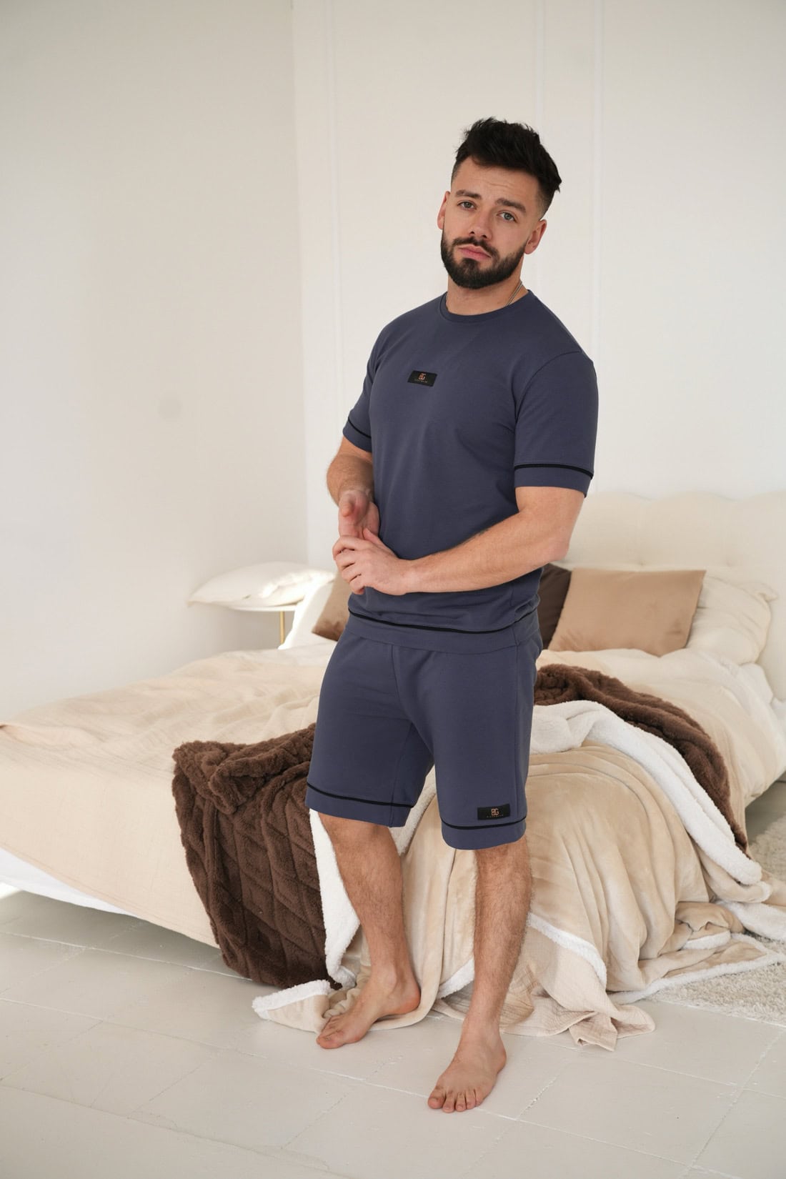 Opis produktu: Męska piżama dwuczęściowa z wysokiej jakości bawełny z elastanem. T-shirt z krótkim rękawem. Luźne szorty do kolan. Wykończenie: czarne lamówki i małe metki z logo marki BG Brandenburg Couture. Prosty, męski klasyk do spania.