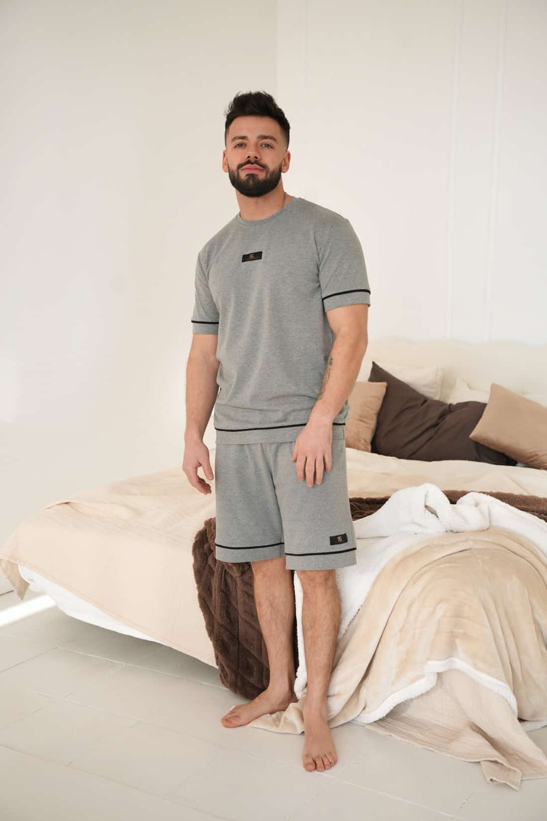 Opis produktu: Męska piżama dwuczęściowa z wysokiej jakości bawełny z elastanem. T-shirt z krótkim rękawem. Luźne szorty do kolan. Wykończenie: czarne lamówki i małe metki z logo marki BG Brandenburg Couture. Prosty, męski klasyk do spania.