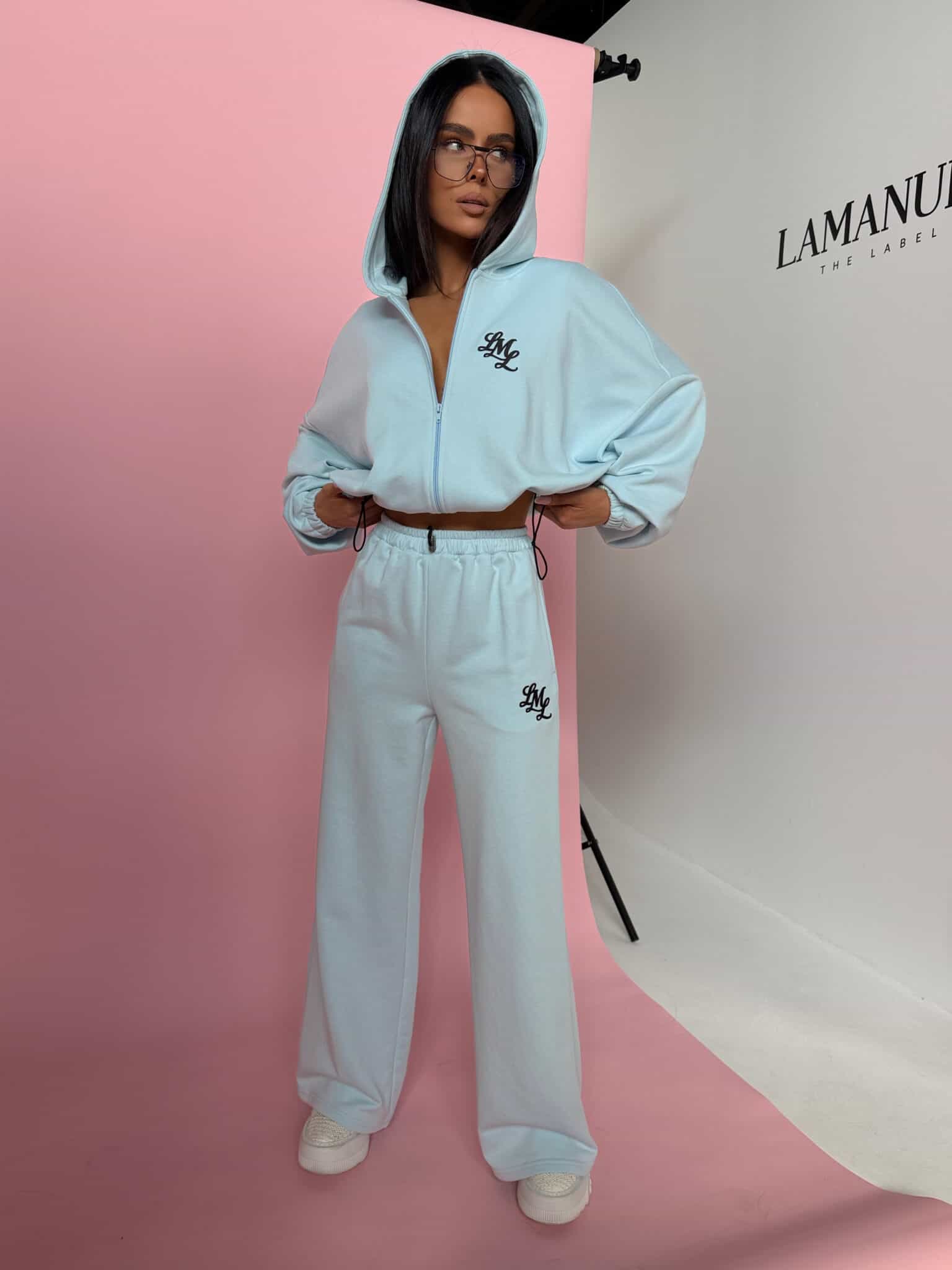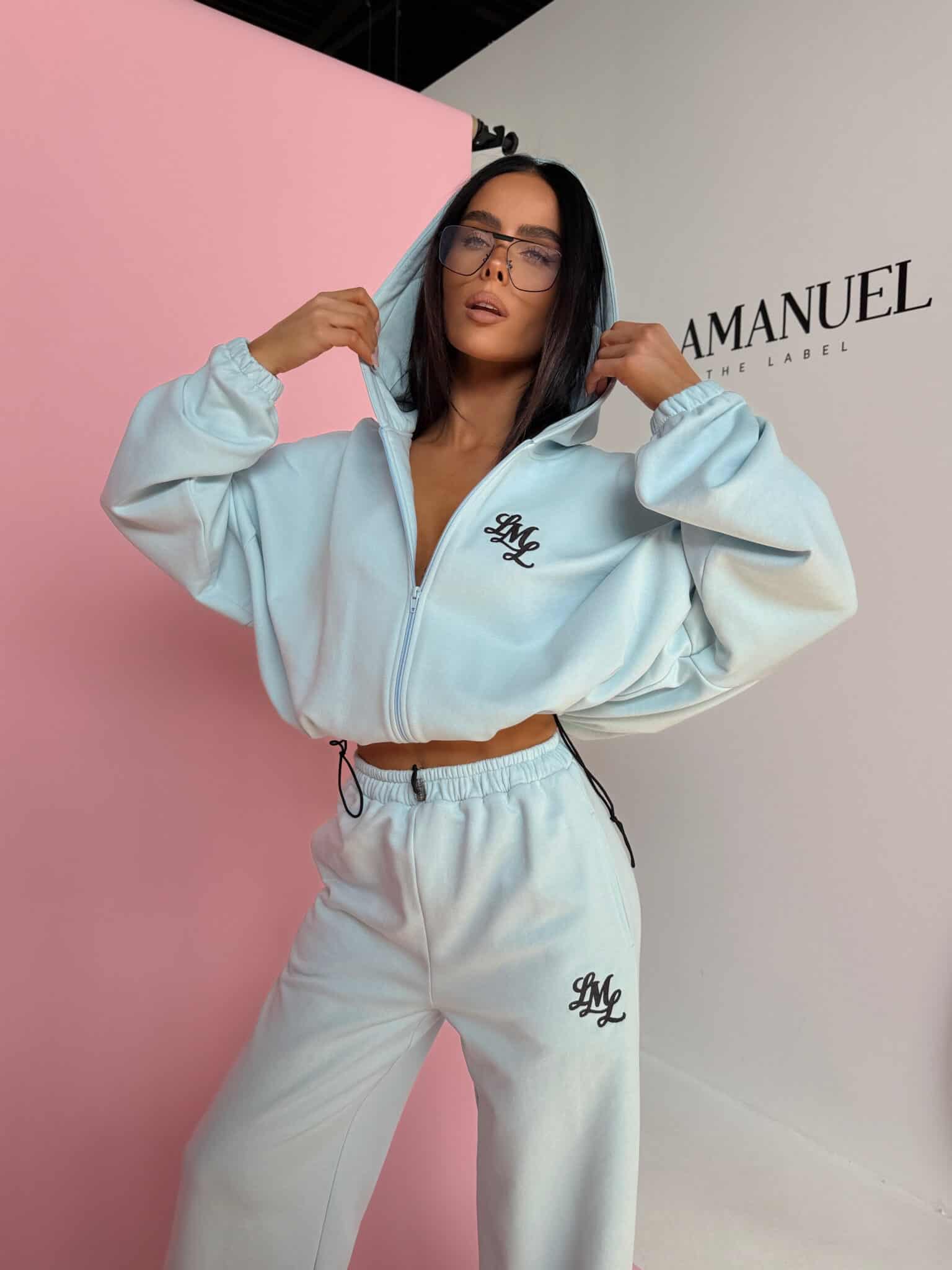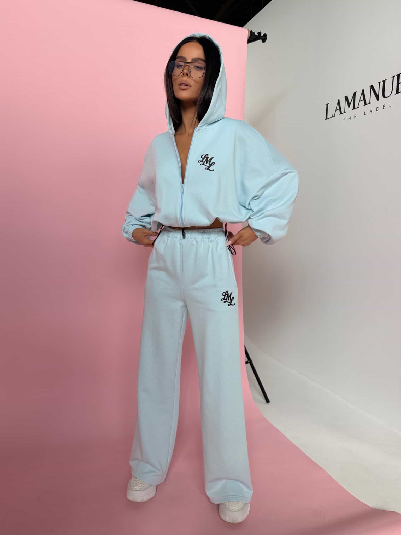 Komplet dresowy o luźnym, oversize’owym kroju. Bluza z kapturem zapinana na zamek, z obniżoną linią ramion i regulacją dołu, która pozwala dopasować fason. Spodnie z szeroką nogawką, gumą w pasie i swobodnym krojem, który dobrze układa się na sylwetce. Na przodzie subtelne haftowane logo, na plecach duży, wyrazisty nadruk. Model tworzy spójny, nowoczesny look idealny do codziennych stylizacji i kompletów.Skład: 90% bawełna 10% poliester