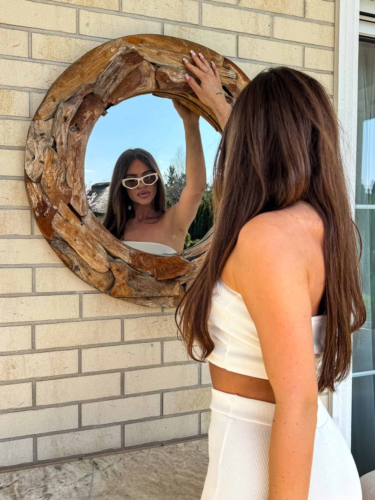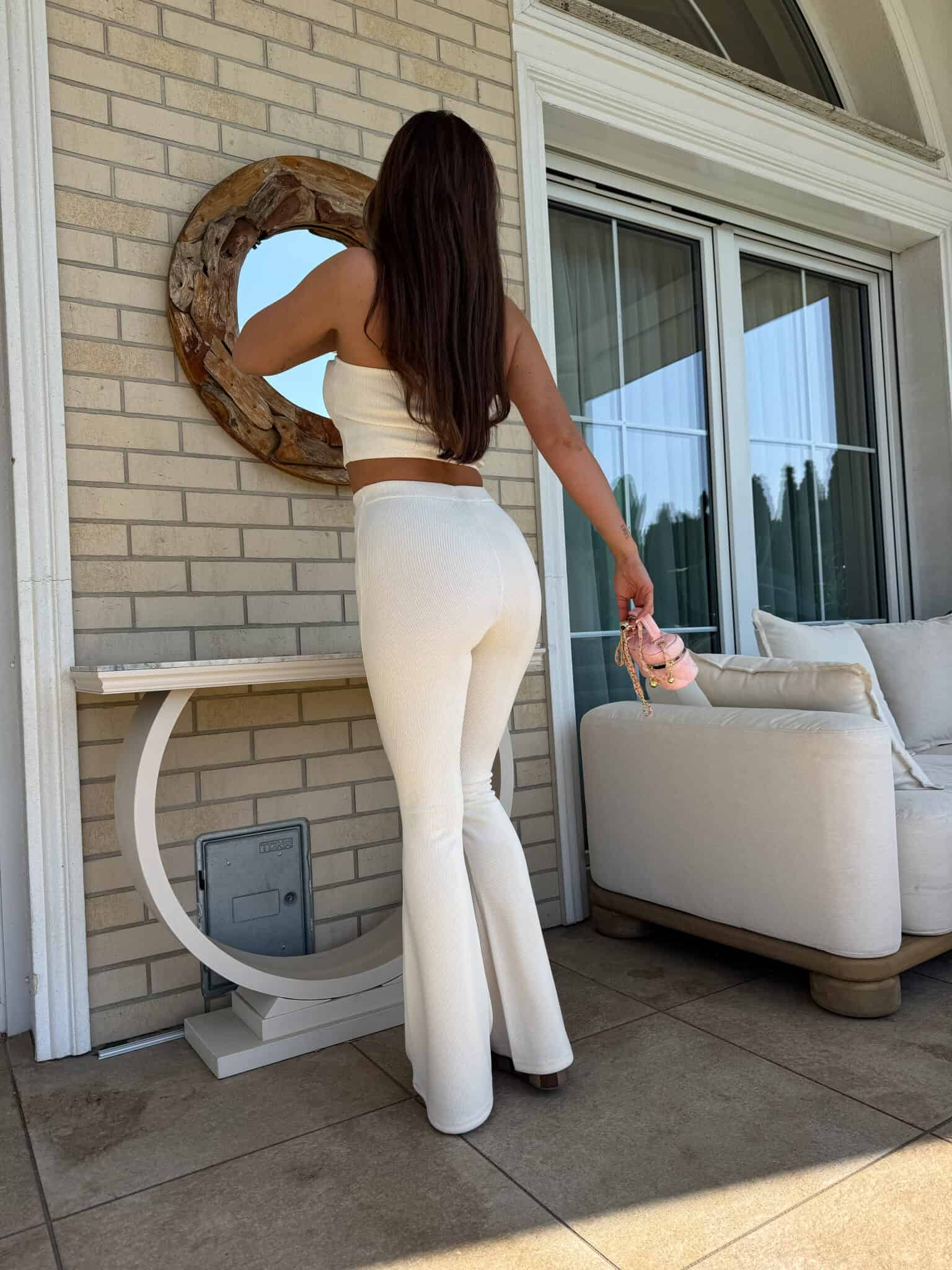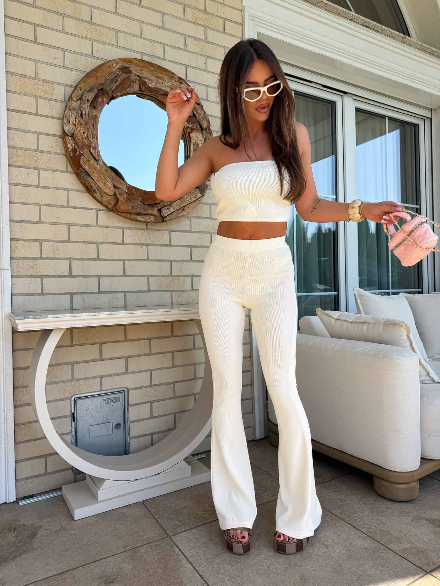 Stylowy komplet składający się z dwóch elementów – topu oraz spodni. Top w formie opaski, bez ramiączek, wykonany z elastycznego, dopasowującego się do ciała materiału, doskonale podkreśla górne partie sylwetki. Spodnie z wysokim stanem i gumką w pasie, pięknie wydłużają nogi i akcentują talię. Całość zapewnia komfort noszenia i efekt wysmuklenia sylwetki.