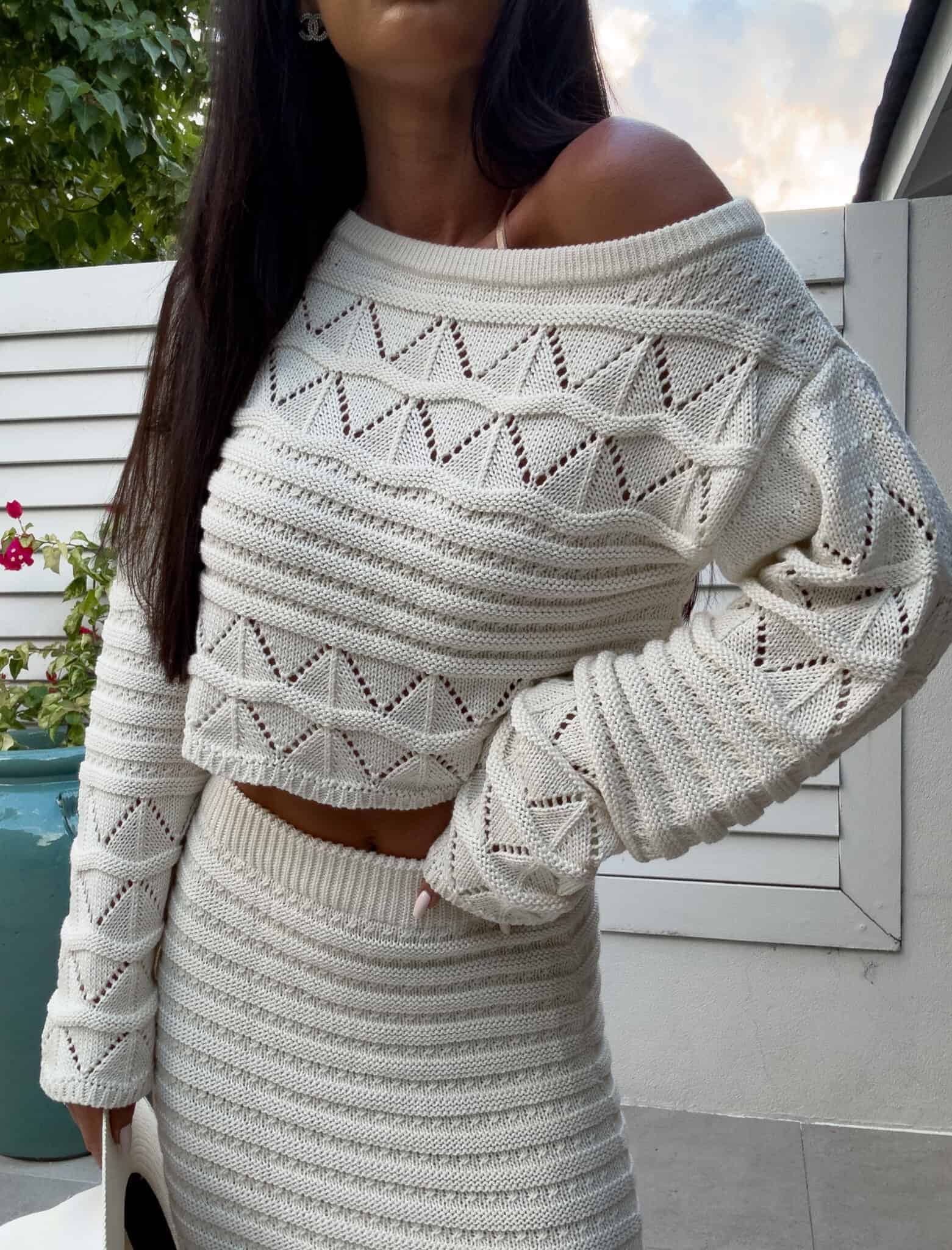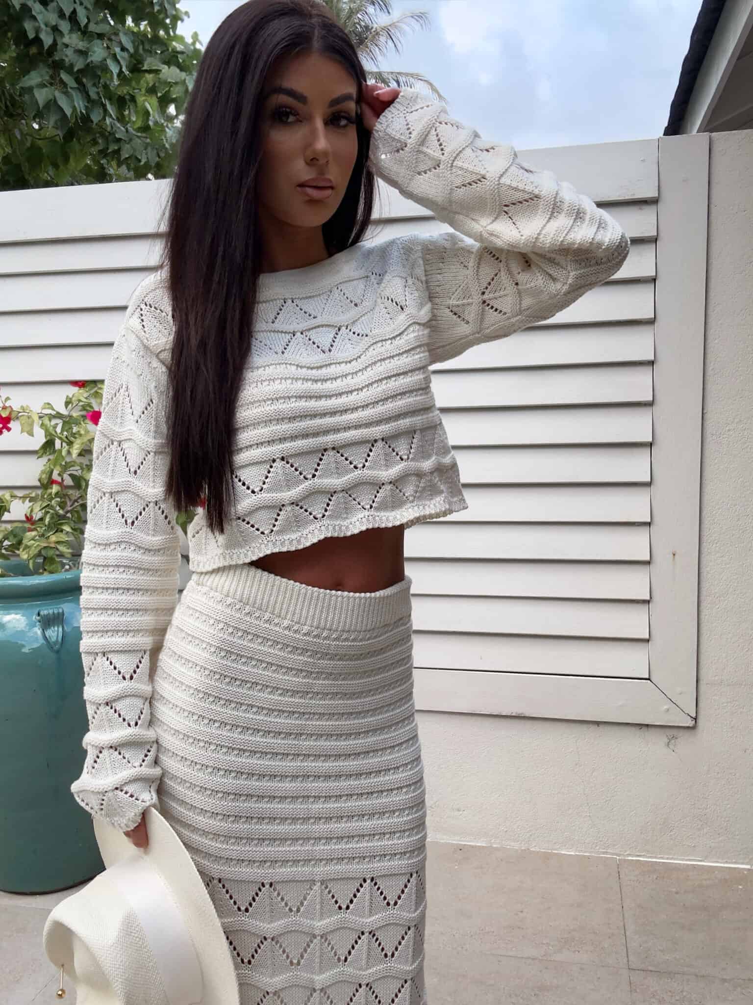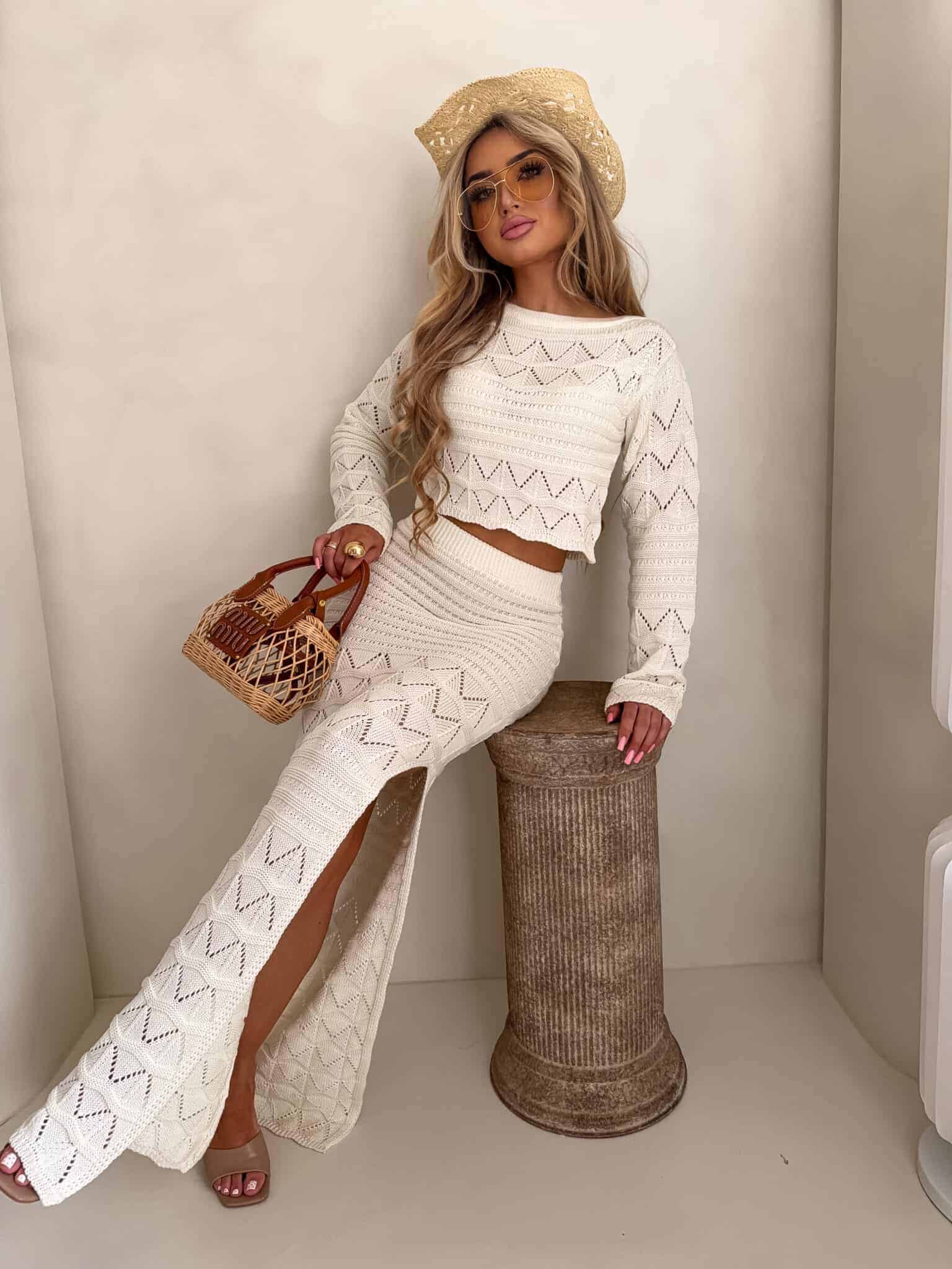 Dzianinowy komplet z ażurowym wzorem. Zestaw składa się z krótkiego swetra z długim rękawem oraz dopasowanej spódnicy maxi z wysokim stanem i efektownym rozcięciem na nodze. Kobiecy, stylowy komplet idealny na letnie stylizacje,